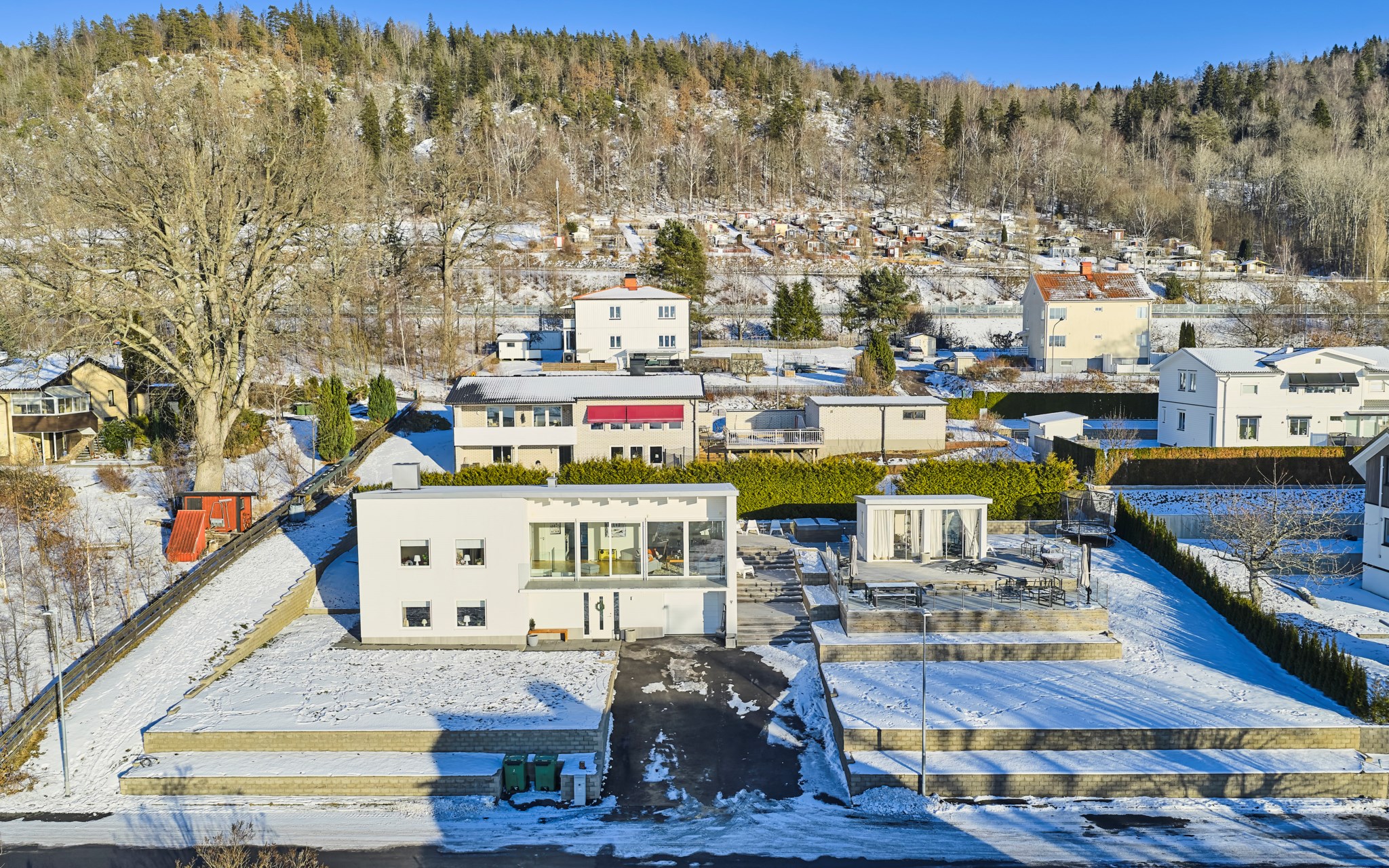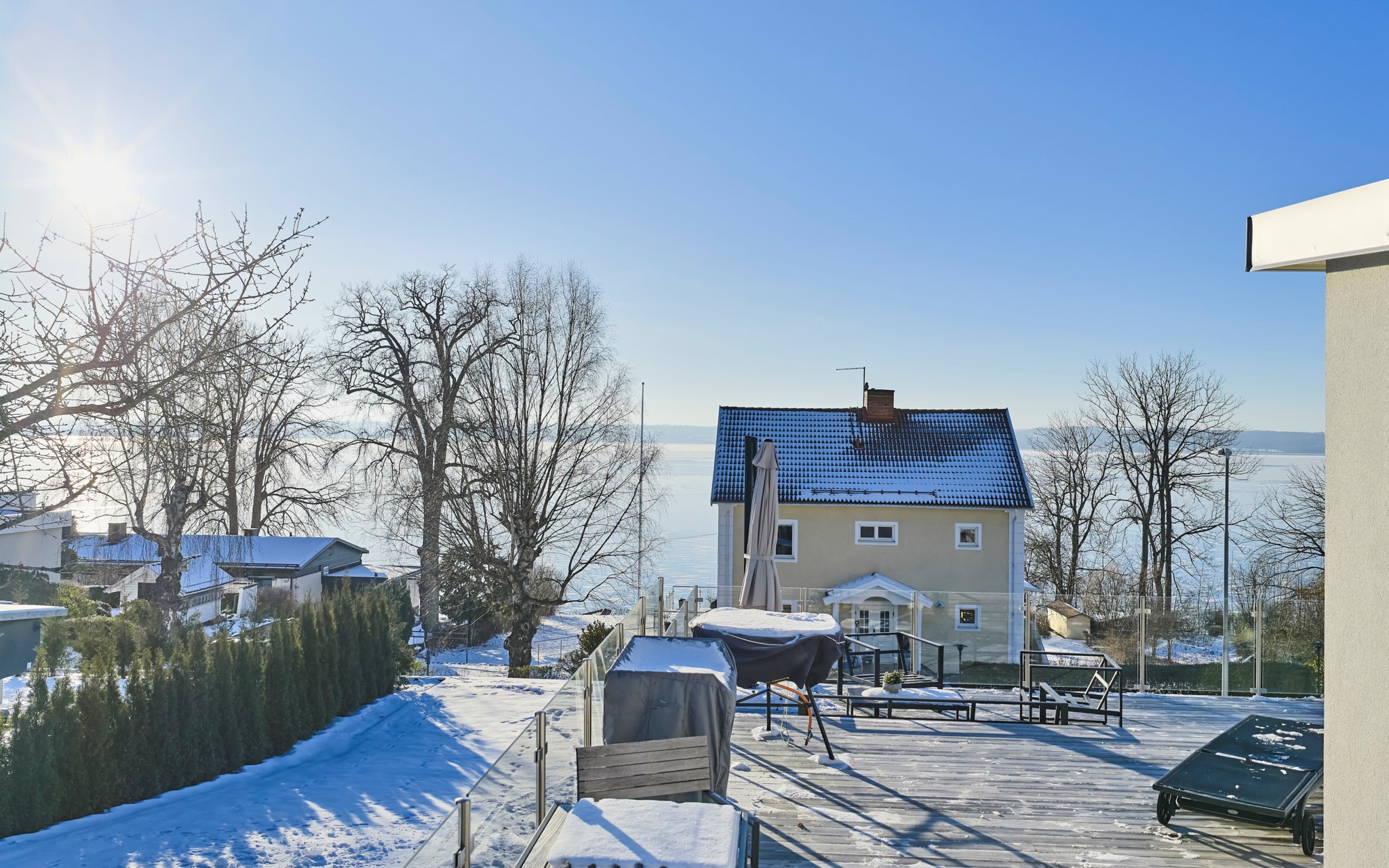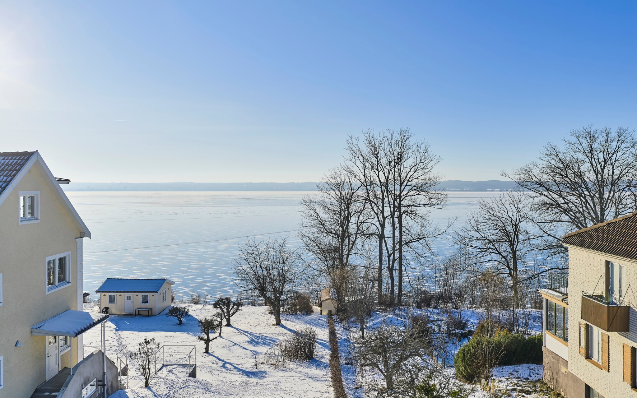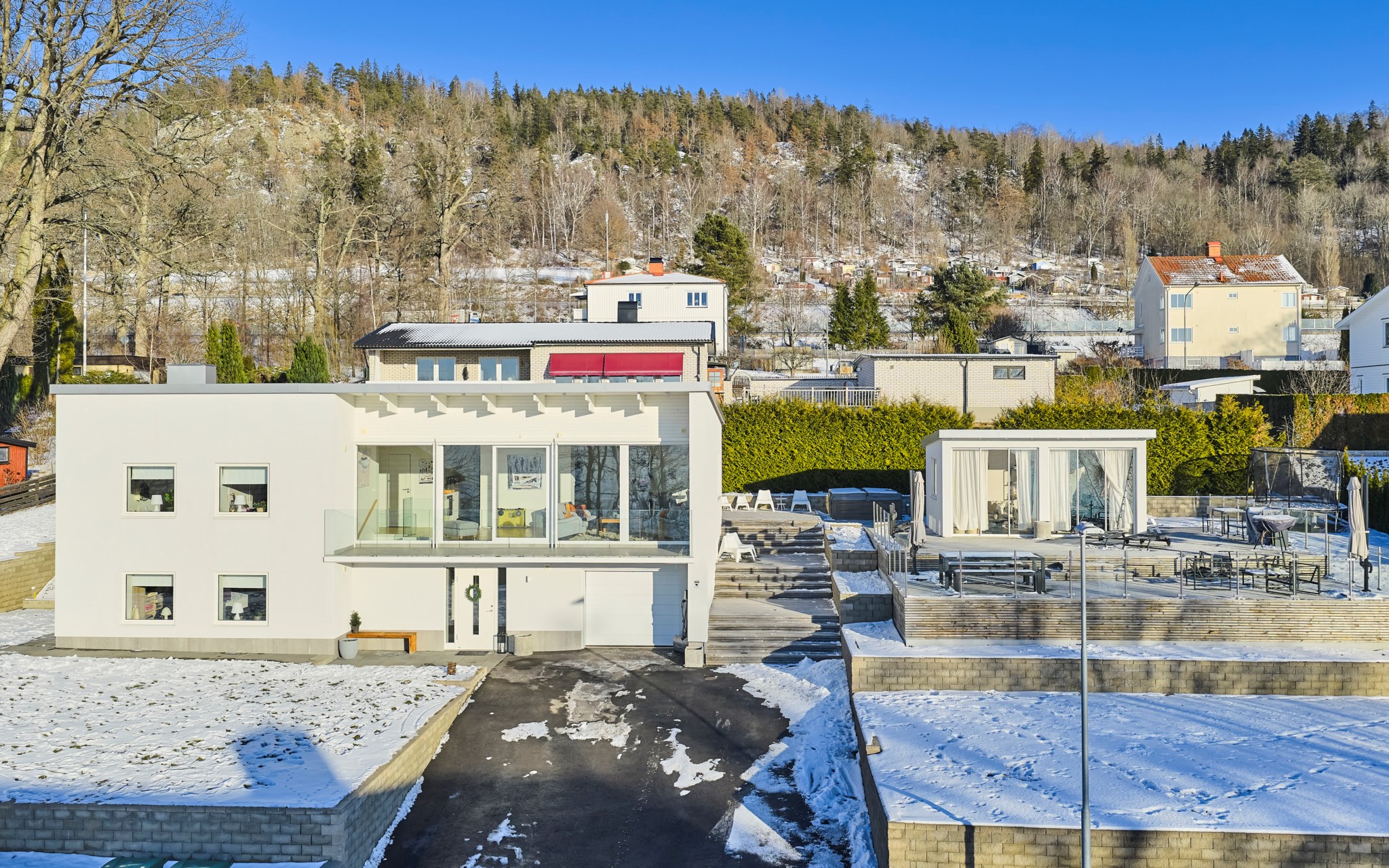 Svårt att fatta att detta är ett hus från 1960-talet. Minutiöst renoverat 2014-2015 då allt skalades av ända in på den murade betongstommen. El, vatten, avlopp och stammar, allt bytt. Huset hade från början sadeltak, men har vid renoveringen fått ett enkelt pulpettak som vinklar upp högt i vardagsrummet och öppnar rummet – ja, hela huset – ut mot Vättern. Öppningsbart glasparti mot balkongen som i sin tur har glasat räcke. Takvolymen och det fria flödet runt köket ger den sällskapliga sfären en nästan helig känsla. Det är absolut inte bara utsikten som lockar ögat här. Mycket konsekvent val av ädla och gedigna material. Vattenburen värme från en värmepump med luft-vattenaggregat på baksidan. Garage i entréplanet.