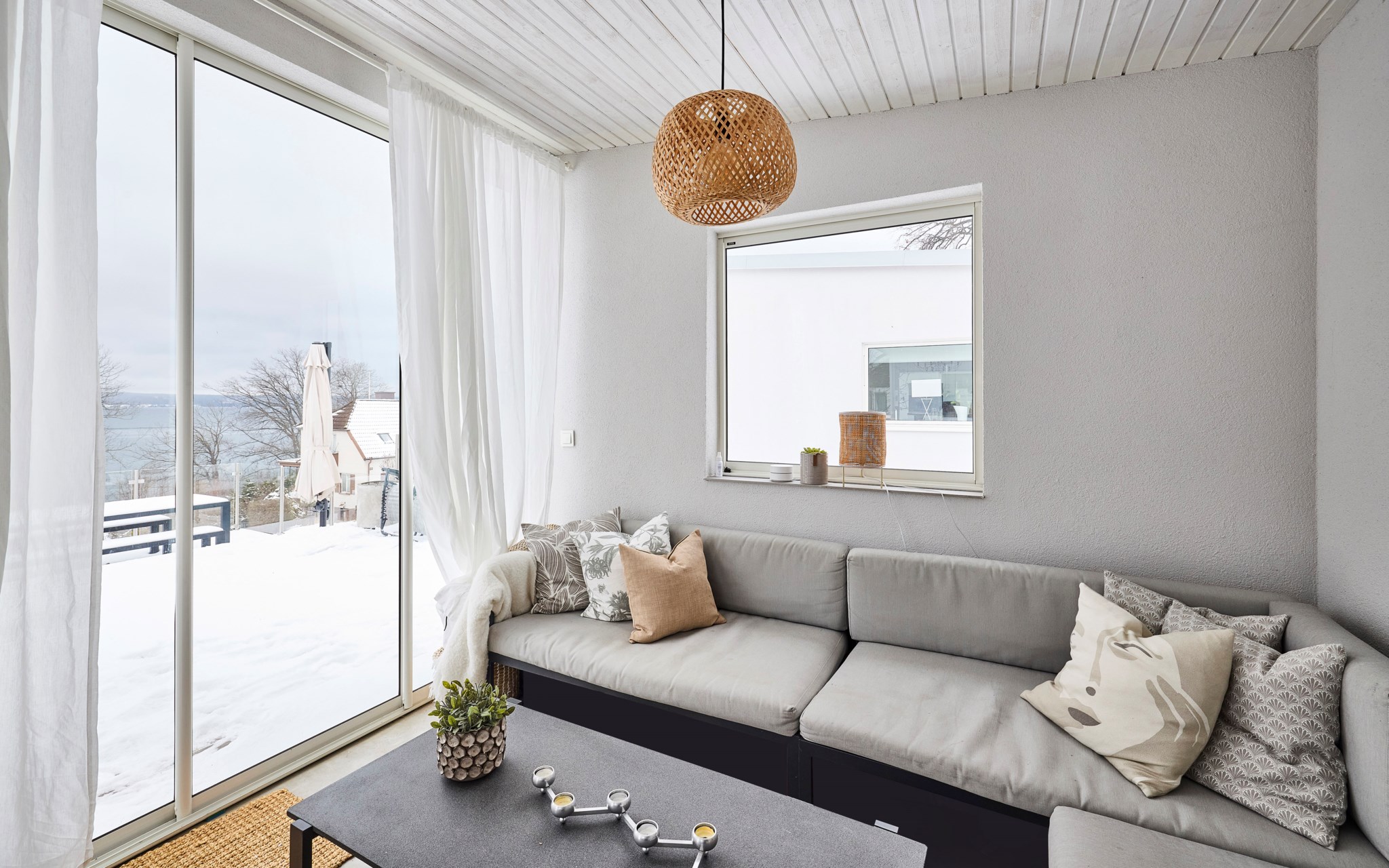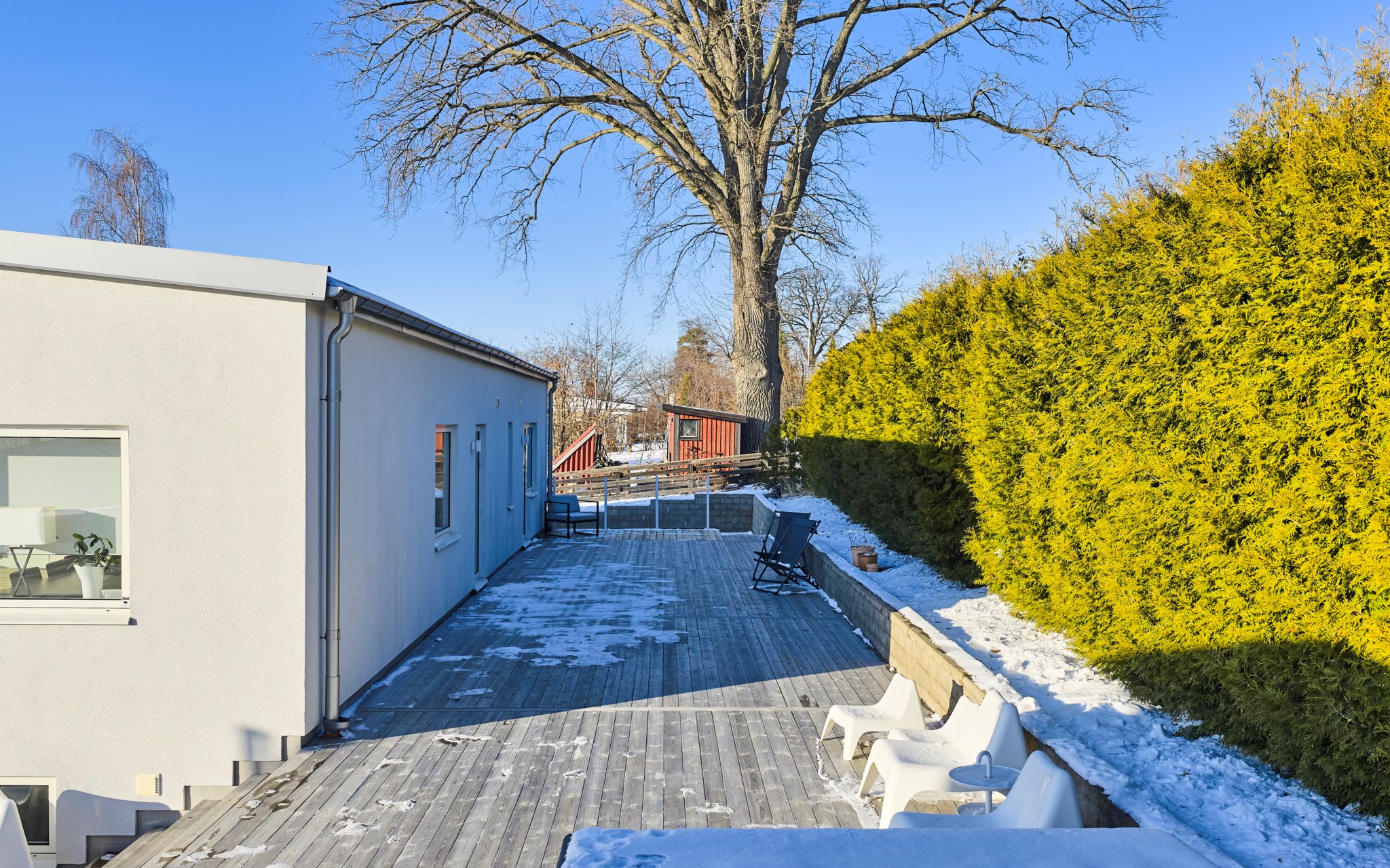 Trädäcket sträcker sig i otaliga kvadrat bakom huset och runt på framsidan och omfattar också det fina uterummet som är byggt som en miniatyr av det stora huset med samma takvinkel. Lika gediget detta, byggt på gjuten platta och murade väggar. Här behövs inte mycket sol för att det ska bli varmt och stenväggarna konserverar värmen bra när solen dyker. Här sitter du gärna kvar för att småprata några timmar till, kanske öppna ännu en flaska rött. Glaspartierna sluter tätt bra, och barnen vill säkert sova över när sommaren kommit lite längre. Om natten väcker lusten till bad, så är det inte långt ner till Roddarnas klubbhus med brygga på baksidan.