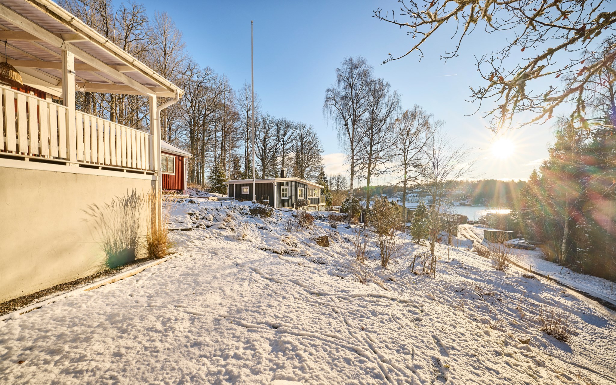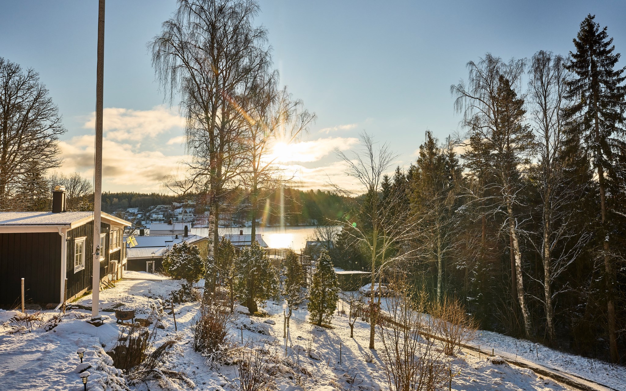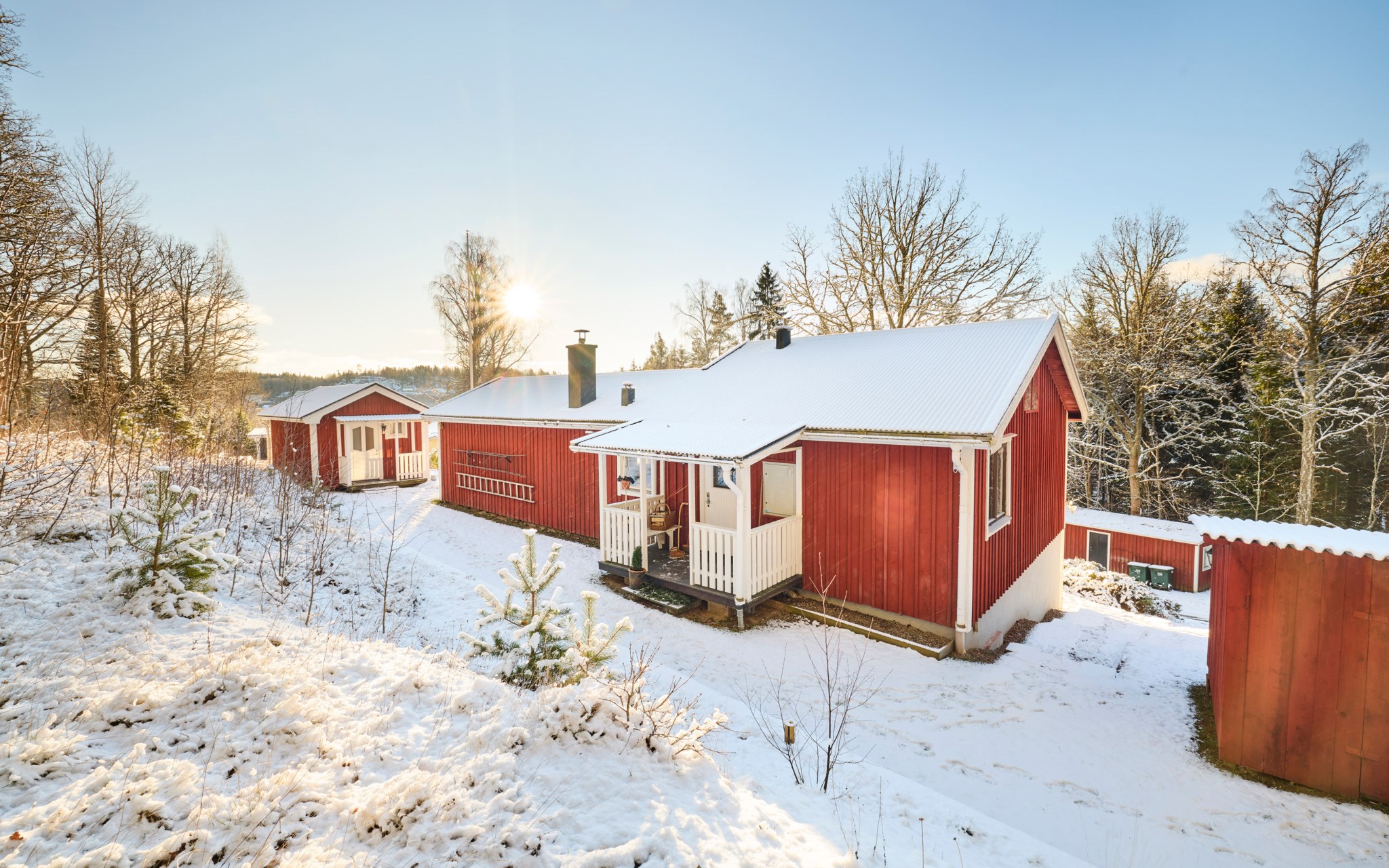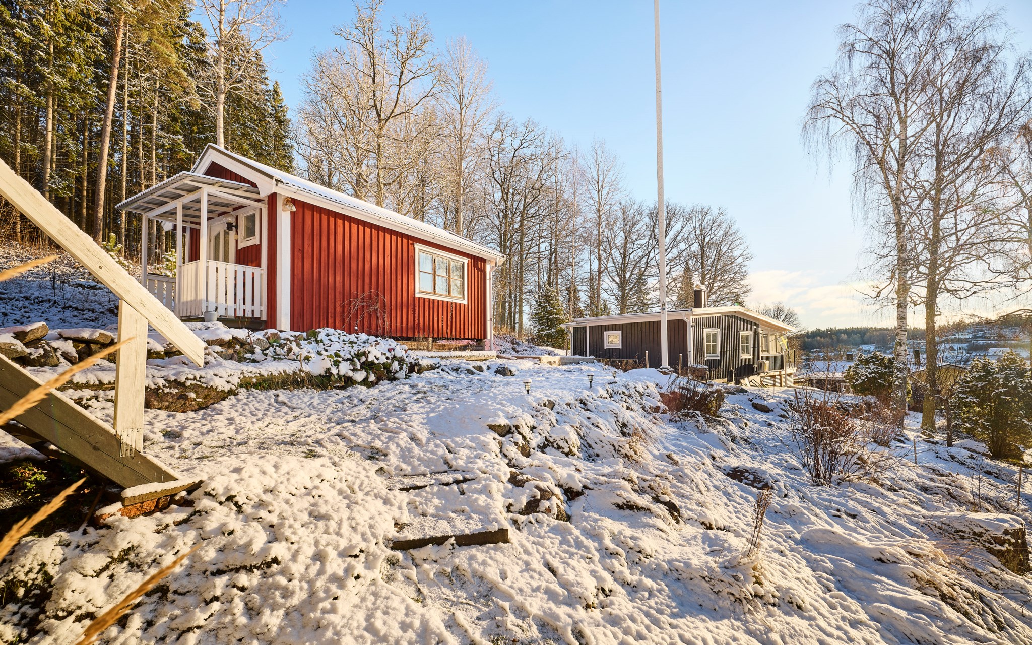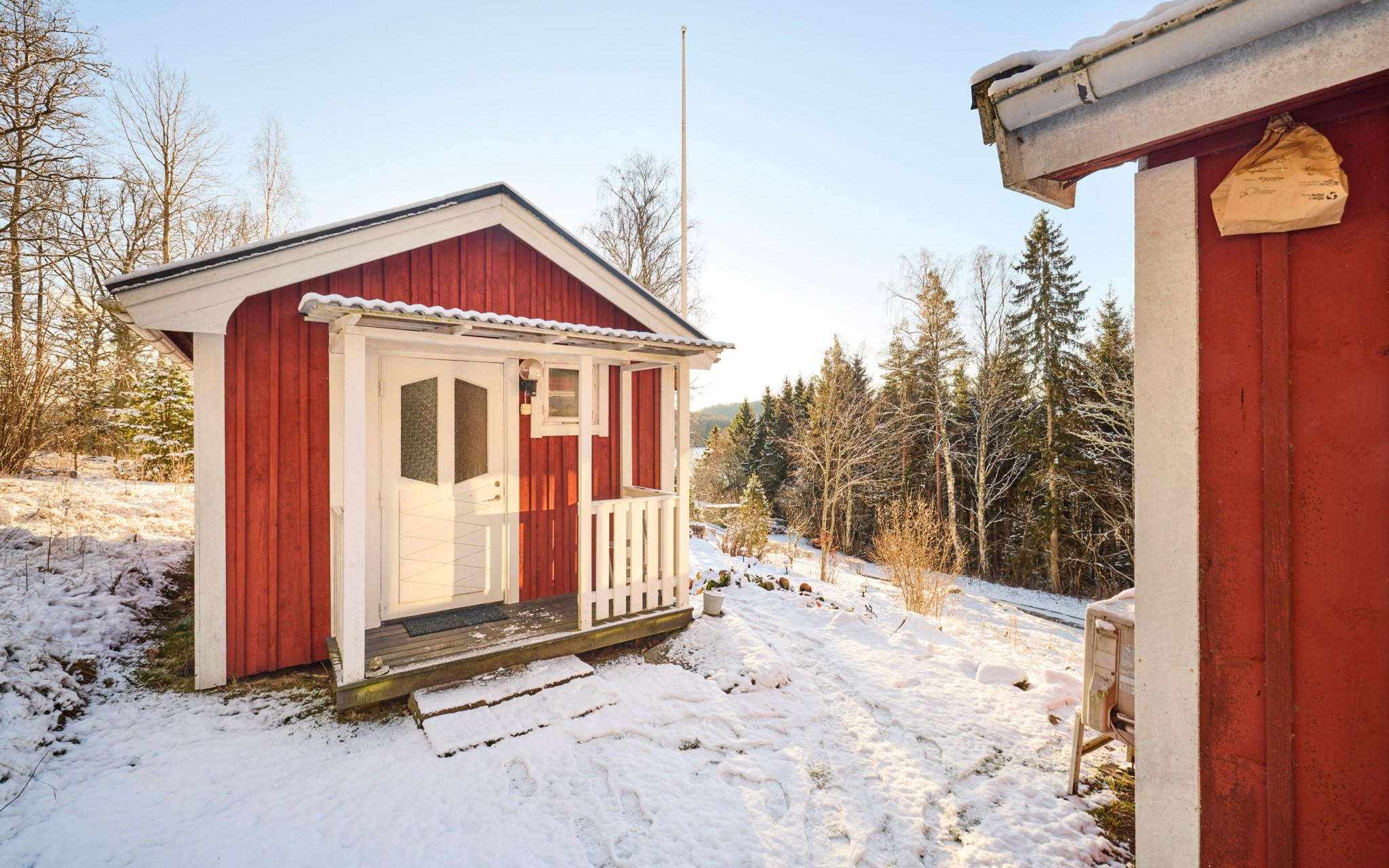 Ett bra året-runt-hus som klänger sig fast på en av Bunns kullar. Skogen i ryggen och sjösidan framför ögonen från altan och vardagsrum. En kuperad tomt med långhuset som sträcker ut sig mellan det fristående gästhuset och vedförrådet. Två bra sovrum, ett stort vardagsrum där kaminen snabbt stödvärmer hela rummet inklusive köket vid behov. Soffan vill du nog mysparkera närmast elden. Sommartid kommer du inse att altanen sitter så rätt som den kan göra på huset för att solens strålar ska fläta sig in från tidig morgon genom skogen och sedan hålla sig framme mest hela dagen.