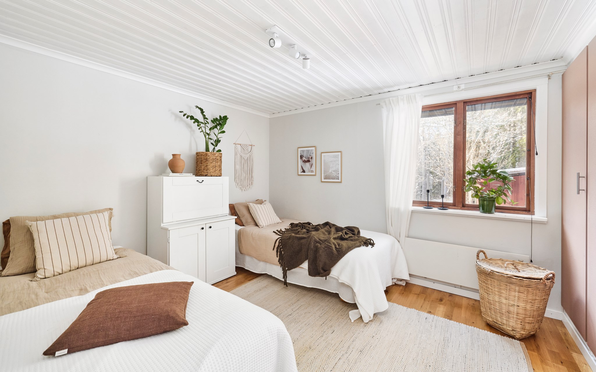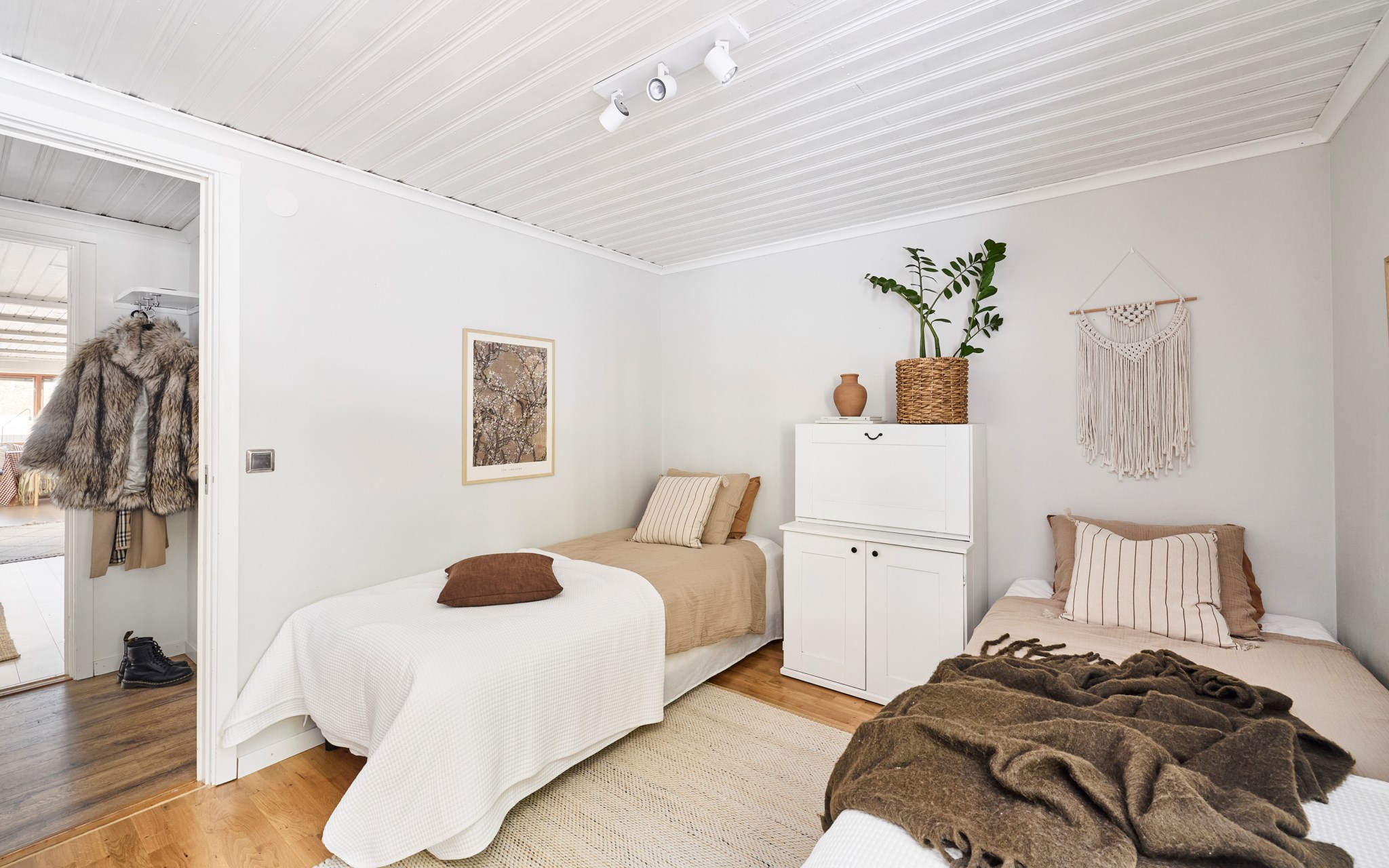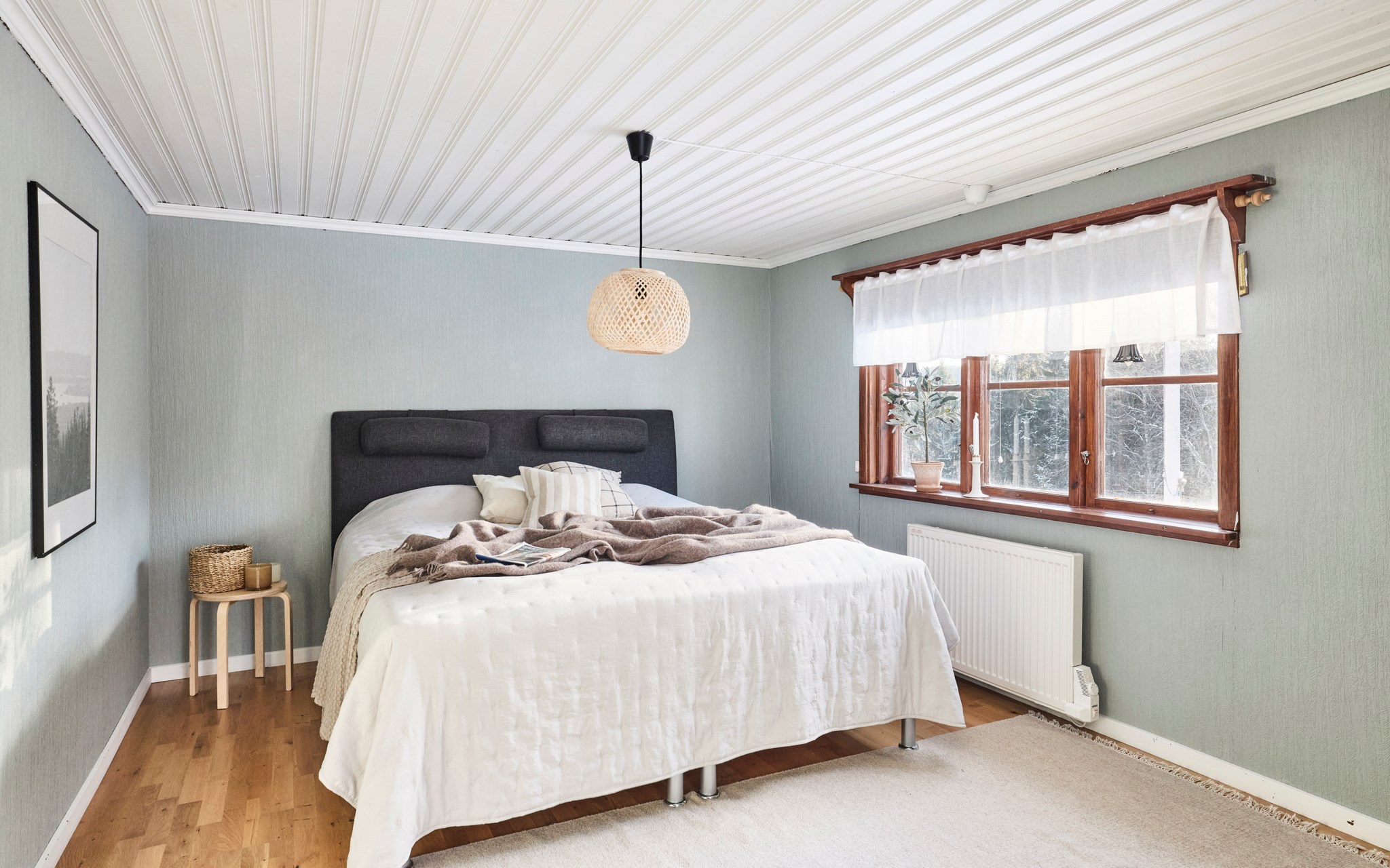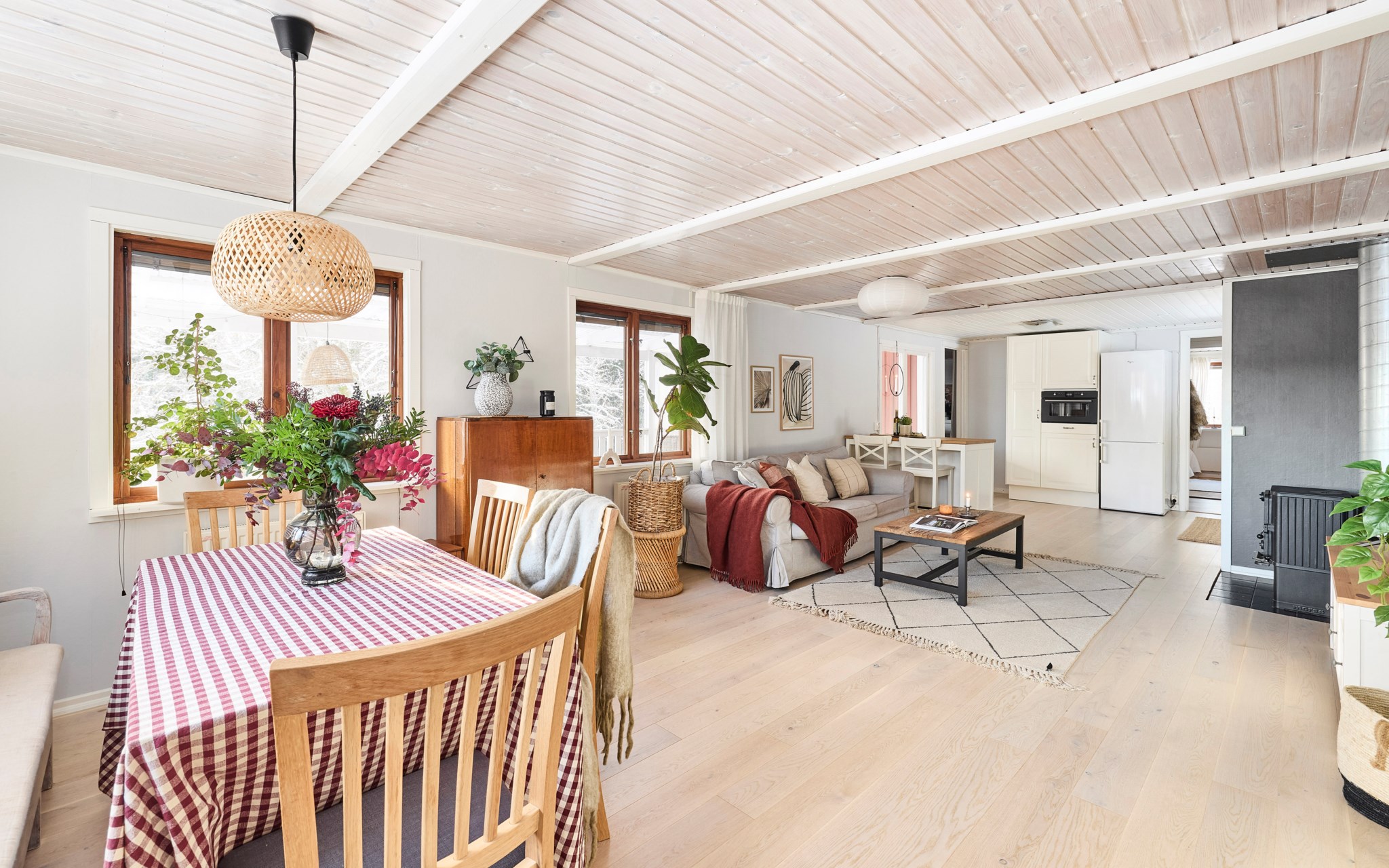 Ett bra året-runt-hus som klänger sig fast på en av Bunns kullar. Skogen i ryggen och sjösidan framför ögonen från altan och vardagsrum. En kuperad tomt med långhuset som sträcker ut sig mellan det fristående gästhuset och vedförrådet. Två bra sovrum, ett stort vardagsrum där kaminen snabbt stödvärmer hela rummet inklusive köket vid behov. Soffan vill du nog mysparkera närmast elden. Sommartid kommer du inse att altanen sitter så rätt som den kan göra på huset för att solens strålar ska fläta sig in från tidig morgon genom skogen och sedan hålla sig framme mest hela dagen.
