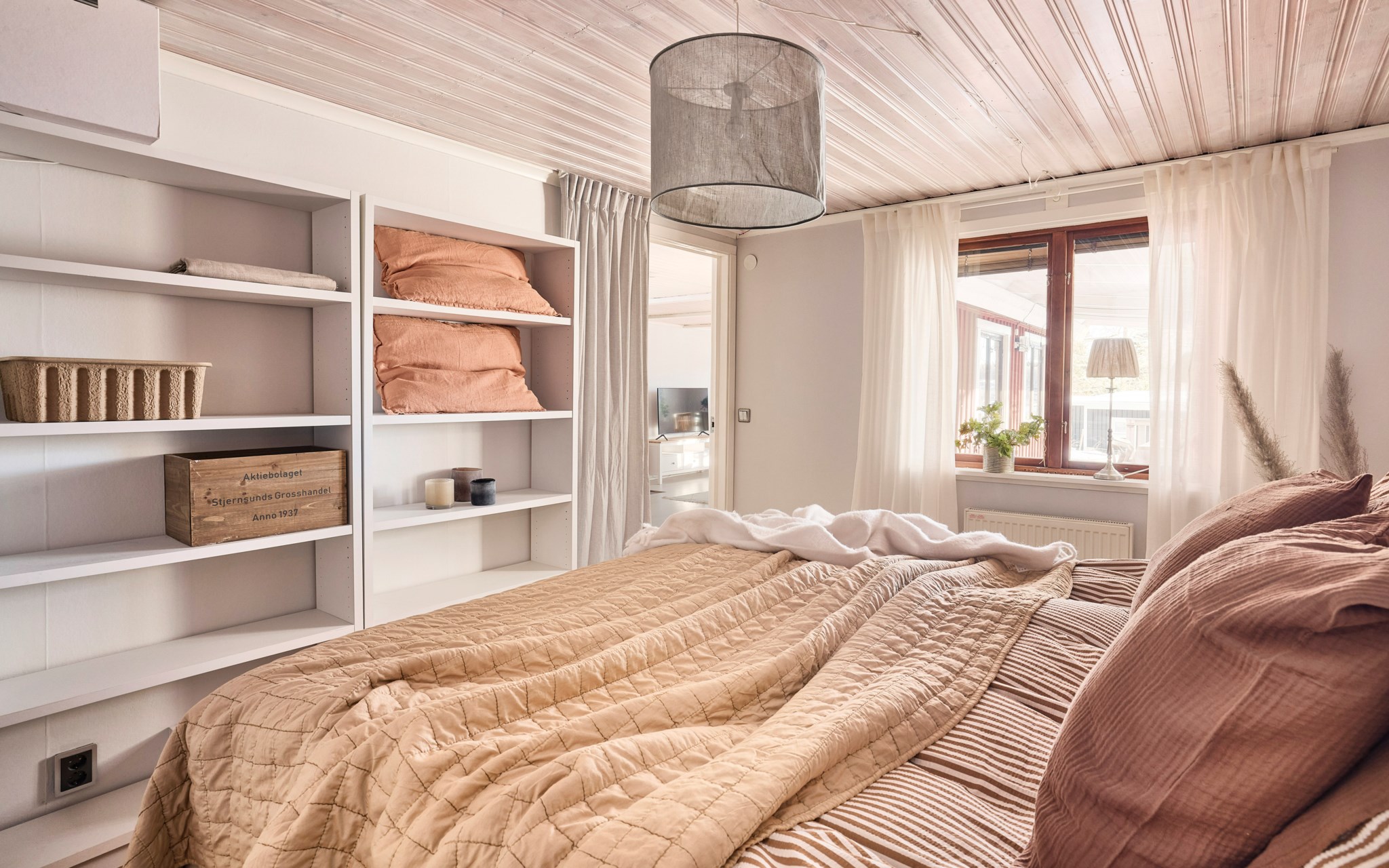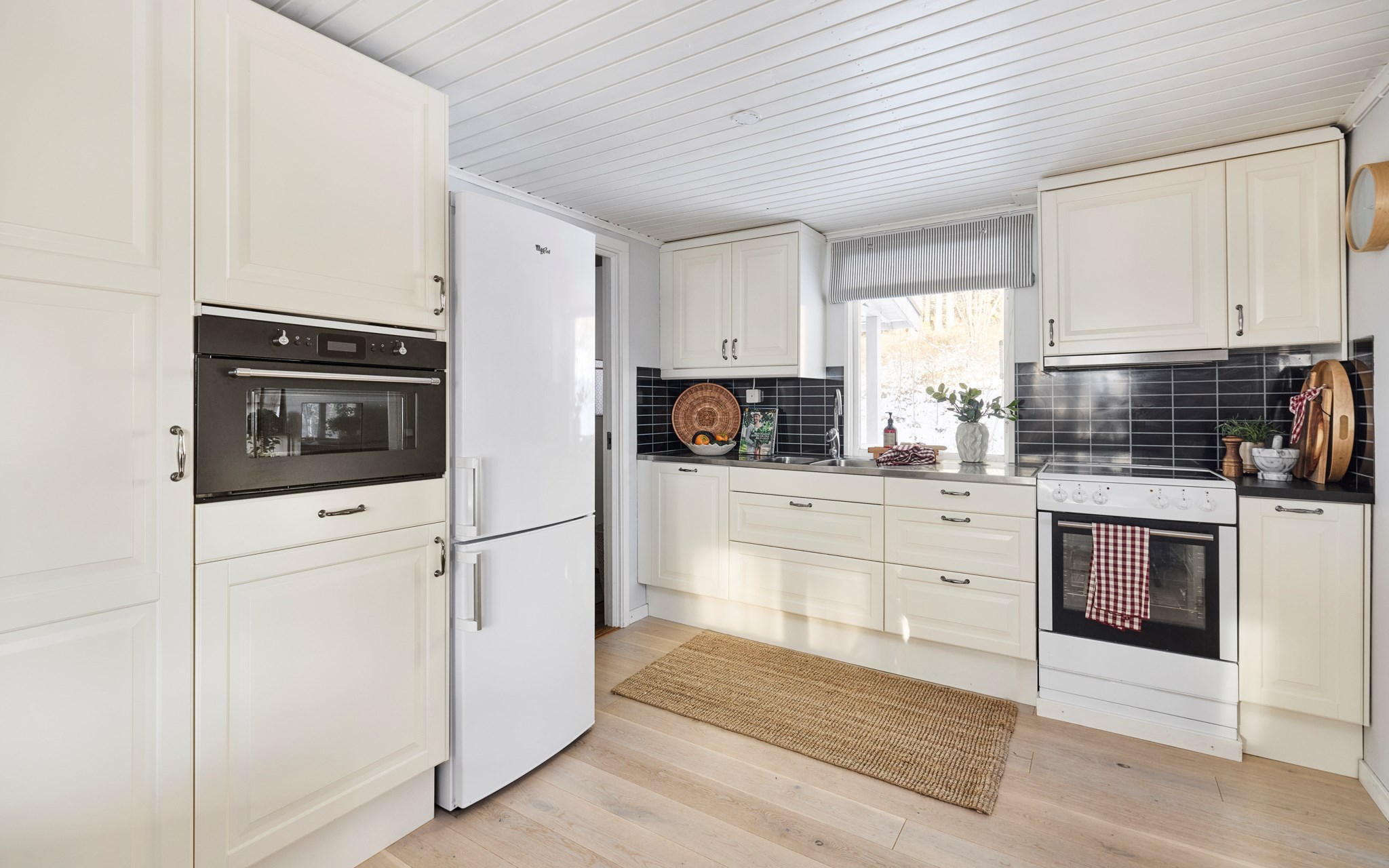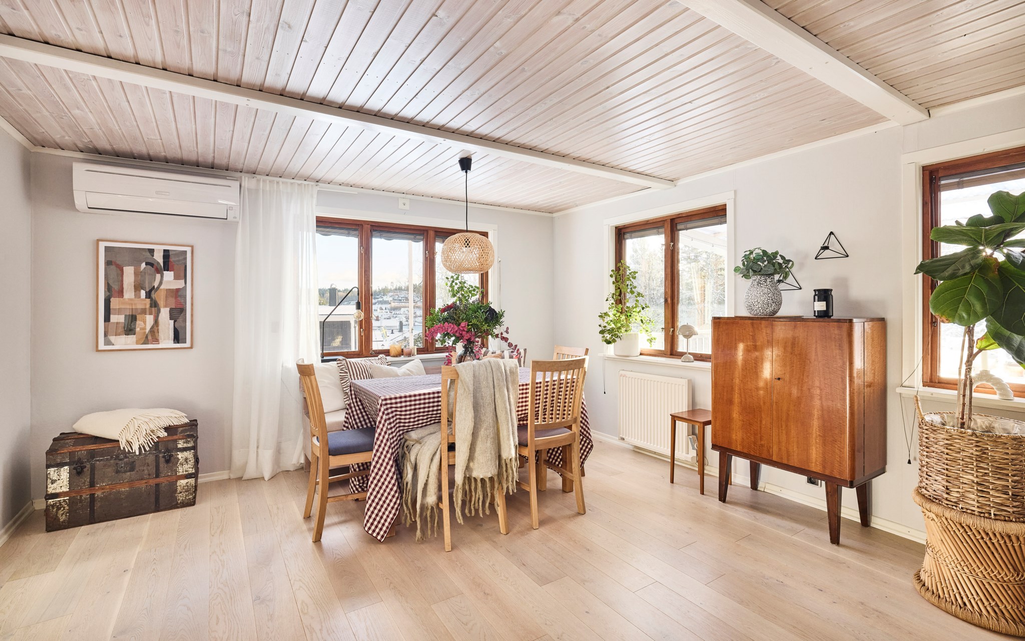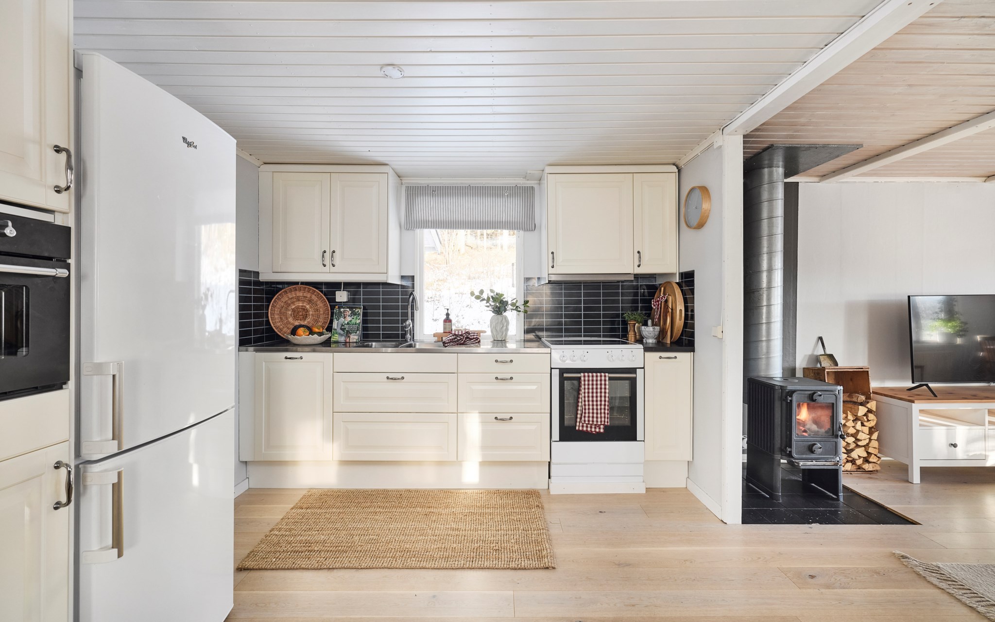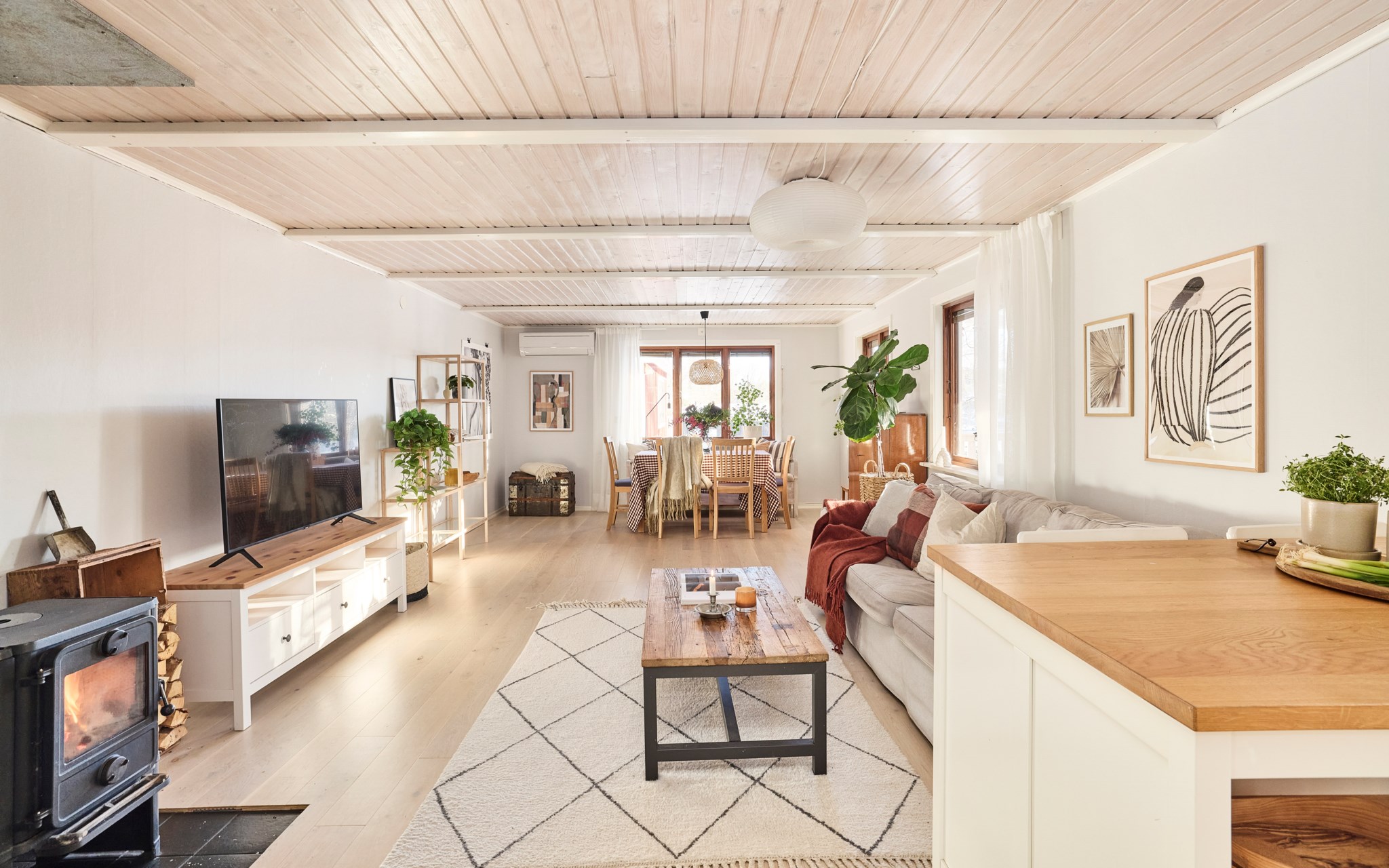 Ett bra året-runt-hus som klänger sig fast på en av Bunns kullar. Skogen i ryggen och sjösidan framför ögonen från altan och vardagsrum. En kuperad tomt med långhuset som sträcker ut sig mellan det fristående gästhuset och vedförrådet. Två bra sovrum, ett stort vardagsrum där kaminen snabbt stödvärmer hela rummet inklusive köket vid behov. Soffan vill du nog mysparkera närmast elden. Sommartid kommer du inse att altanen sitter så rätt som den kan göra på huset för att solens strålar ska fläta sig in från tidig morgon genom skogen och sedan hålla sig framme mest hela dagen.