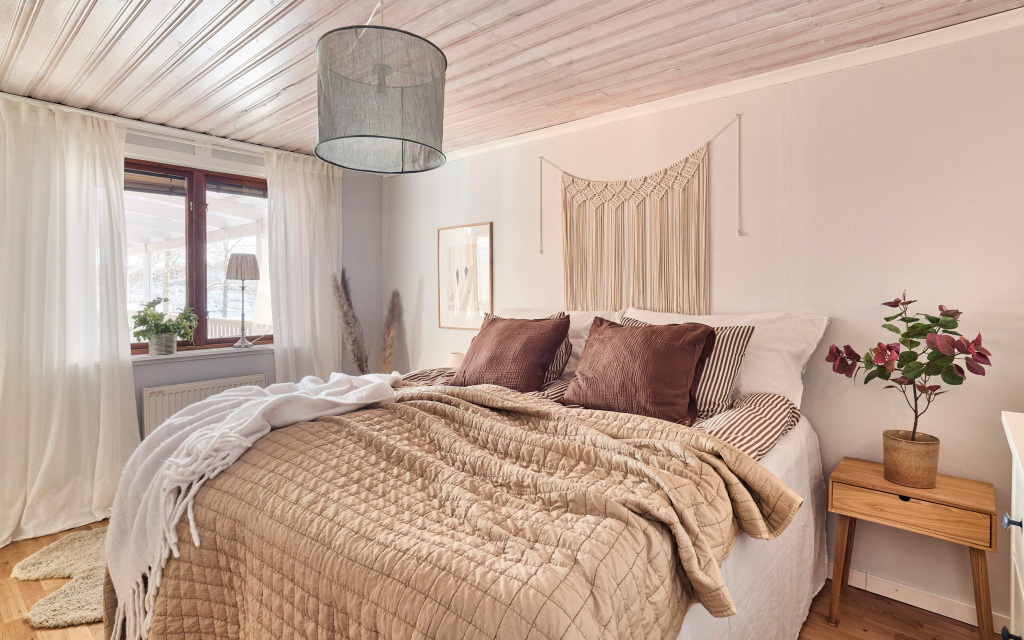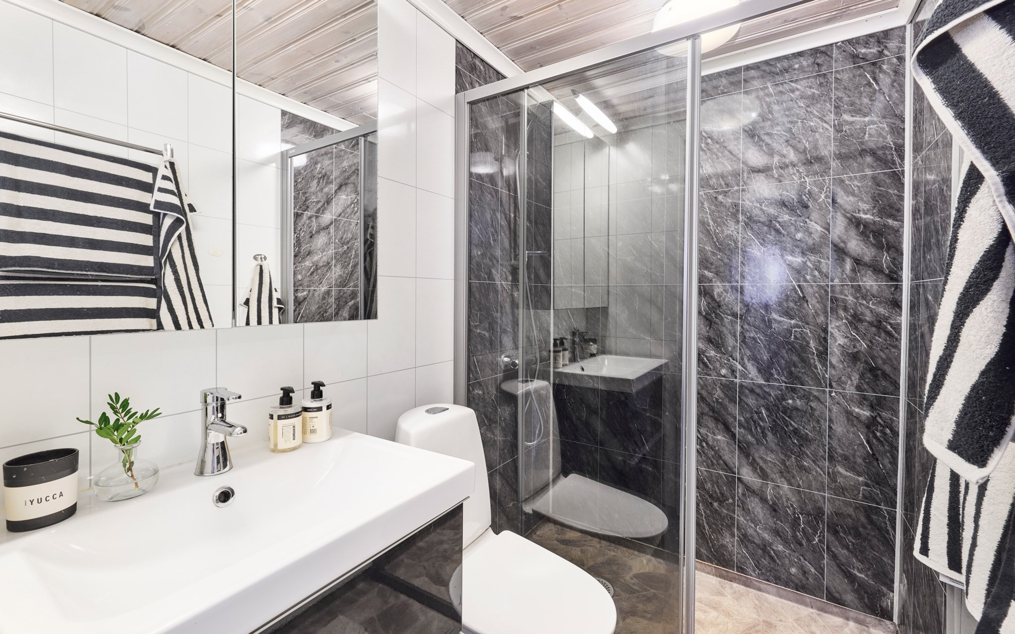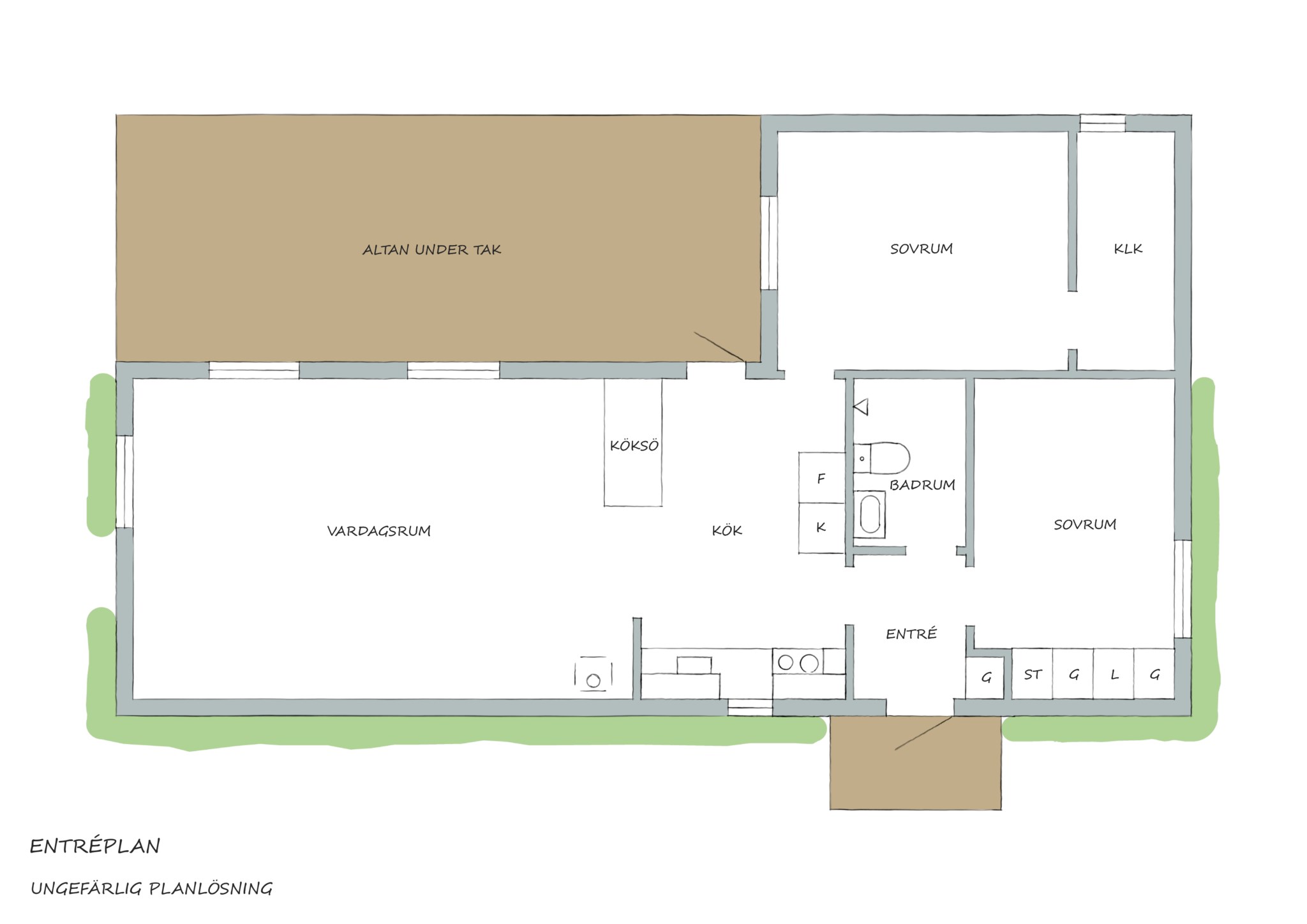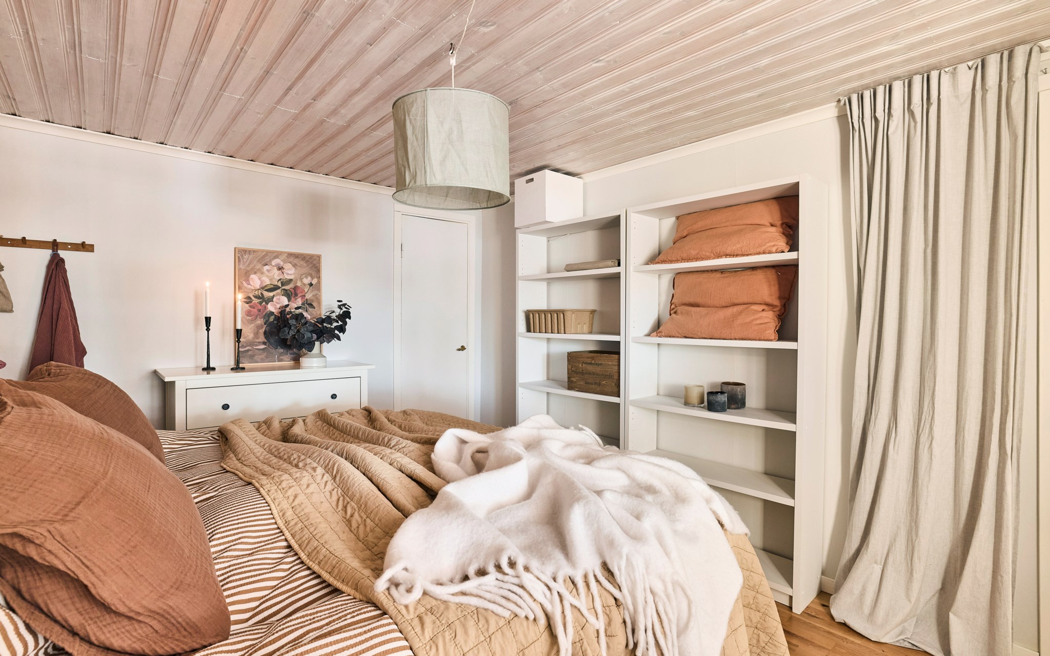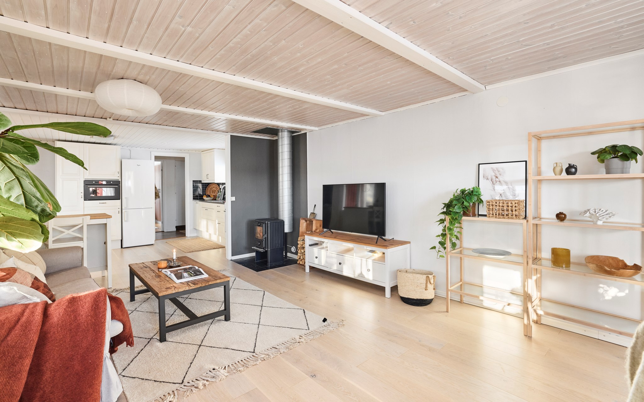 Ett bra året-runt-hus som klänger sig fast på en av Bunns kullar. Skogen i ryggen och sjösidan framför ögonen från altan och vardagsrum. En kuperad tomt med långhuset som sträcker ut sig mellan det fristående gästhuset och vedförrådet. Två bra sovrum, ett stort vardagsrum där kaminen snabbt stödvärmer hela rummet inklusive köket vid behov. Soffan vill du nog mysparkera närmast elden. Sommartid kommer du inse att altanen sitter så rätt som den kan göra på huset för att solens strålar ska fläta sig in från tidig morgon genom skogen och sedan hålla sig framme mest hela dagen.