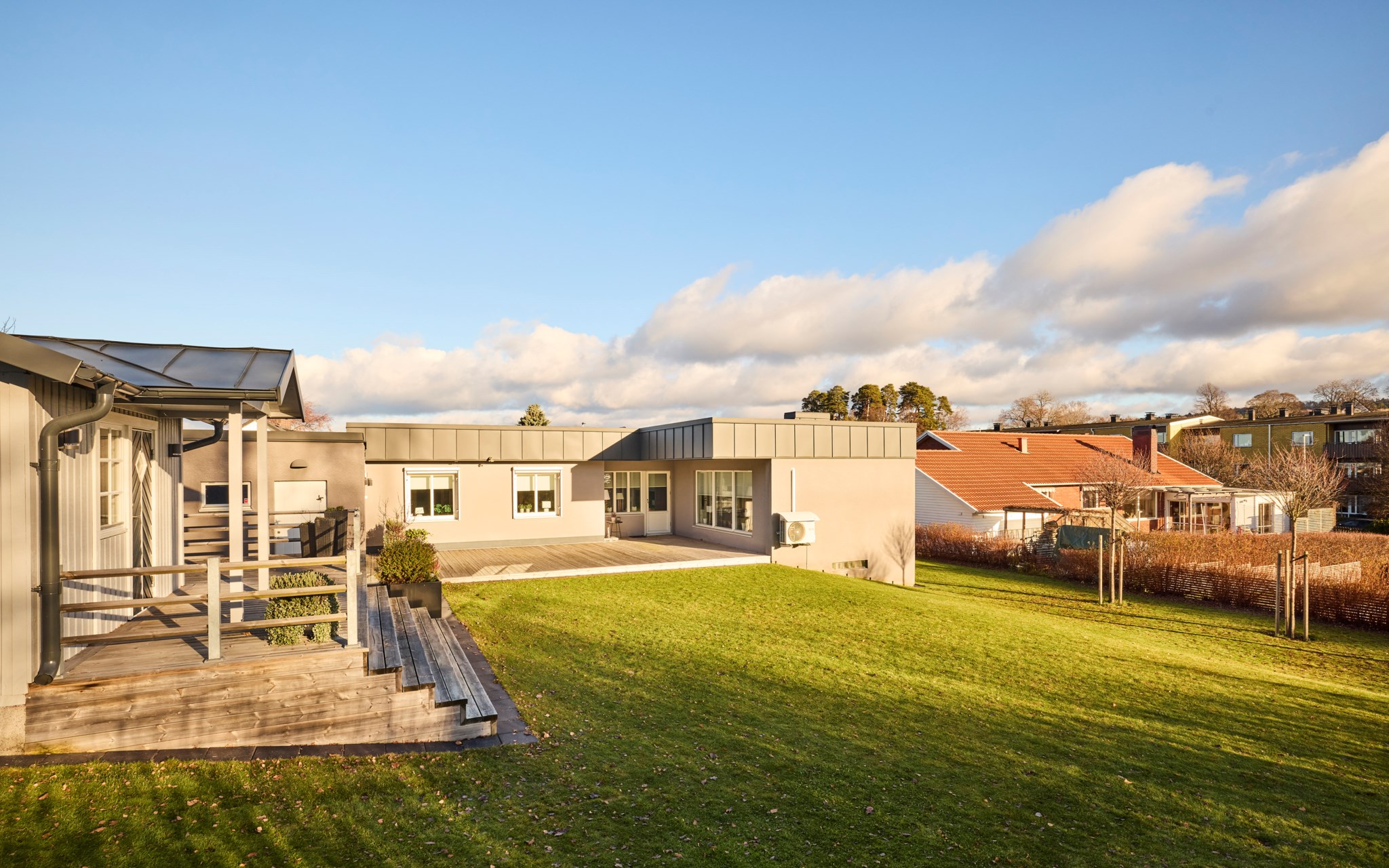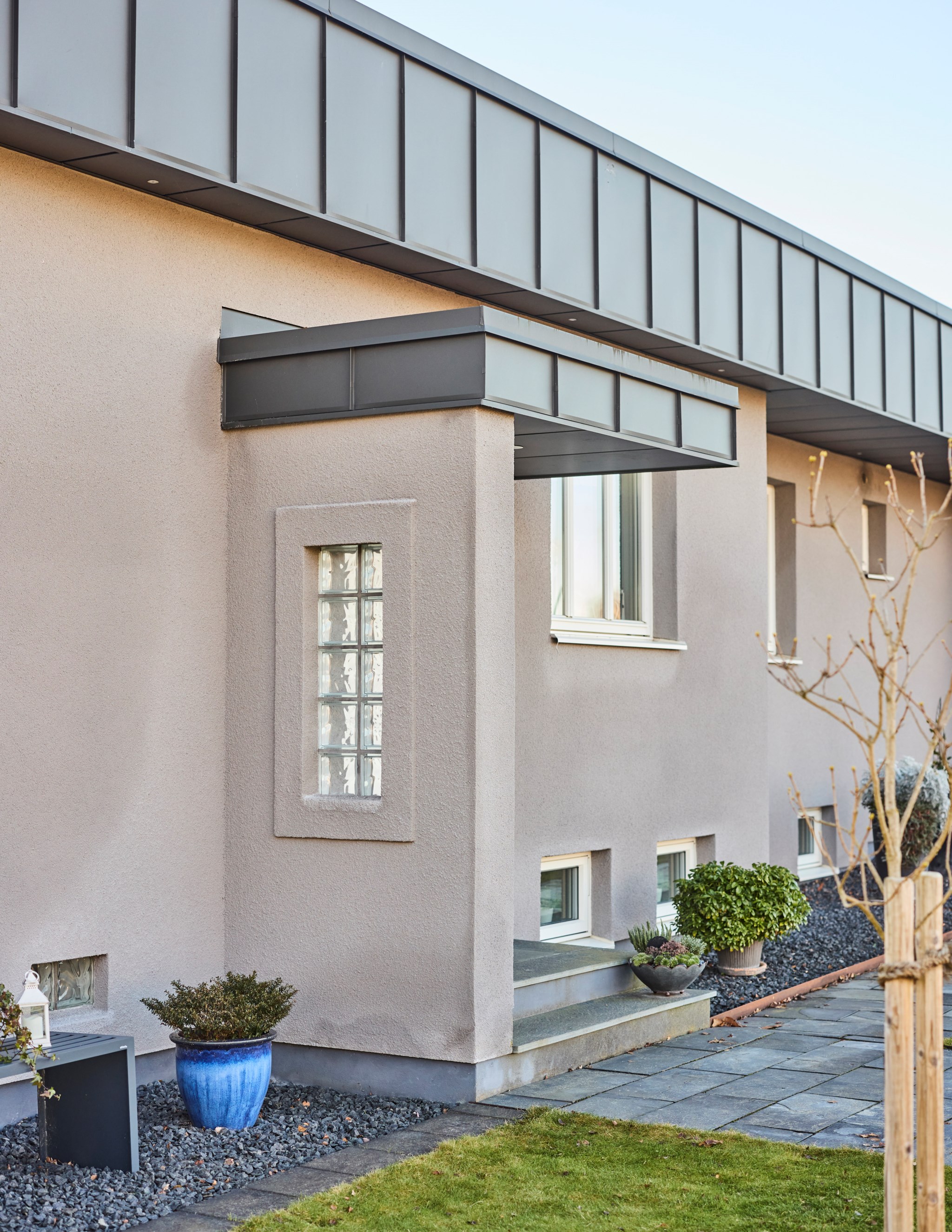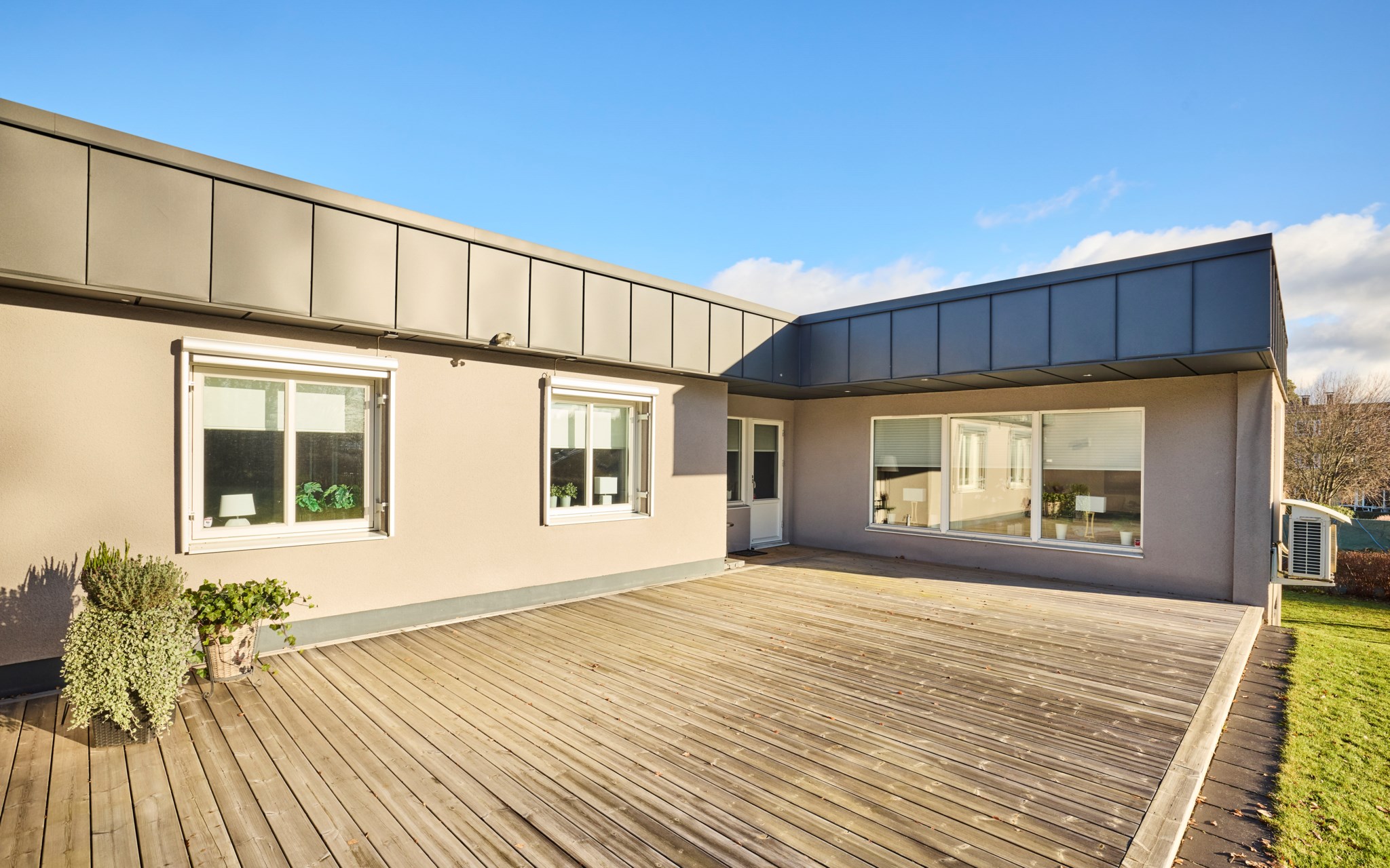 En vinkel-villa blir alltid lite mer spännande för att ytorna öppnar med mer rymd. Här innebär det stora sociala ytor i båda ändar av huset, för att inte tala om en trappa ner. Dessutom finns ett stort garage sammanbyggt med huset. Fasaden från början i tegel, men huset har av nuvarande ägare fått en stramt putsad fasad med plåtklädd takfot. Det platta taket är omlagt 2011 med ny tjärpapp, och utan anmärkning vid nyligen genomförd besiktning. Huset värms med luftvärmepumpar och direktverkande el.