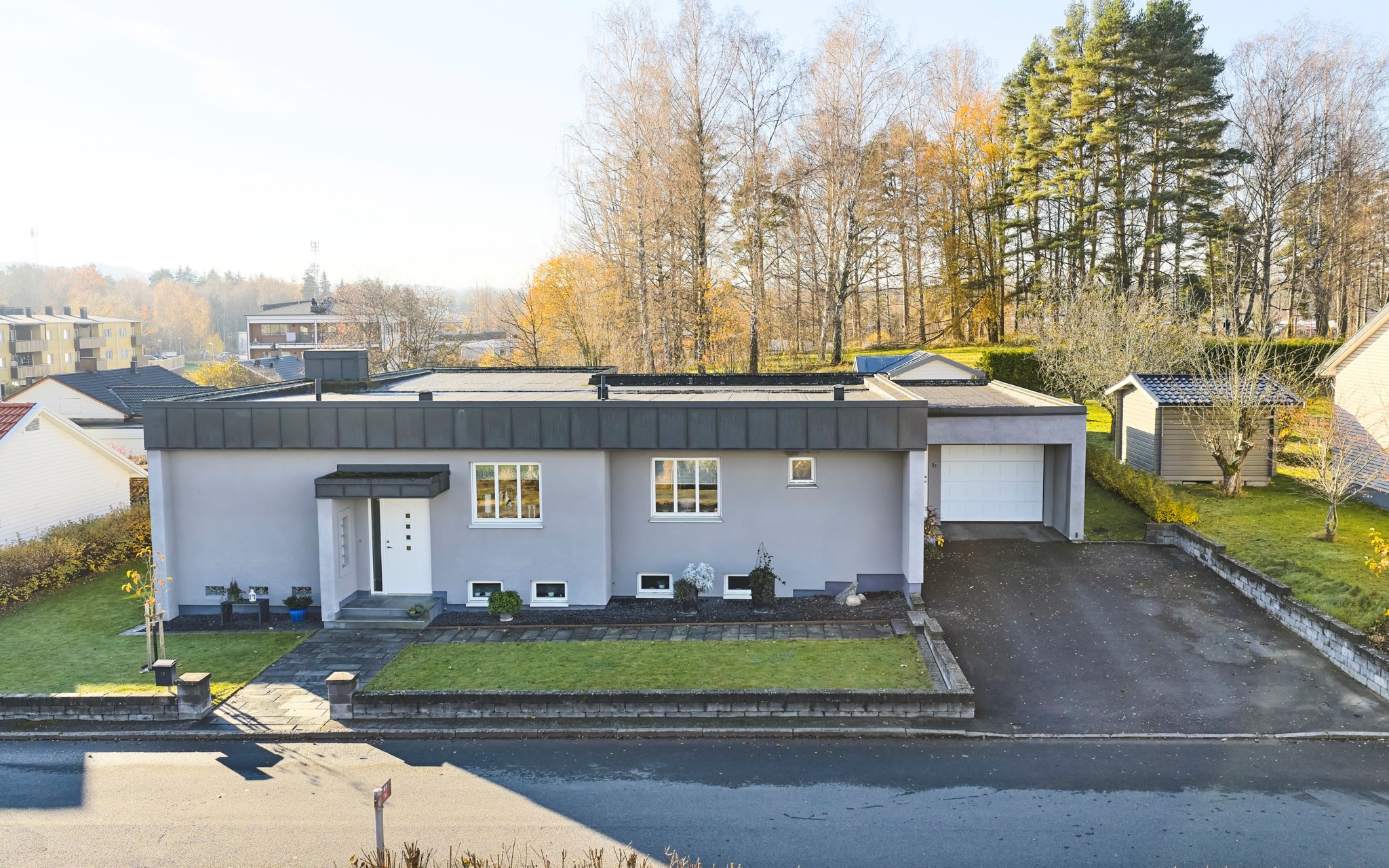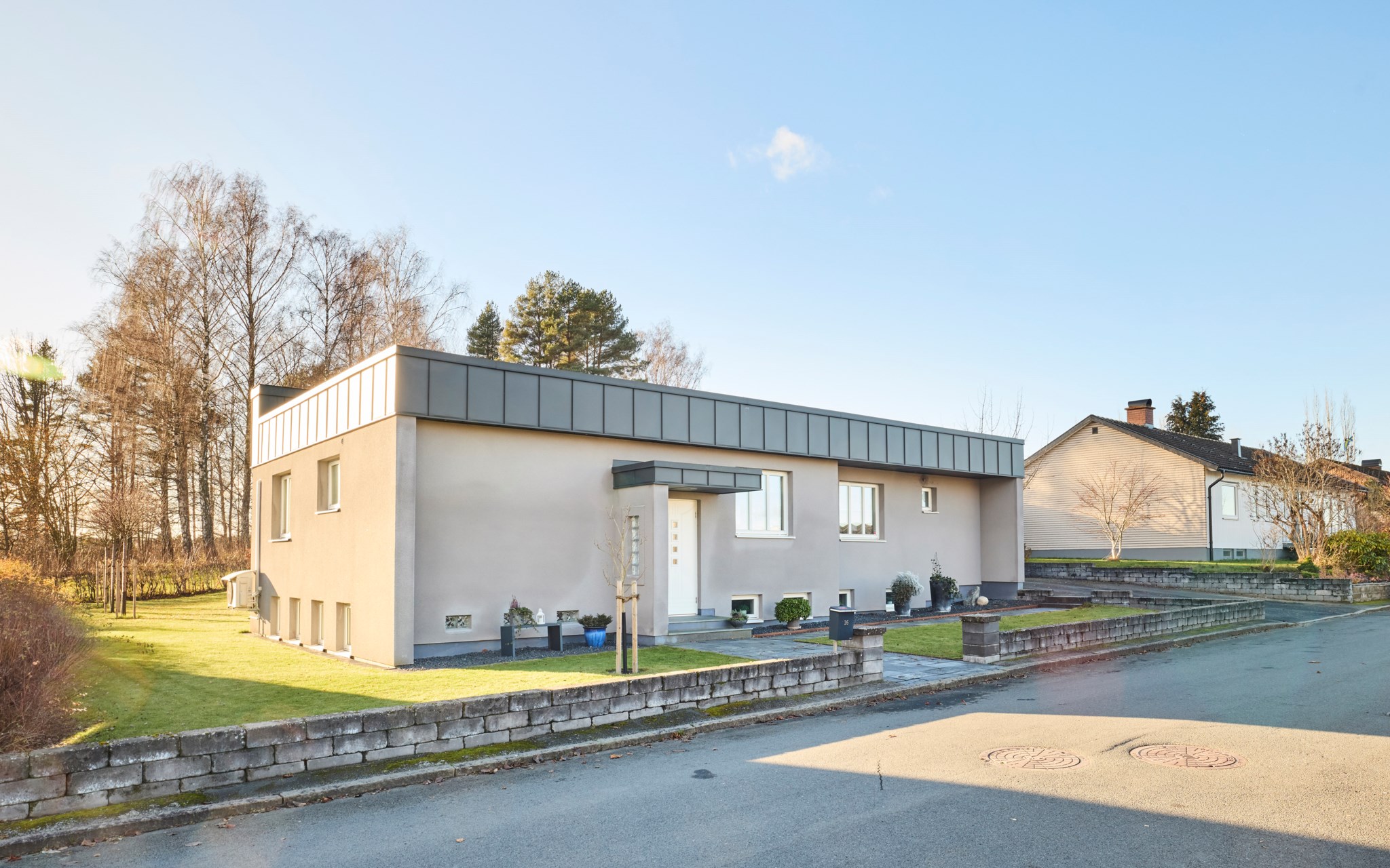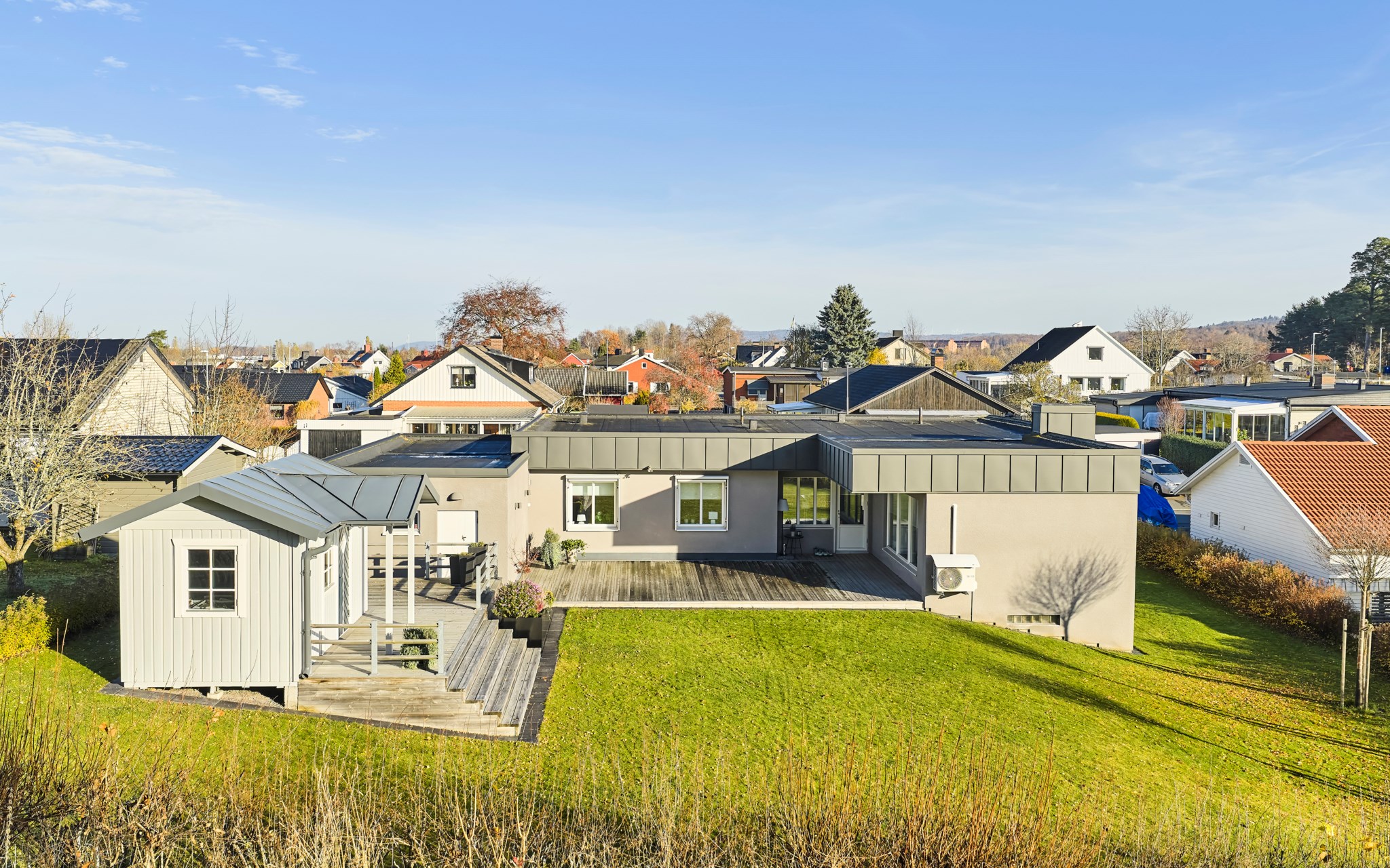 En vinkel-villa blir alltid lite mer spännande för att ytorna öppnar med mer rymd. Här innebär det stora sociala ytor i båda ändar av huset, för att inte tala om en trappa ner. Dessutom finns ett stort garage sammanbyggt med huset. Fasaden från början i tegel, men huset har av nuvarande ägare fått en stramt putsad fasad med plåtklädd takfot. Det platta taket är omlagt 2011 med ny tjärpapp, och utan anmärkning vid nyligen genomförd besiktning. Huset värms med luftvärmepumpar och direktverkande el.