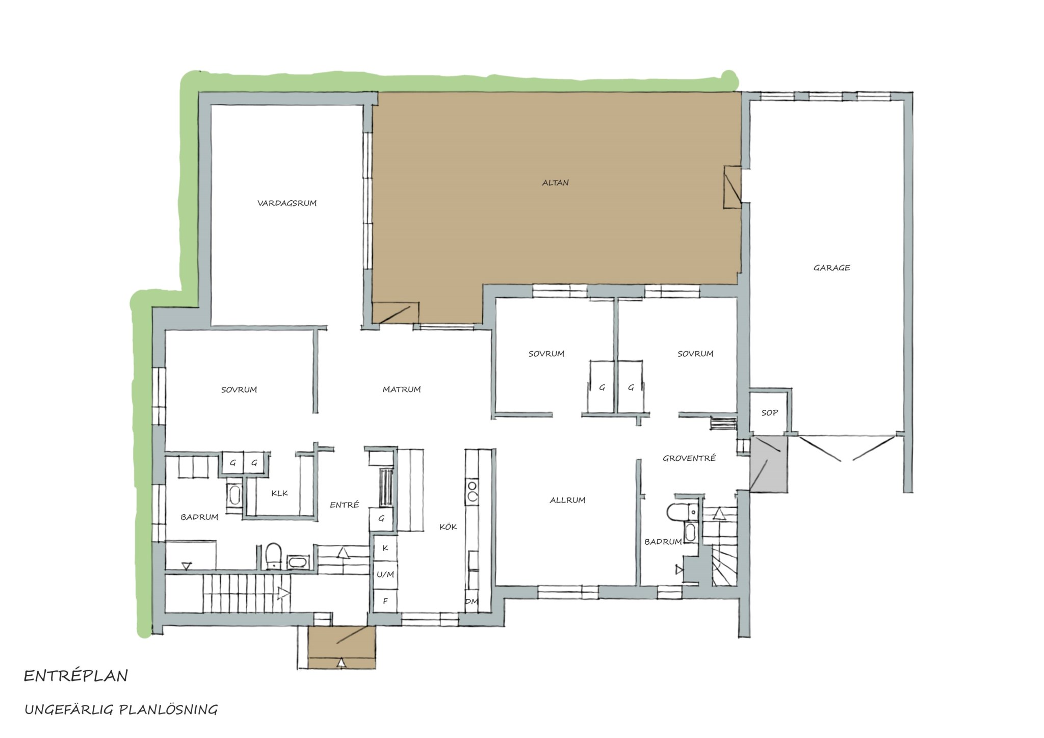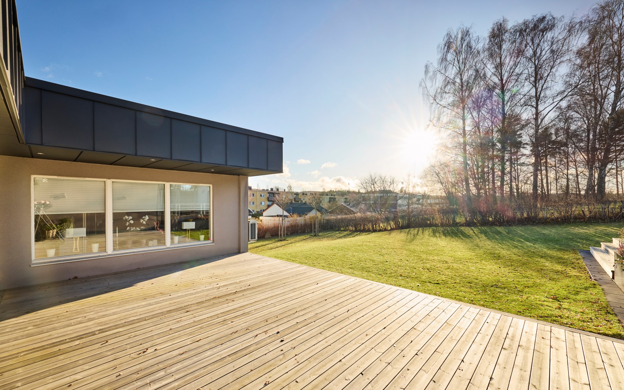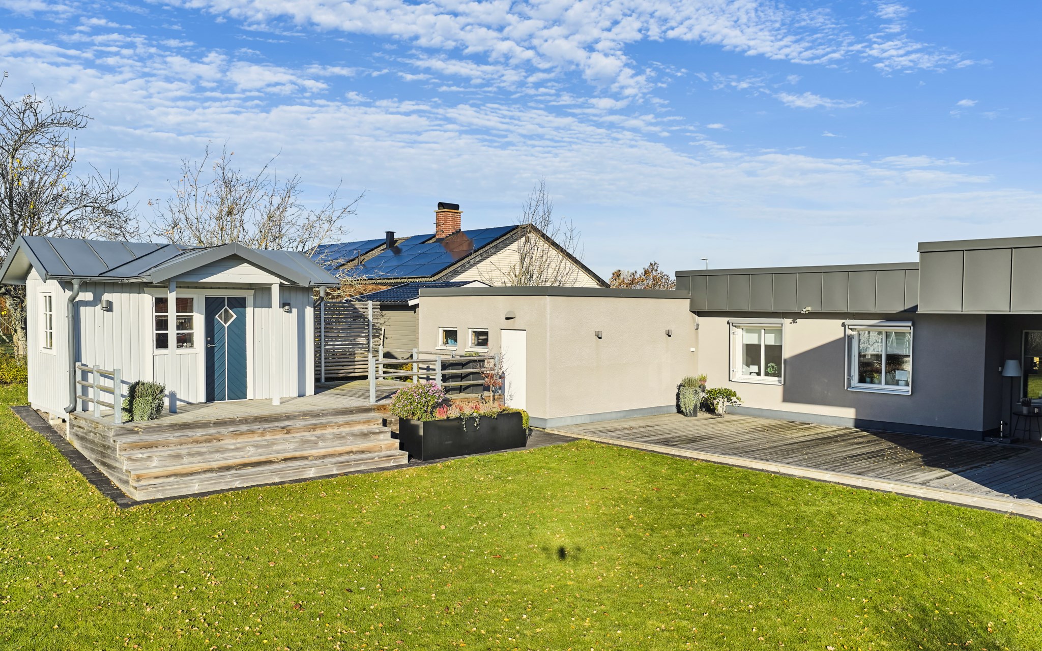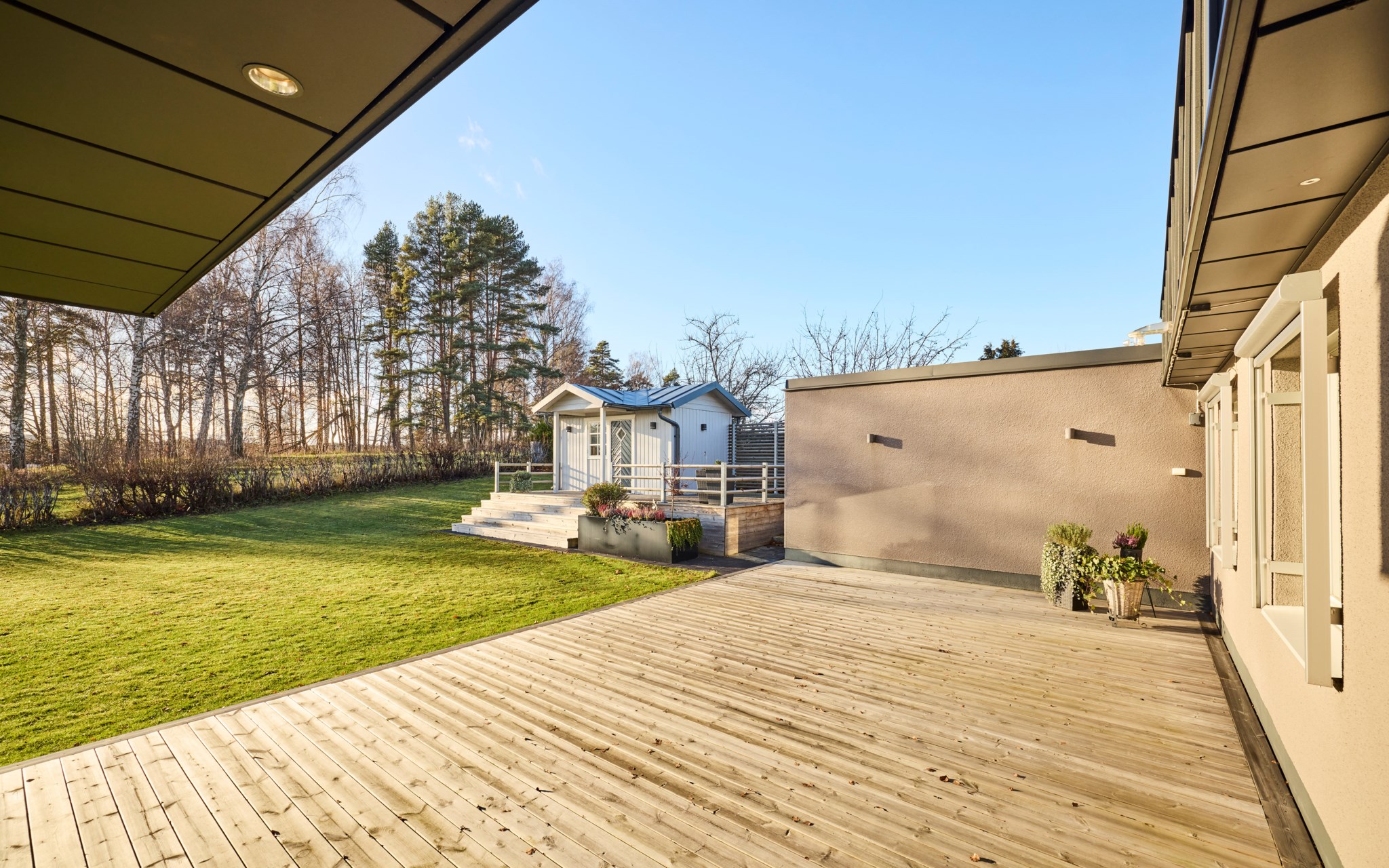 Solens strålar hittar redan på morgonen till altanen vid friggeboden. Den stora altanen utanför vardagsrummet har sol från cirka kl 10 fram till kvällen. En altan som inbjuder till många härliga grillkvällar under sommartid.