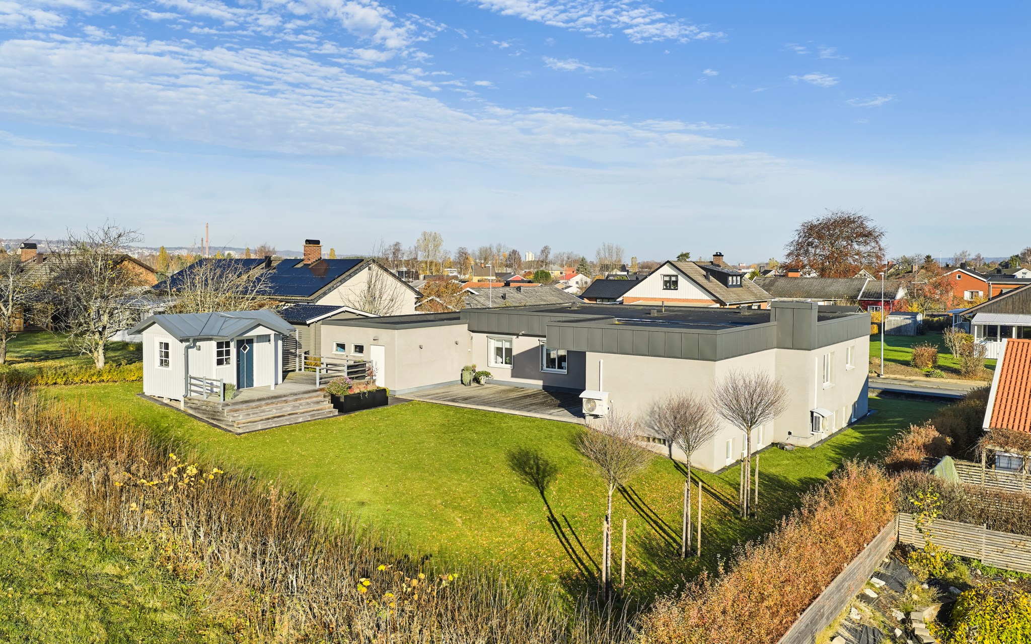 Din privata del av trädgården ligger definitivt på baksidan av huset. Framsidan är lite mer strikt och formell. Nuvarande ägare har dessutom gjort det lätt att njuta av trädgården. Men är du typen som drömmer om längre rabatter, fler blomstersängar och djupare odlingslådor så finns det plats för det. Huset bildar med garaget en stor u-form som skyddar både dig och växtligheten från nordanvinden. Trädäcket är stort och du kommer hitta både skugga och sol, vilket du än åstundar mest. Ägarnas sommarfavorit är den upphöjda skuggan vid friggeboden. Via genväg genom häcken hittar du till skogsdungen och lekplatsen på allmänningen.