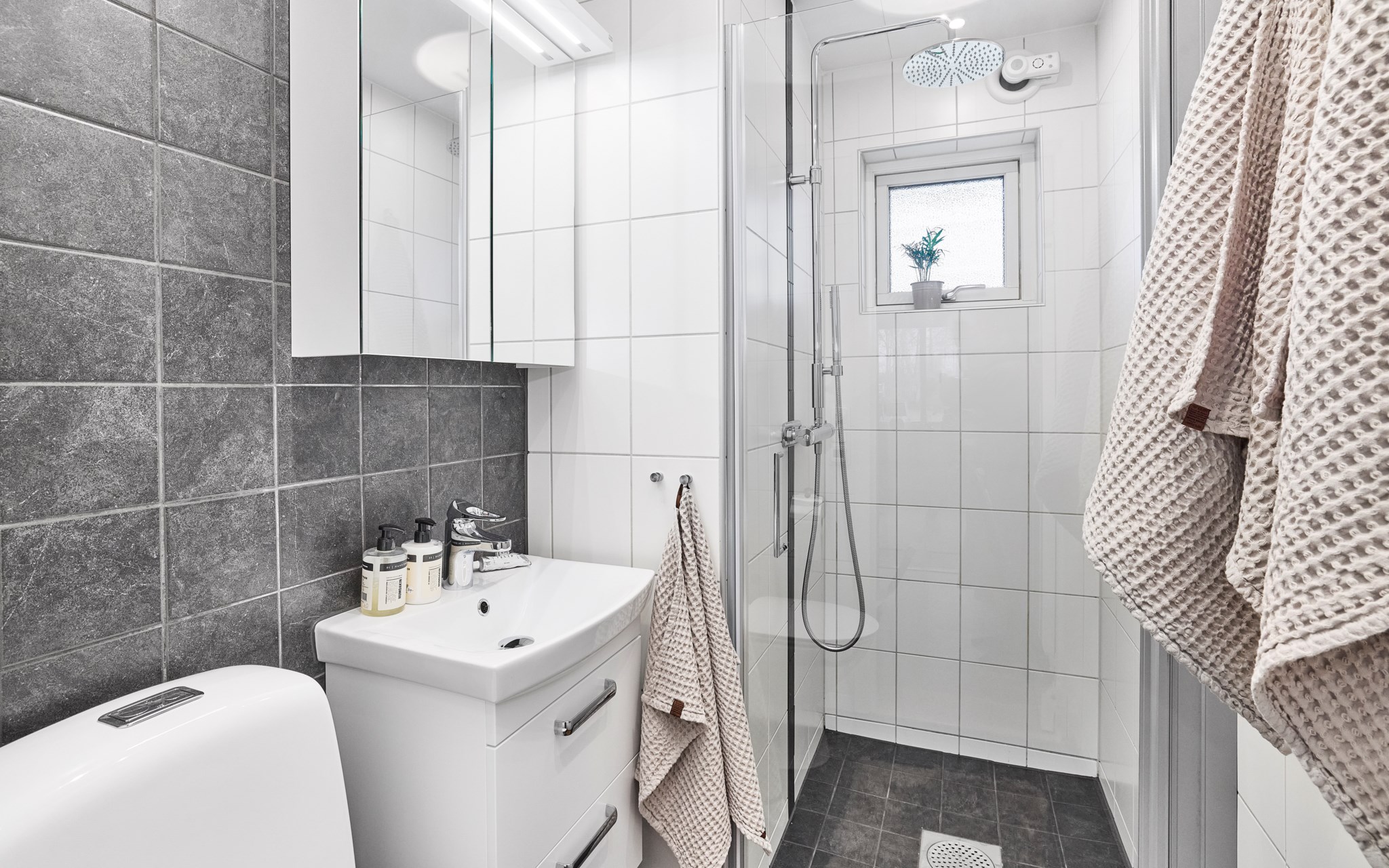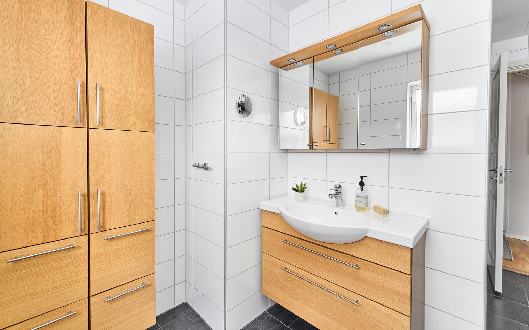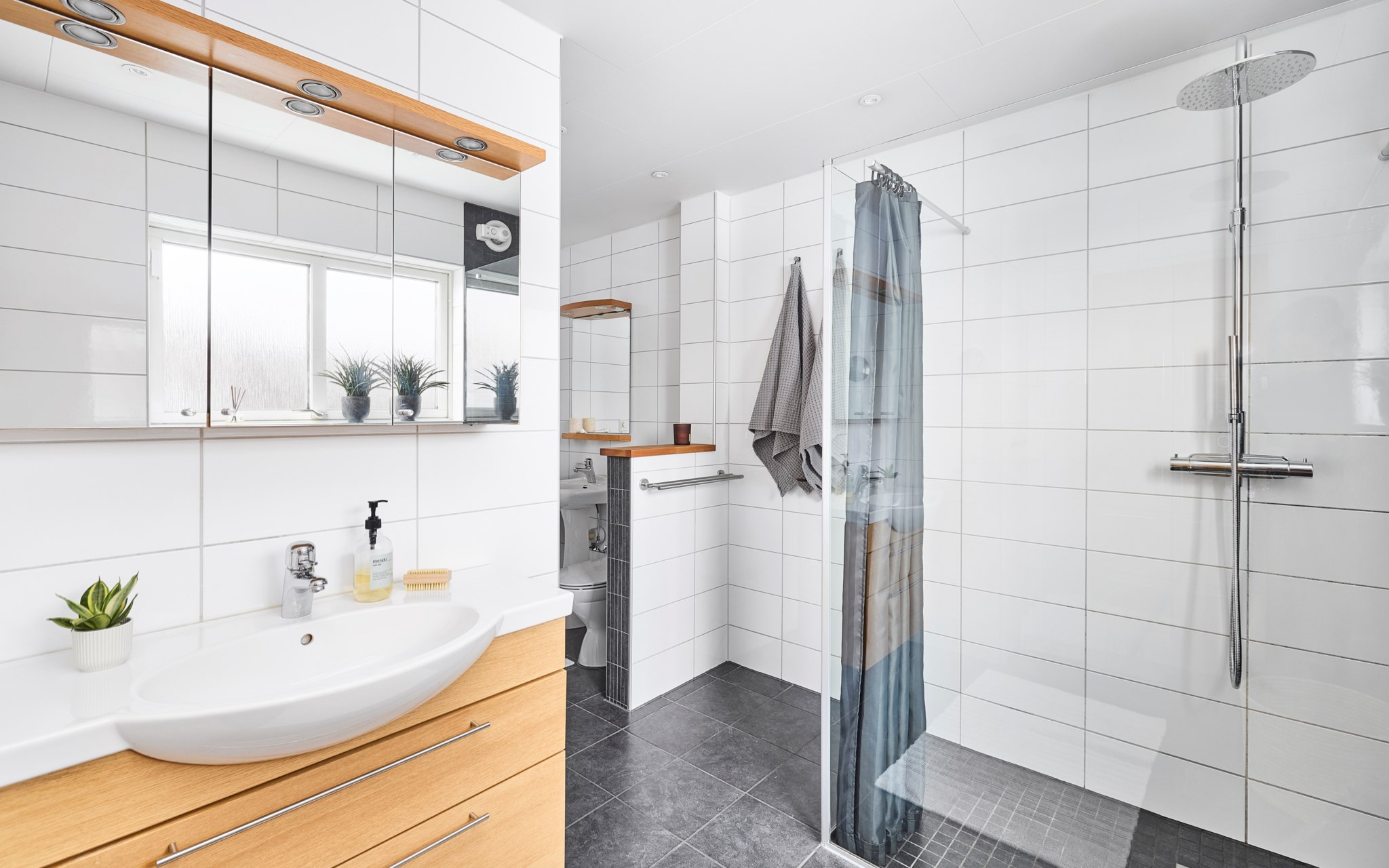 Två badrum på entréplanet och båda i mycket fint renoverat skick. Lite olika i stilen, men neutrala i färg och material för att stå emot framtidens spretande trender på ett bra sätt. Även badrummen ligger i var sin ände av huset, smidigt tillgängliga från både de sociala delarna av huset och sovrummen. Båda dessutom smidigt placerade vid varsin trappa, för enkel kommunikation upp och ner. Drömmer du om en egen spa-anläggning, står hela gamla ”pannrummet” till förfogande nere.