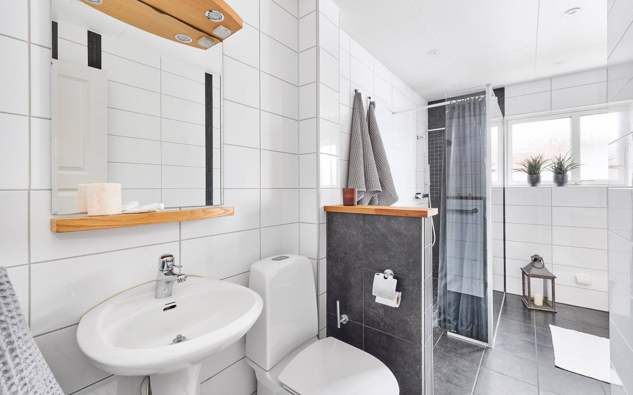 Såväl det stora som lilla badrummet renoverades 2008. Båda badrummen är utrustade med elburen golvvärme. Här installerades bland annat nya takduschar och toalettstolar 2025 och även nya takspottar (LED) i stora badrummet.