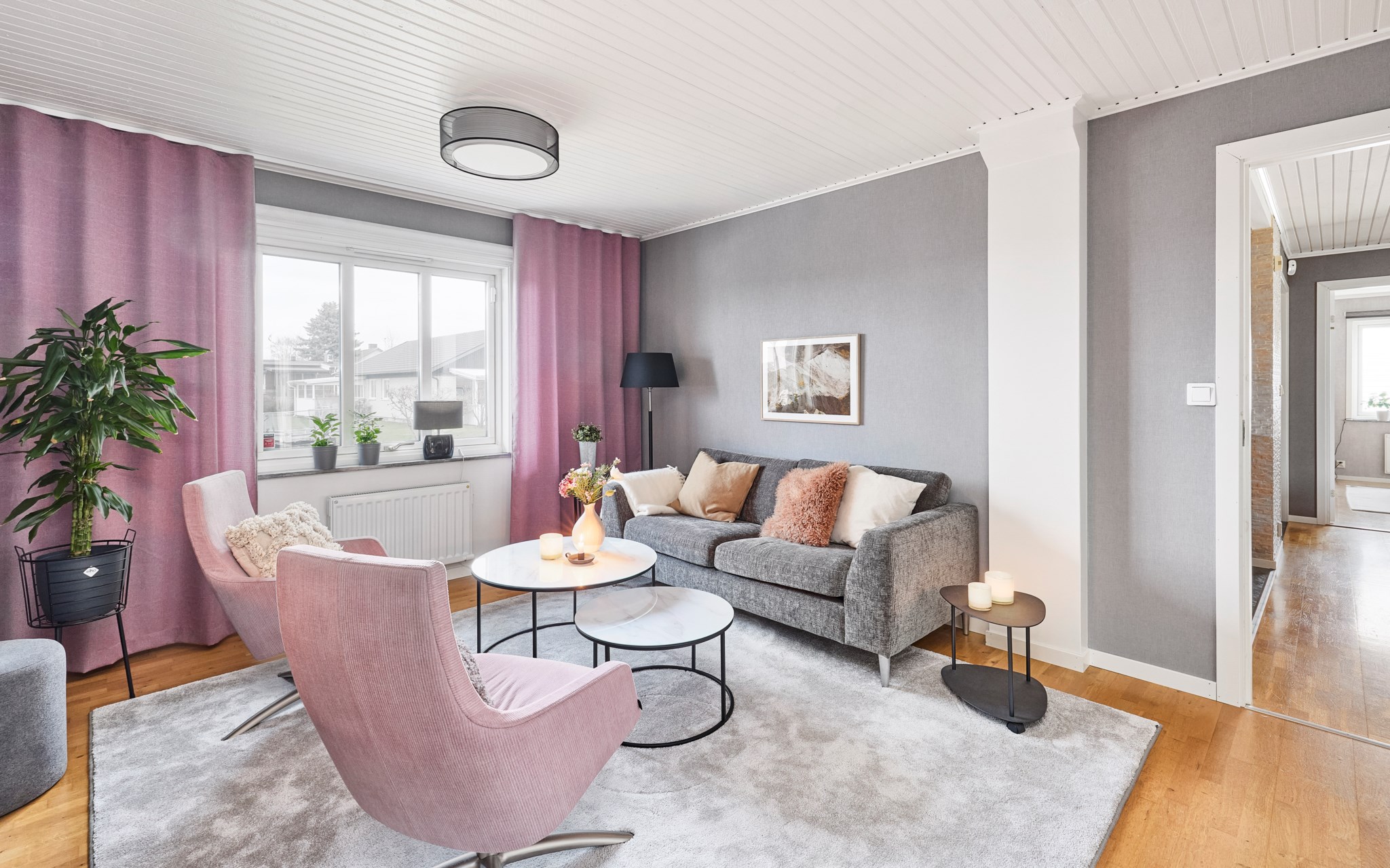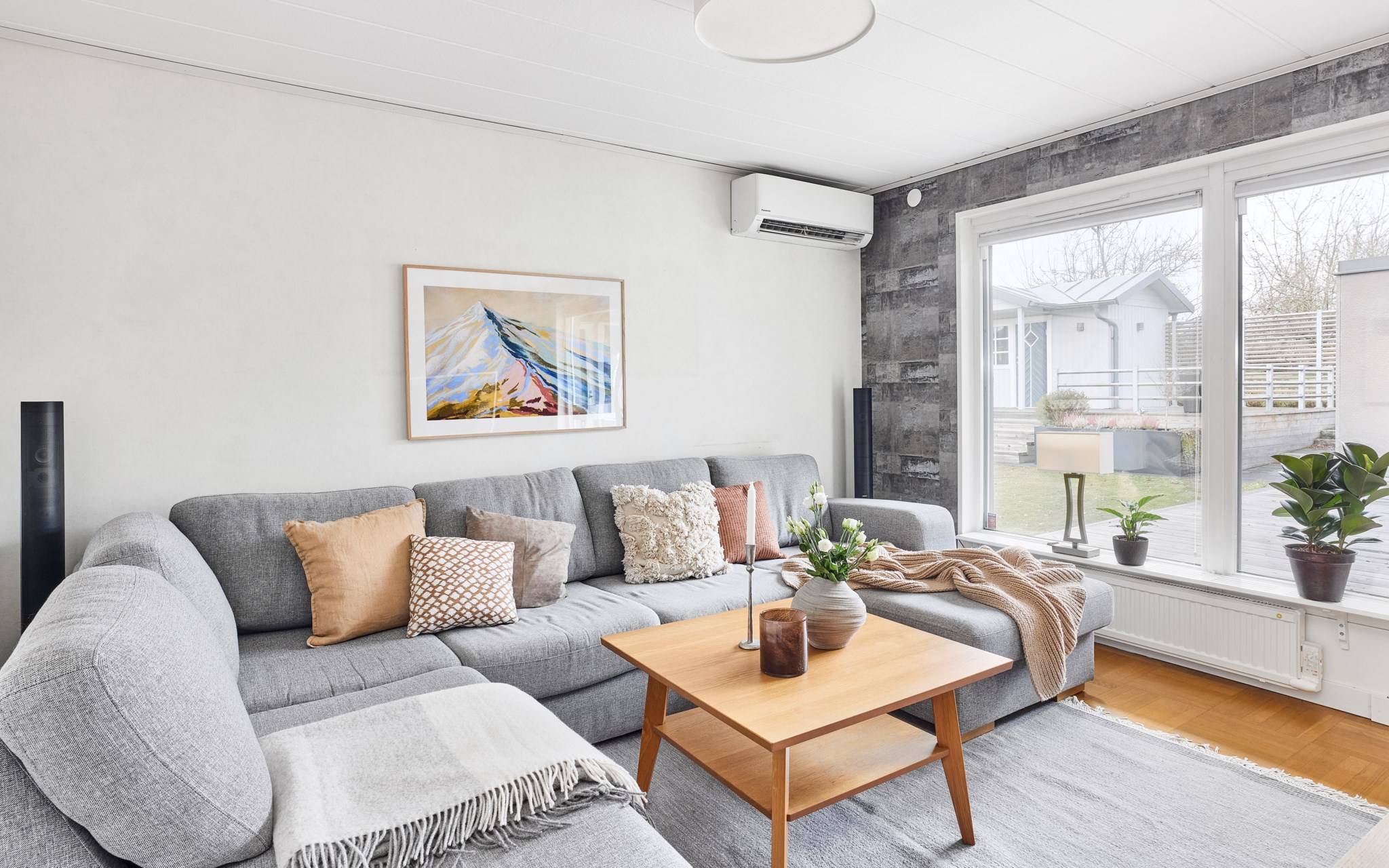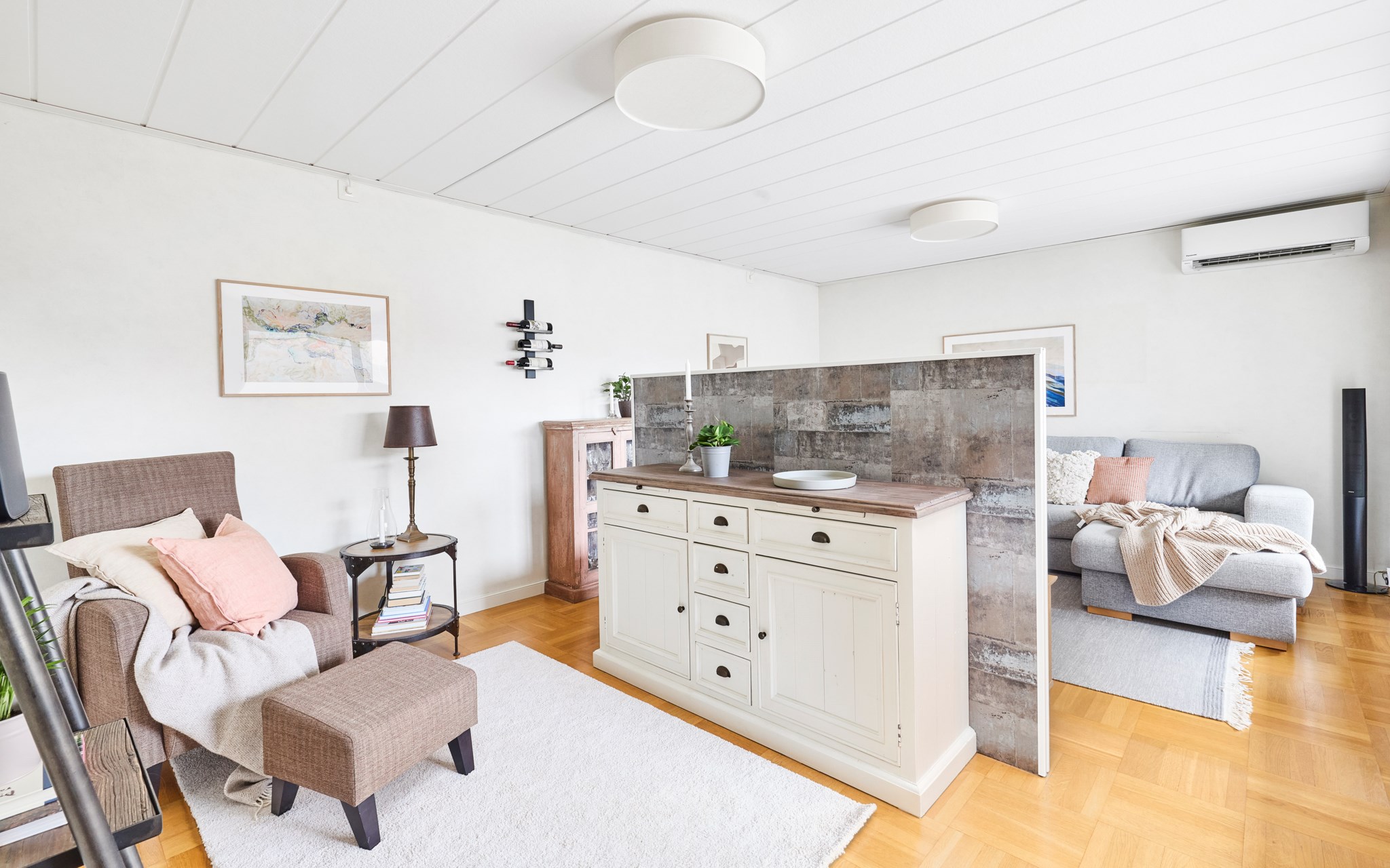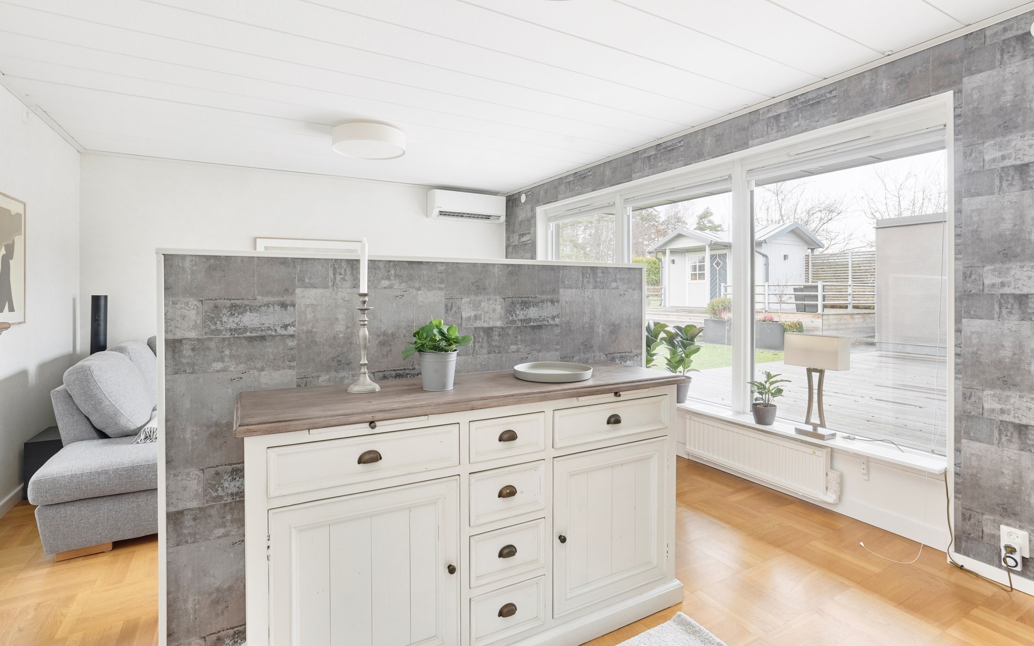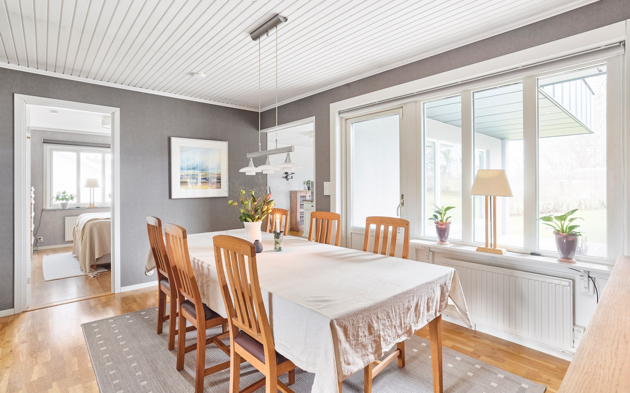 Detta rum upptar nästan hela vinkeln av villan med det stora glaspartiet mot väster och in mot gården. Alltså diskret mot gatan och insynen helt obefintlig. Parketten är husets ursprungliga som legat på plats i nästan 60 år – fint skick alltjämt. Planlösningen är som du ser relativt öppen med fint flöde till matplats, kök och hall, men rumsfunktionerna ändå väl definierade och med en egen sfär. Fönsterpartiet i vardagsrummet är bytt precis som övriga i huset. Luftvärmepumparna kan både generera kyla och värme. Murstocken passerar i hörnet och det borde inte vara något problem att koppla på en kamin om du drömmer om det.