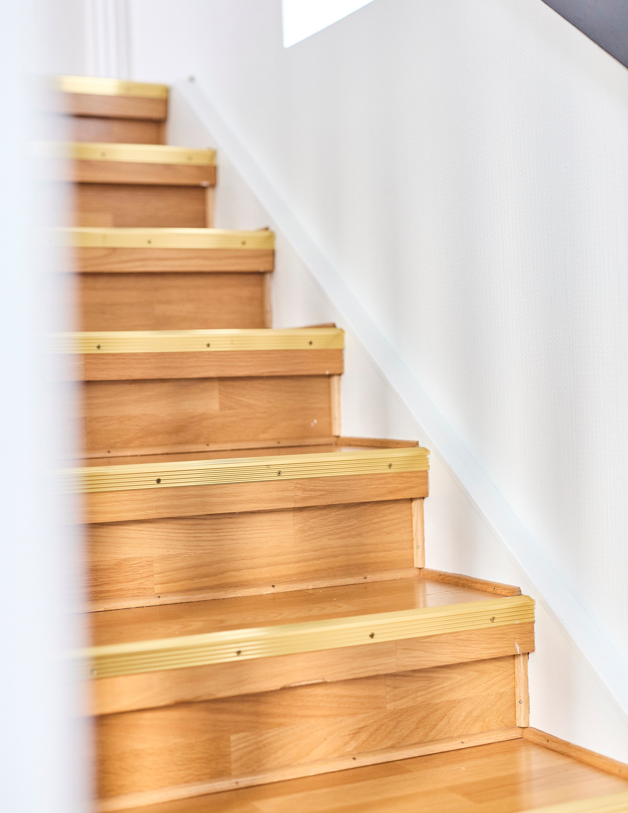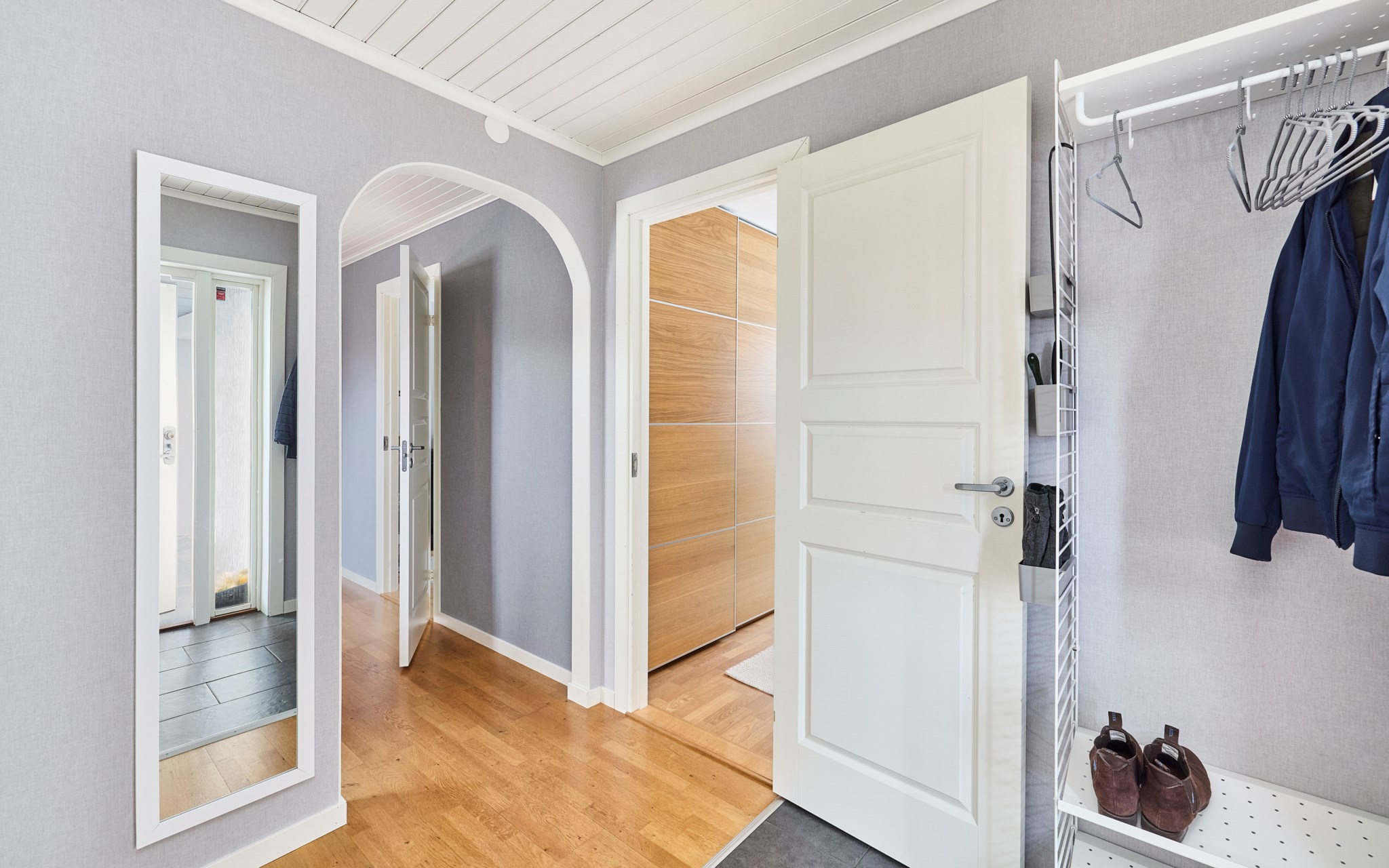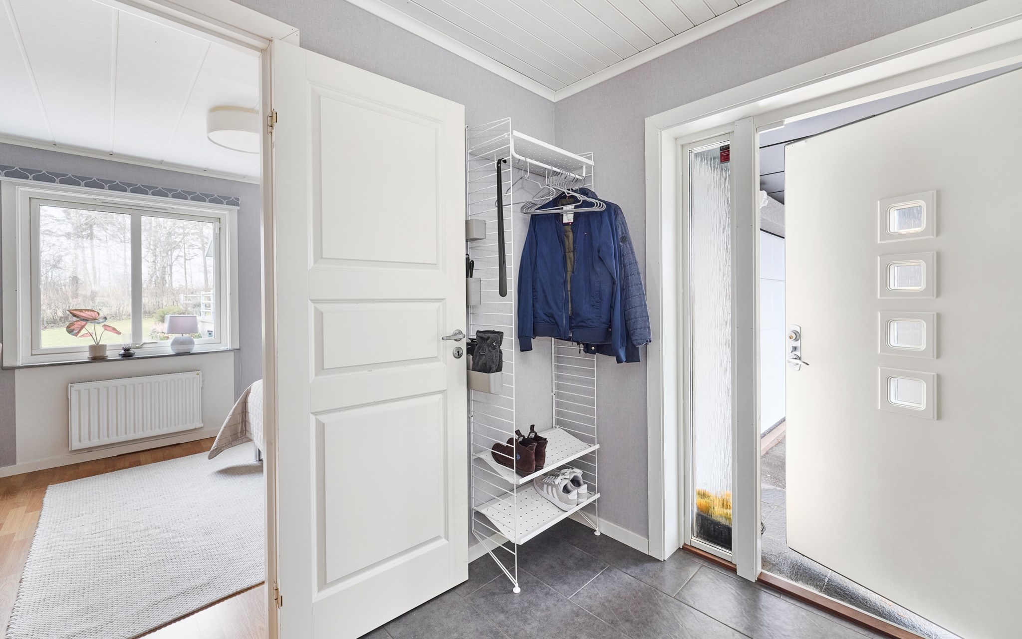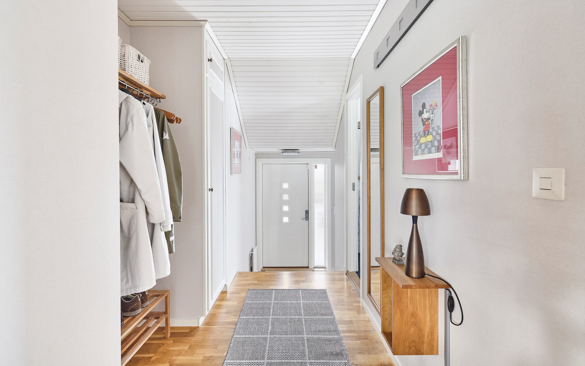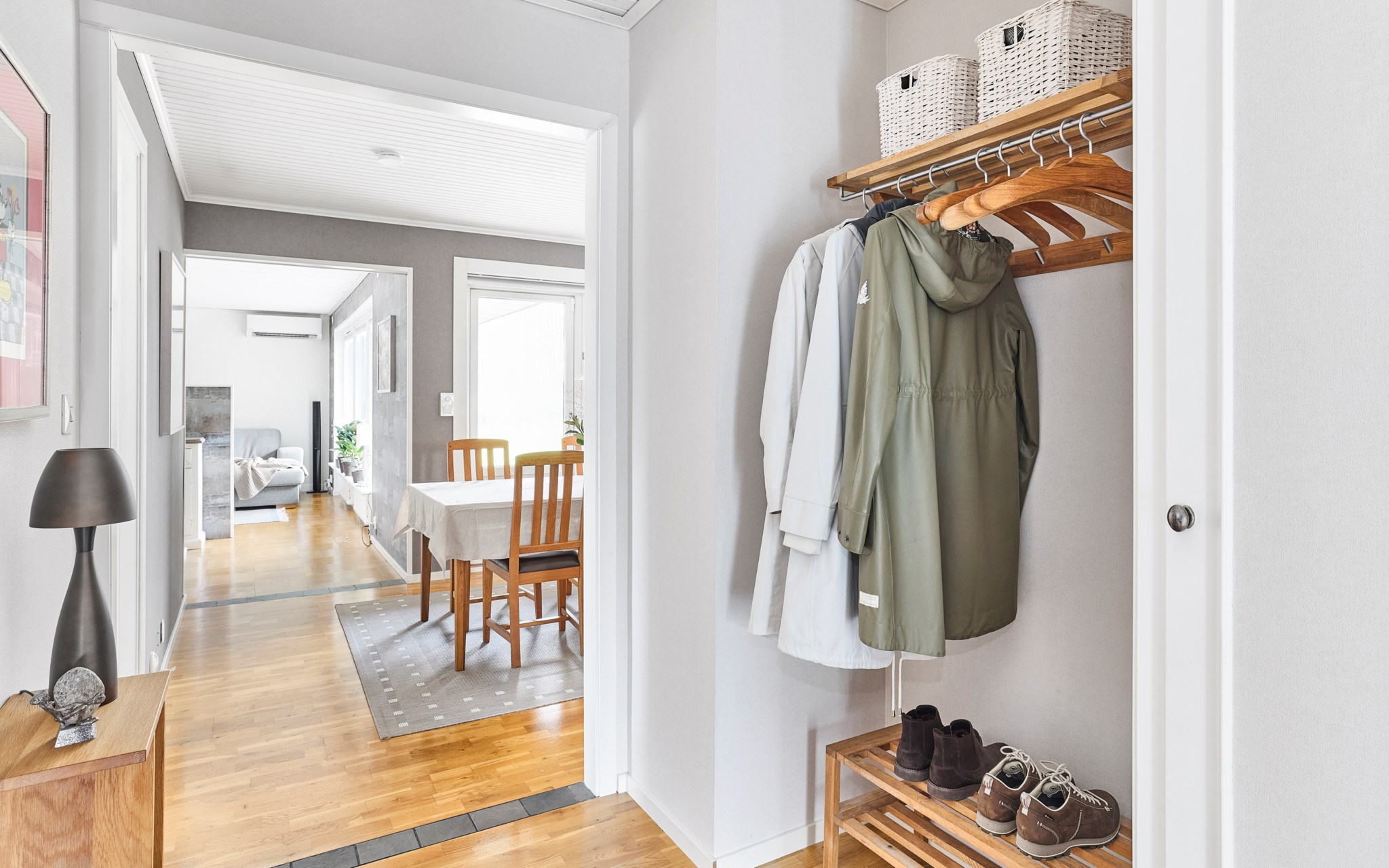 Stensättningen fram till ytterdörren är stilrent och fint matchad med husets nya putsade fasad. Dörr och entréparti nya, precis som fönstren i hela huset. Fin belysning av fasaden dessutom, om du kommer om kvällen. Du kliver in i markplan men resten av entréplanet ligger fyra trappsteg upp. Insteg och trappa i klinker, men sen tar ekparketten över. Husets första källartrappa hittar du direkt till vänster, liksom det stora badrummet när du kommit uppför trappan.