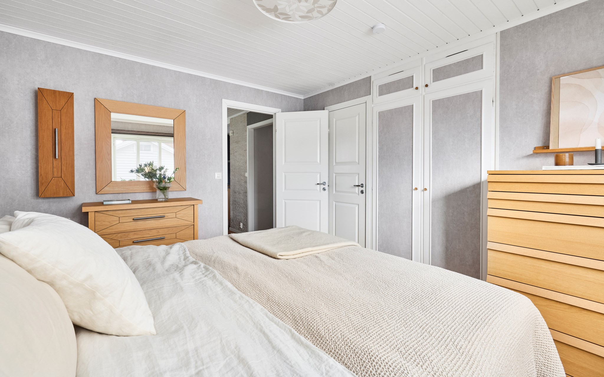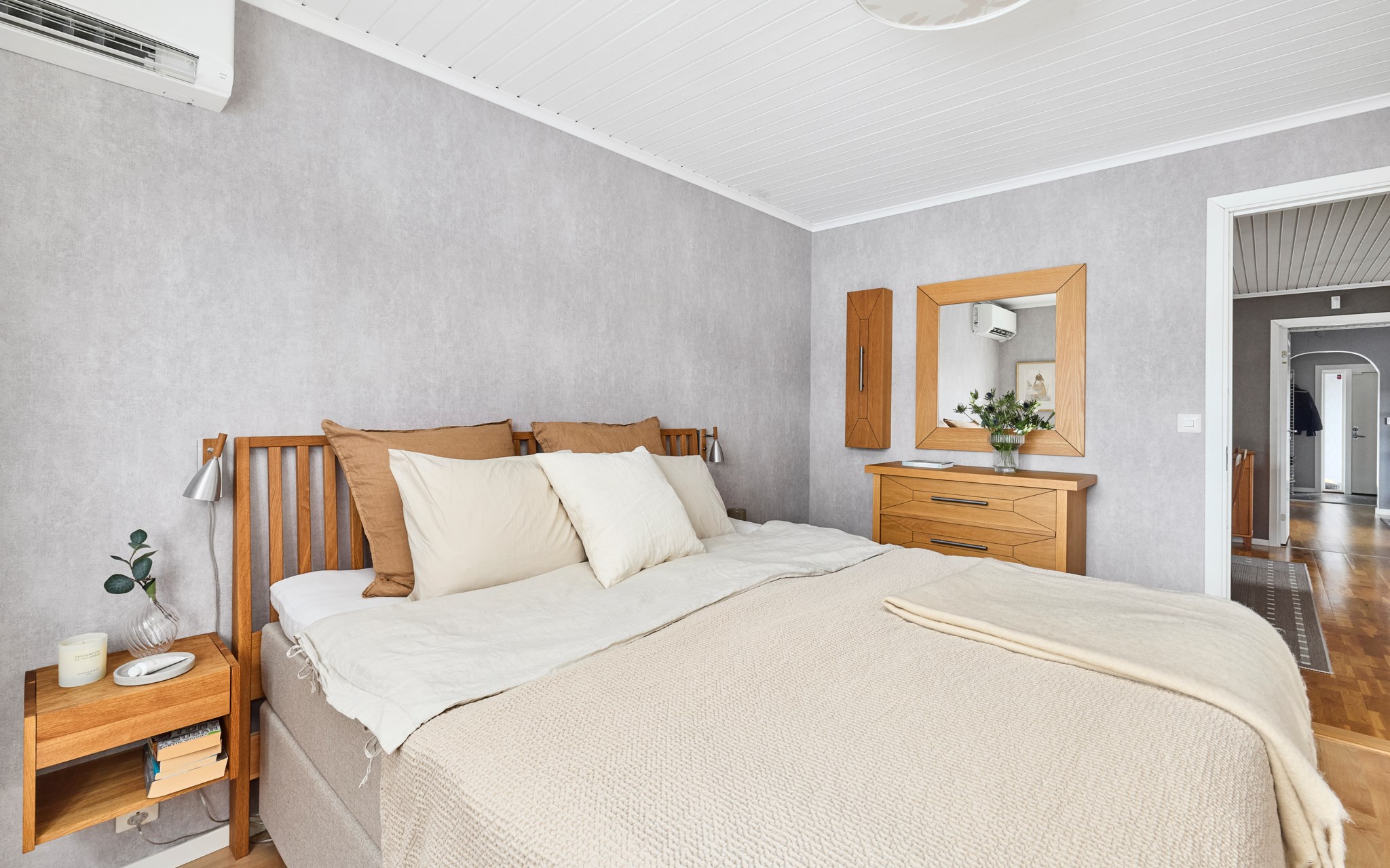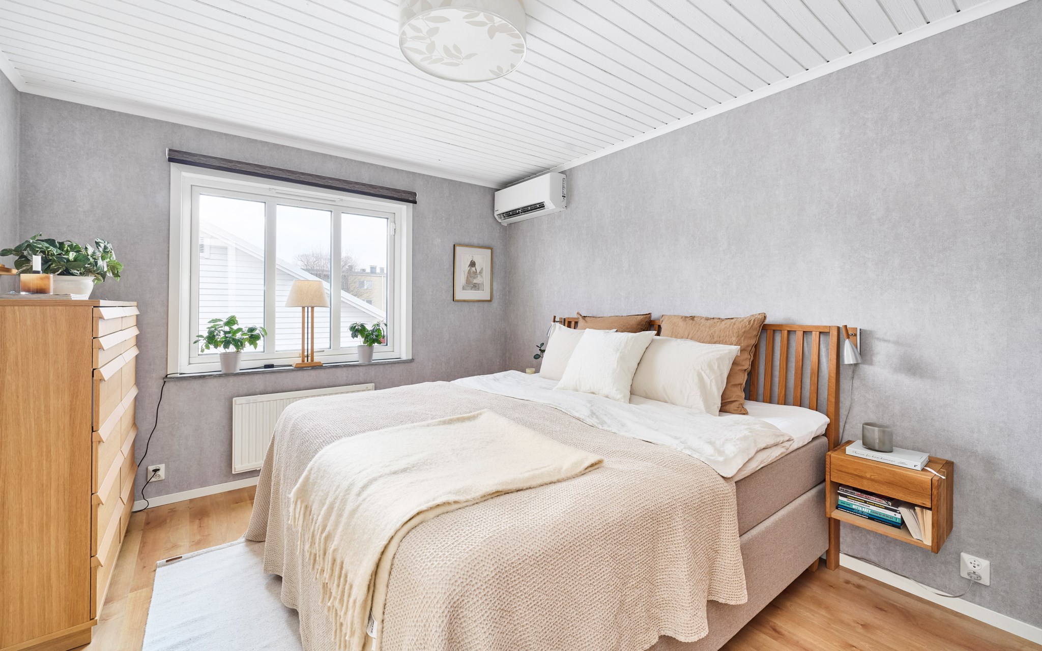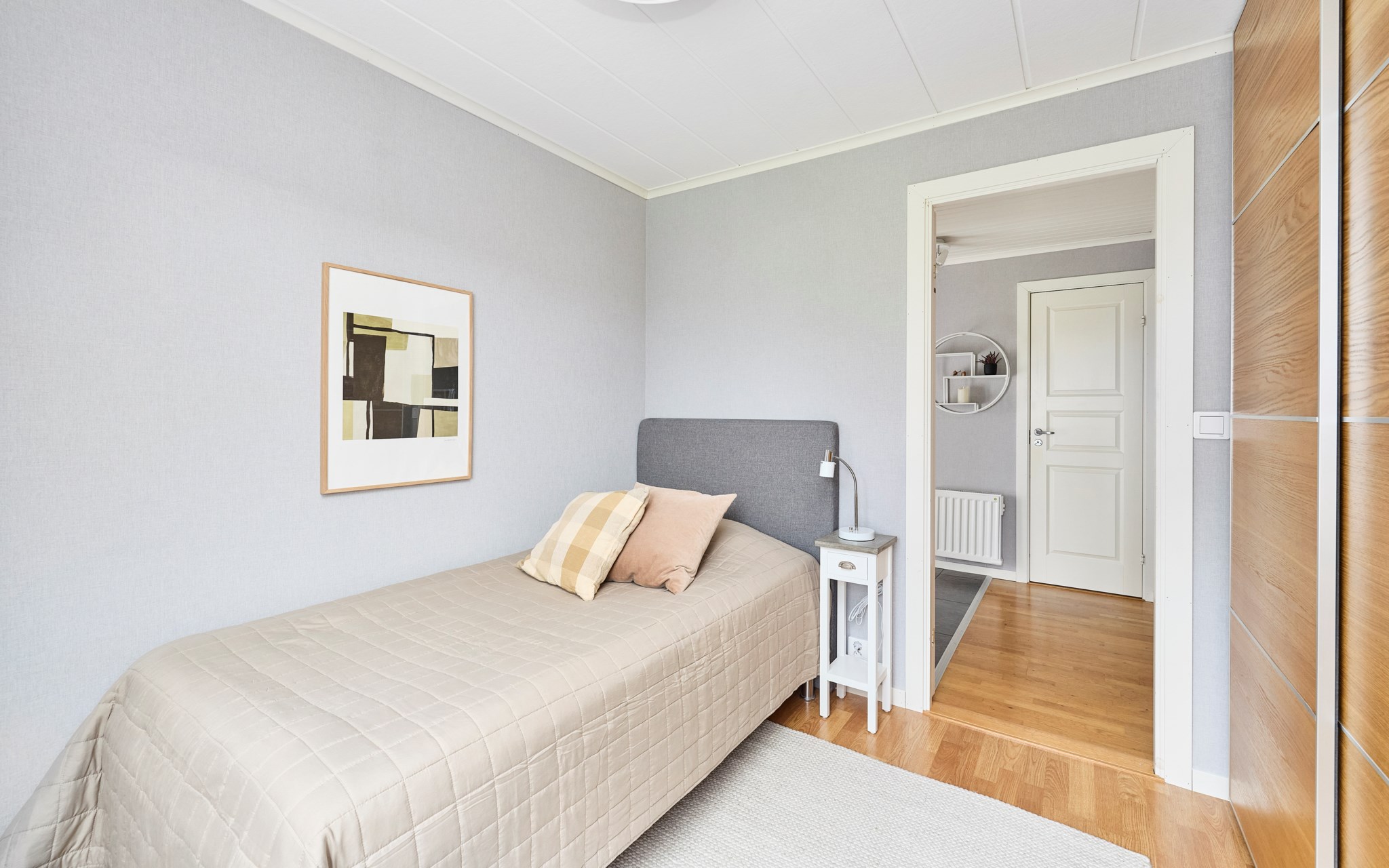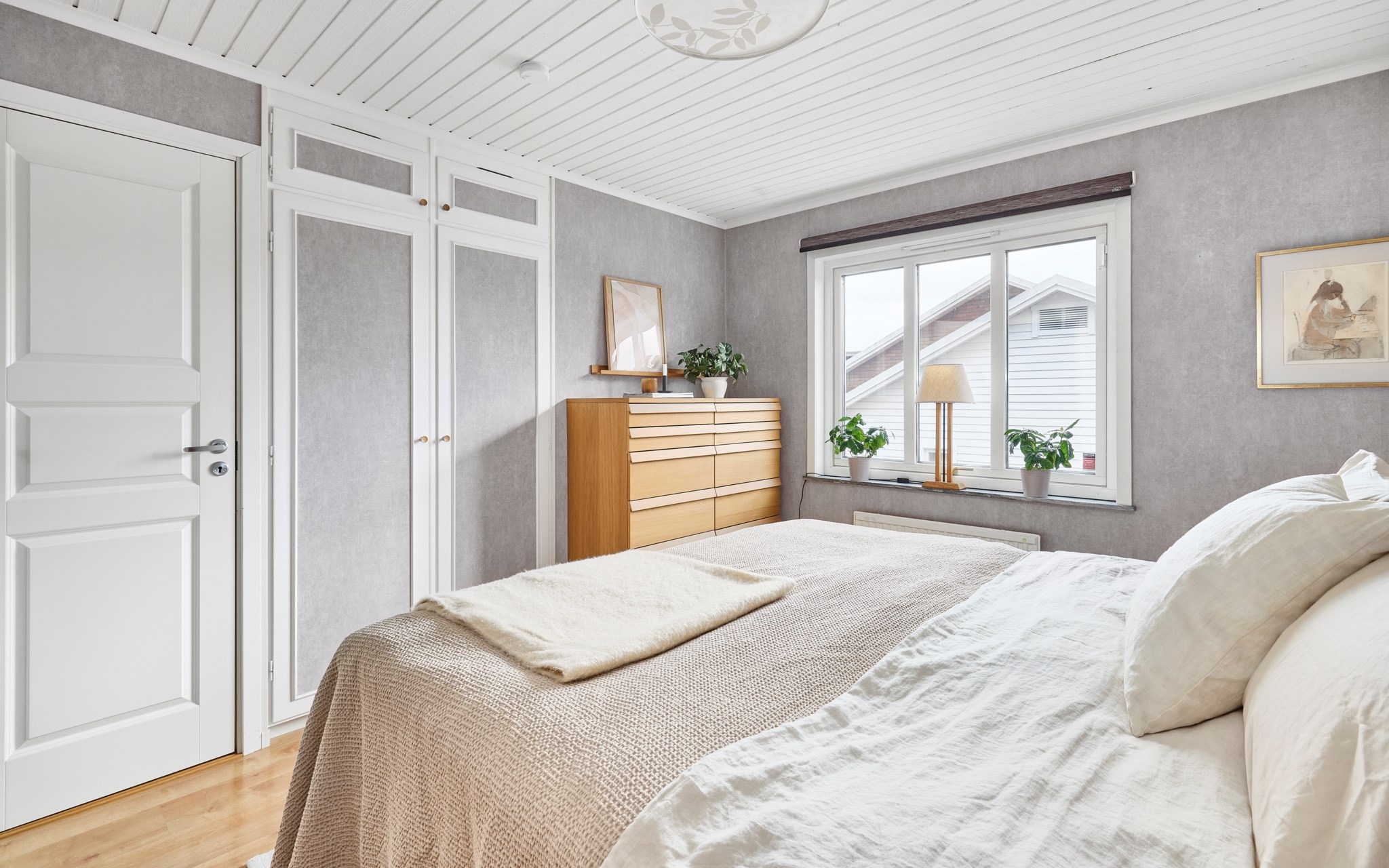 Stora sängkammaren ligger i husets östra ände, mot morgonsolen, med mycket plats för dubbelsängen och mycket plats i garderoberna. I husets andra ände hittar du sedan två mindre barnrum som är i princip lika stora och spegelvända till varandra. Här vetter fönstren mot söder och mot den talliga dungen som sparats mitt i villakvarteret på ett ansvarsfullt sätt för både barn och fåglar. Nyare laminatgolv i dessa två rum. En trappa ner används ett av rummen i nuläget som sovrum, men det finns ett par rum till som på det ena eller andra sättet skulle kunna bereda sovplatser till både egna familjen och gäster.