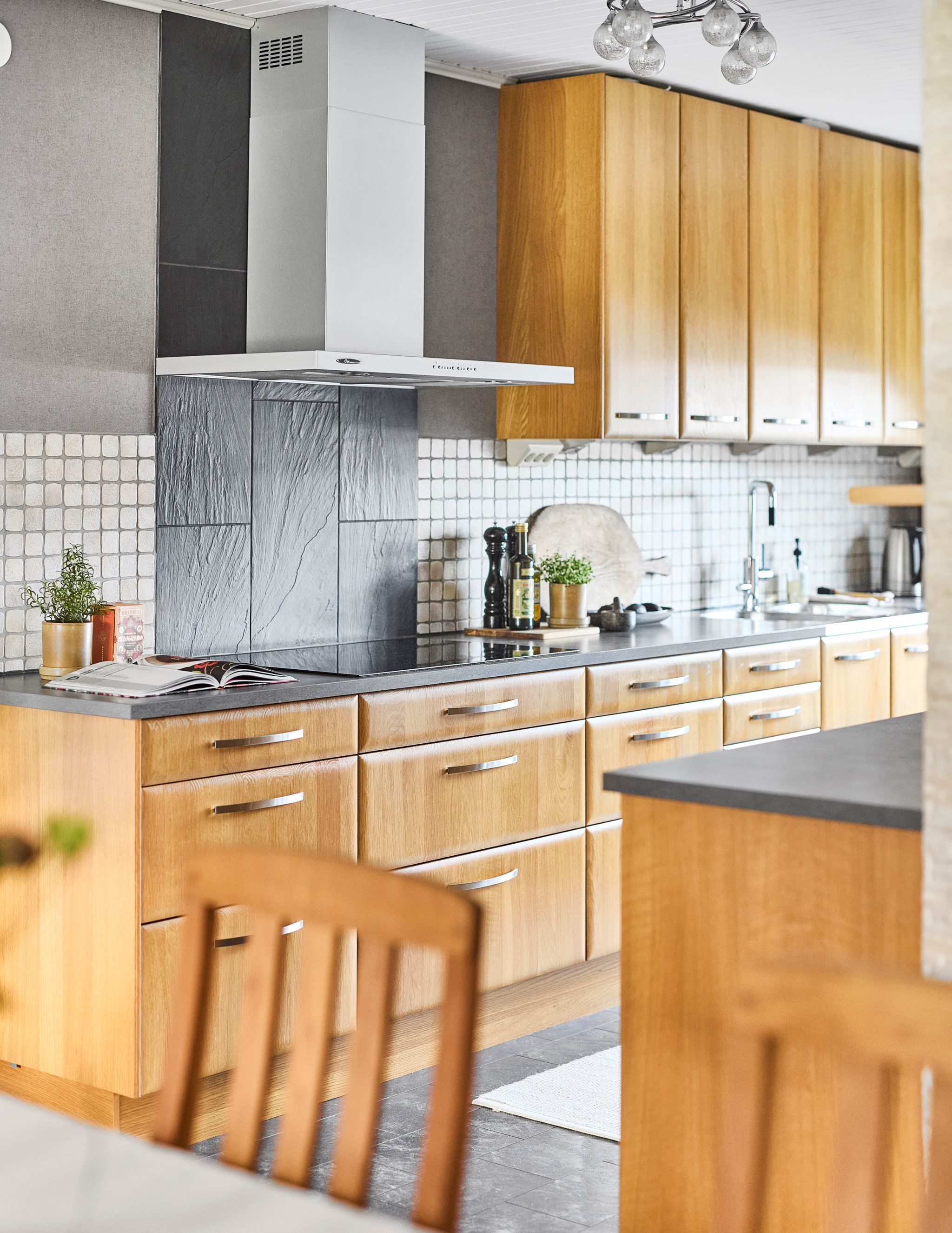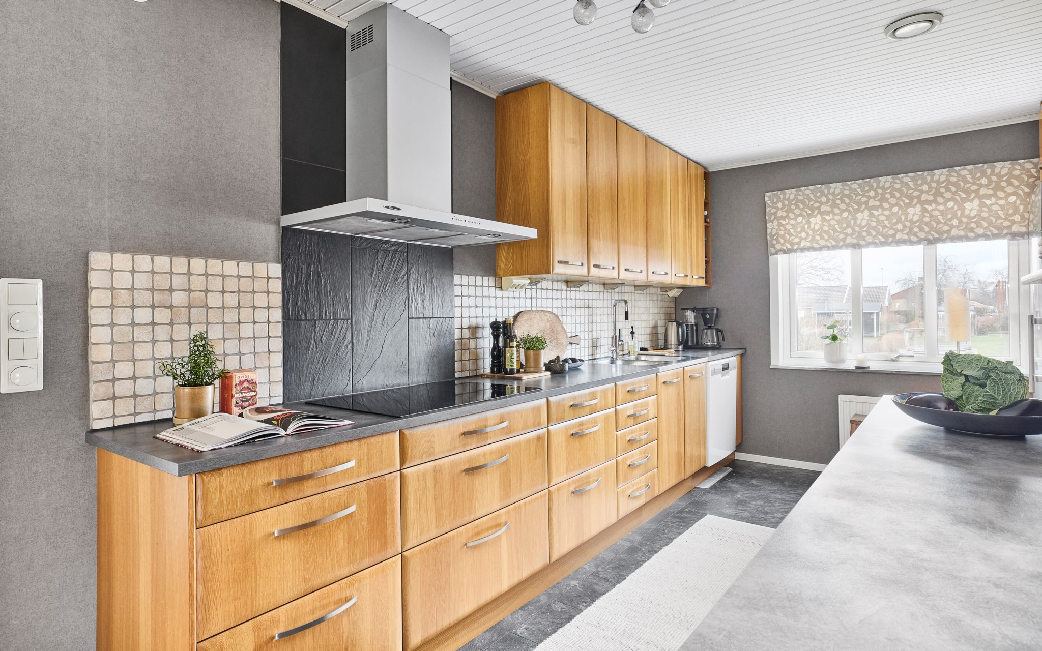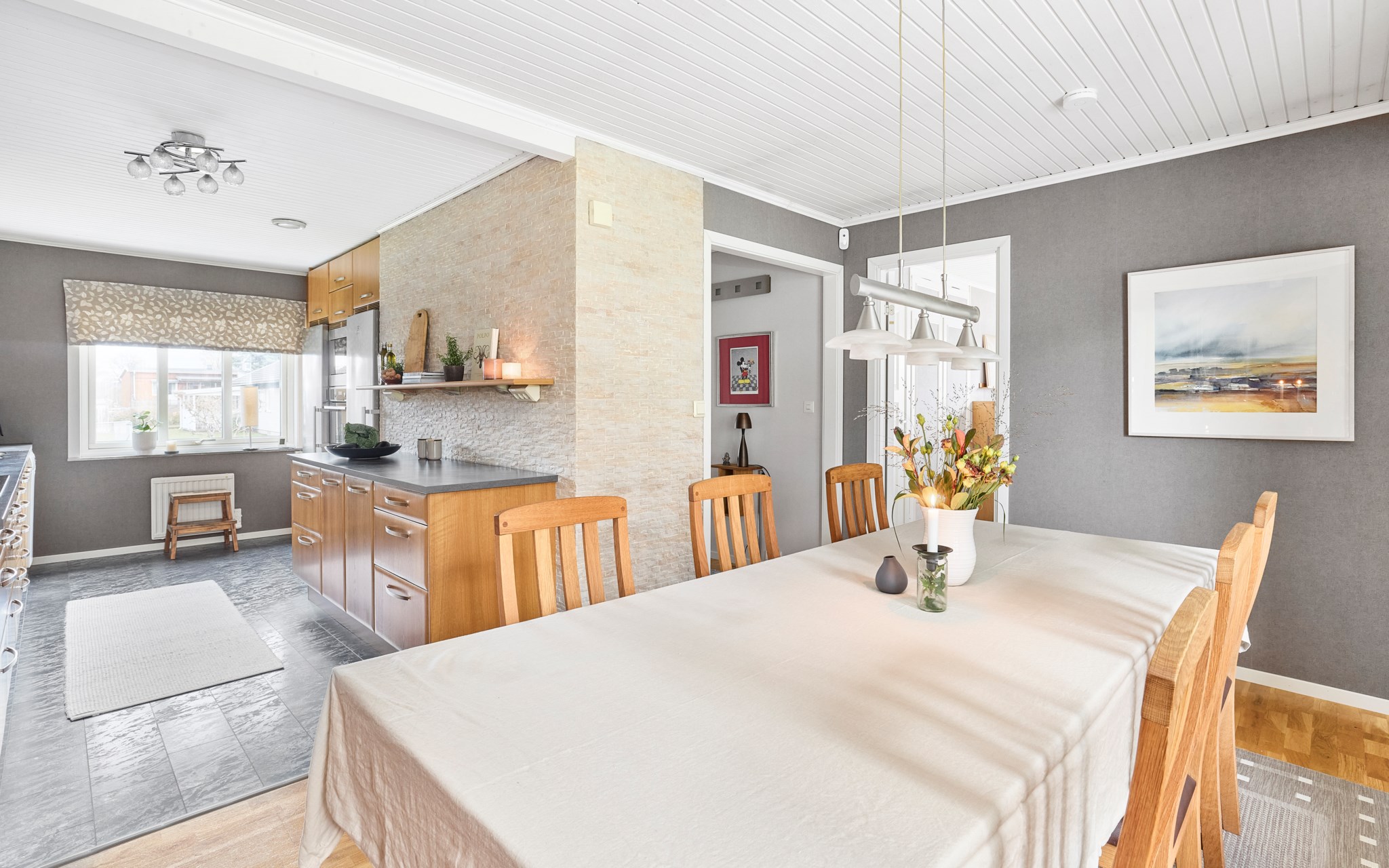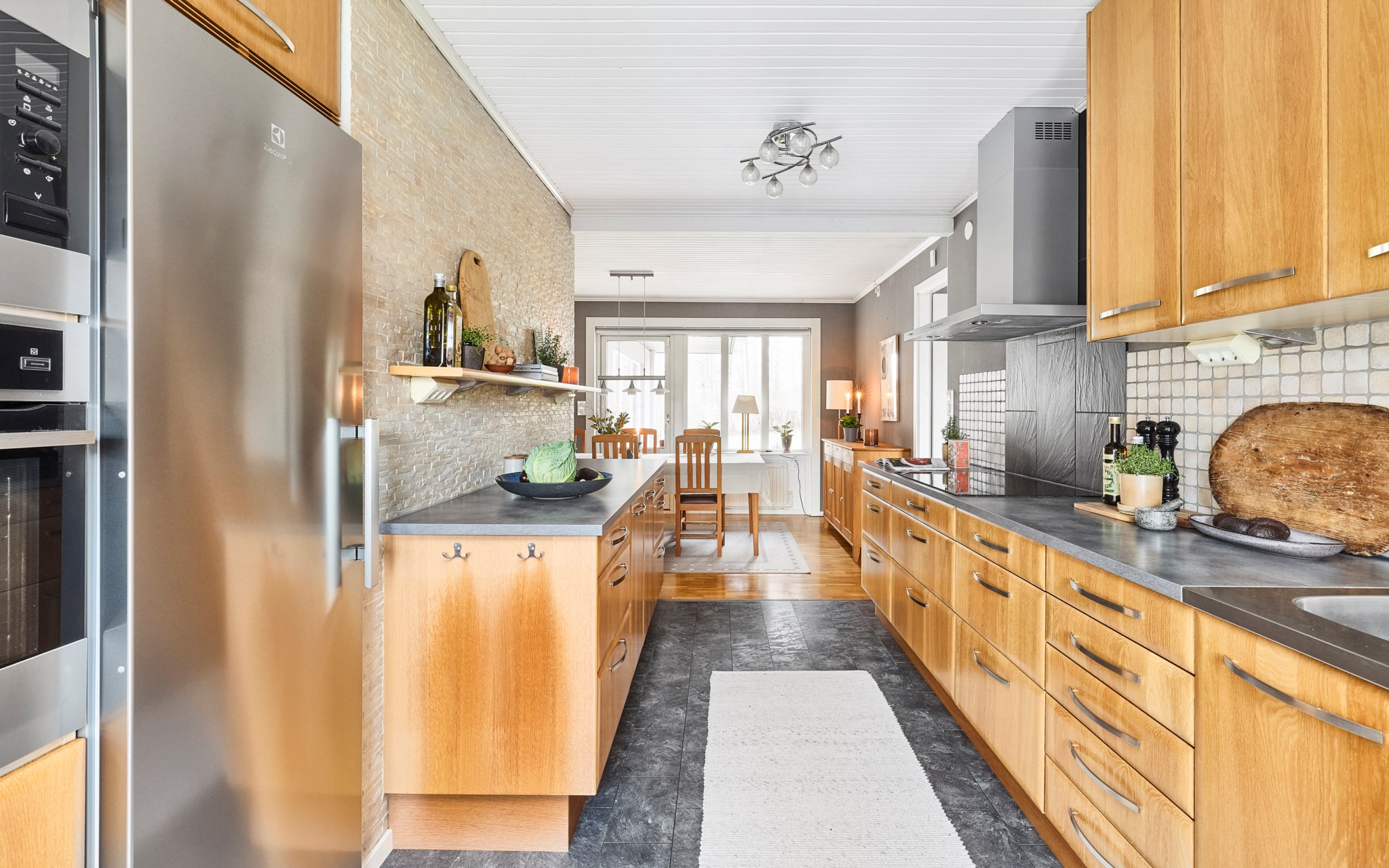 Matplatsen blir verkligen husets epicentrum med köket precis intill, och det stora trädäcket i husvinkeln utanför. Ljuset rätt igenom här på ett fint sätt, särskilt nu på vintern när södersolen står lågt och hittar långt in över golvet. Köket med massiva ekluckor och lådfronter, som visserligen har några år på nacken, men kvaliteten är svårslagen, och trenden talar ju för trä igen. Bänkskivorna i mörkt laminat också svåra att slita ut. Stort fönster mot lilla Hermelinstigen som är som en slinga i kvarteret.
