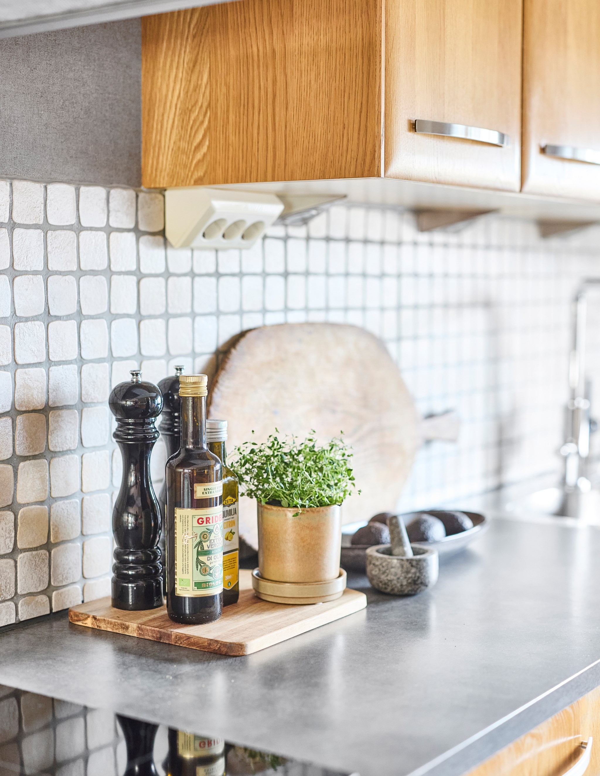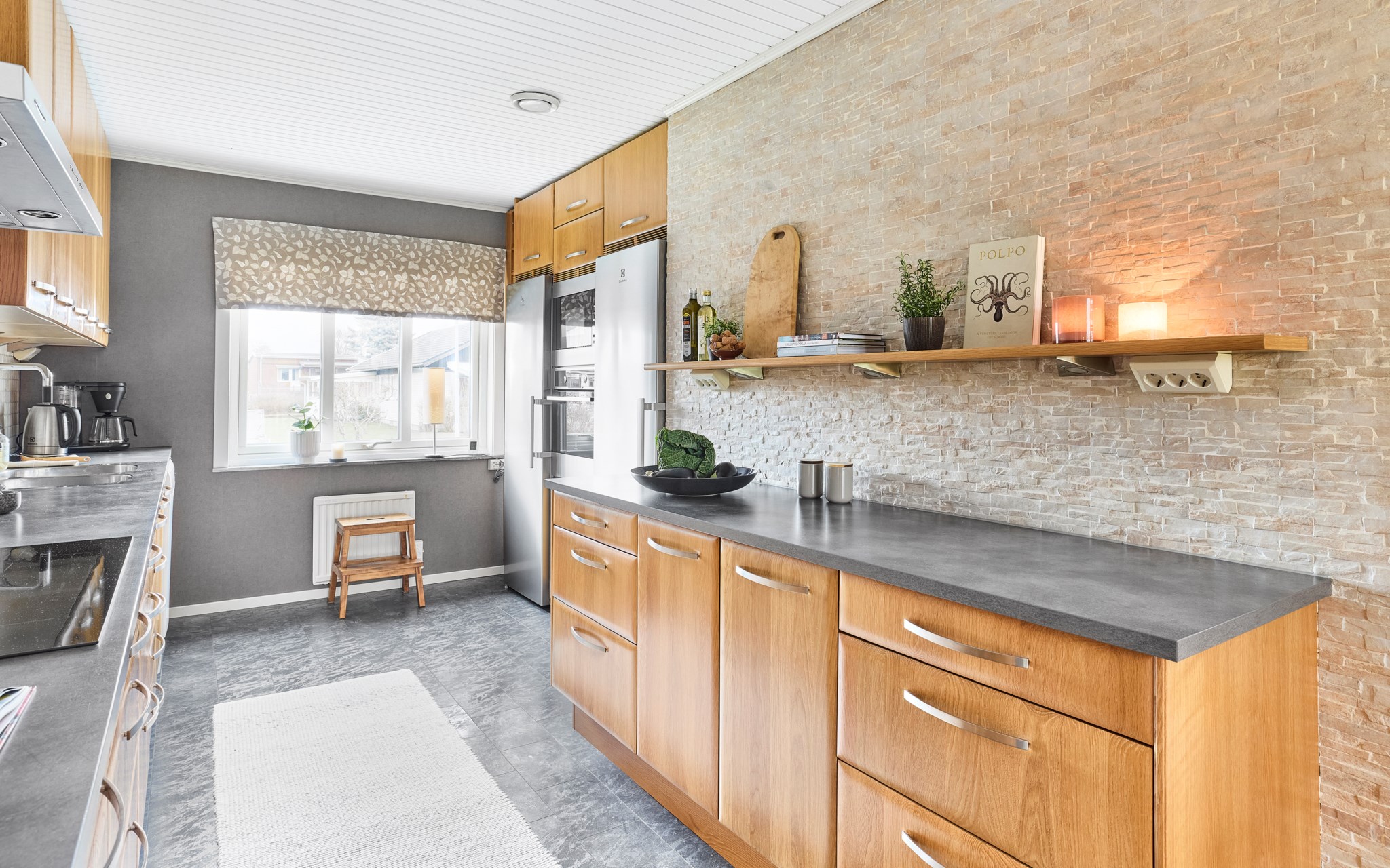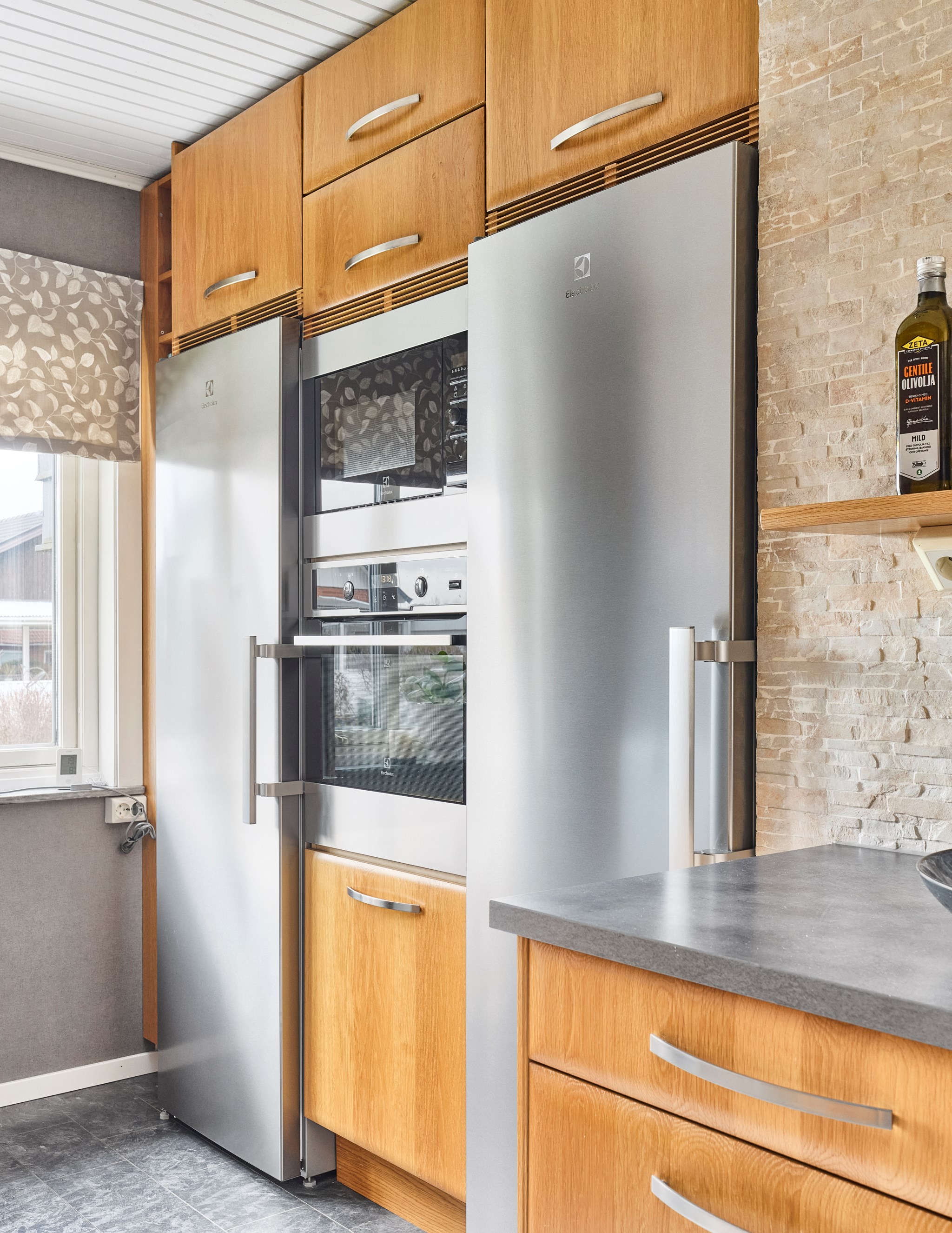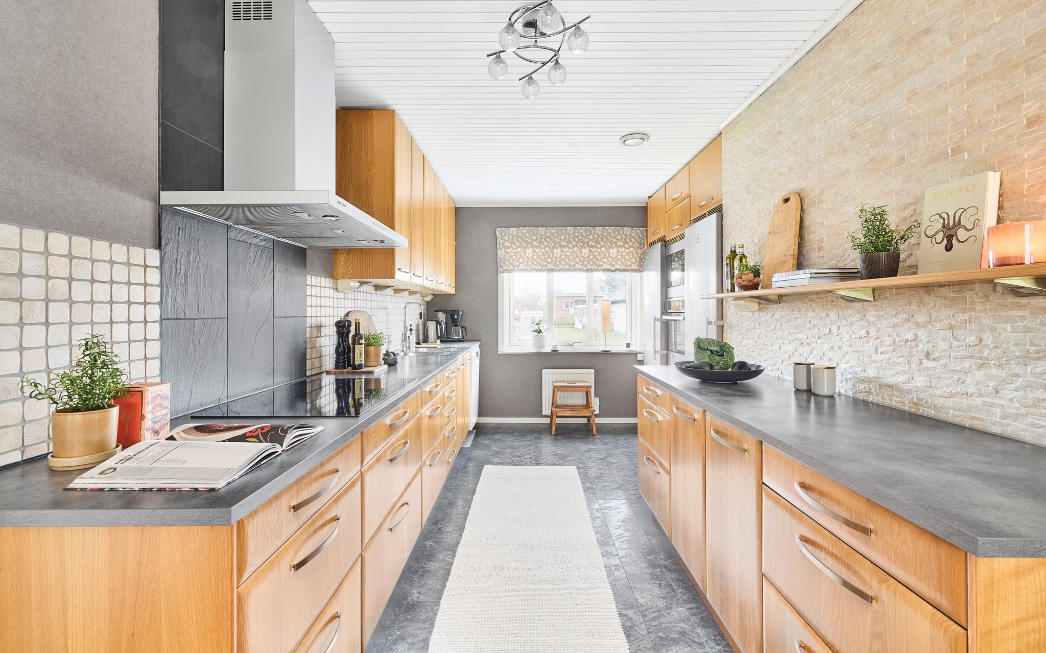 Matplatsen blir verkligen husets epicentrum med köket precis intill, och det stora trädäcket i husvinkeln utanför. Ljuset rätt igenom här på ett fint sätt, särskilt nu på vintern när södersolen står lågt och hittar långt in över golvet. Köket med massiva ekluckor och lådfronter, som visserligen har några år på nacken, men kvaliteten är svårslagen, och trenden talar ju för trä igen. Bänkskivorna i mörkt laminat också svåra att slita ut. Stort fönster mot lilla Hermelinstigen som är som en slinga i kvarteret.
