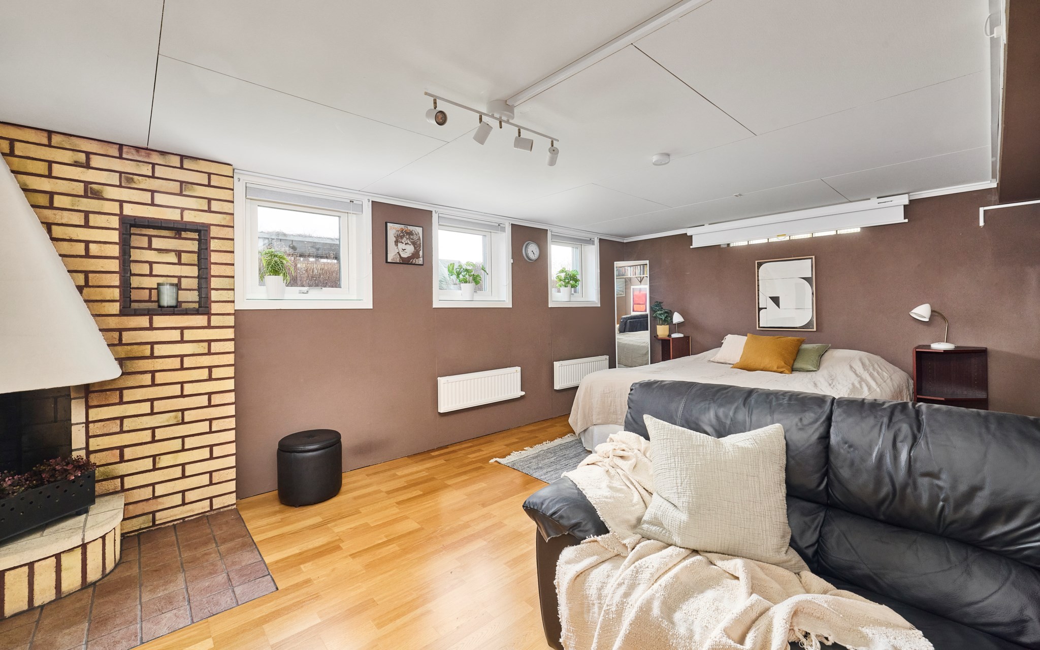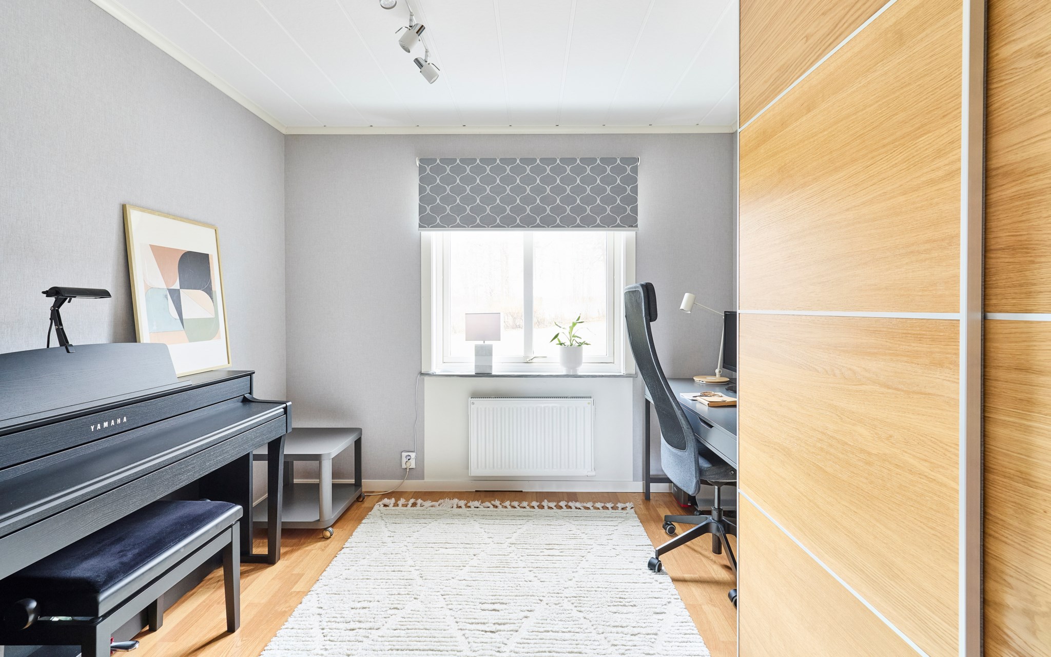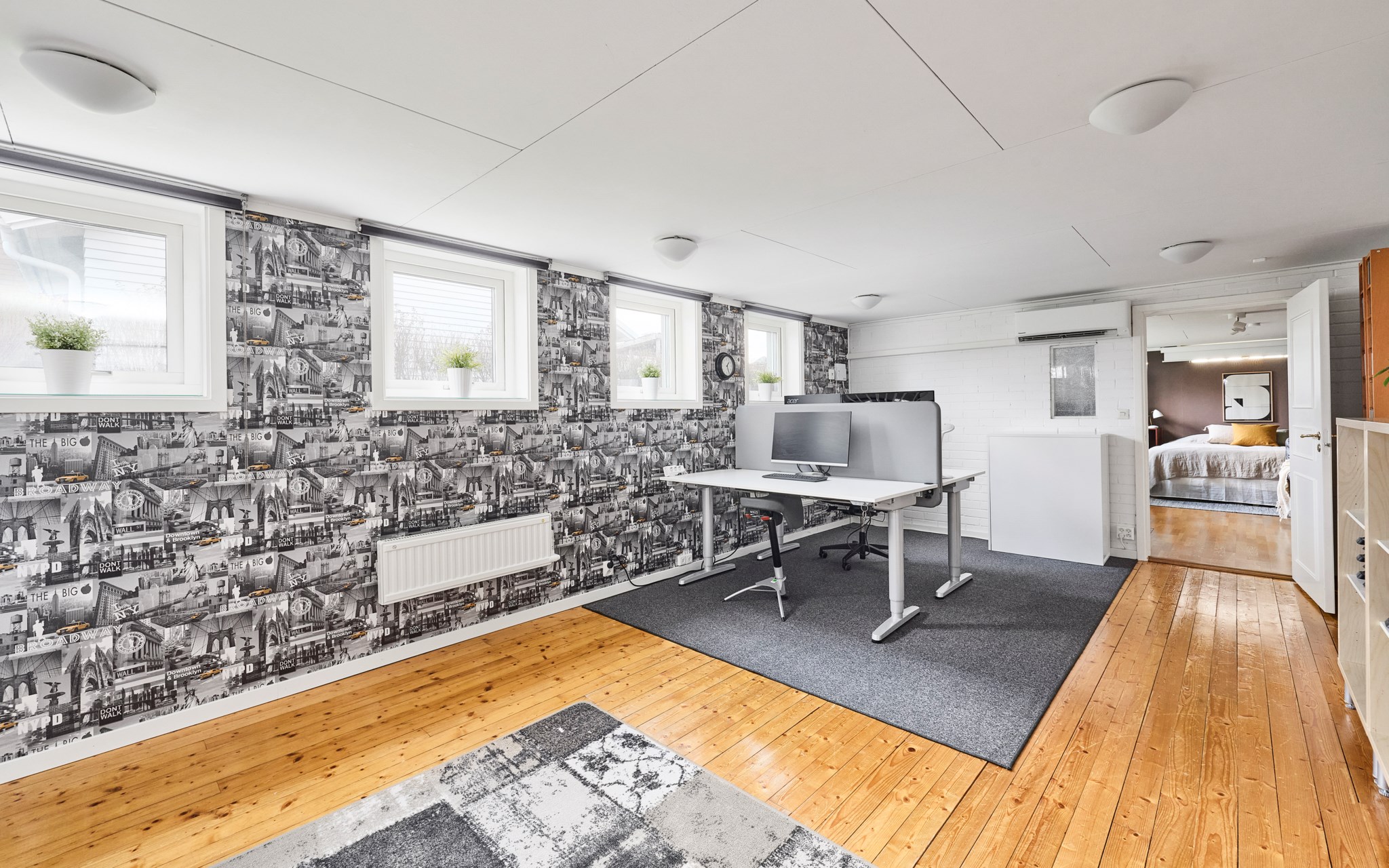 Att allt är dubbelt i detta hus gör det osedvanligt familje-flexibelt. Detta stora allrum är definitivt som ett andra vardagsrum, eller ett tredje om du räknar med möjligheterna nere. Ligger i husets västra ände mot groventrén från garagesidan. Fönstret vetter mot gatan, men räkna med södersol också från de två barnrummen, om dörrarna får stå öppna. Rummet kommer snabbt att bli en fredad zon där regimen upprätthålls av husets tonåringar. Med dubbla källartrappor dessutom kommer du ner även i denna ände av huset. Som sagt, mycket flexibelt.