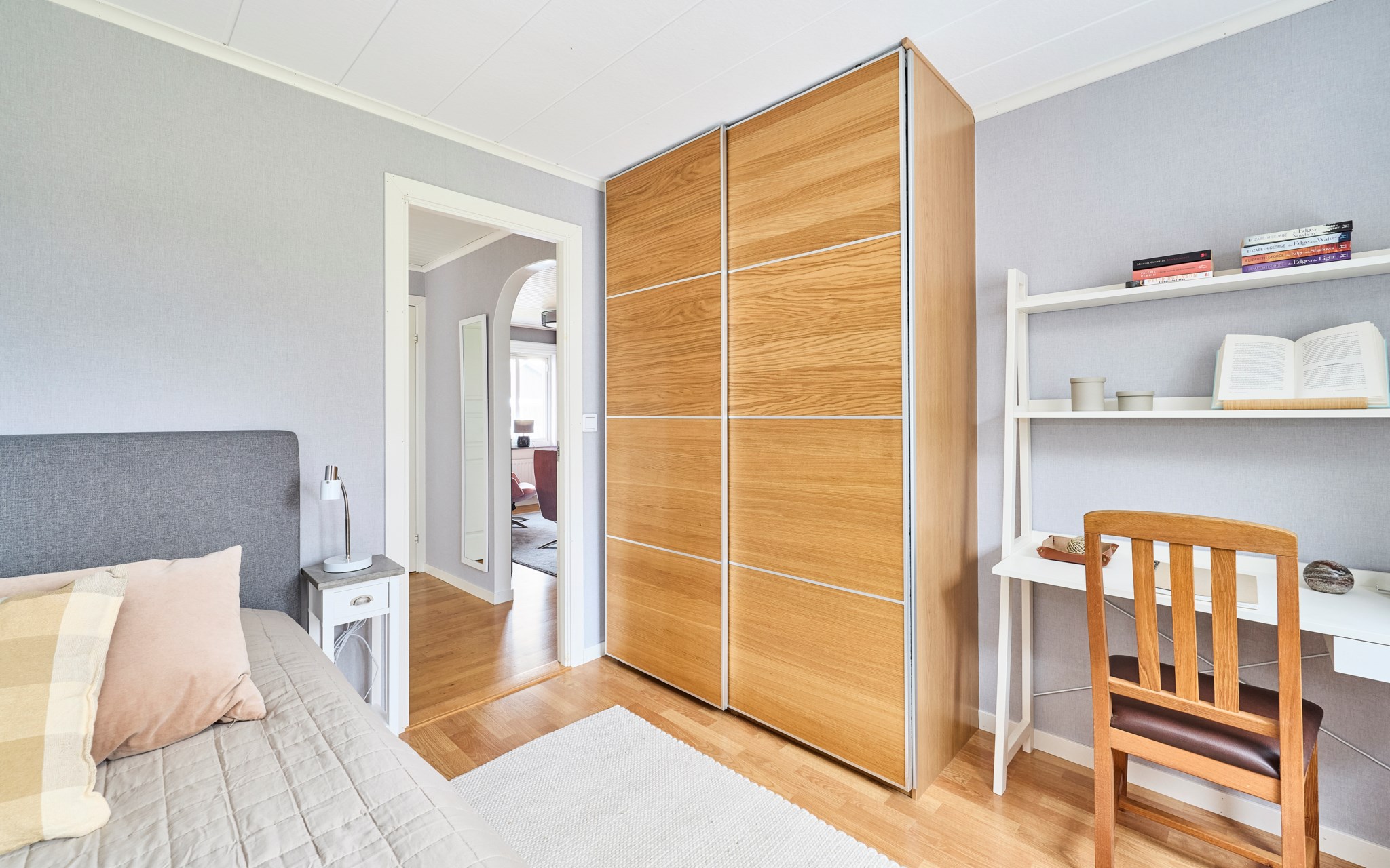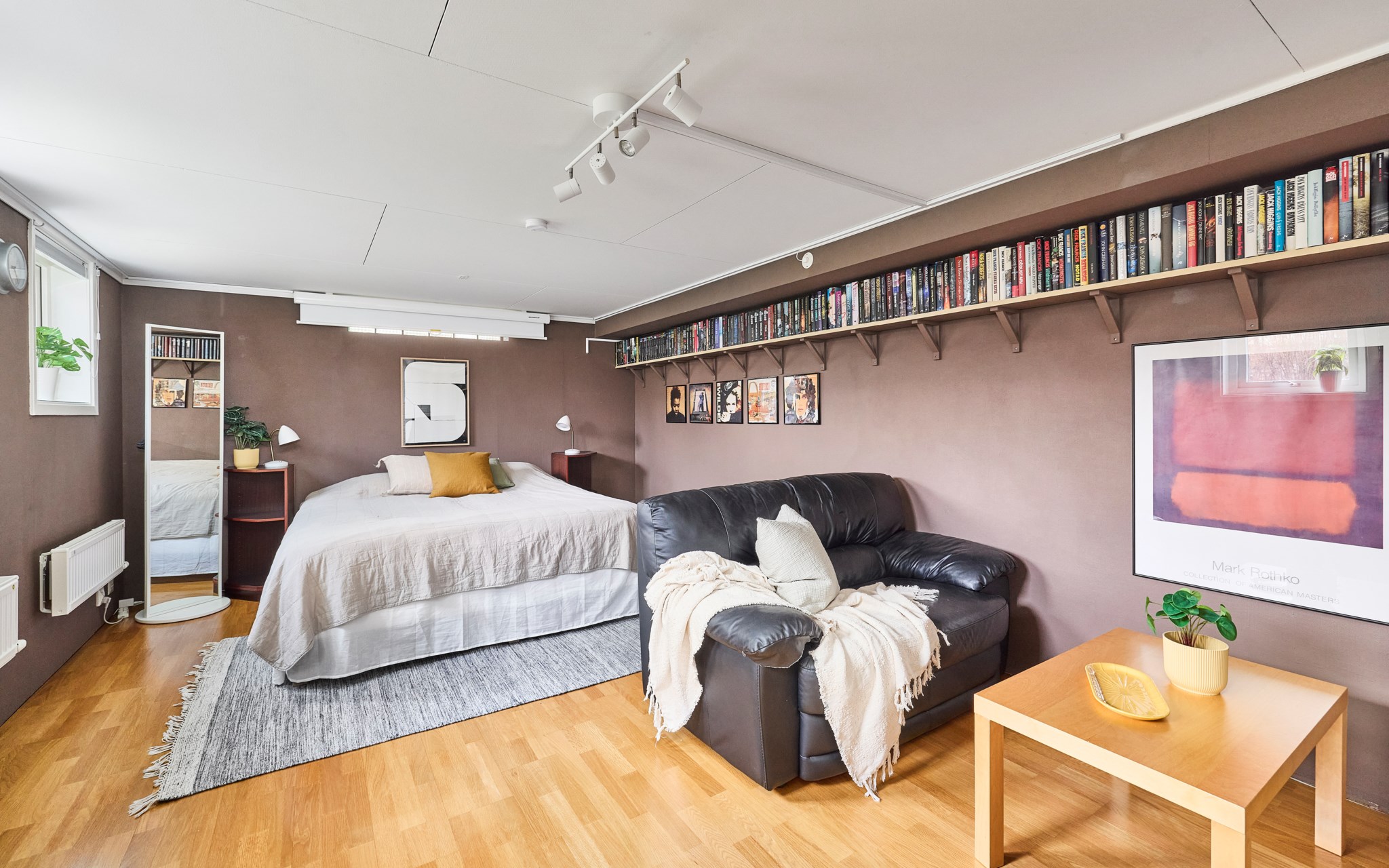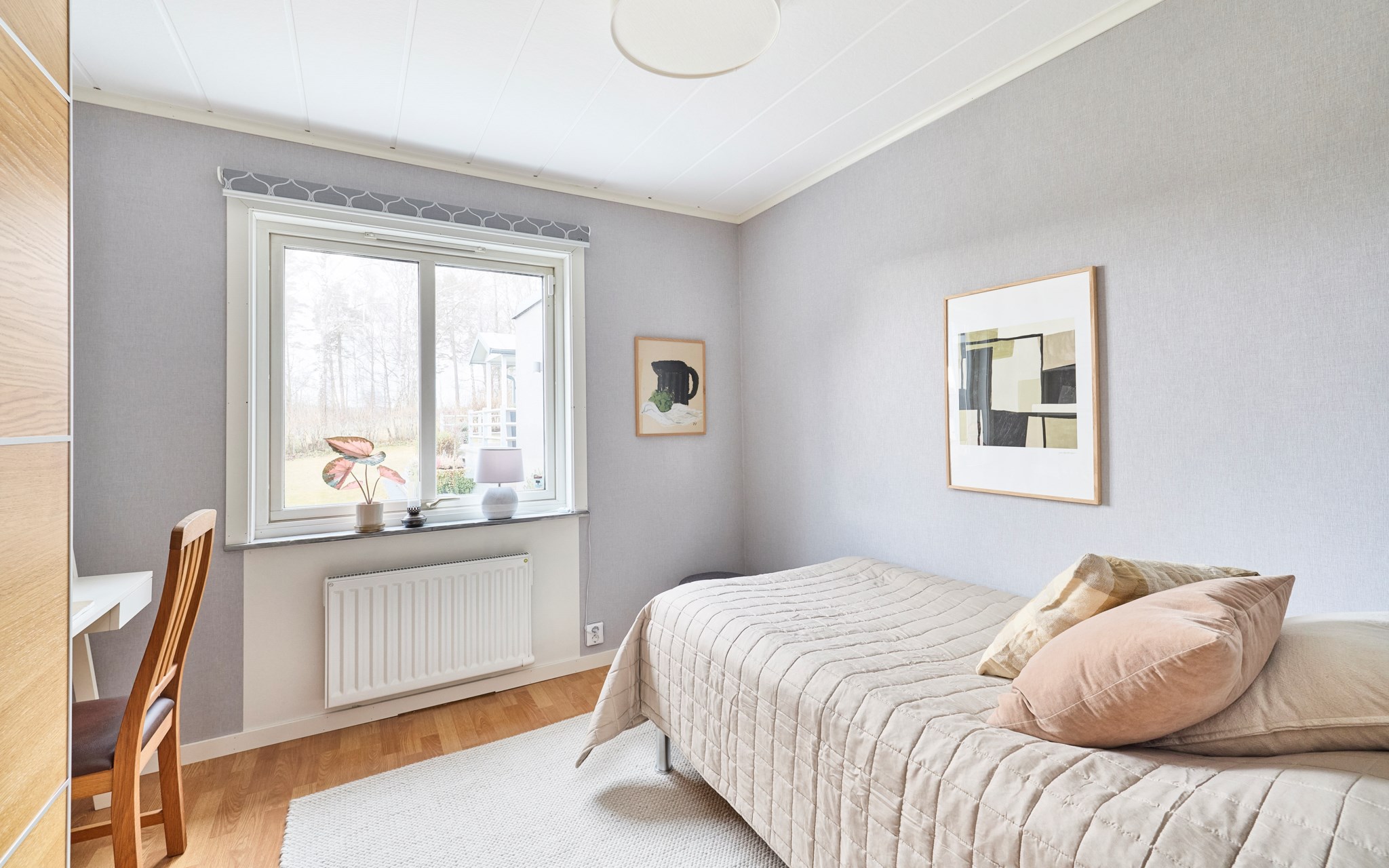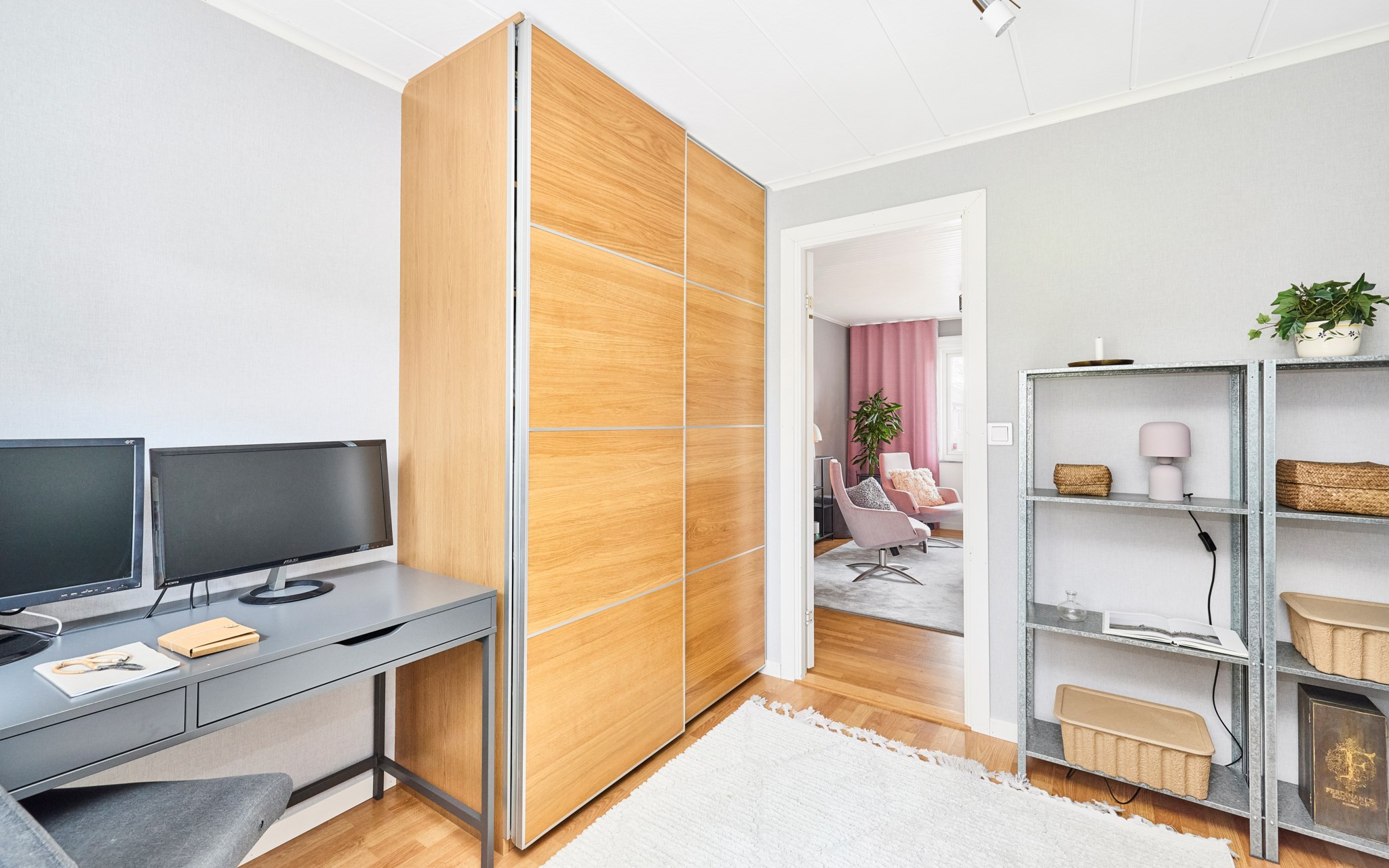 Att allt är dubbelt i detta hus gör det osedvanligt familje-flexibelt. Detta stora allrum är definitivt som ett andra vardagsrum, eller ett tredje om du räknar med möjligheterna nere. Ligger i husets västra ände mot groventrén från garagesidan. Fönstret vetter mot gatan, men räkna med södersol också från de två barnrummen, om dörrarna får stå öppna. Rummet kommer snabbt att bli en fredad zon där regimen upprätthålls av husets tonåringar. Med dubbla källartrappor dessutom kommer du ner även i denna ände av huset. Som sagt, mycket flexibelt.