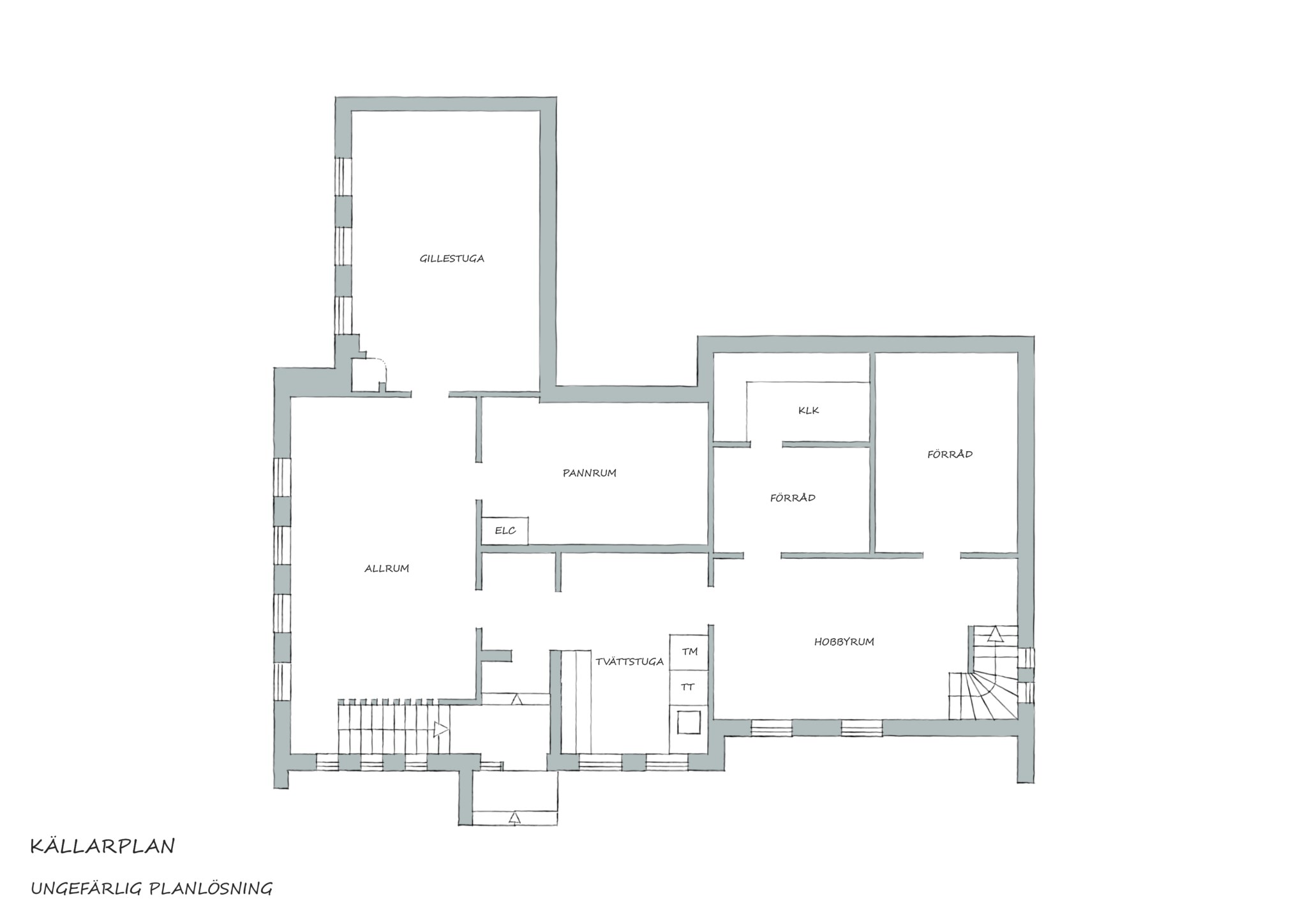 Gästrum och gym, bra tvättstuga och stort kontor, ja, det är något av det du hittar en trappa ner i detta stora hus. Och faktum är att det finns två stora rum och utrymmen ytterligare som du kan nyttja på lite olika vis – kanske fler sovrum och varför inte ett eget spa. Tvättstugan med alla resurser som krävs för en stor familj från första dagen du flyttar in i huset. Gamla originallampor i taket och även golvet original och i bästa skick. Här och där färgglatt betongglas mellan rummen som lyser upp när du tänder i nästa rum. Det nuvarande gästrummet var nog tänkt som den klassiska gillestugan som alla hus hade vid tiden, för här finns en öppen spis. Minst två sovrum möjliga här nere på ett smidigt sätt tack vare de två trapporna. Fönstren extra stora för att maxa ljuset in, och minska källarkänslan.