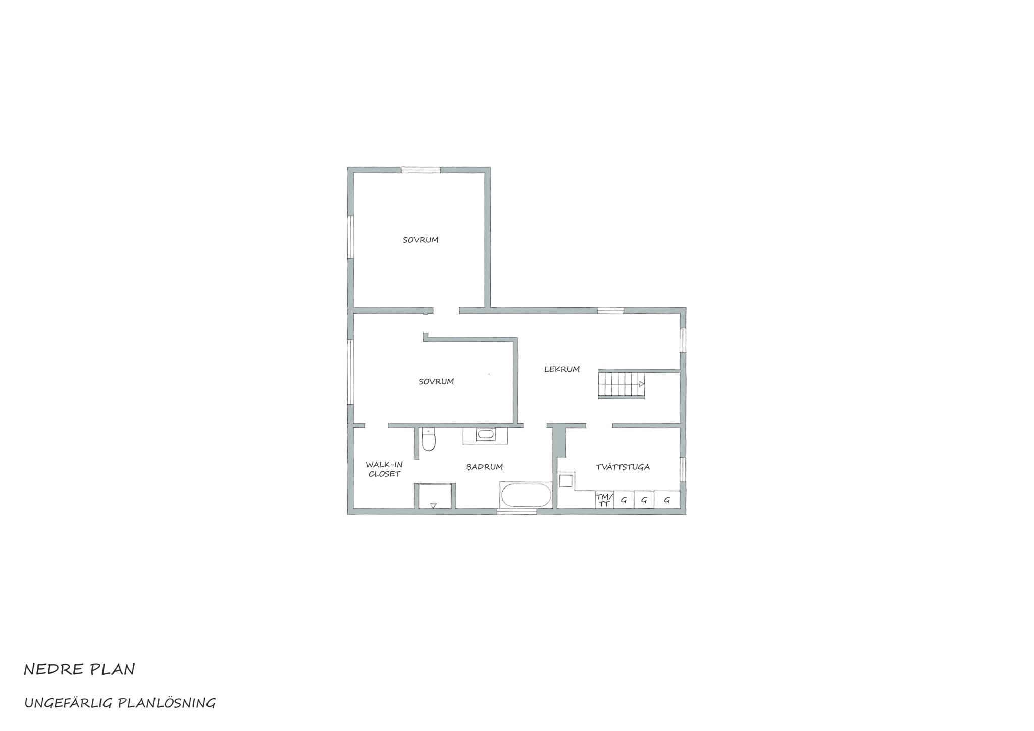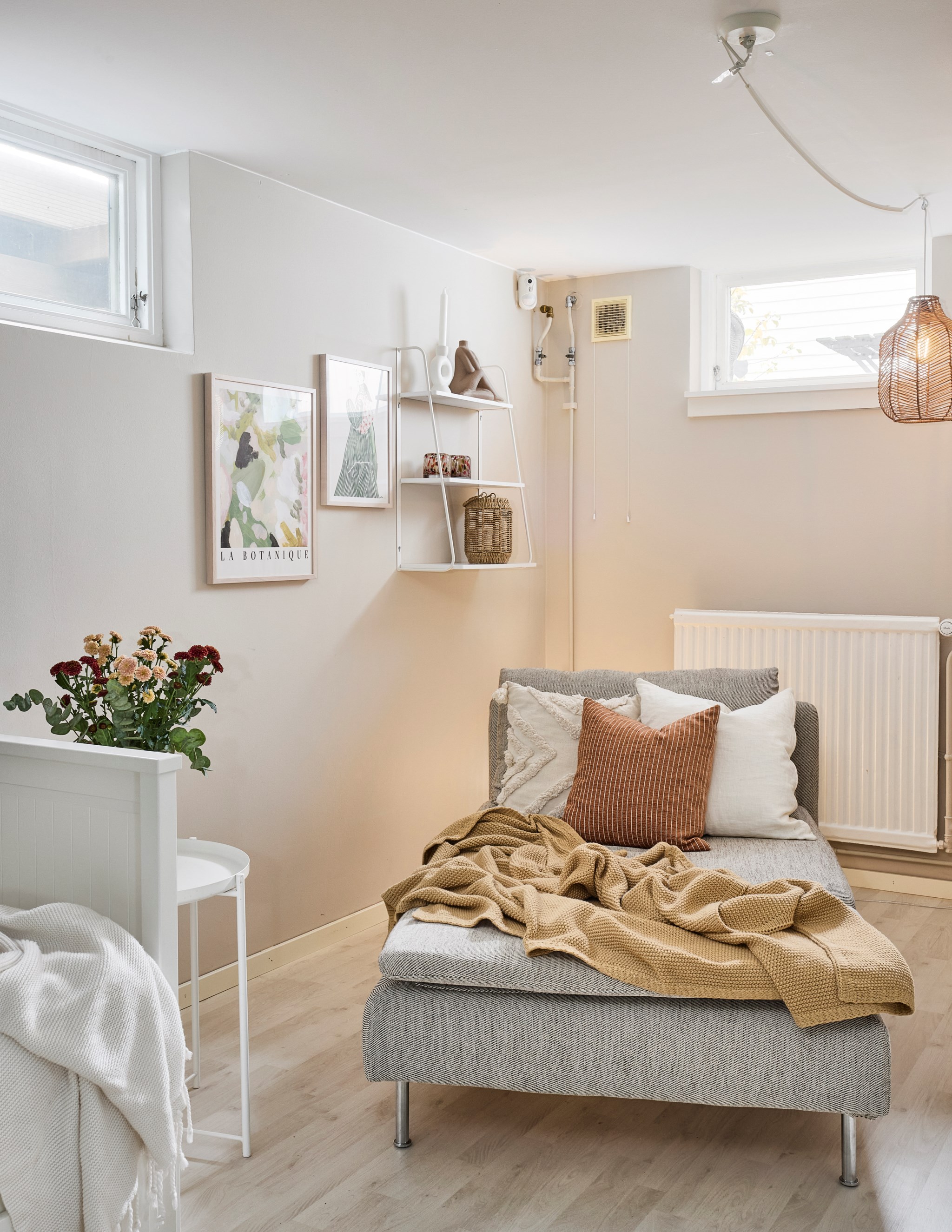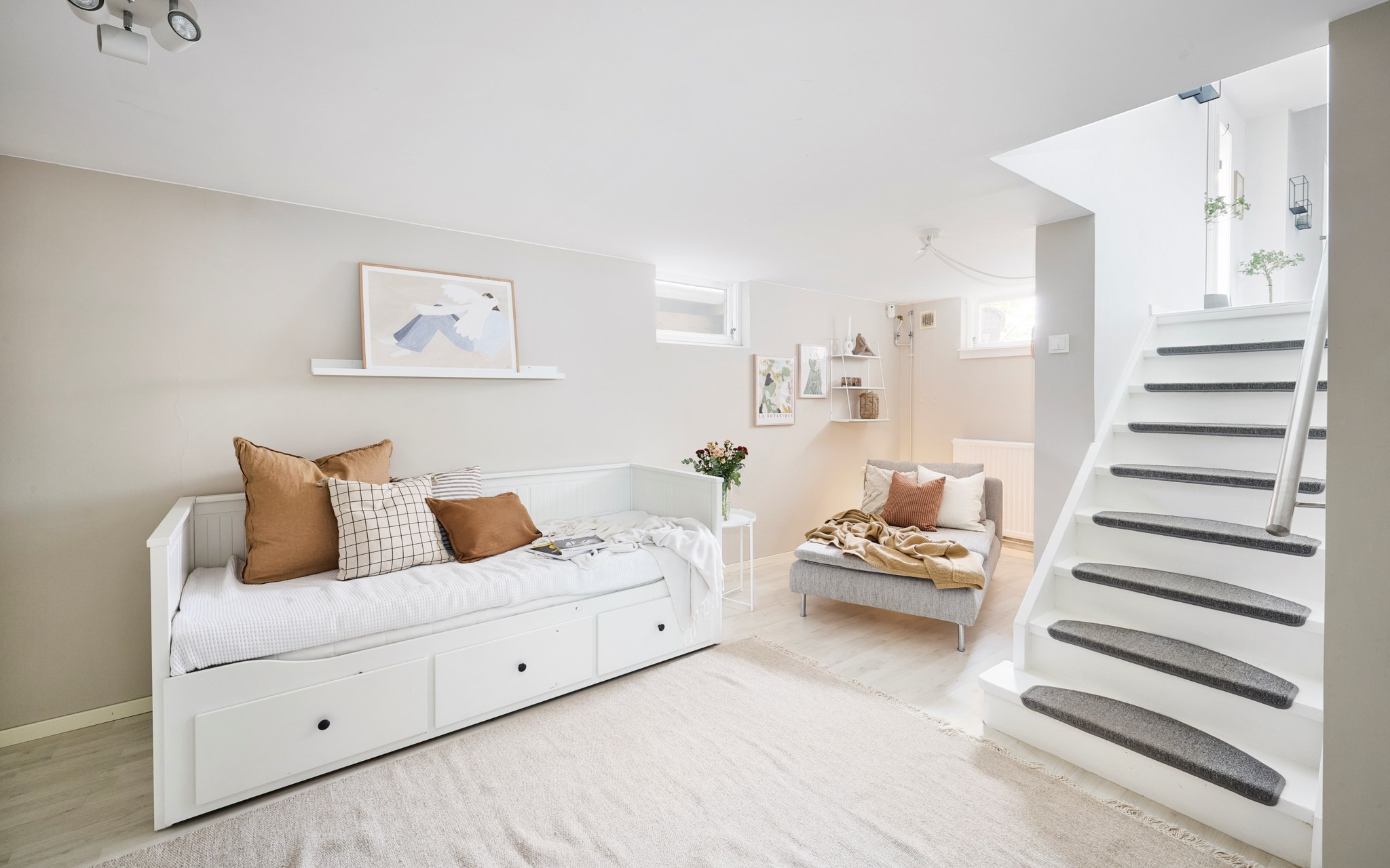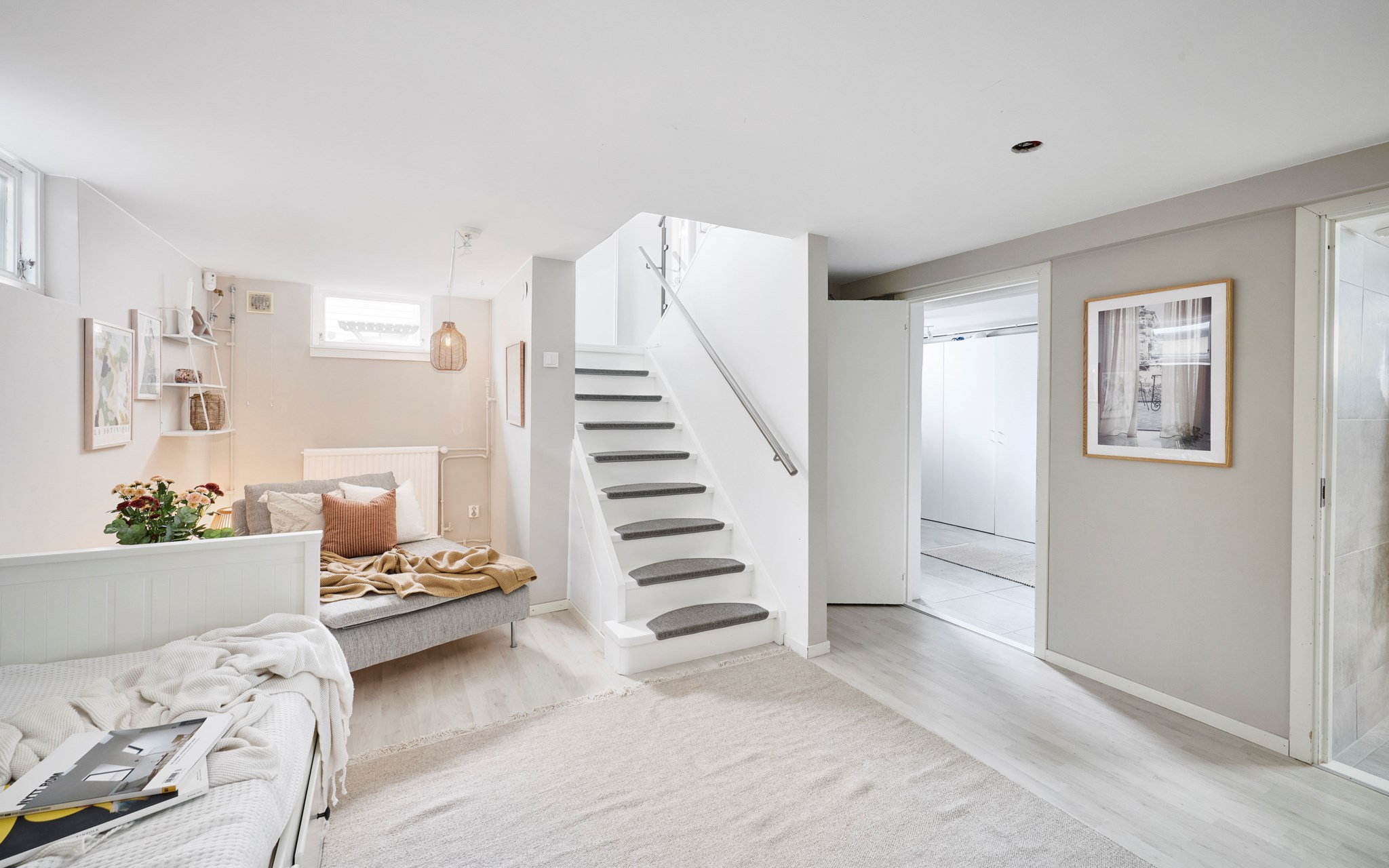 Direkt nedanför trappan från entrén väntar en lugnare våning. Skapa en mysvrå, ett hemmakontor eller vad som passar bäst i livet just nu. Fönster i marknivå släpper in dagsljus och gör rummet behagligt att vara i, och den öppna ytan gör att möbleringen kan skifta med livet. Känslan är mer ”andra våning” än källare – ett vardagsrum till när huset fylls.