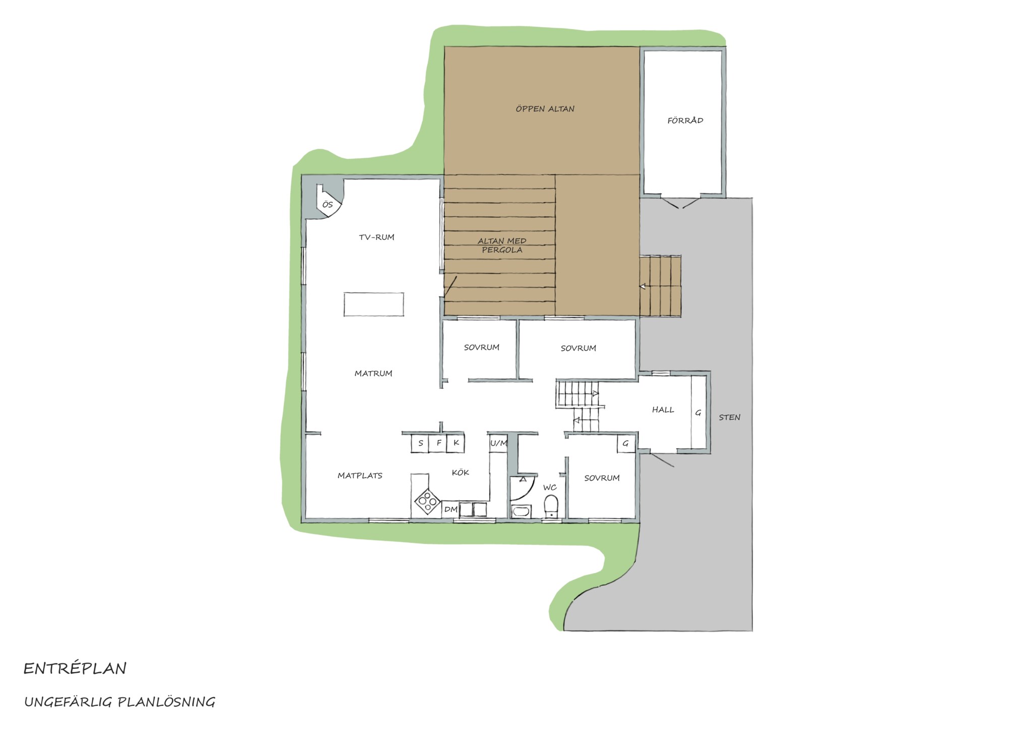 Muren mot gatan är byggd ”by the book”, med L-stöd och upphöjd gräsmatta för att få en stor plan yta. För extra trygghet finns ett stadigt staket hela vägen mot gatan. Infarten är rejält tilltagen för att flera bilar ska få plats. Förutom vid infarten är det inhängnat i princip överallt – komplettera med grind om du vill ha helt hund- och barnsäkert. Det pampiga äppelträdet levererar rikliga skördar vartannat år och gör entrén glad redan i juni. Tack vare att tomten ligger i svängen på gatan, så finns möjlighet att verkligen följa solen dagen om allt eftersom den rör sig runt huset och trädgården.