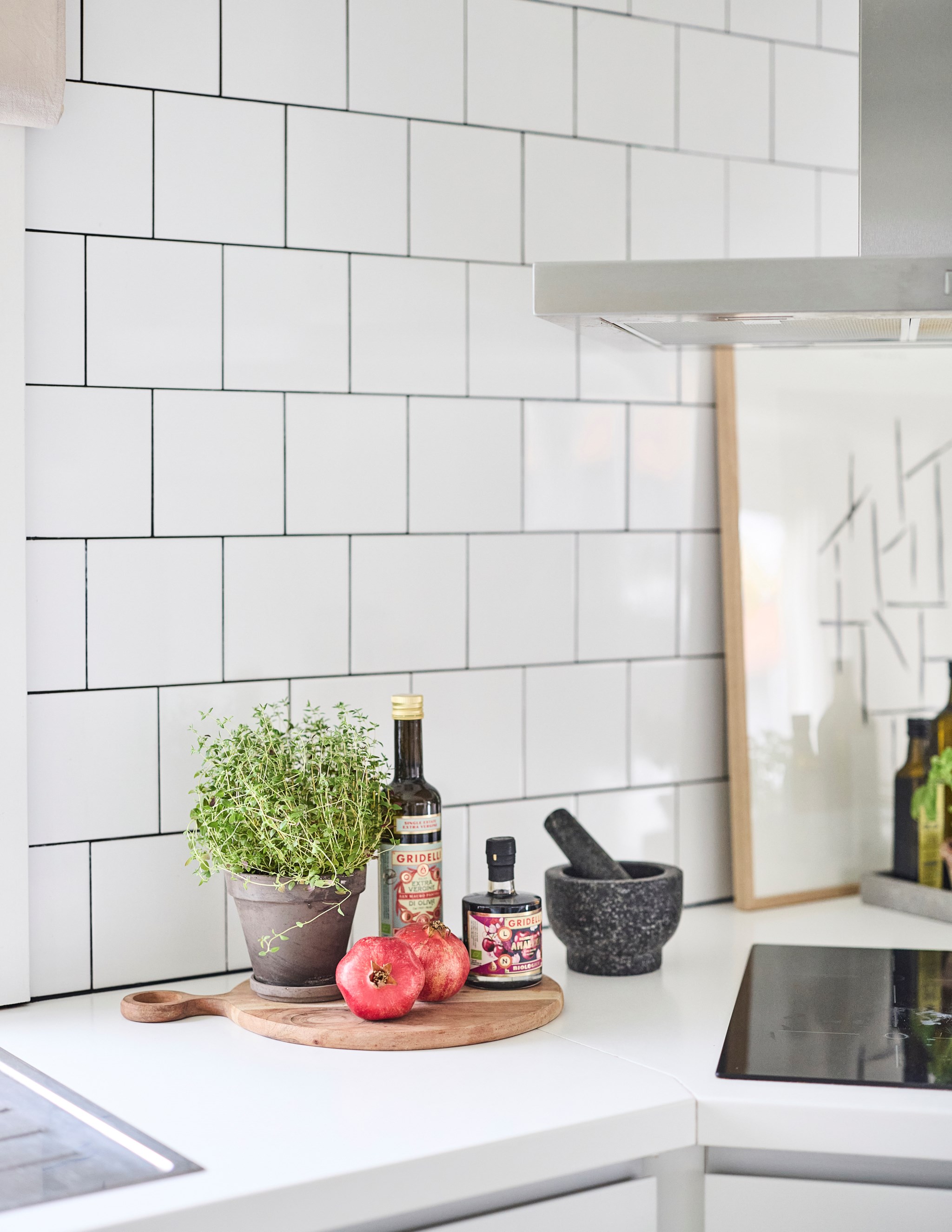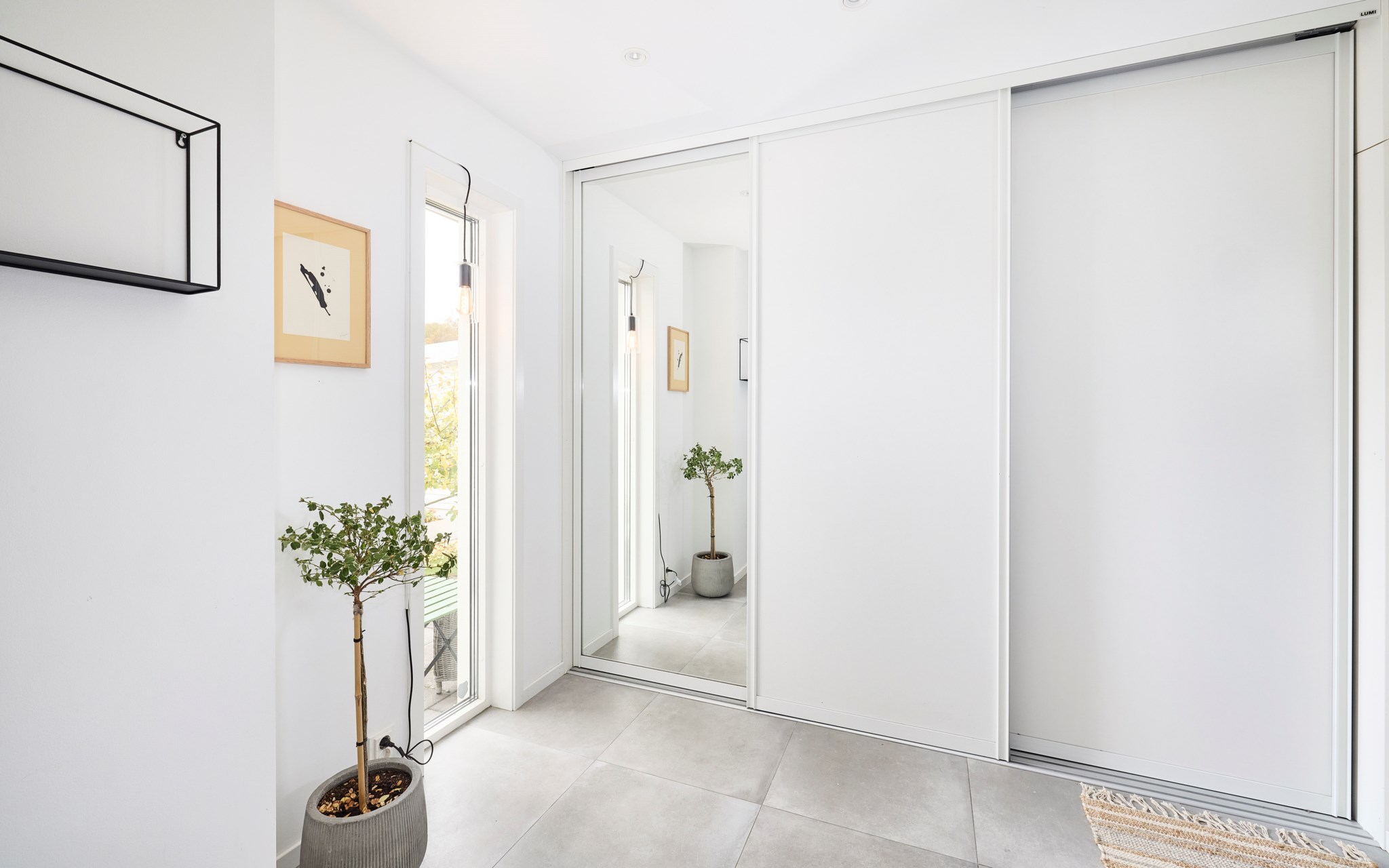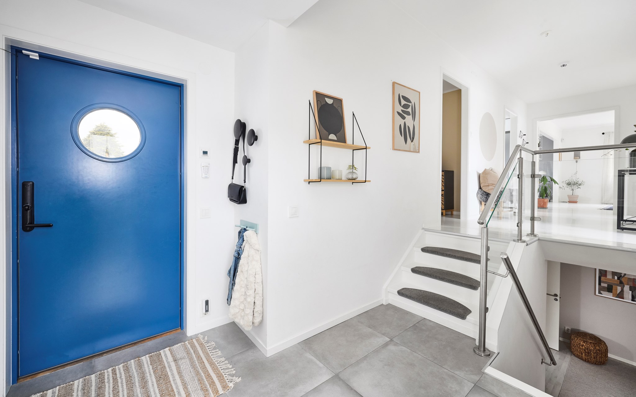Entrén är tillbyggd för några år sedan för att ge mer svängrum när familjen kommer hem. Här ligger stora klinkerplattor som tål väta och vardagsstök och bakom skjutdörrar ryms jackor, skor och väskor utan att ta plats. Det smala fönstret mot baksidan släpper in ljus och ger en skymt av ute. Trappan delar naturligt upp flödet – upp till sällskapsdelen eller ner till den lugnare våningen. Välkommen hem till en hall som gör att allt börjar lugnt, även när det är mycket på gång.