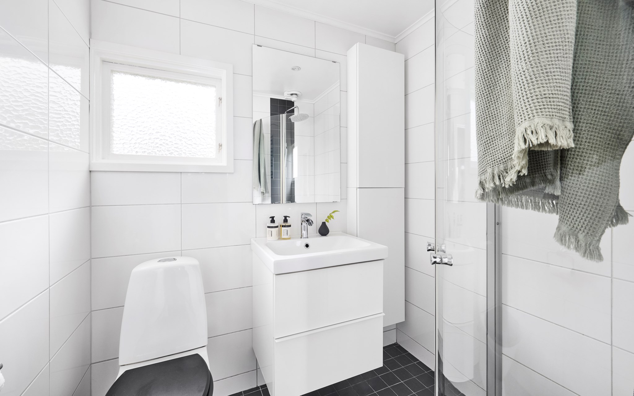 Det här är husets gästbadrum eller gästtoalett på rätt plats, nära de tre sovrummen på entréplanet. Dusch, wc och tvättställ ryms gott även om ytan är nätt. Kakel på väggarna och mörk klinker på golvet gör rummet lätt att hålla fräscht, och fönstret med insynsskydd släpper in dagsljus utan att ge minsta inblick. Familjens stora badrum ligger en våning ner – här uppe löser man vardagens snabba stopp och ger gäster en egen plats.