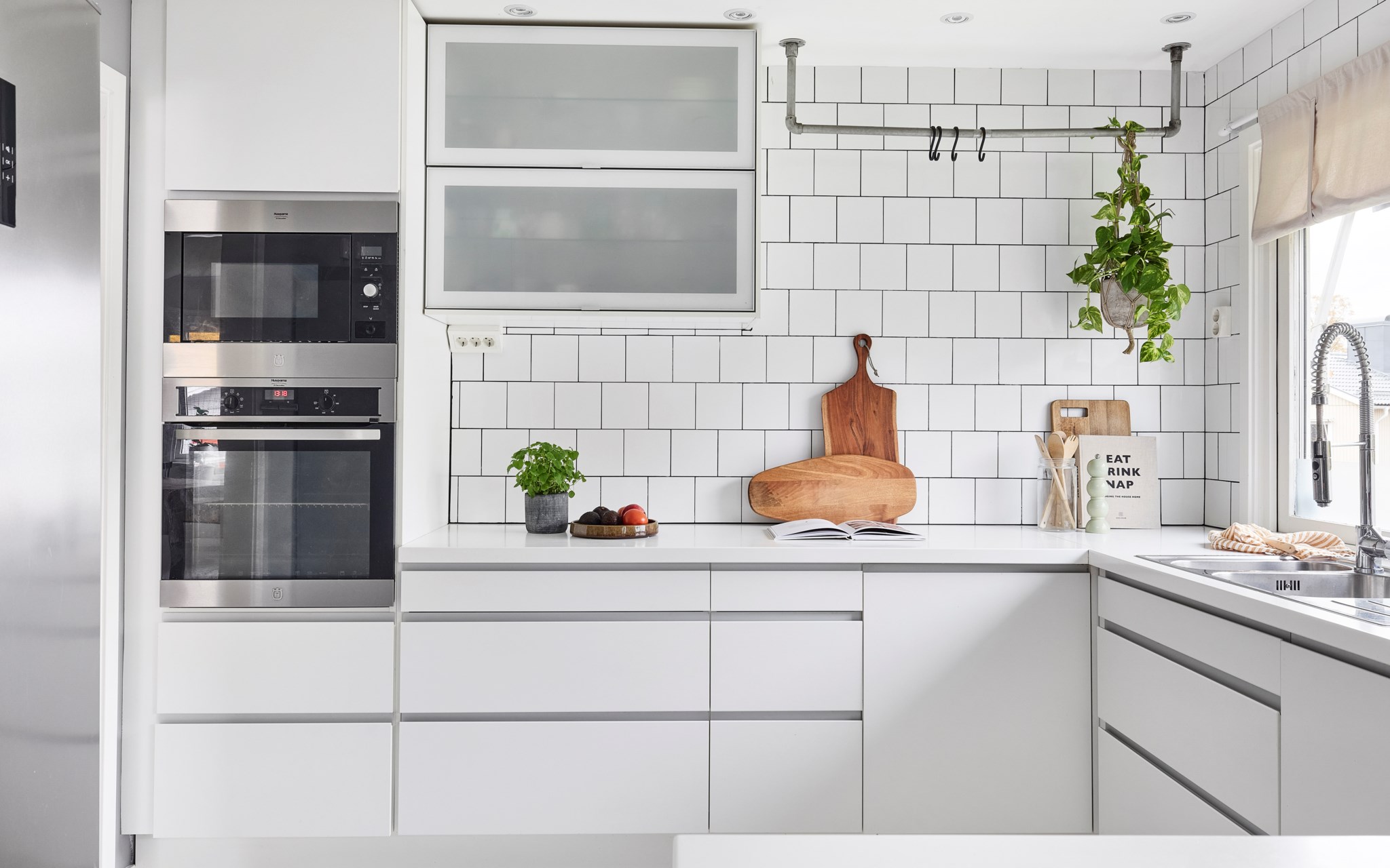 Här samlas vardagen. Köket öppnar sig mot matplatsen så att samtalet fortsätter medan maten blir klar. Arbetsytorna löper i vinkel och halvön mot matplatsen gör det enkelt att duka upp eller låta barnen rita bredvid. De stora fönstren ger fint ljus och gör rummet trevligt att vara i länge. Förvaringen räcker gott och siktlinjen ner mot matrummet och vardagsrummet är väldigt trevlig.