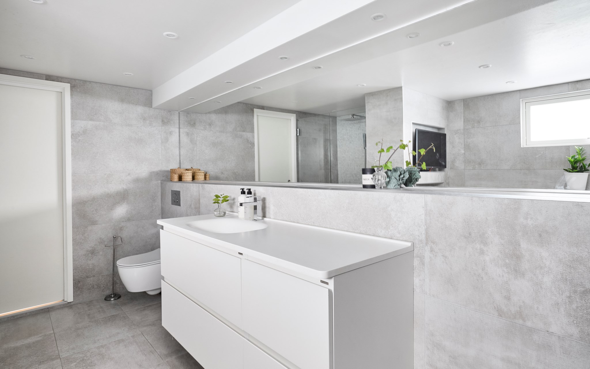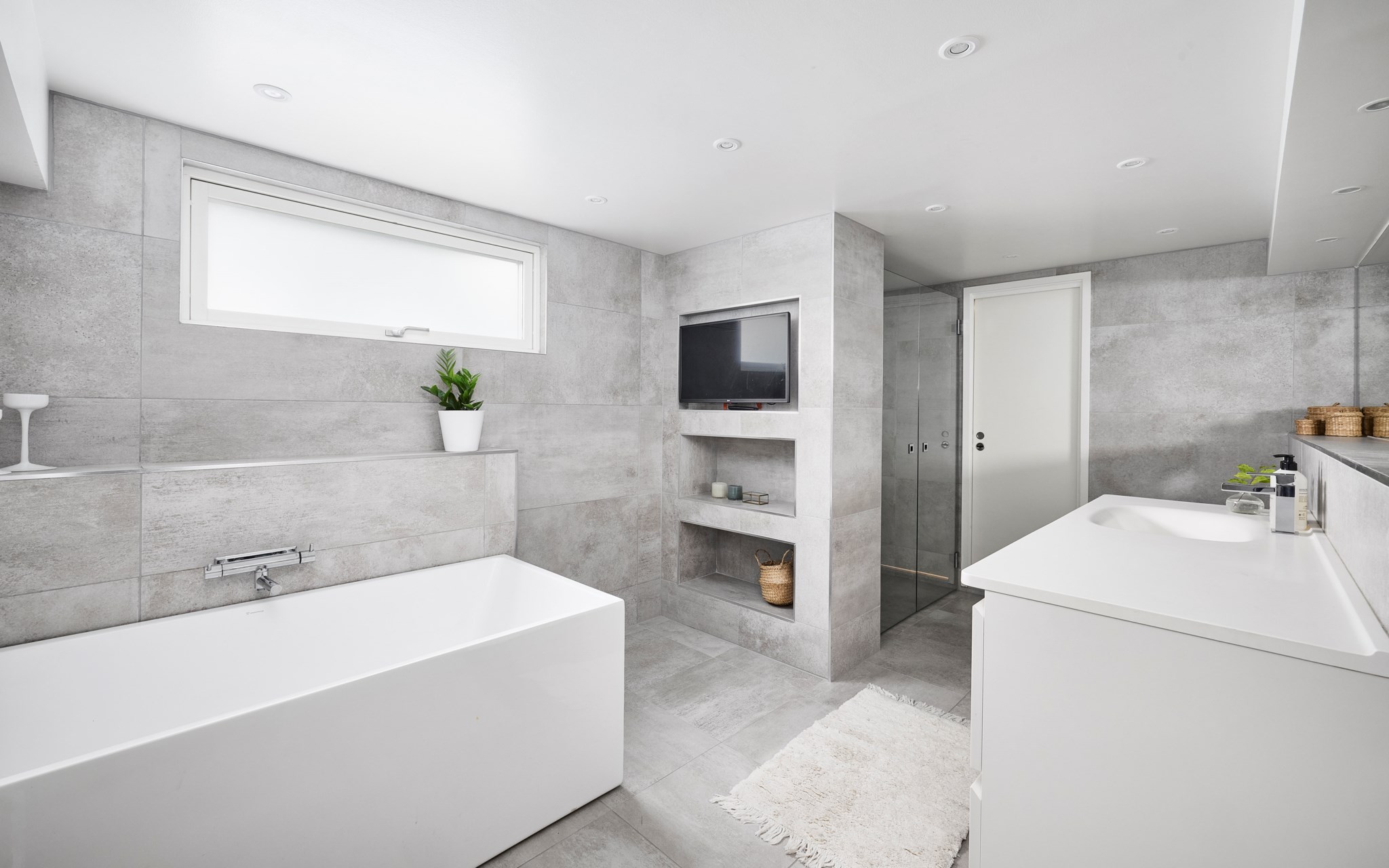 Här nere får badrummet ta för sig. Generös golvyta med vattenburen golvvärme, lugna toner och infällda spotlights ger en stilla känsla redan när man kliver in. Den rymliga duschen ligger för sig och badkaret väntar längs väggen för kvällar som får ta tid. Långa bänkytor, stor spegel och praktiska nischer gör att allt har sin plats utan att störa helheten. Ett fönster högt upp släpper in dagsljus men håller insynen borta. Läget intill walk-in closet och master bedroom gör att rummet känns som ett eget spa i vardagen.