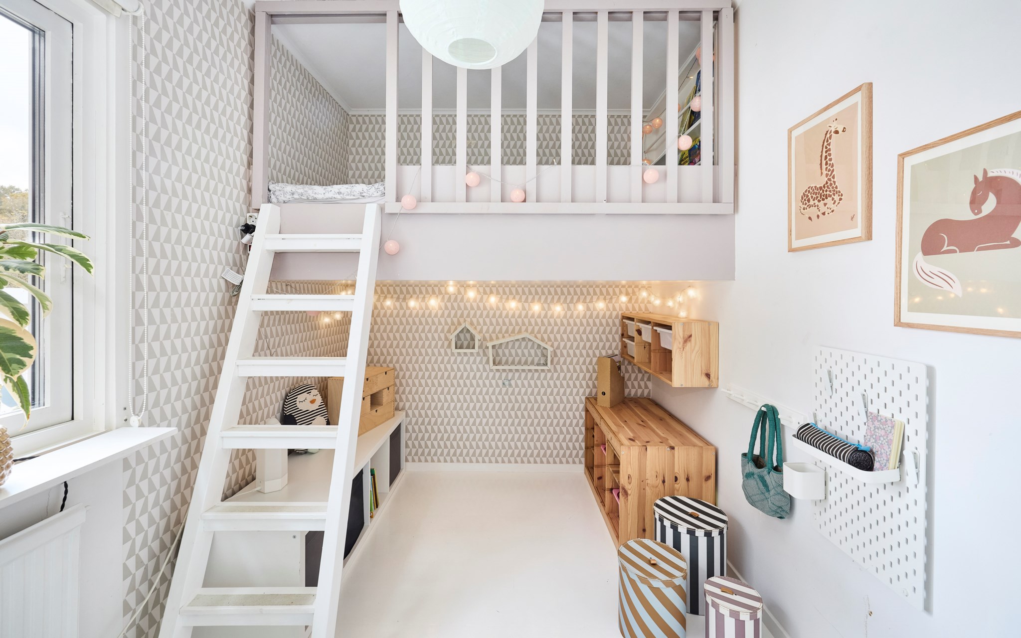 Här nere finns ett riktigt generöst rum som sväljer både lek och lugn. Ljus kommer in via fönster i två väderstreck som sitter högt på väggen och ger en behaglig känsla utan insyn. Det är ett lättmöblerat rum med en yta som räcker till både säng och stor lekplats – eller soffa och tv om du vill göra ett andra vardagsrum.