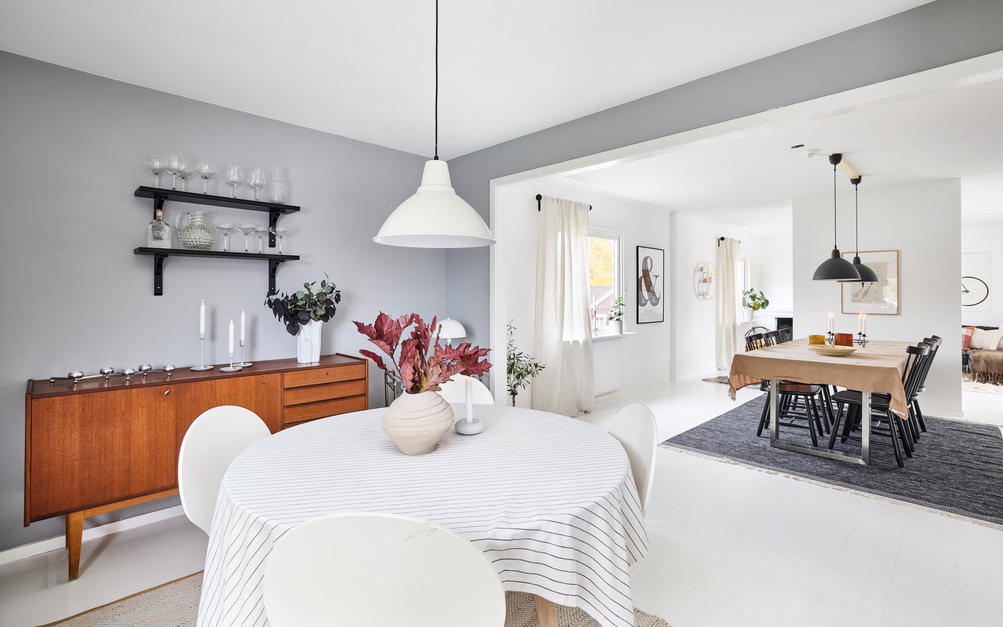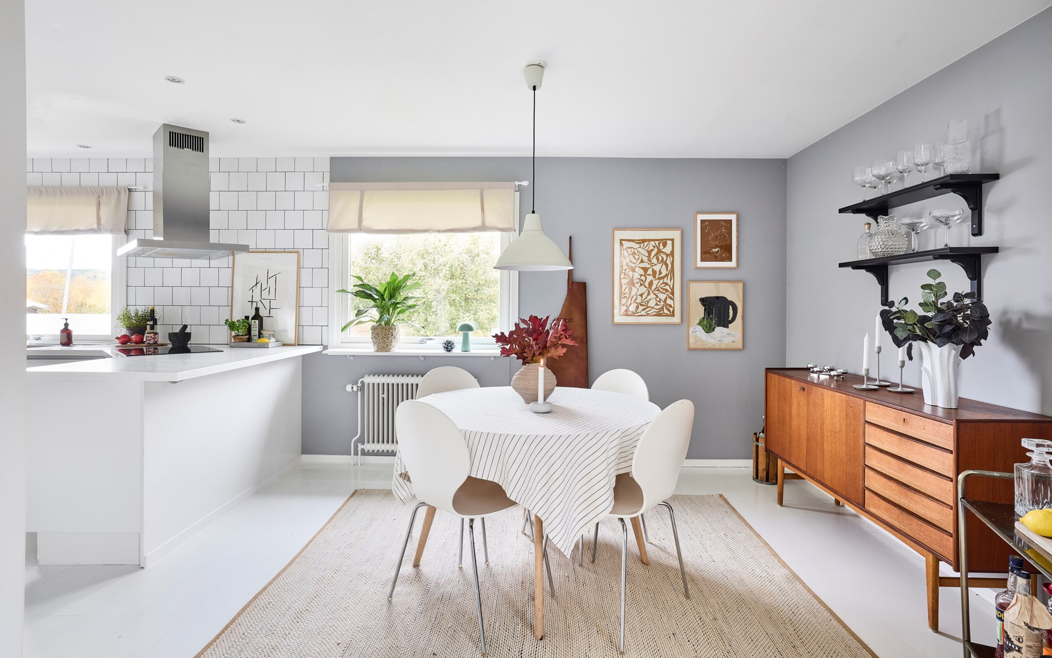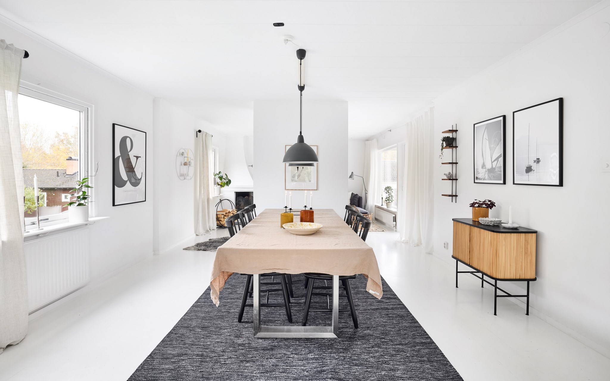 Matrummet ligger som länken mellan kök och vardagsrum. Väggen med inbyggd vedförvaring mitt emellan delar av lagom och skapar en naturlig rumsavdelare, samtidigt som samtalet fortsätter runt hörnet. Ljus från två håll gör att rummet håller sig öppet och trevligt hela dagen, och ytan räcker gott både för vardagsmiddagar och långbord när fler kommer. Närheten till köket gör dukning och servering enkel – här pågår livet mitt i huset.