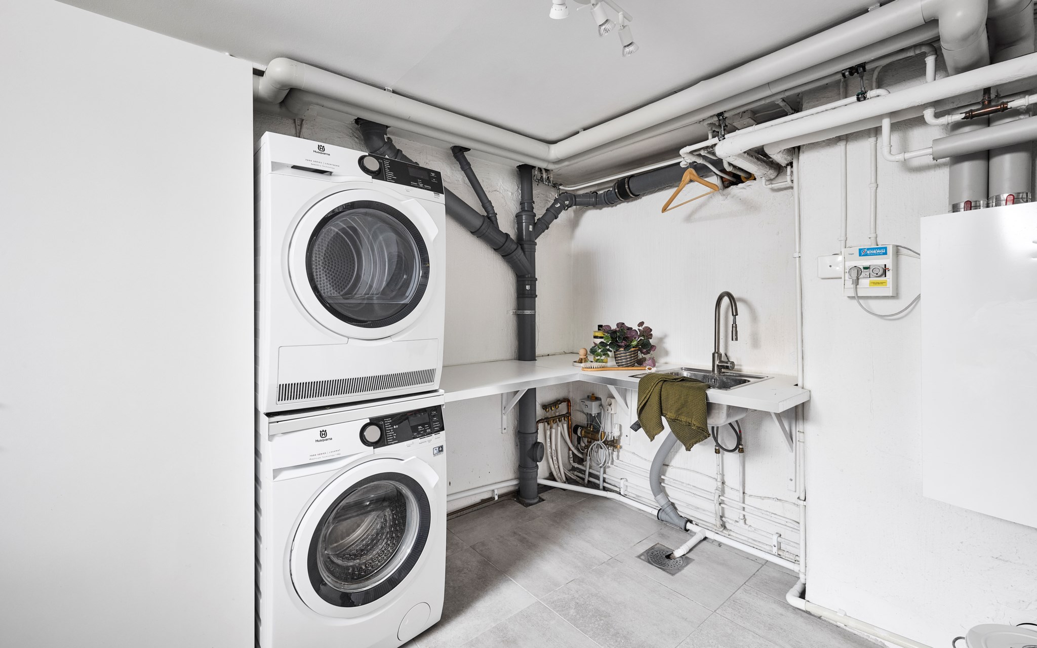 Här inne rullar vardagen smidigt. Det finns gott om förvaring och bra yta för tvättsortering och tork. Ett högt fönster släpper in dagsljus utan insyn – precis lagom när man vill beta av tvätten i lugn takt. Gott om förvaring och bra med bänkmeter arbetsyta för att vika tvätt och sortera strumpor.