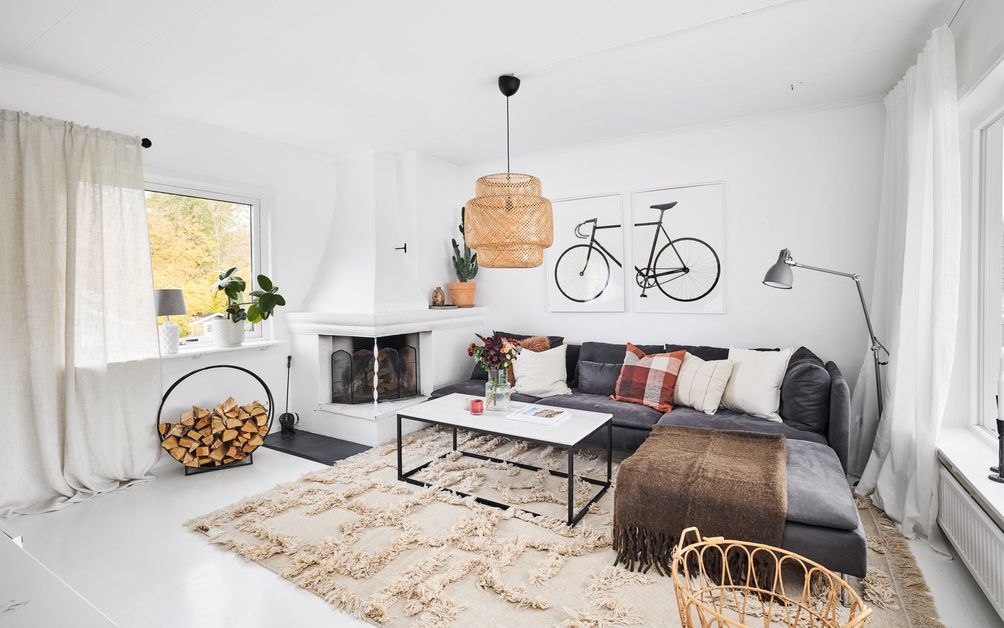 "Vi använder den öppna spisen nästan året om, framförallt på hösten och vintern är det sjukt mysigt att elda här när man slappar i soffan."