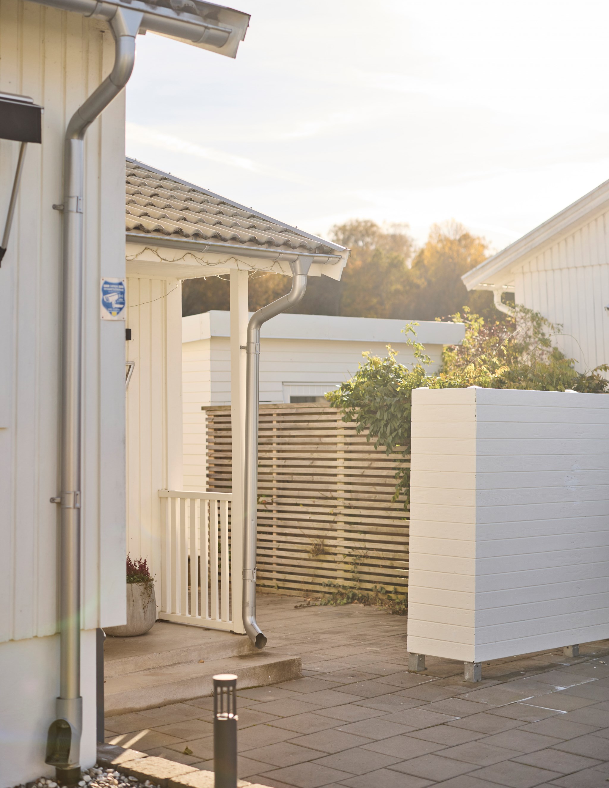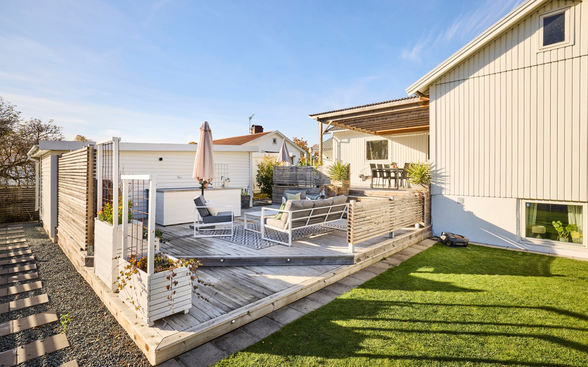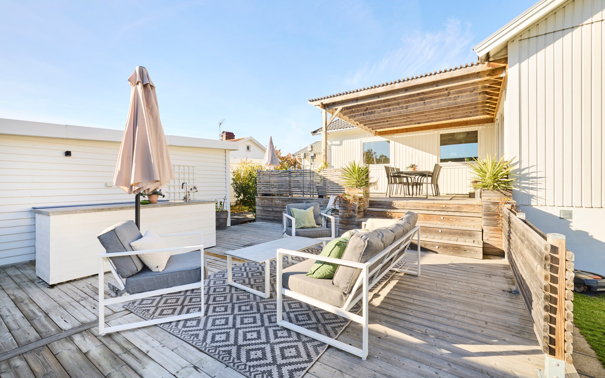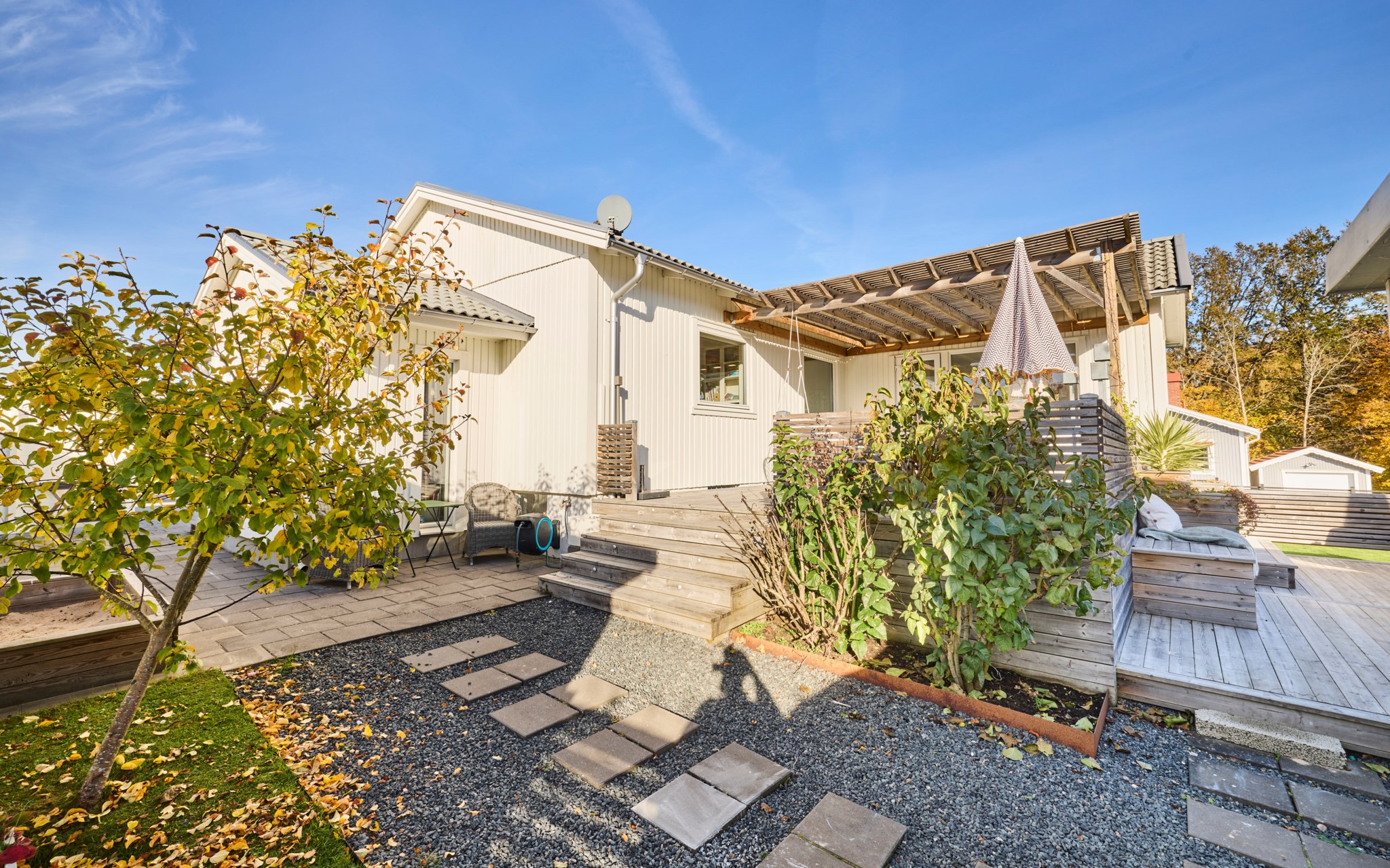Här ute bor ni halva året och flödet från inne till ute är självklart. Från vardagsrummet kliver du rakt ut under pergolan där middagsbordet står i skugga när solen ligger på. Några steg ned leder trappan till den nedre uteplatsen med utekök och plats för soffgrupp. Intill ligger det gamla garaget som idag används som förråd – perfekt när dynor och cyklar ska ha nära hemvist. Den tidigare infarten hit är nu en grusad gång med gångstenar och insynsskyddande plank som ramar in gården.