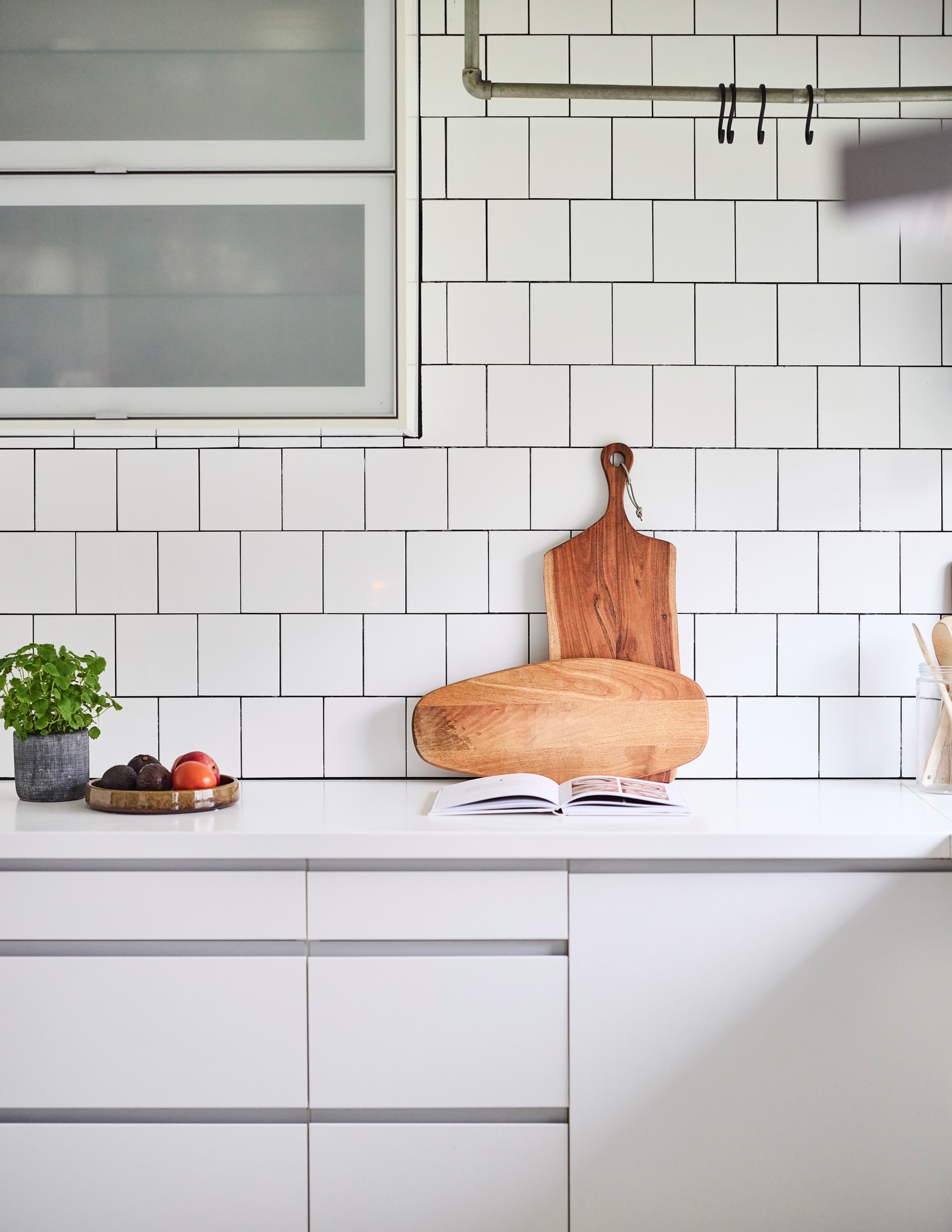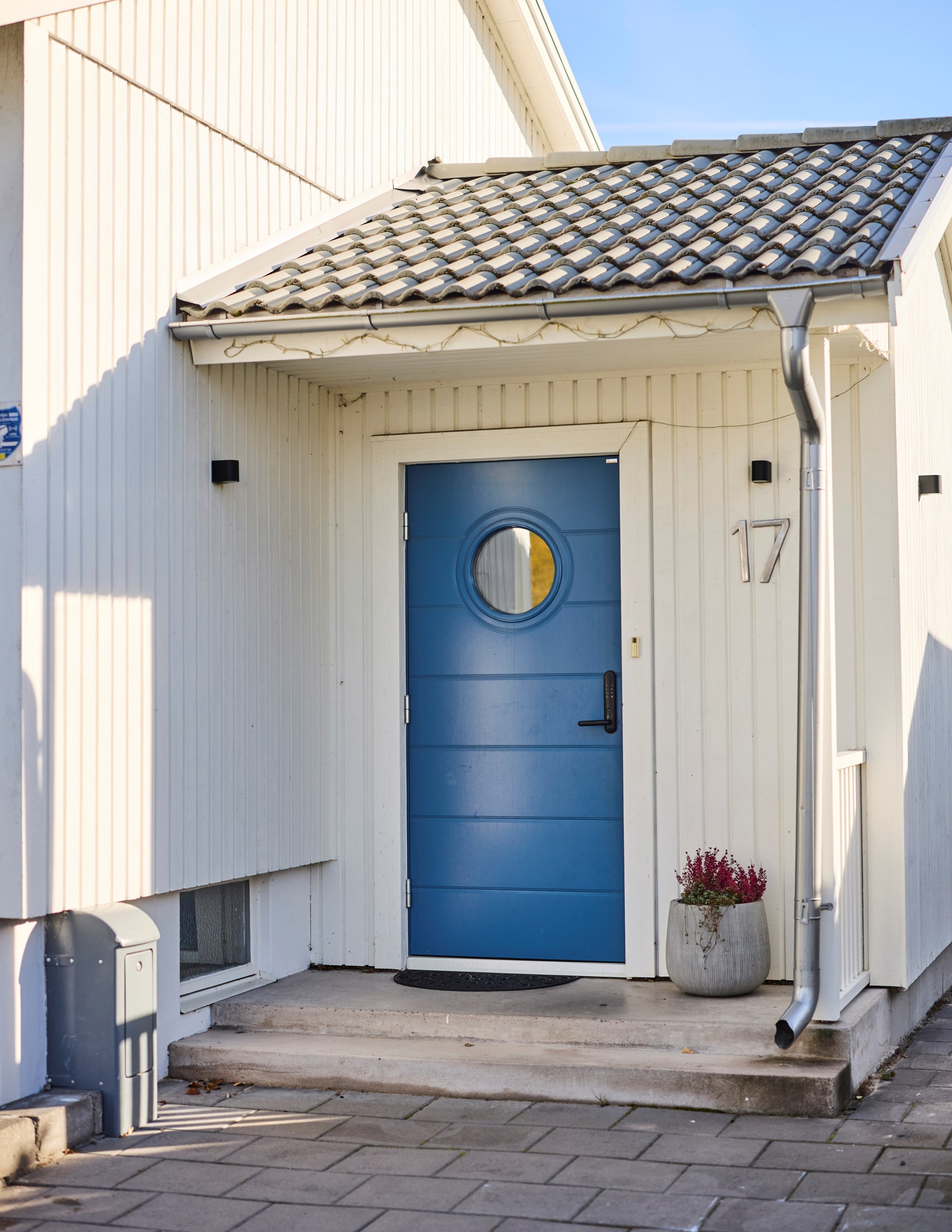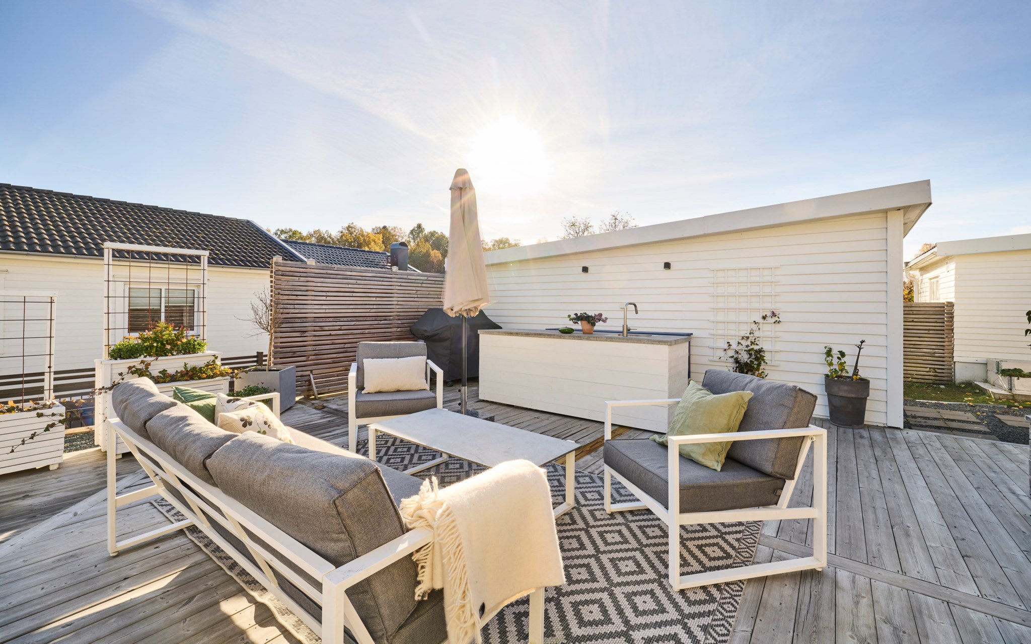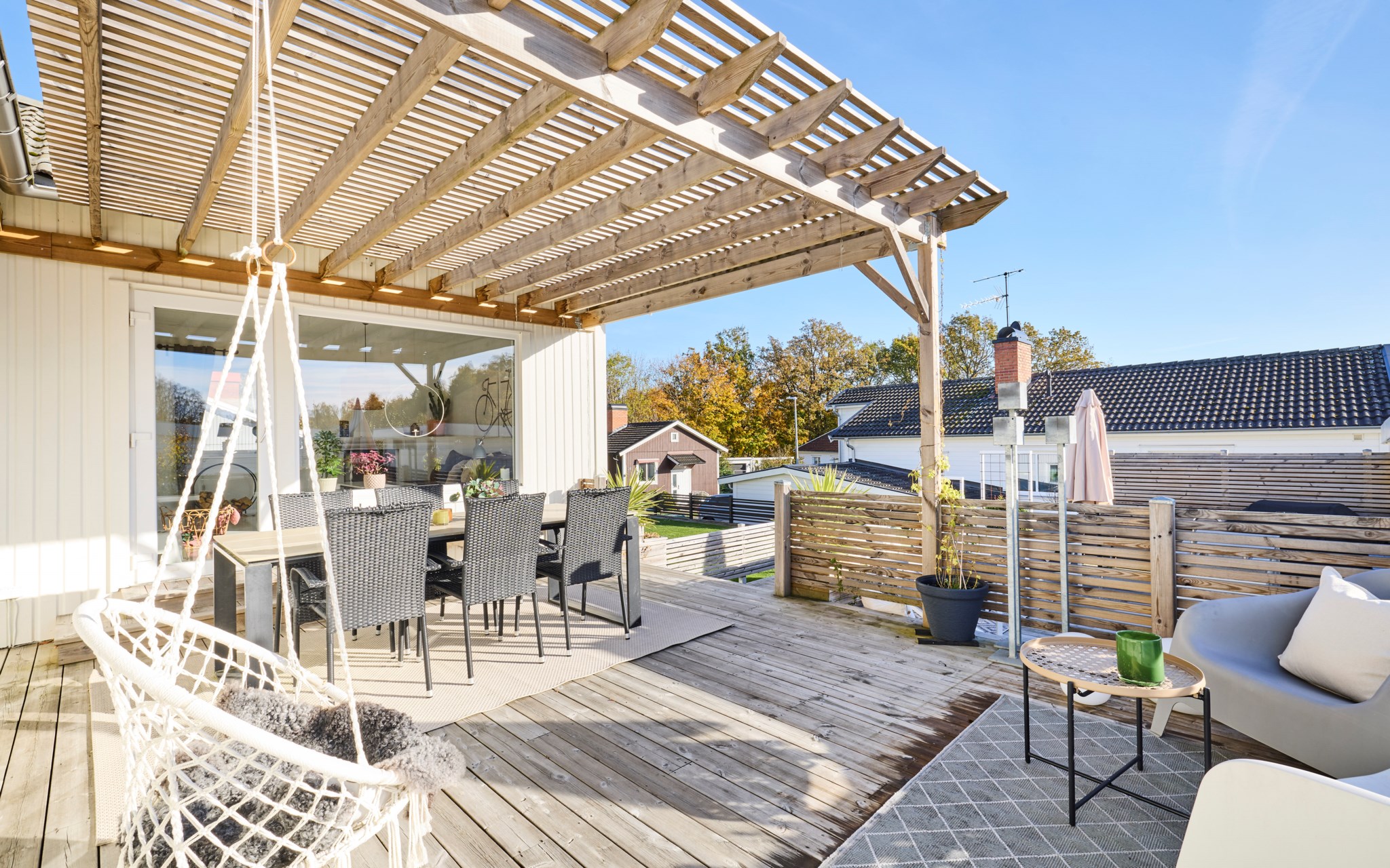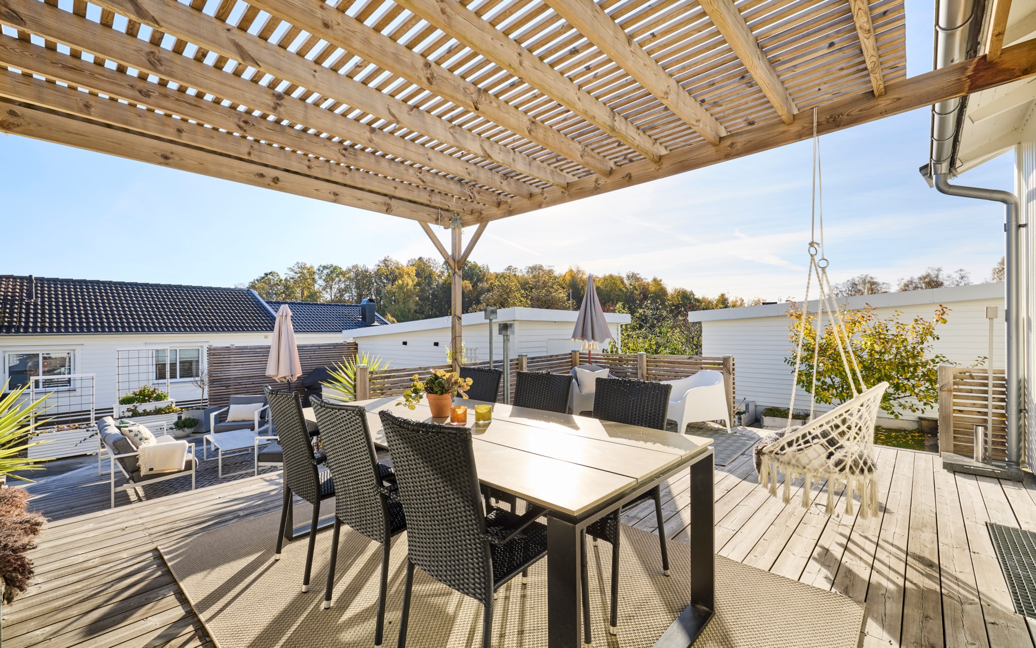 Här ute bor ni halva året och flödet från inne till ute är självklart. Från vardagsrummet kliver du rakt ut under pergolan där middagsbordet står i skugga när solen ligger på. Några steg ned leder trappan till den nedre uteplatsen med utekök och plats för soffgrupp. Intill ligger det gamla garaget som idag används som förråd – perfekt när dynor och cyklar ska ha nära hemvist. Den tidigare infarten hit är nu en grusad gång med gångstenar och insynsskyddande plank som ramar in gården.