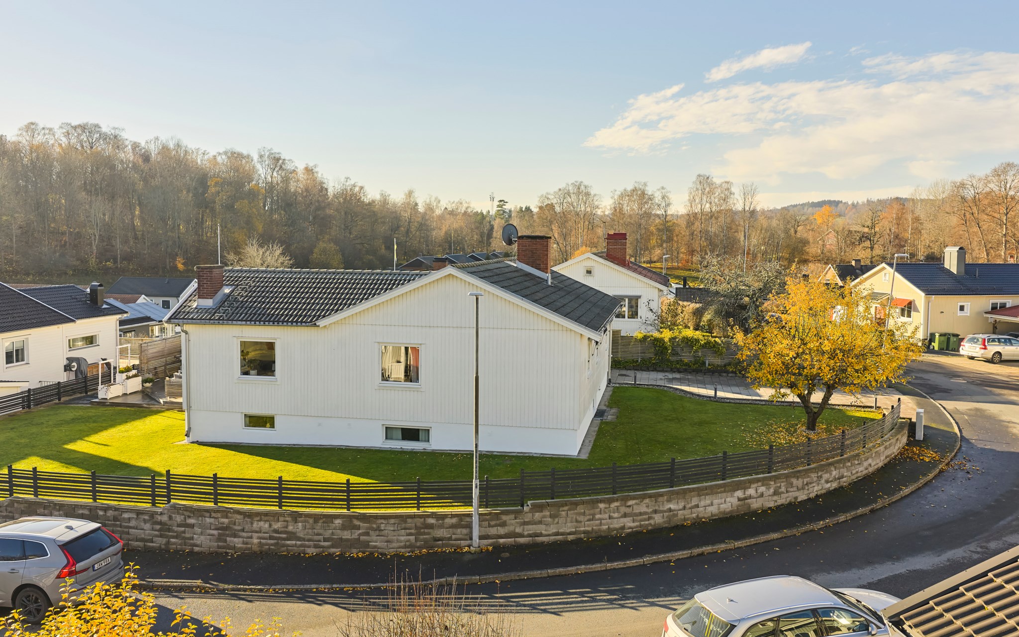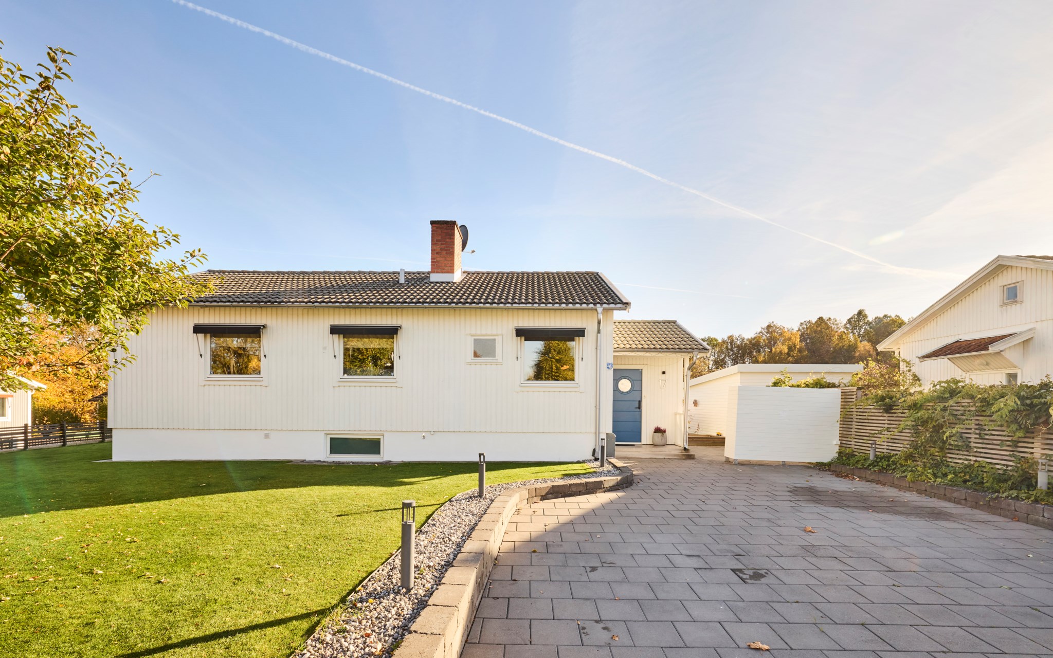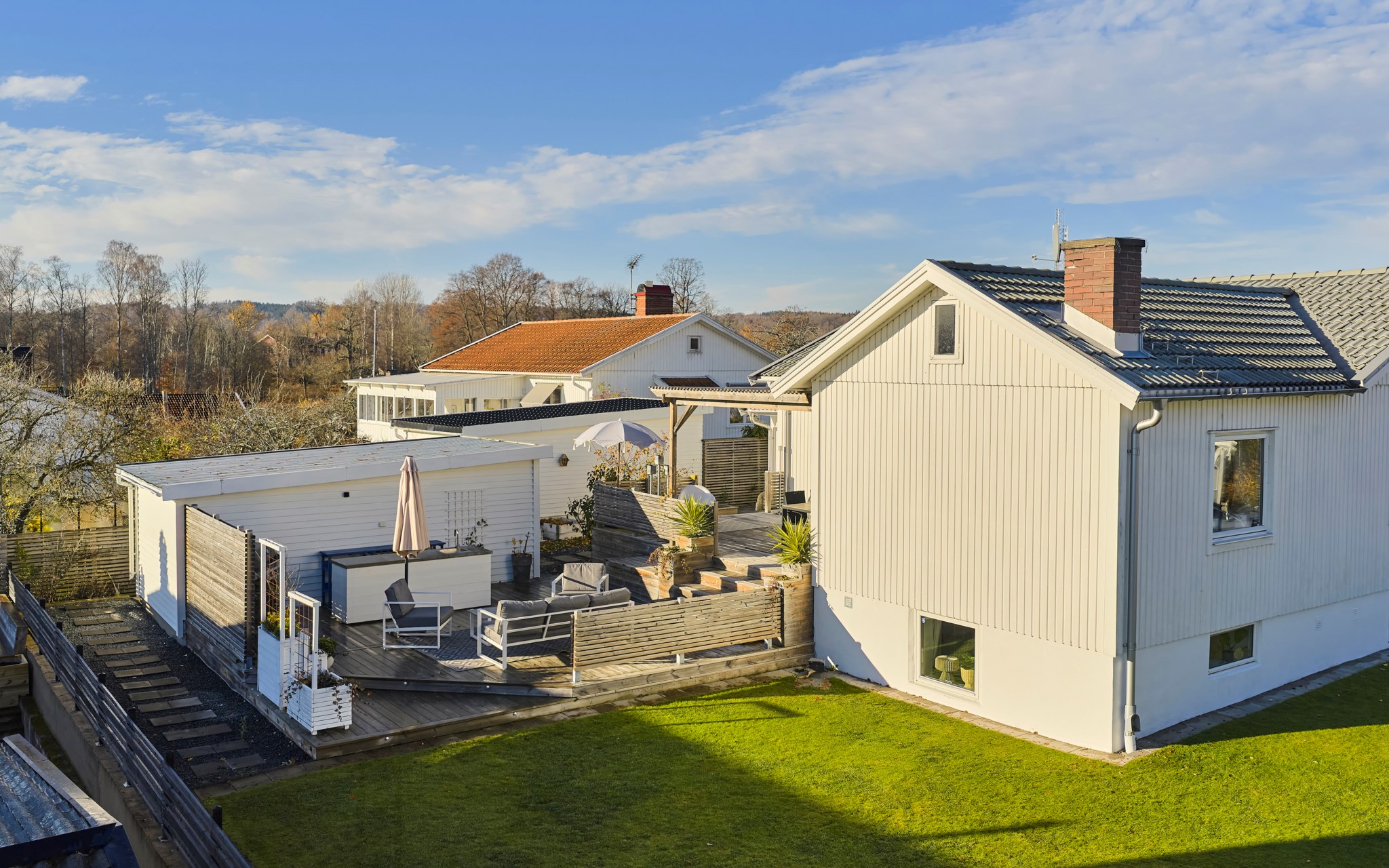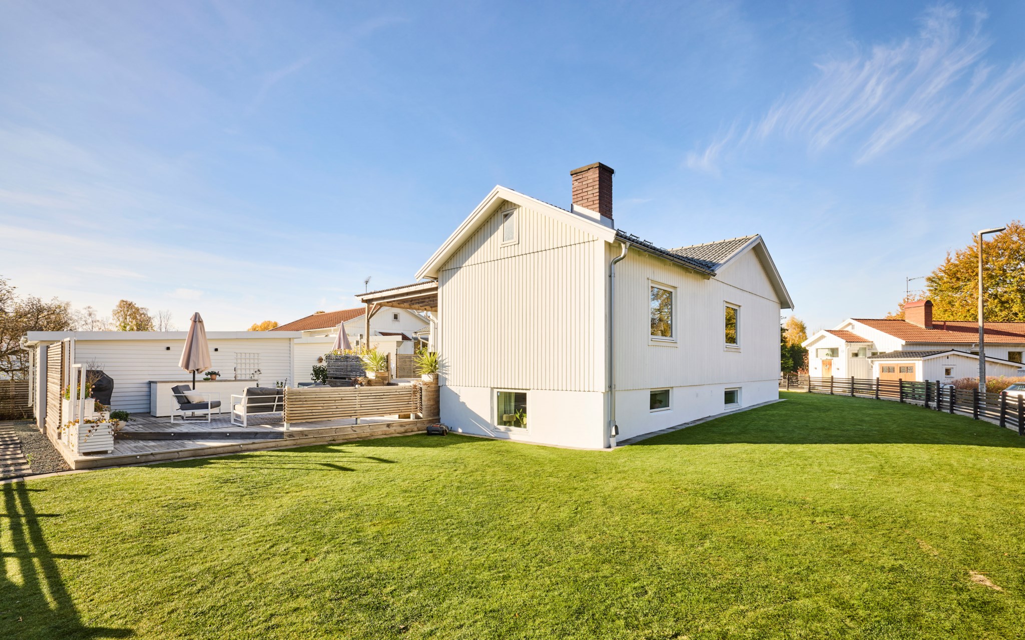 Huset är byggt 1958 och står lite högre upp på gatan – ett hörnläge som känns öppet men ändå privat. Fasaden i vit träpanel är välskött och löpande målad, och helhetsintrycket är att huset har tagits om hand med omtanke. Även invändigt märks omsorgen – alla ytskikt har fått uppdatering och kärlek de senaste åren, utan att tappa husets ursprungliga karaktär. Entrén är tillbyggd så att du landar lugnt innan du rör dig vidare in. På framsidan möts du en upphöjd tomt och en stadig mur som håller ordning mot gatan, medan gräset ger plats åt spring och boll. På baksidan flyttar livet ut stora delar av året. Här finns en generös trall med bred trappa, skön pergola och ett utekök med vatten – enkelt när middagen får bli utomhus.