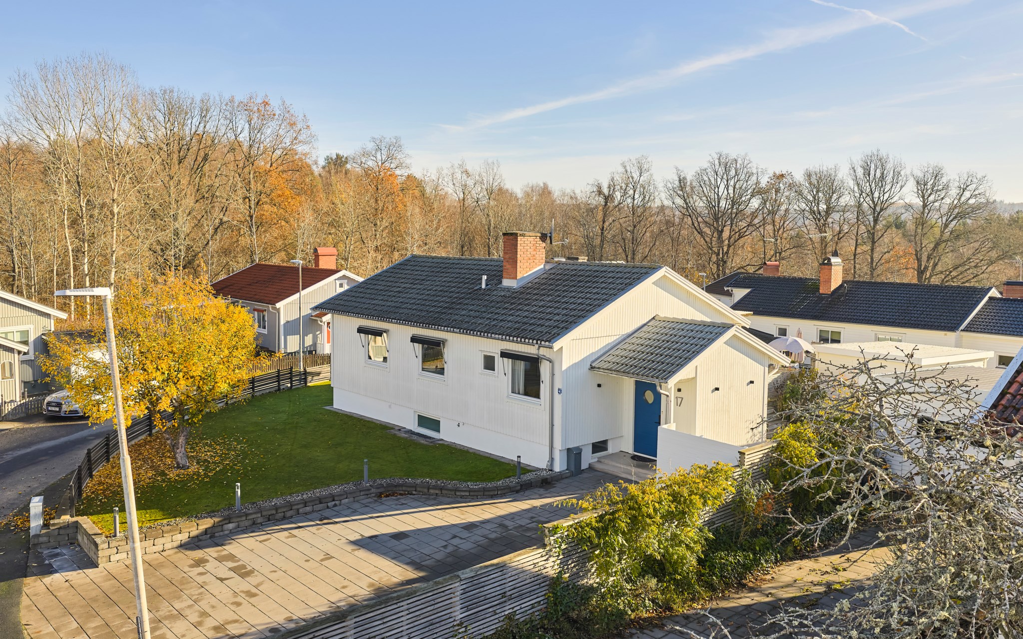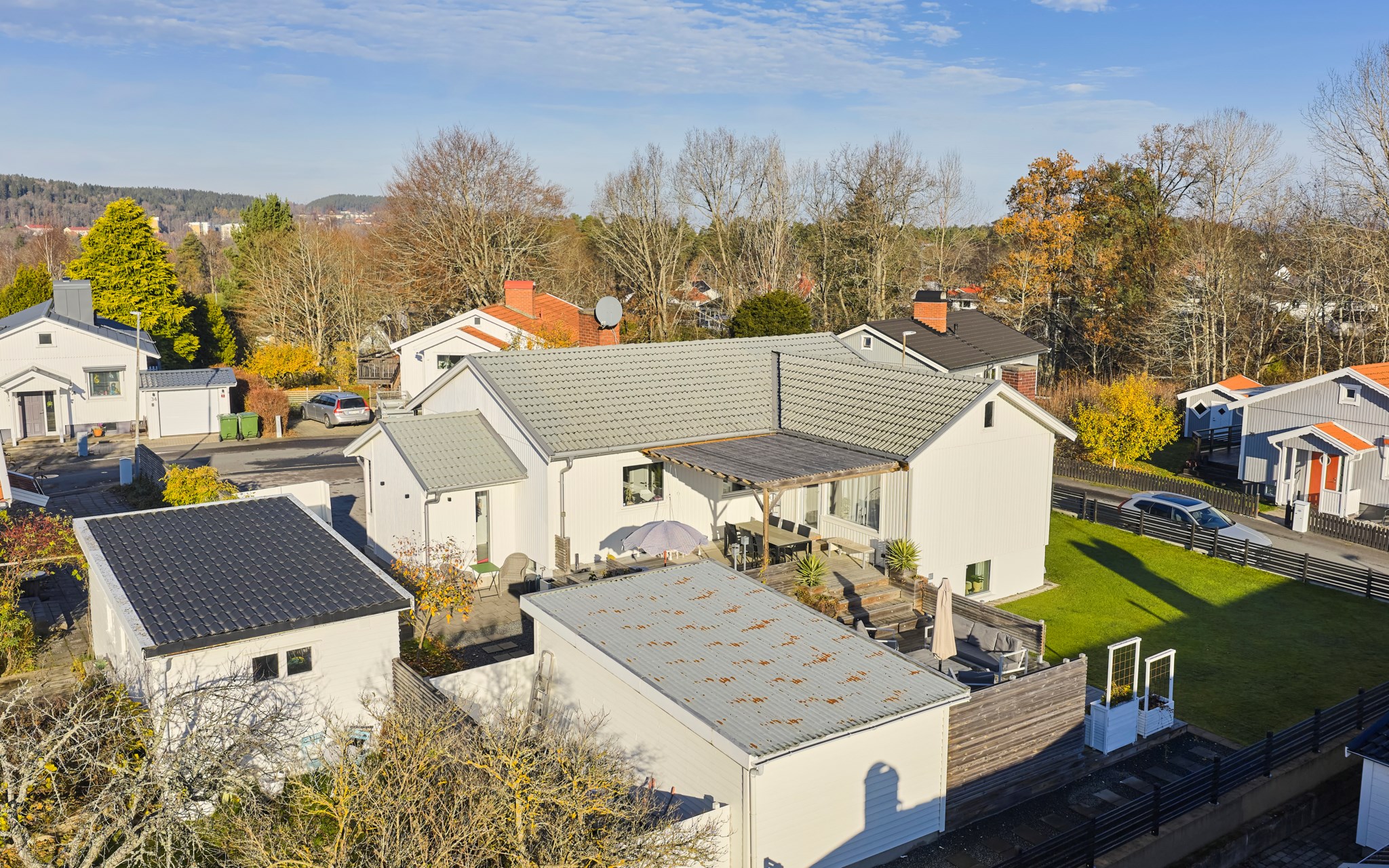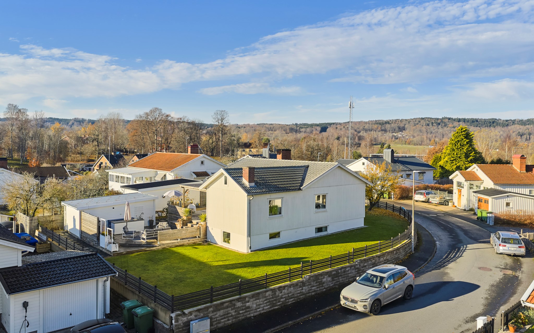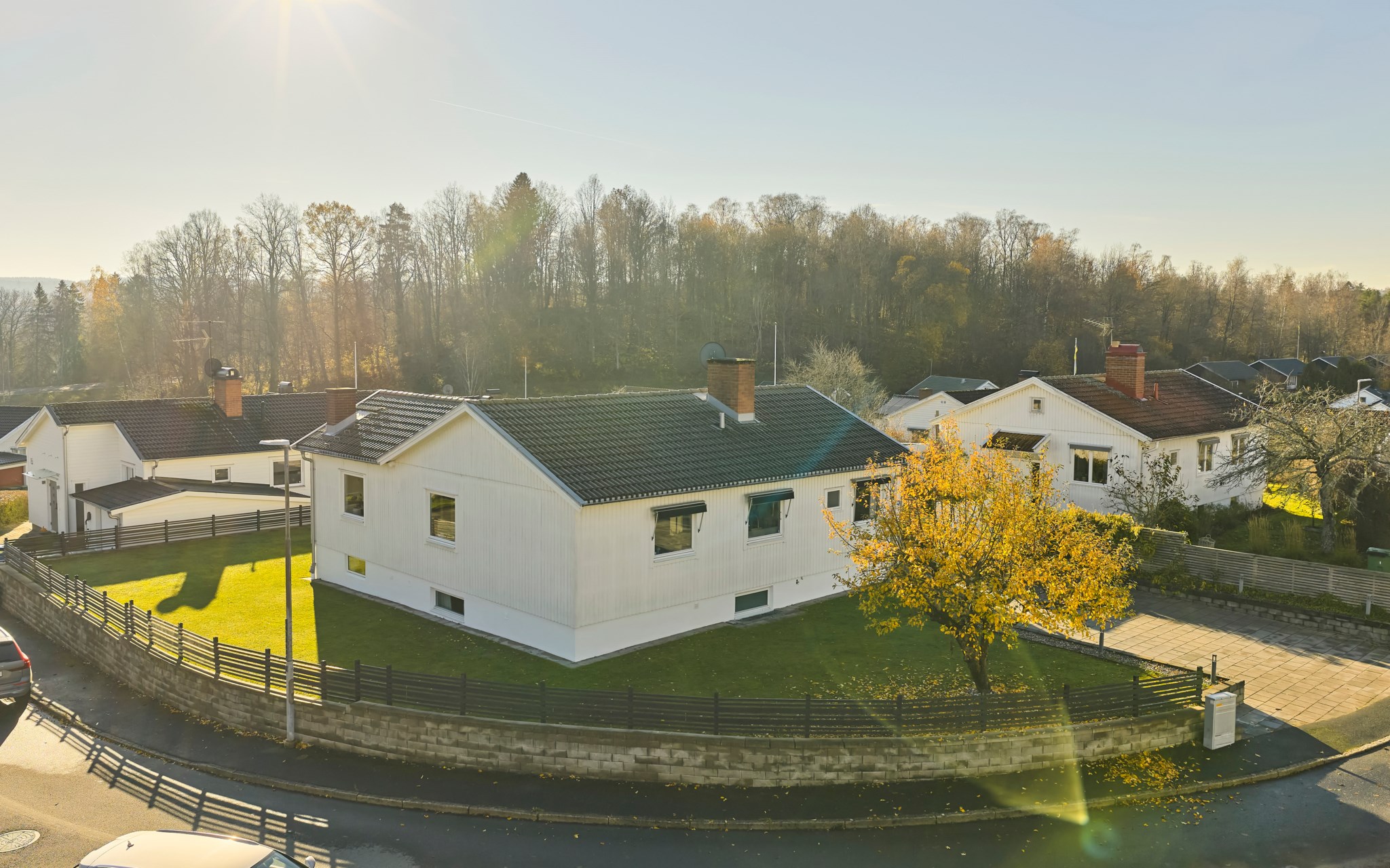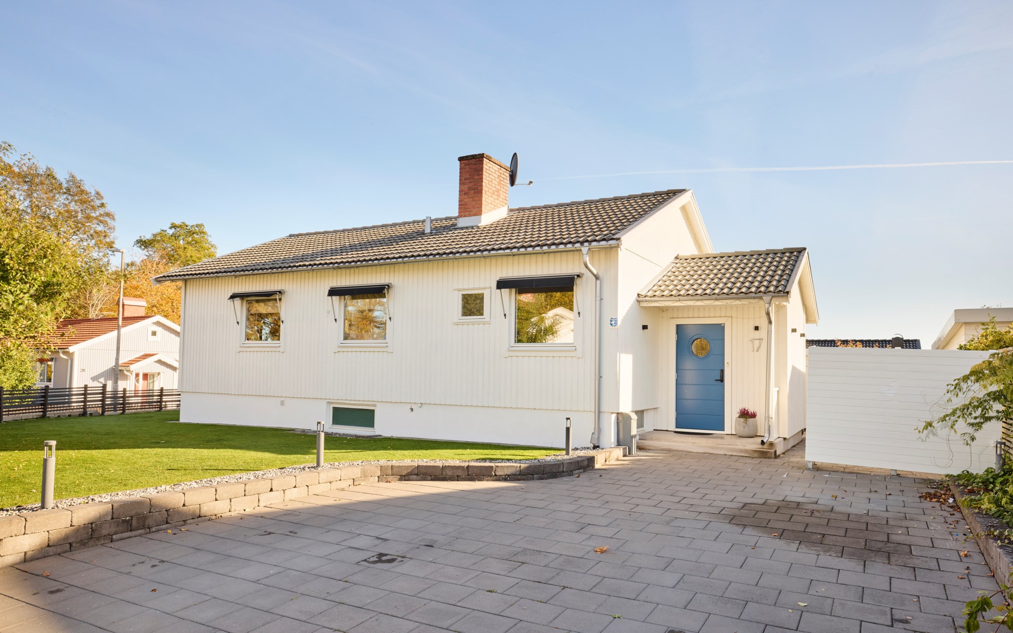 Huset är byggt 1958 och står lite högre upp på gatan – ett hörnläge som känns öppet men ändå privat. Fasaden i vit träpanel är välskött och löpande målad, och helhetsintrycket är att huset har tagits om hand med omtanke. Även invändigt märks omsorgen – alla ytskikt har fått uppdatering och kärlek de senaste åren, utan att tappa husets ursprungliga karaktär. Entrén är tillbyggd så att du landar lugnt innan du rör dig vidare in. På framsidan möts du en upphöjd tomt och en stadig mur som håller ordning mot gatan, medan gräset ger plats åt spring och boll. På baksidan flyttar livet ut stora delar av året. Här finns en generös trall med bred trappa, skön pergola och ett utekök med vatten – enkelt när middagen får bli utomhus.