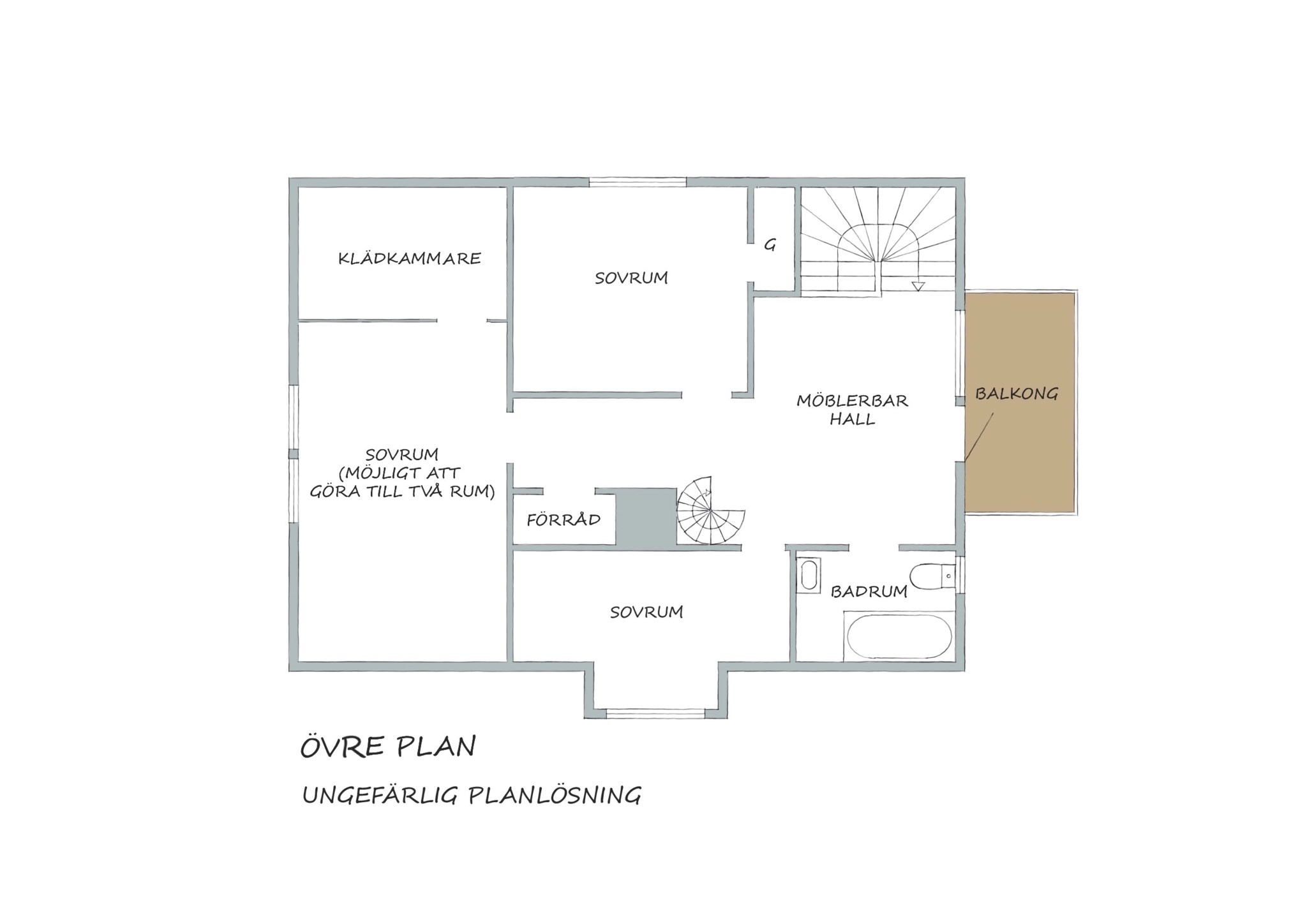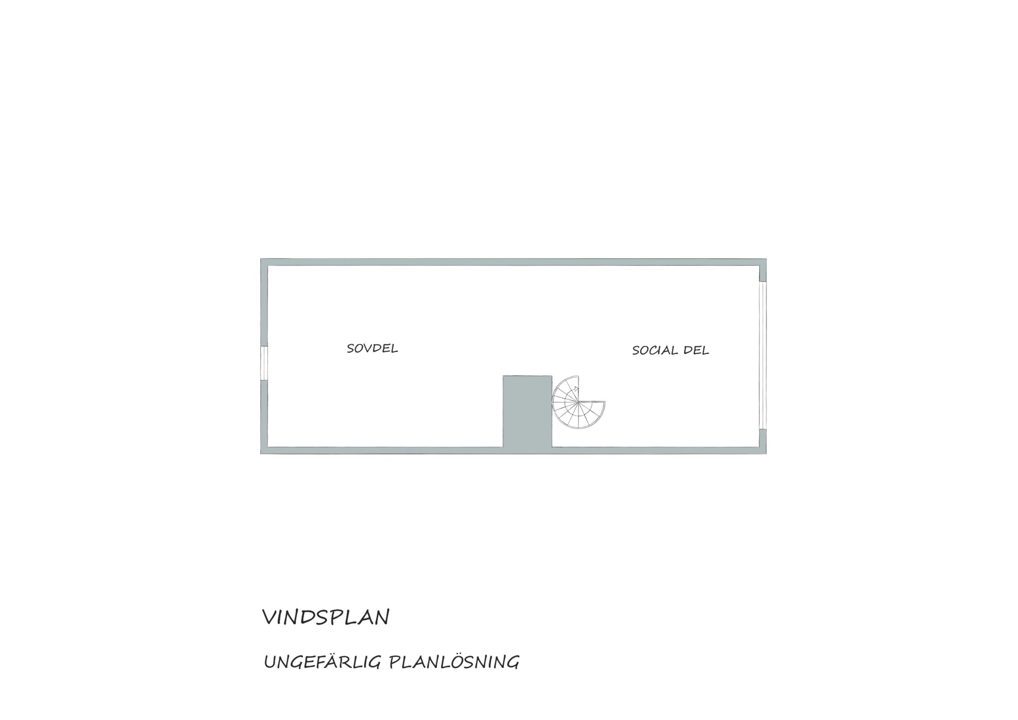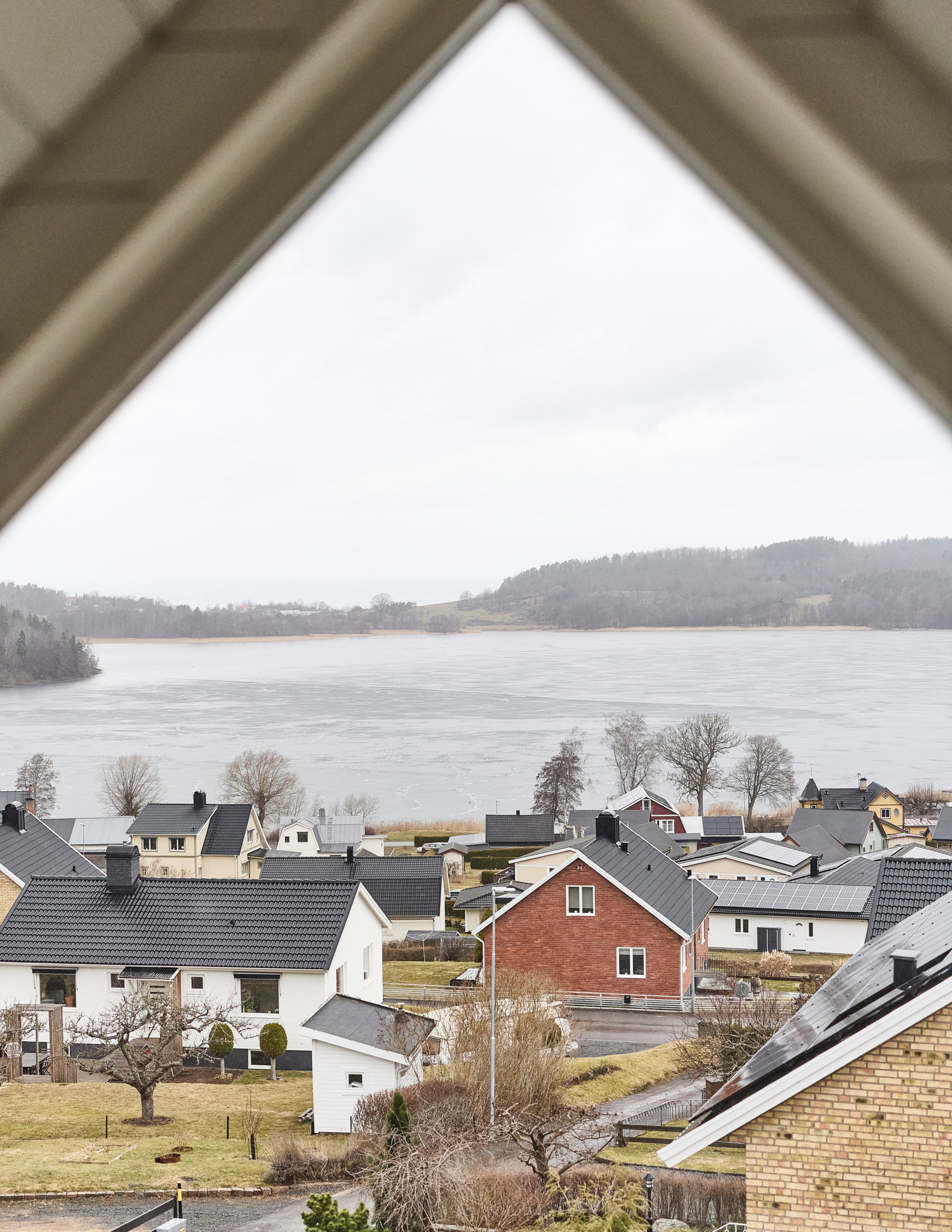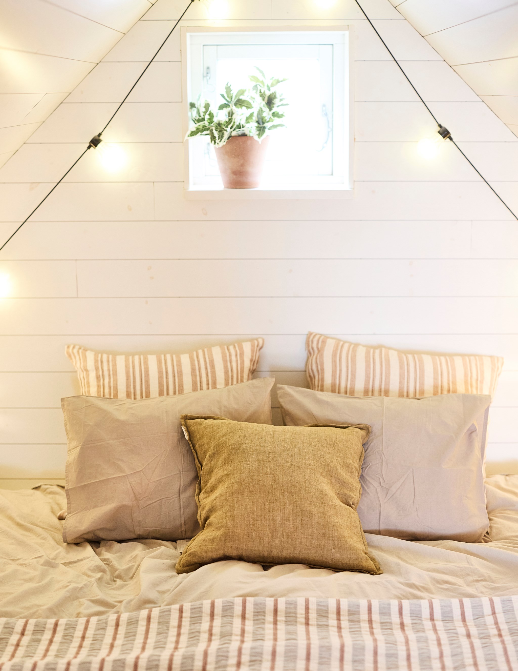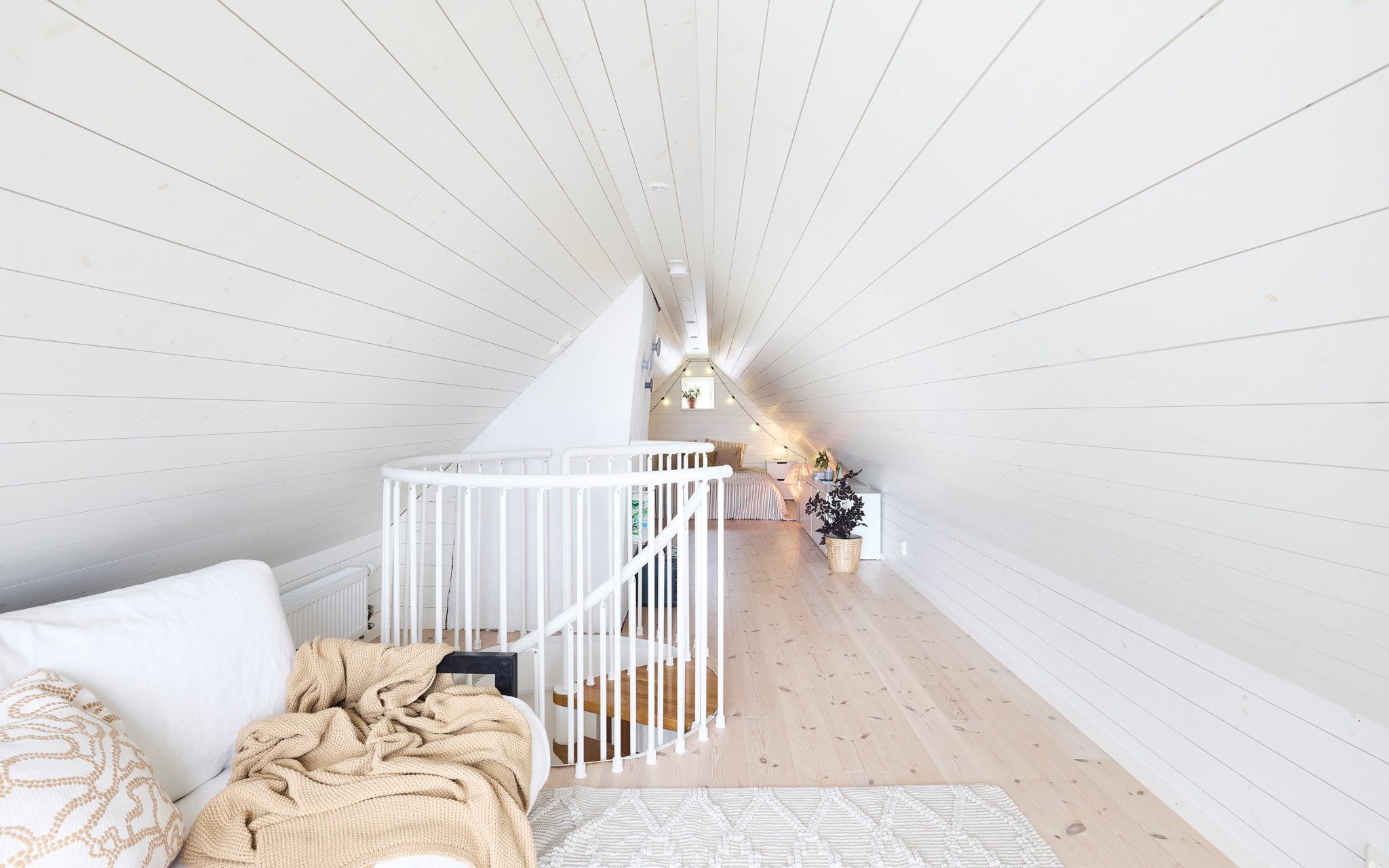 Husets höga resning och takfall har dessutom öppnat möjligheten att inreda ett sovloft på tredje våningen. Ett oemotståndligt charmigt rum med stort panoramafönster som fyller hela gaveln. Vi behöver inte orda så mycket om utsikten, du anar nog vad som väntar. Loftet uppfyller inte kraven på att få kallas boyta, men det hindrar inte att inreda med en sittgrupp vid fönstret. Som sovyta är det såklart helt magiskt, du sover längst in, men kan ändå spana ut över sjölandskapet. Några dagar per år kanske kvällssolen hittar hela vägen in till kudden. Upp hit tar du dig via en spiraltrappa, och större prylar hivar du upp genom en lucka i golvet, som sängarna exempelvis. Det kommer säkert kivas lite i familjen om att få sova här uppe. Kanske får ni byta varje år?