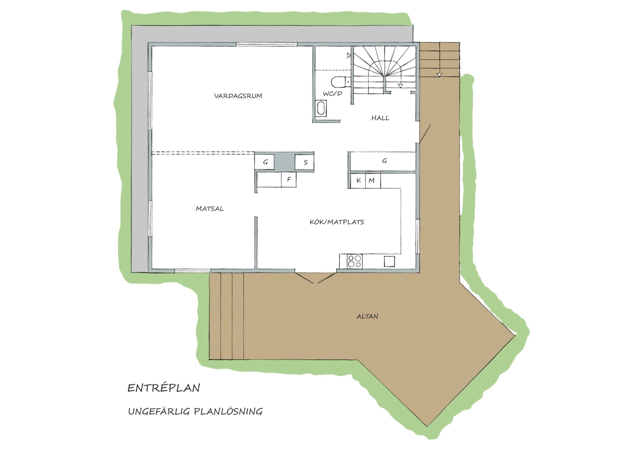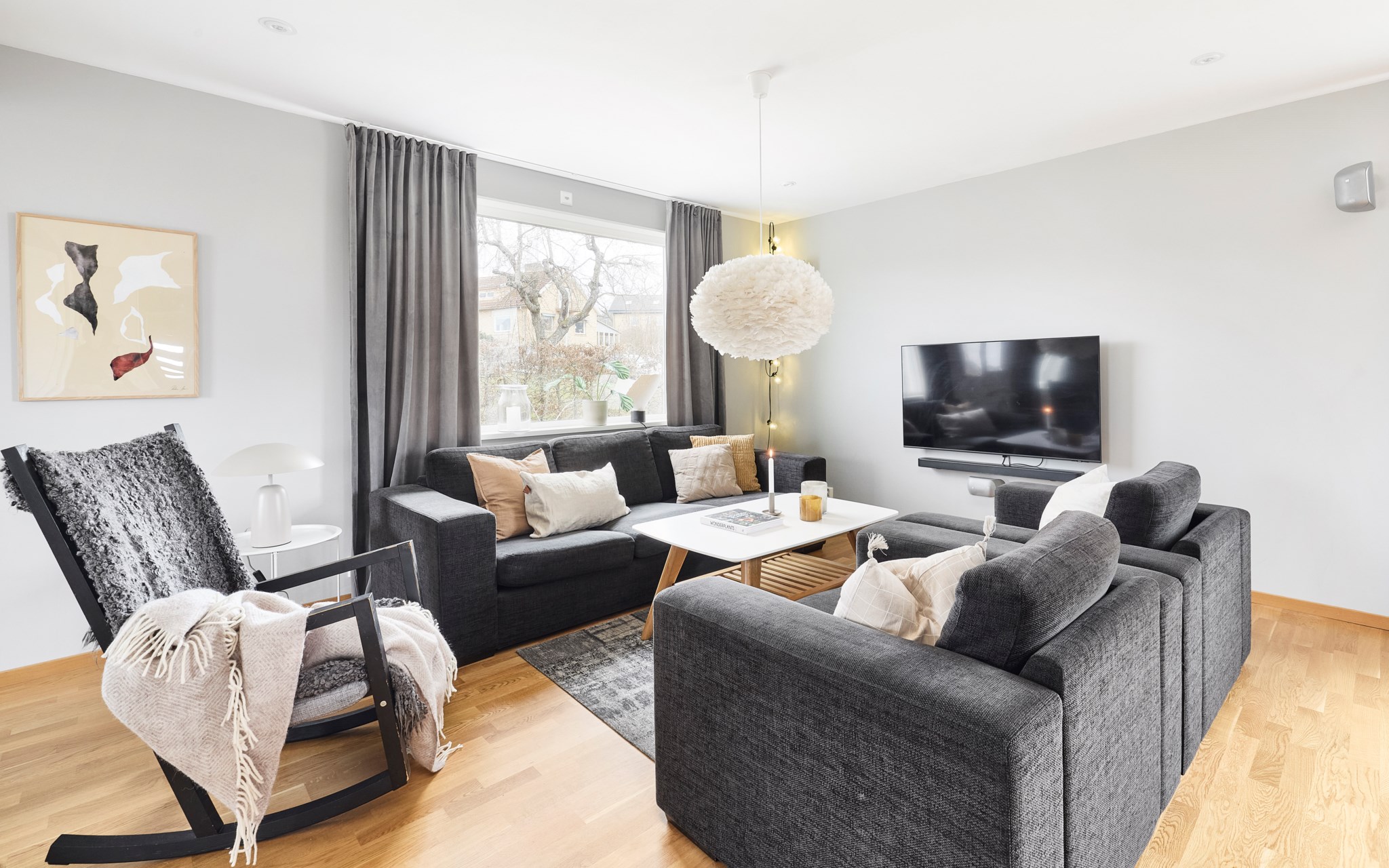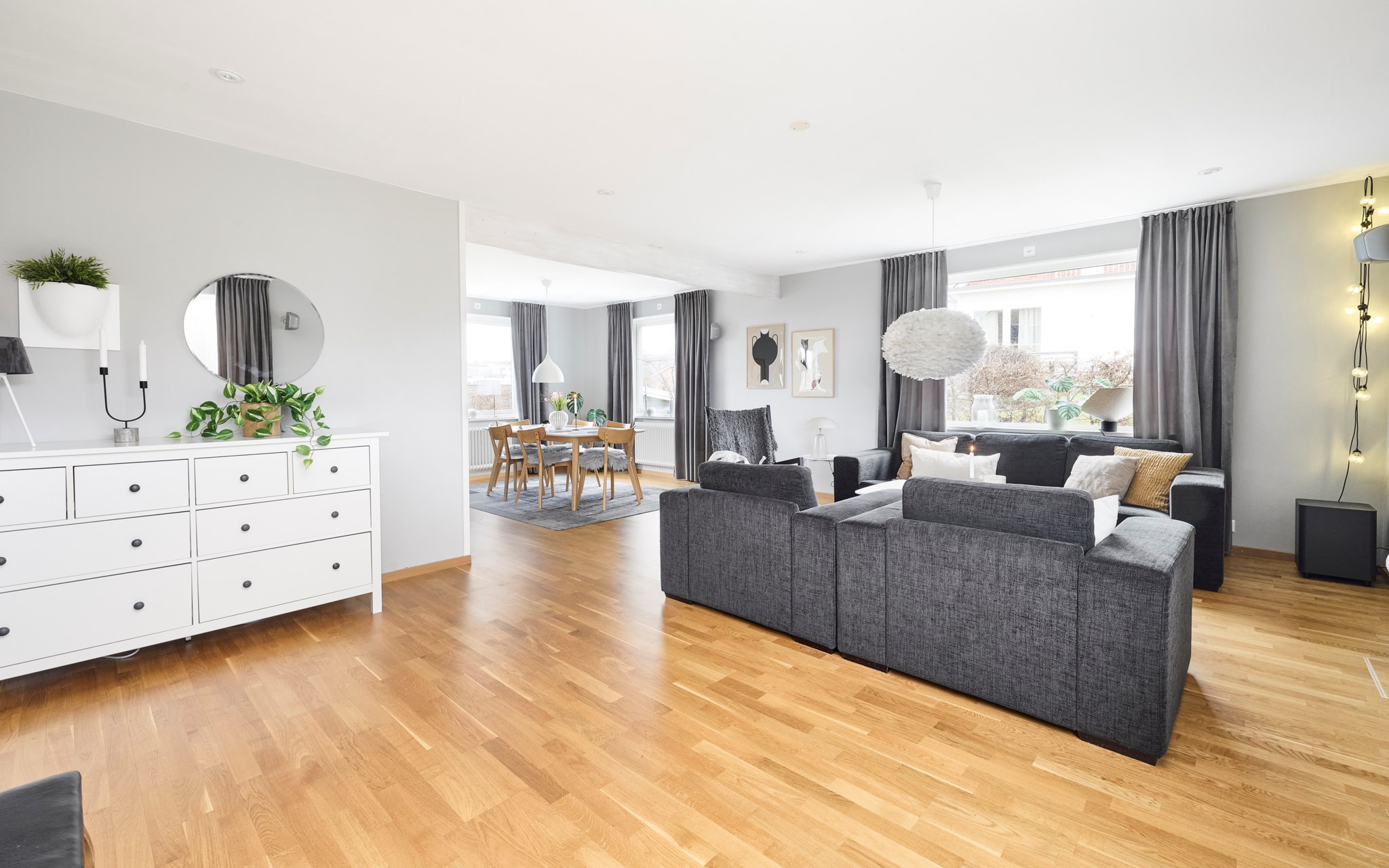 Frågan är hur många hundra varv barnen kan springa runt mellan kök, hall och vardagsrum på en kväll? Som du ser i både vardagsrummet och i hallen är taket avlastat med två kraftiga limträbalkar för att skapa denna öppna volym som hålls ihop med enhetliga färger på väggarna och enhetlig kvistfri ekparkett. Fönster i tre väderstreck, fyra om du räknar med siktlinjen rätt genom köket. Här öppnar sig många lösningar att möblera stort, både med soffgrupp och långt matbord om du vill. Väggar, golv och tak förberedda för hemmabiokvällar om du kollar noggrant. Murstocken passerar i väggen mot köket om du drömmer om en kamin.