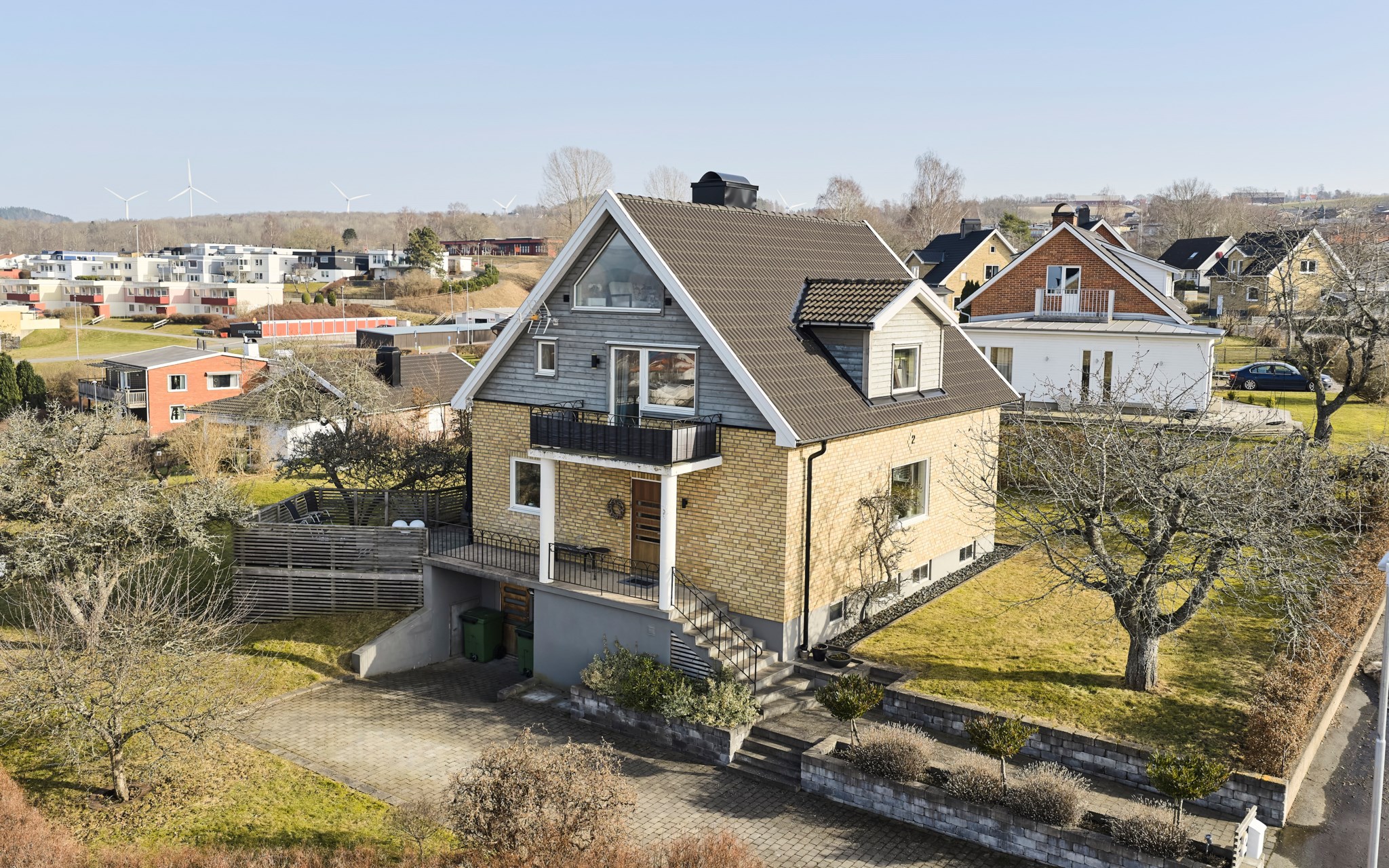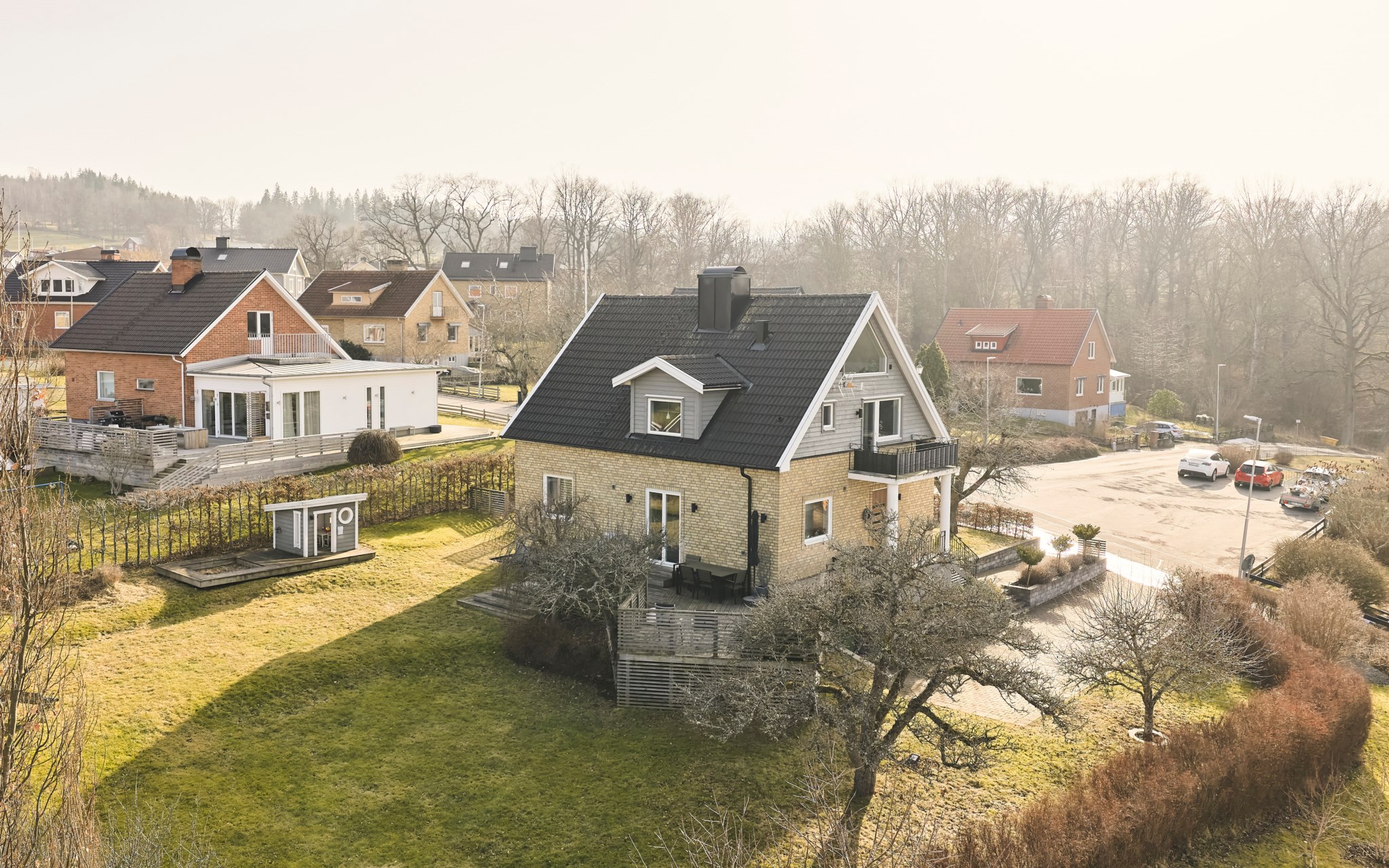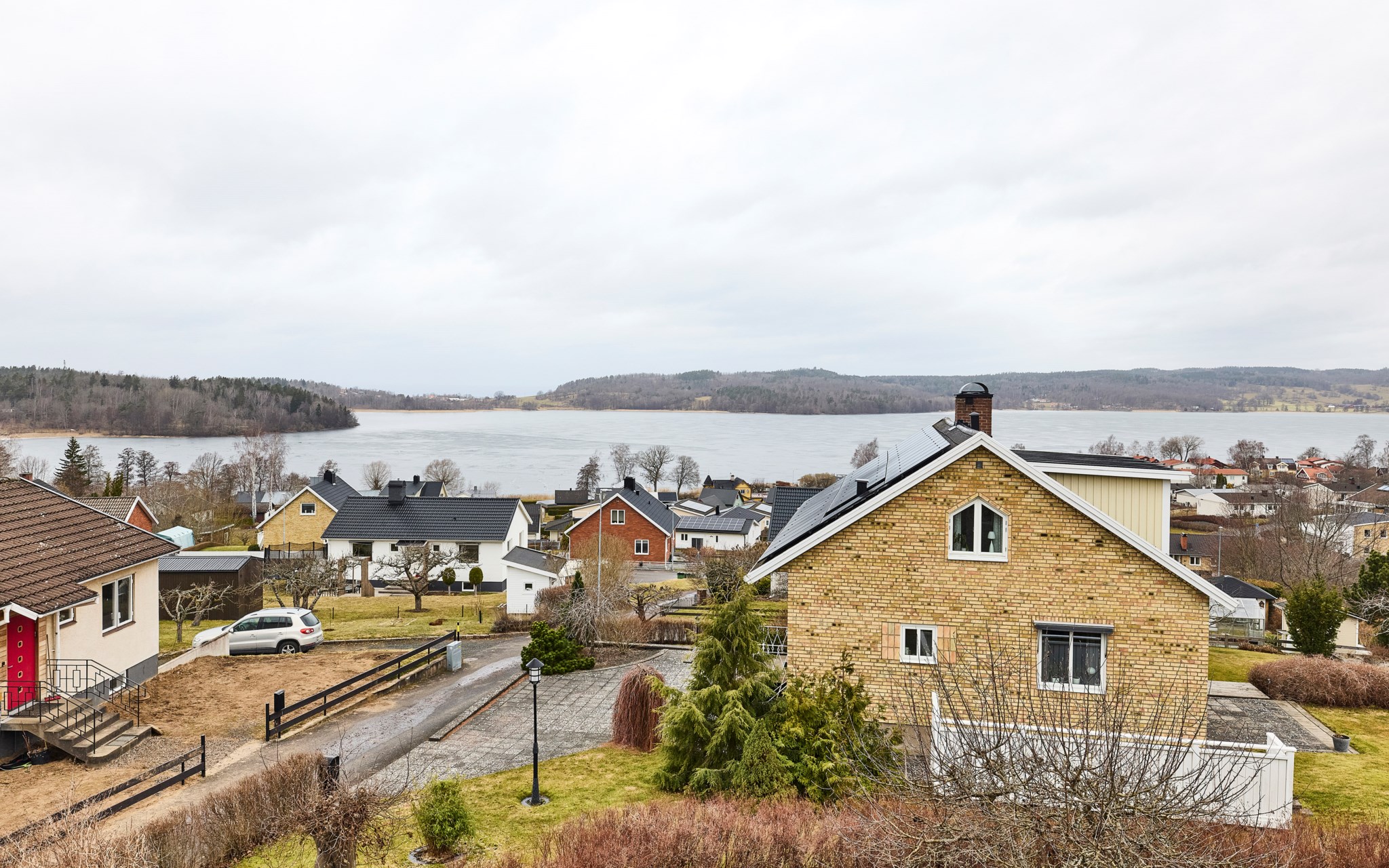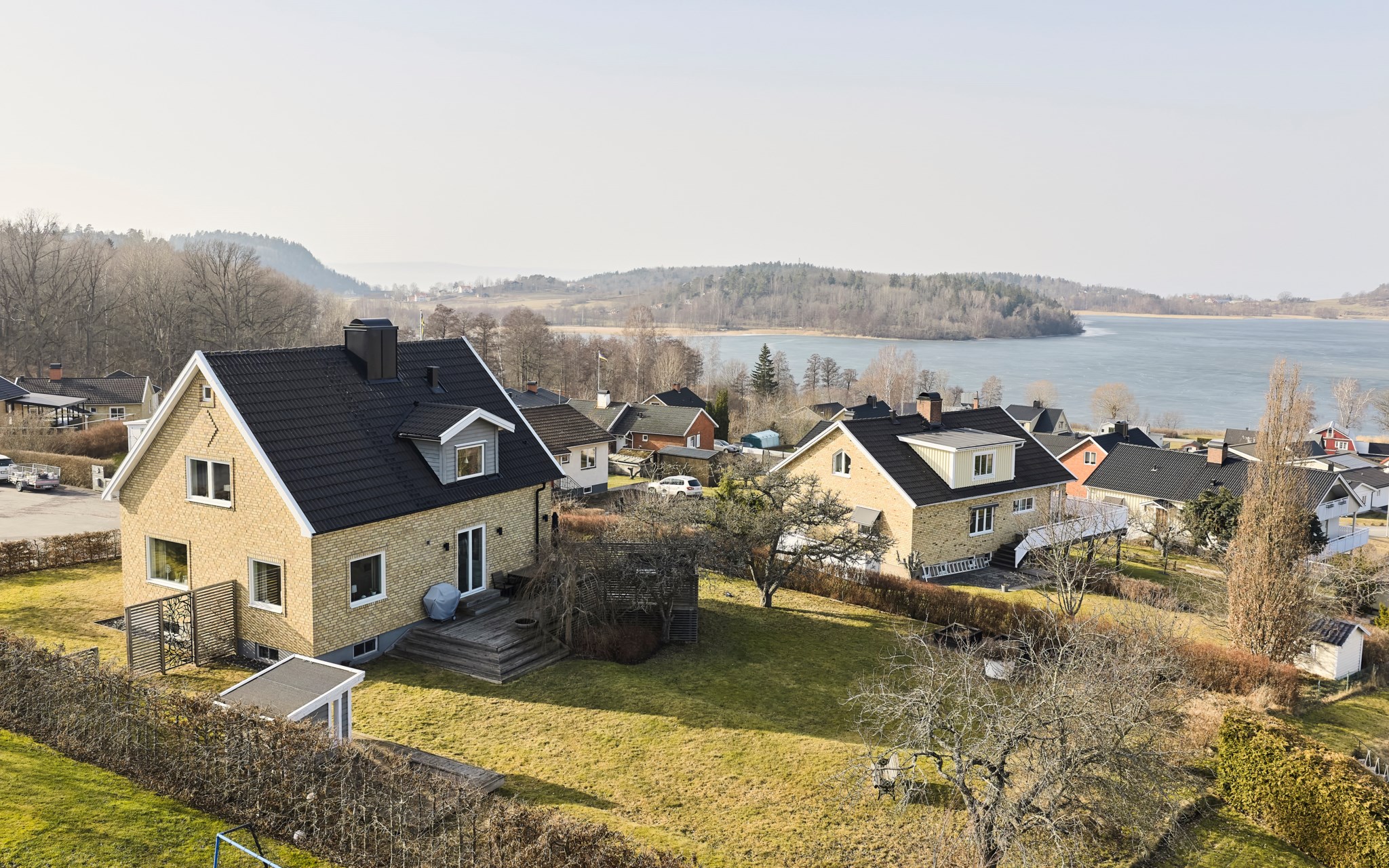 Tomten är som en stor högplatå med fin utsikt redan på gräsrotsnivå, och ännu bättre en trappa upp på altanen som är byggd på hörnet av huset för att täcka upp åt alla väderstreck. Alltså både morgon- och kvällssol om du har tur med vädret. Perfekt kalibrering mot utsikten såklart. På övriga tomten hittar du plommon, körsbär och bigarråer, och rätt många äppelträd av olika sort. Mot framsidan dessutom ett spaljé-tuktat päronträd som klättrar på väggen med fint grenverk. Odlingslådorna är redo för nästa trädgårdsmästare. Lekstugan har gått under namnet bushuset i familjen. Den kringbyggda sandlådan saknar en del sand, men kan också bli en stor odlingslåda om du hellre vill. Lavendel och ormhassel är annat som behagar, bokhäcken sköter du tillsammans med grannen. Ni får enas om en lagom höjd och bredd, som är både lättarbetad och ger önskat insynsskydd.