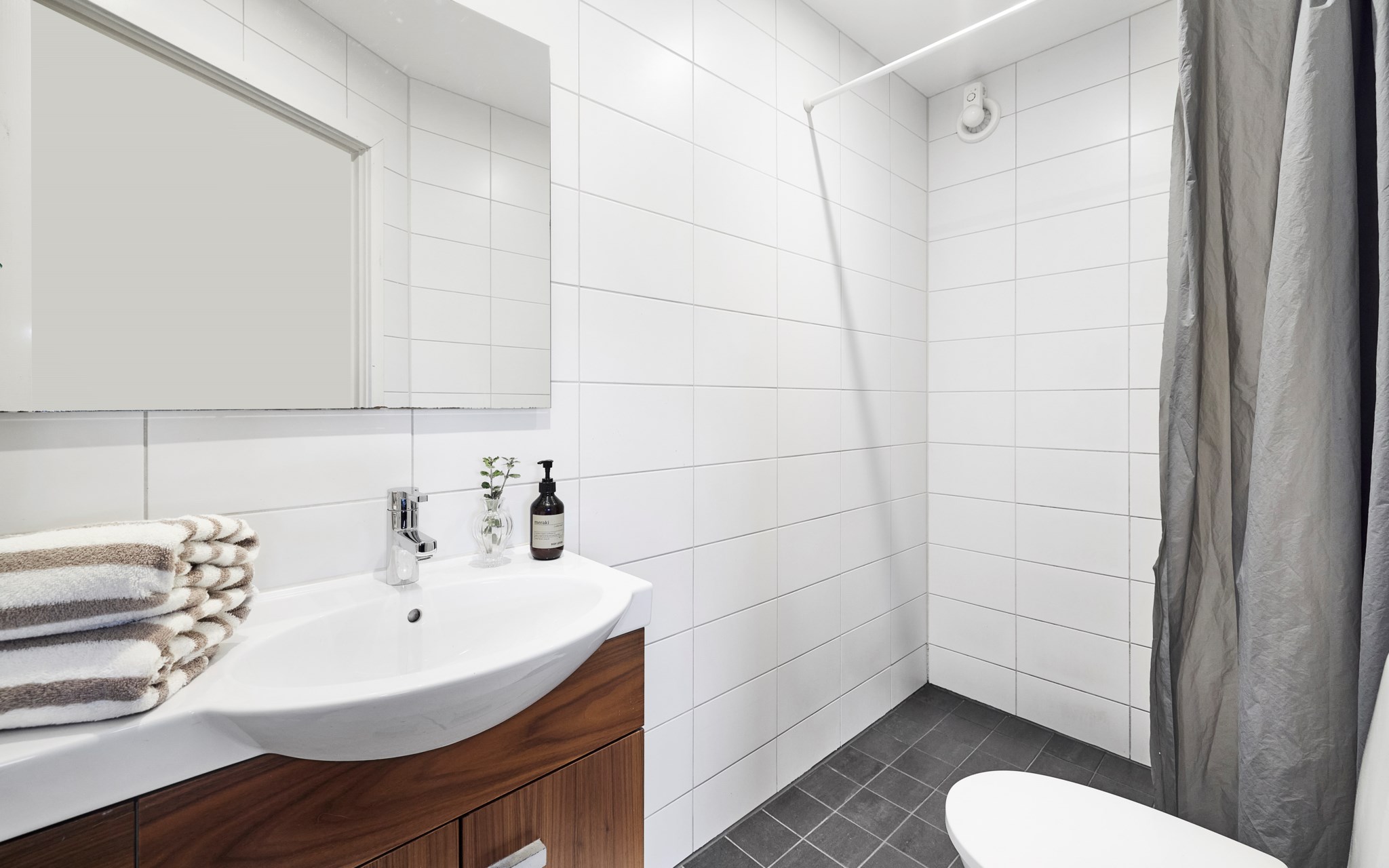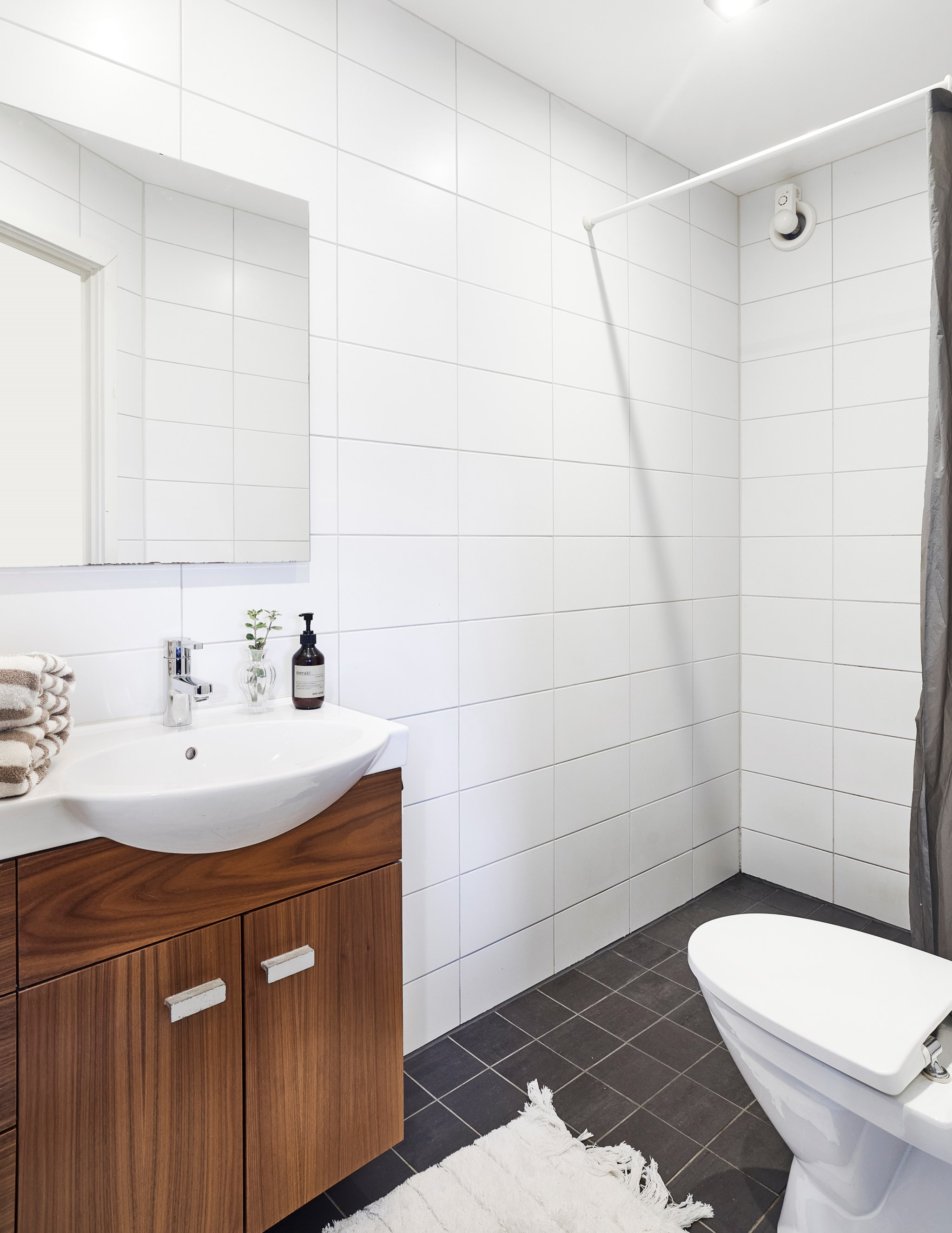 Bakom den snedställda dörren i hallen nere hittar du husets renoverade badrum. Helkaklat med vattenburen golvvärme under klinkergolvet och duschhörna. Samma tidlösa, neutrala och behärskade stil även här precis så som övriga huset renoverats av nuvarande ägare. Husets andra badrum ligger en trappa upp och har badkar, vilket brukar uppskattas i barnfamiljen. Detta badrum är nog det enda utrymme som nuvarande ägare inte har renoverat, det var gjort av en tidigare ägare nånstans runt år 2000. Mycket funktionellt och fräscht med våtrumsmatta på golvet och dito tapet på väggarna. Plaska fritt!