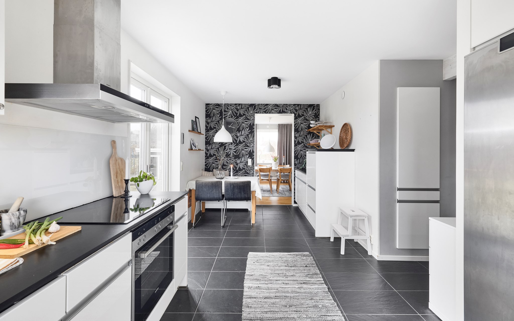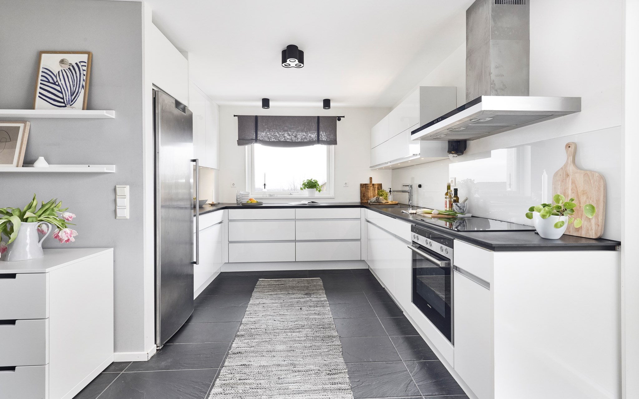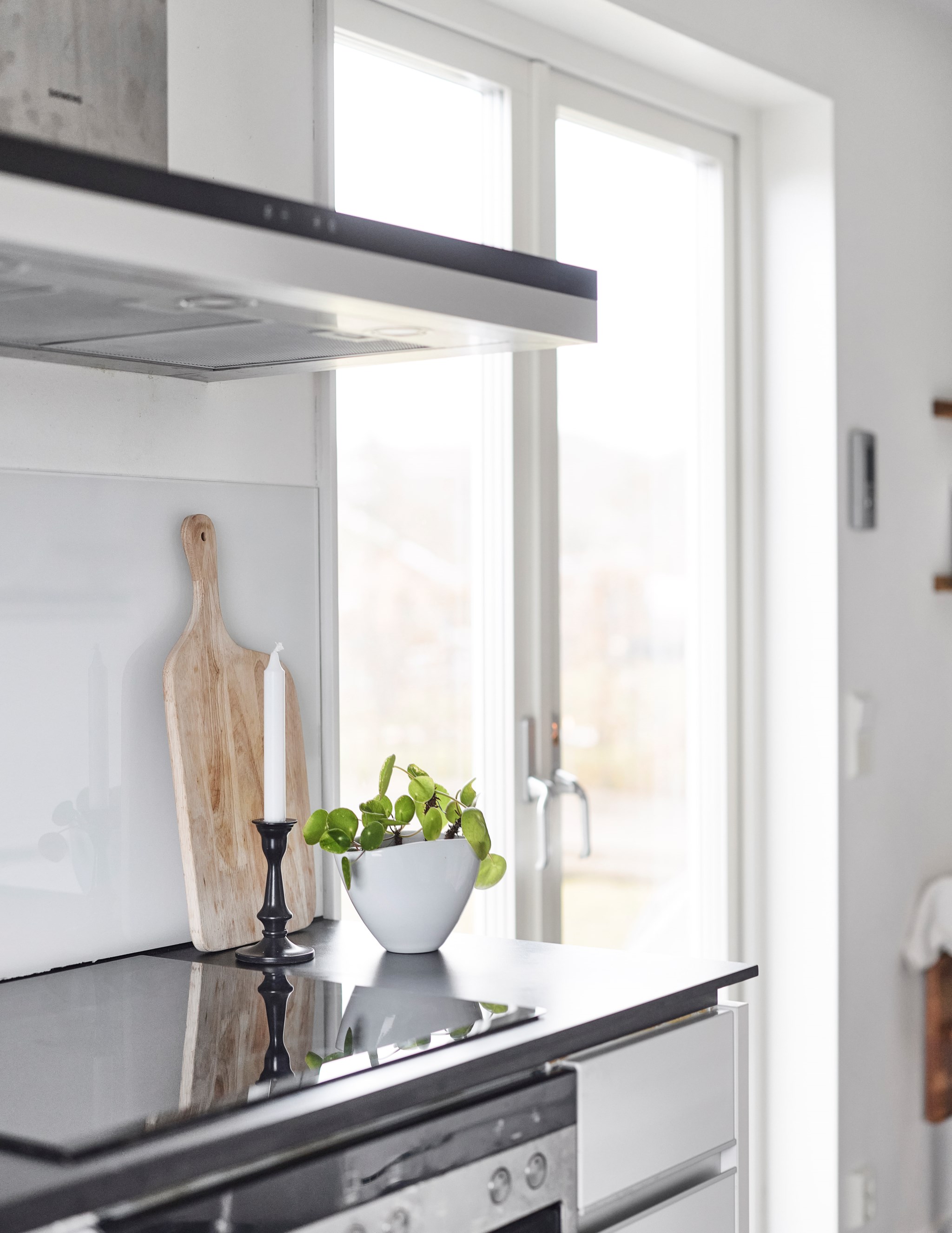 En bra hall är husets bästa kompis, och din. Otroligt skönt med extra svängrum och plats för drivor av jackor, skor och väskor som det lätt blir i en aktiv familj på väg hit och dit i livet. En blöt vante eller yllesocka som blir liggande torkar av golvvärmen. Och leriga skor inget problem, hallklinkern fortsätter hela vägen in i köket om någon får fart ända dit, och golvvärmen följer med. Redan här i hallen anar du ambitionen i renoveringen – nya fönster, ny ytterdörr, nya innerdörrar och nya lister och foder. Överallt enhetliga material och lösningar – allt hänger ihop.