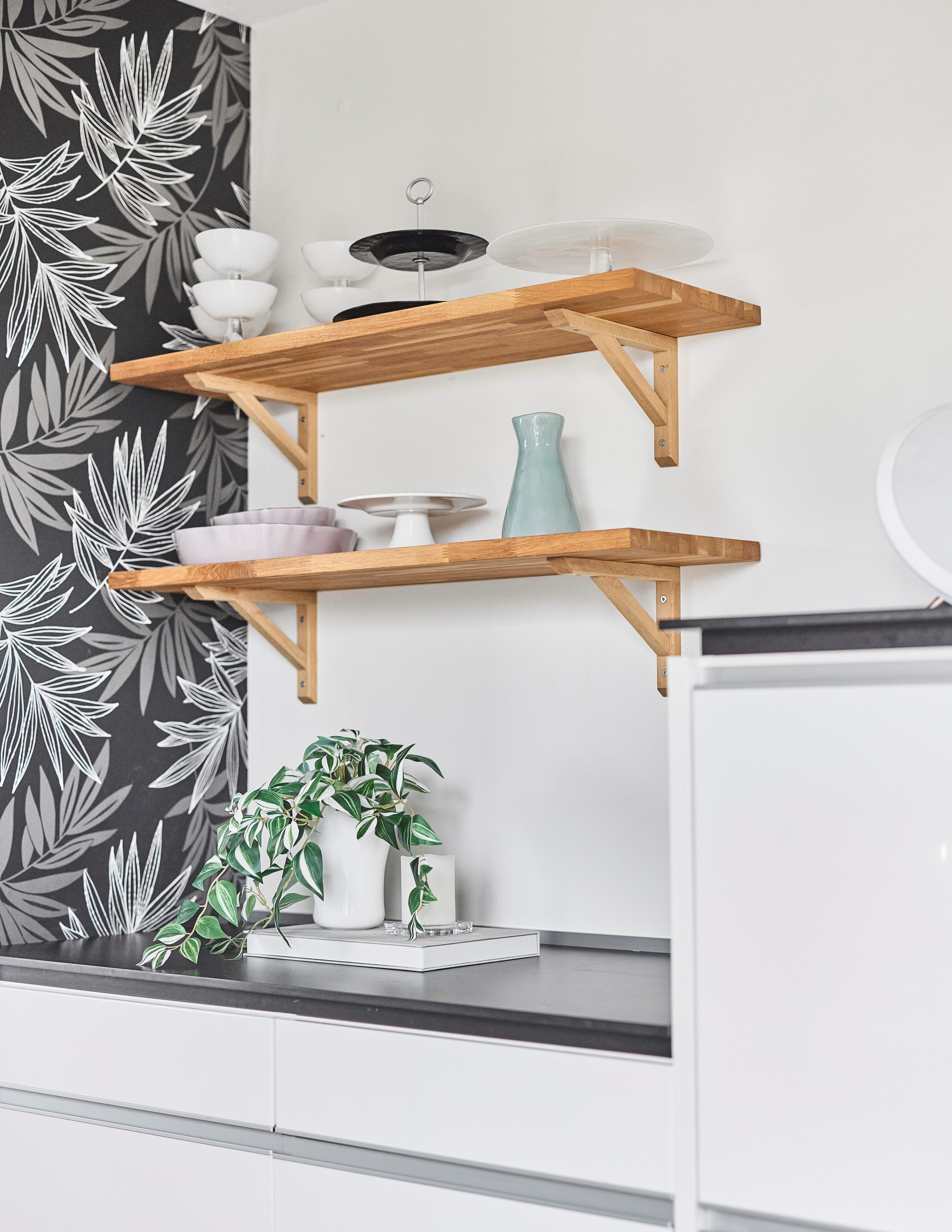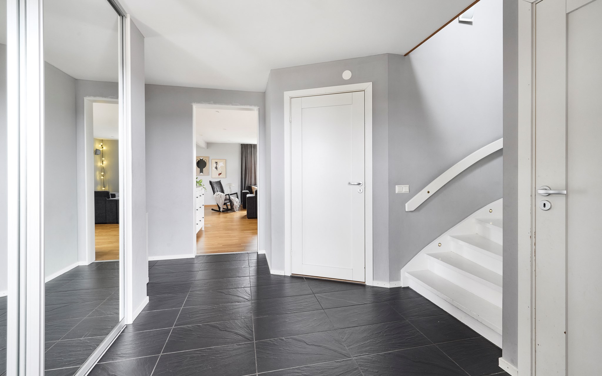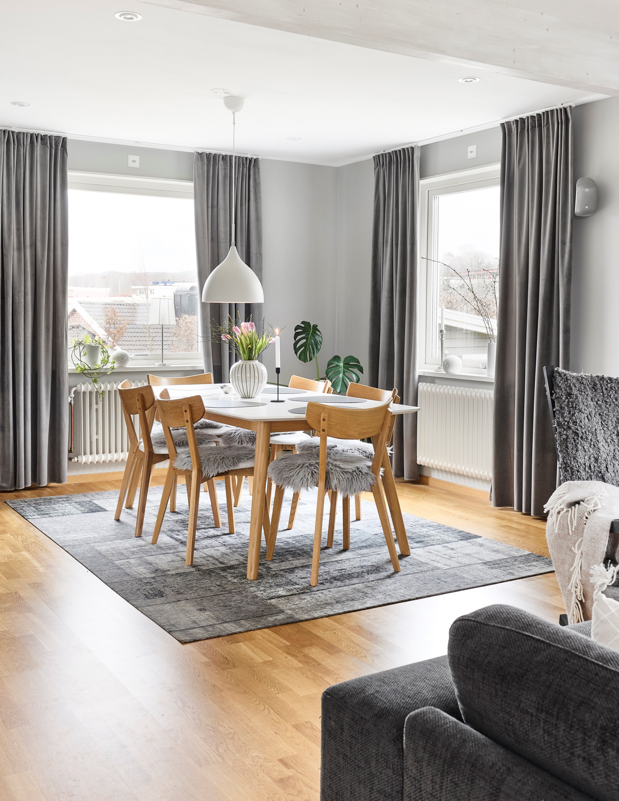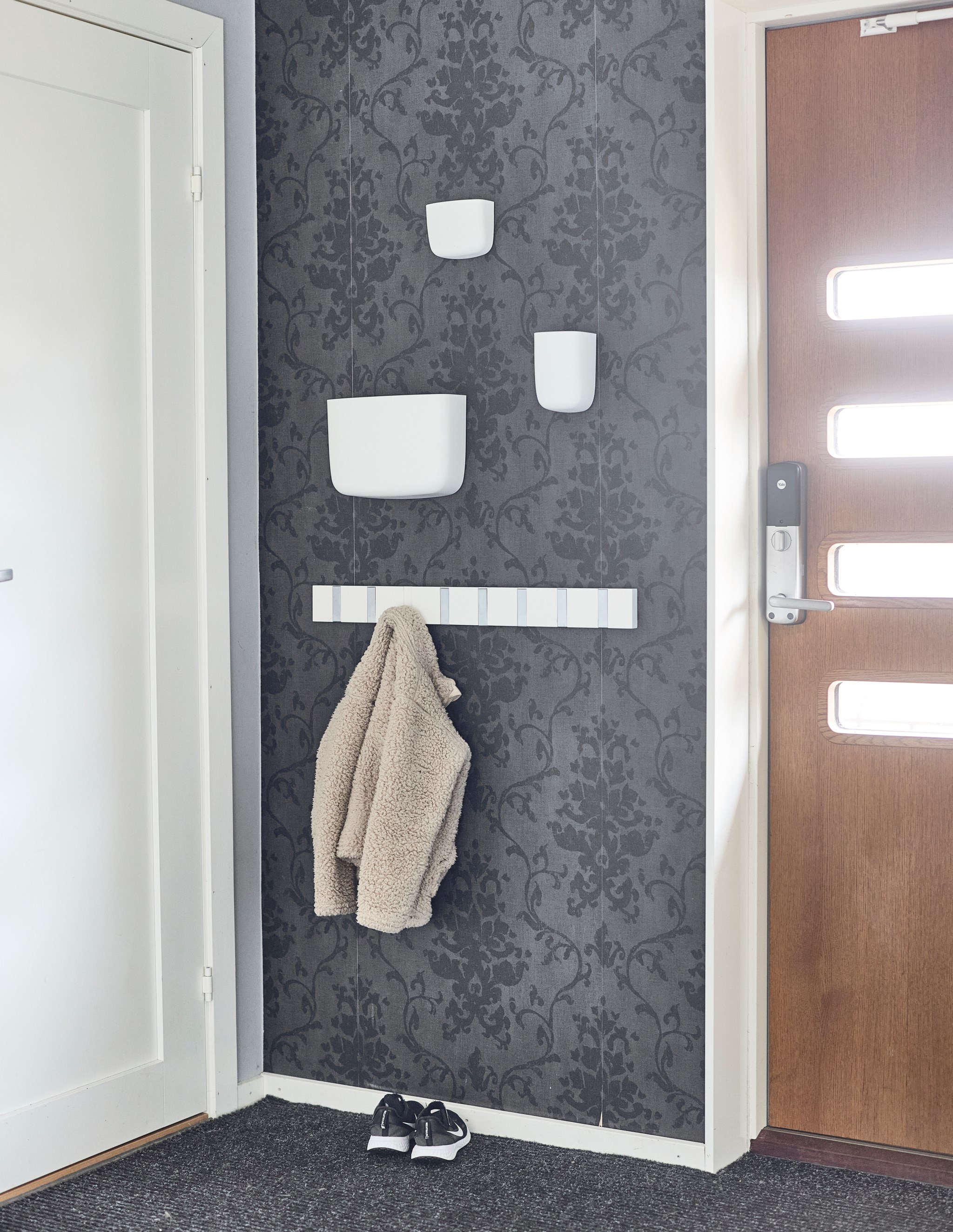 En bra hall är husets bästa kompis, och din. Otroligt skönt med extra svängrum och plats för drivor av jackor, skor och väskor som det lätt blir i en aktiv familj på väg hit och dit i livet. En blöt vante eller yllesocka som blir liggande torkar av golvvärmen. Och leriga skor inget problem, hallklinkern fortsätter hela vägen in i köket om någon får fart ända dit, och golvvärmen följer med. Redan här i hallen anar du ambitionen i renoveringen – nya fönster, ny ytterdörr, nya innerdörrar och nya lister och foder. Överallt enhetliga material och lösningar – allt hänger ihop.