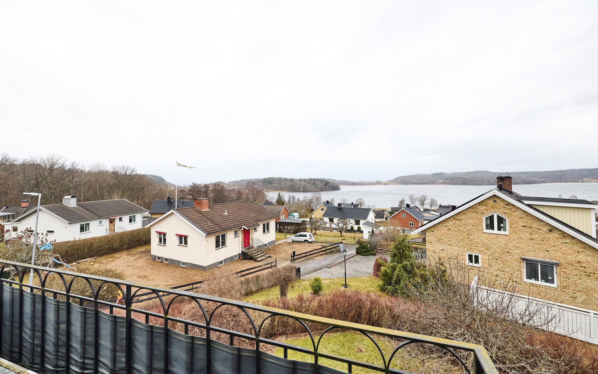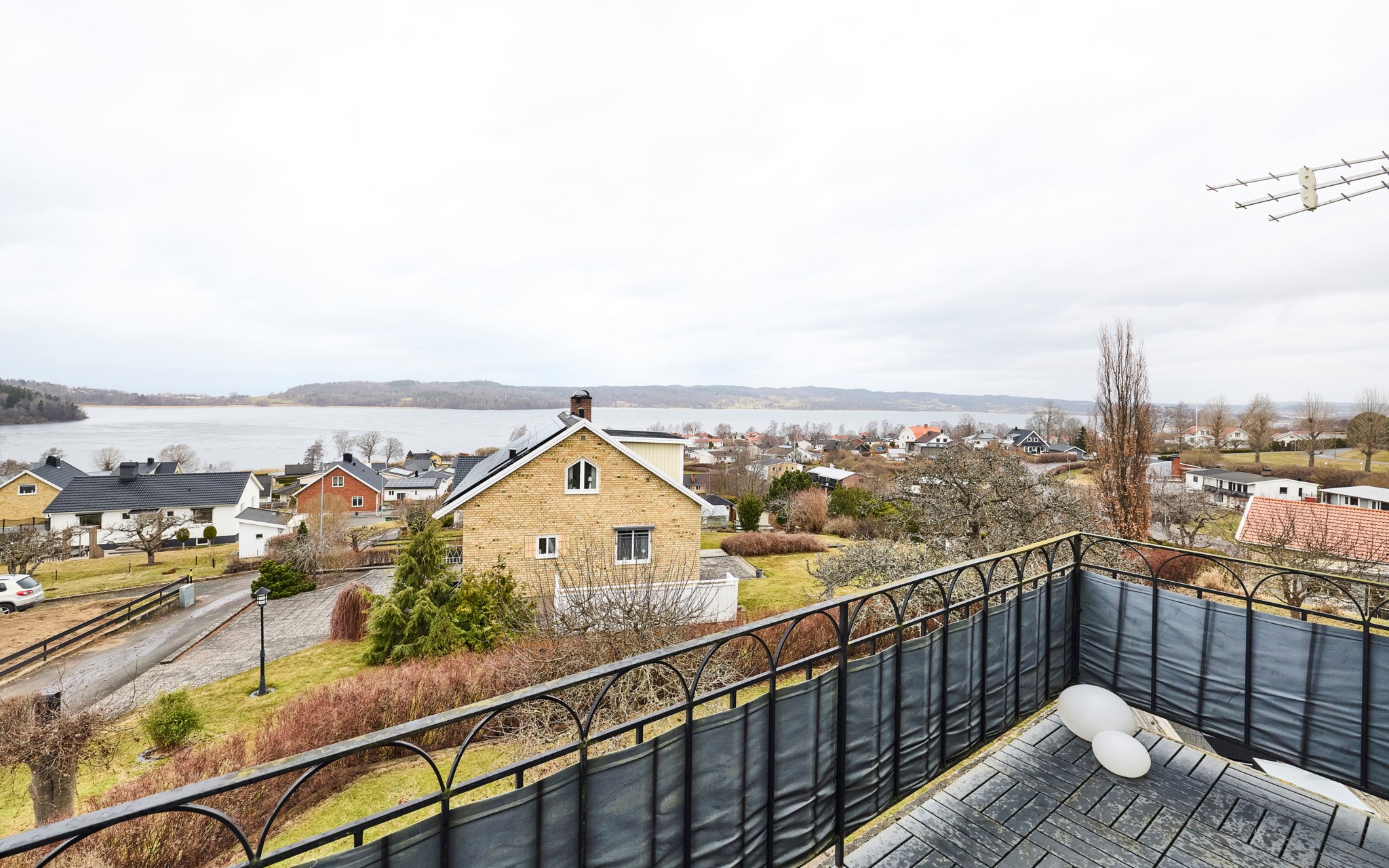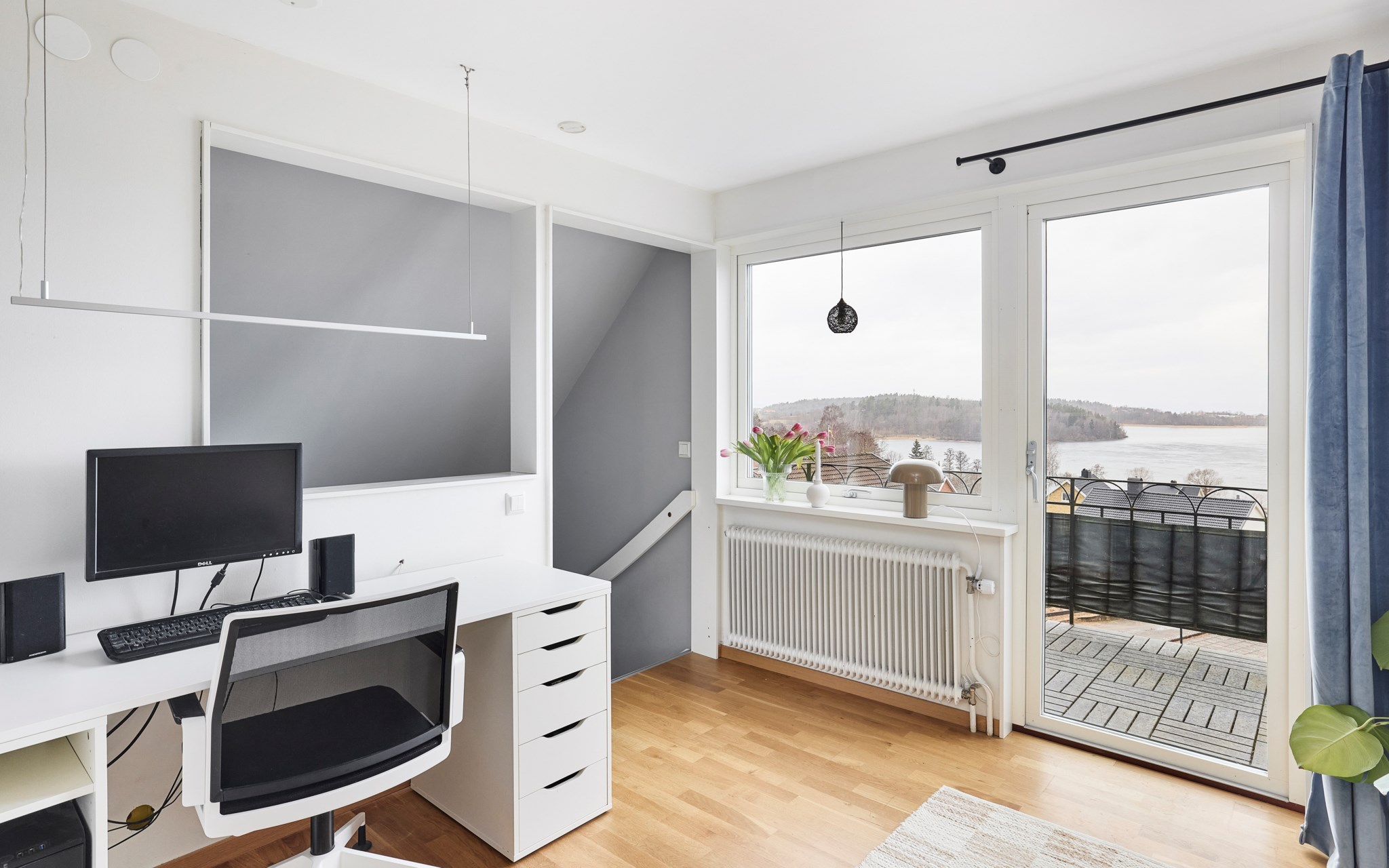 En trappa upp och utsikten höjer sig ett snäpp ytterligare. Hallen möblerbar på lite olika sätt, som arbetsplats och hemmakontor är det svårslaget, just för det magiska ljuset som dörr och fönster villigt släpper in. Väderstrecken här i Kaxholmen kan vara lite luriga när man inte är van, men husets gavel med stora balkongen vetter ganska mycket mer åt norr än man först anar. Det innebär storslagna himlar rätt ut här i sommartid, då solen sänker sig ner över två sjöar. Fint att balkongen fått behålla sitt tidstypiska 50-talsräcke här uppe och så även nere vid entrén.