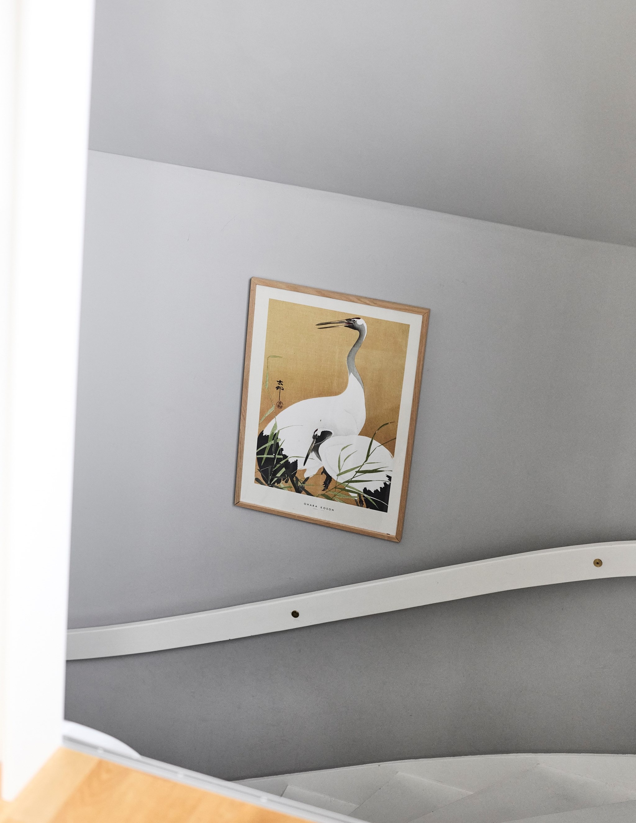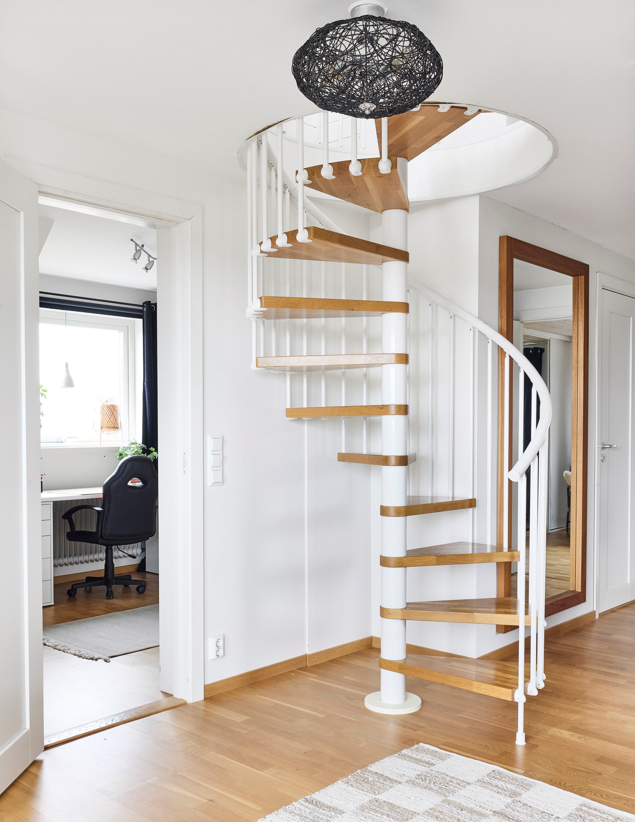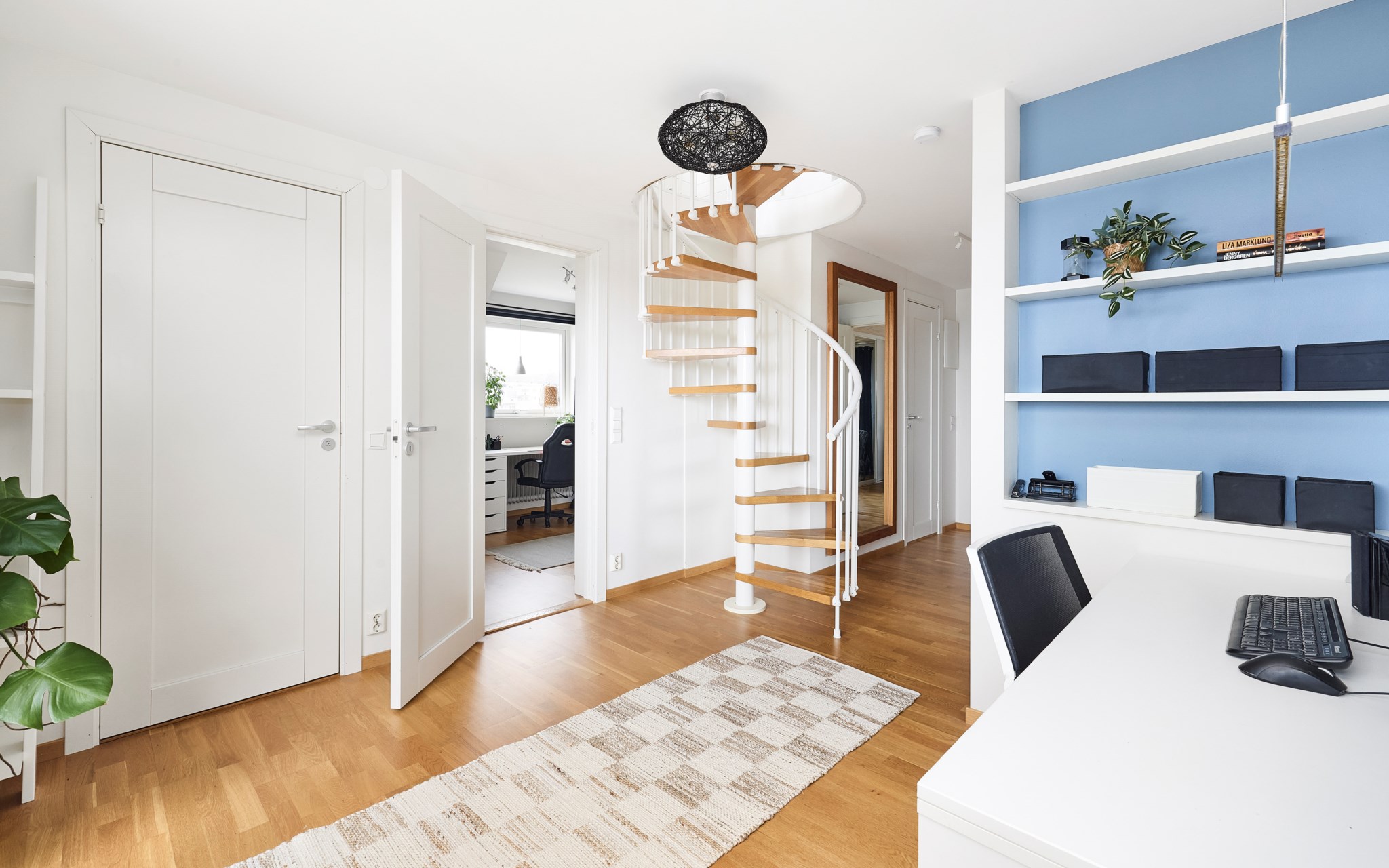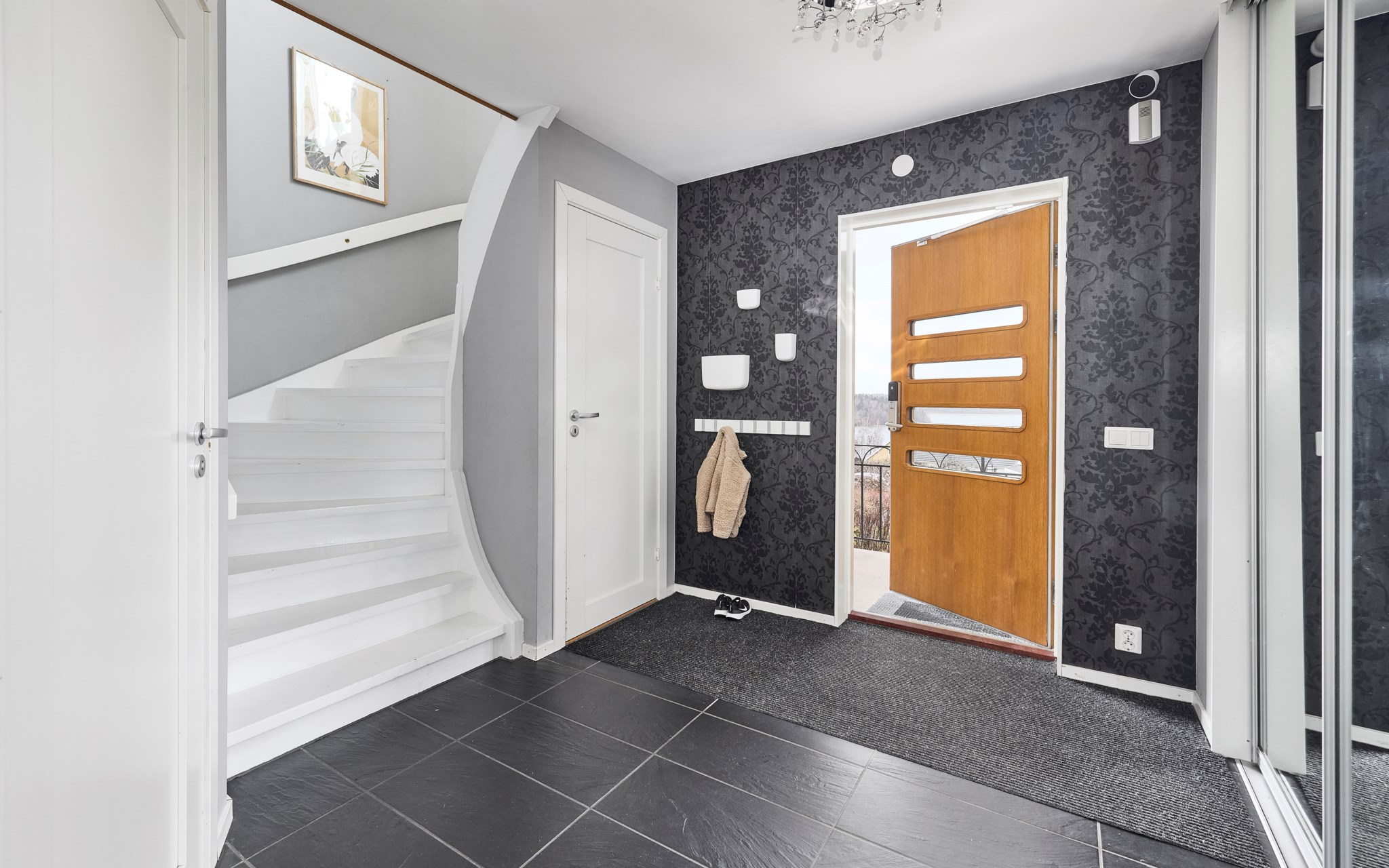 En trappa upp och utsikten höjer sig ett snäpp ytterligare. Hallen möblerbar på lite olika sätt, som arbetsplats och hemmakontor är det svårslaget, just för det magiska ljuset som dörr och fönster villigt släpper in. Väderstrecken här i Kaxholmen kan vara lite luriga när man inte är van, men husets gavel med stora balkongen vetter ganska mycket mer åt norr än man först anar. Det innebär storslagna himlar rätt ut här i sommartid, då solen sänker sig ner över två sjöar. Fint att balkongen fått behålla sitt tidstypiska 50-talsräcke här uppe och så även nere vid entrén.