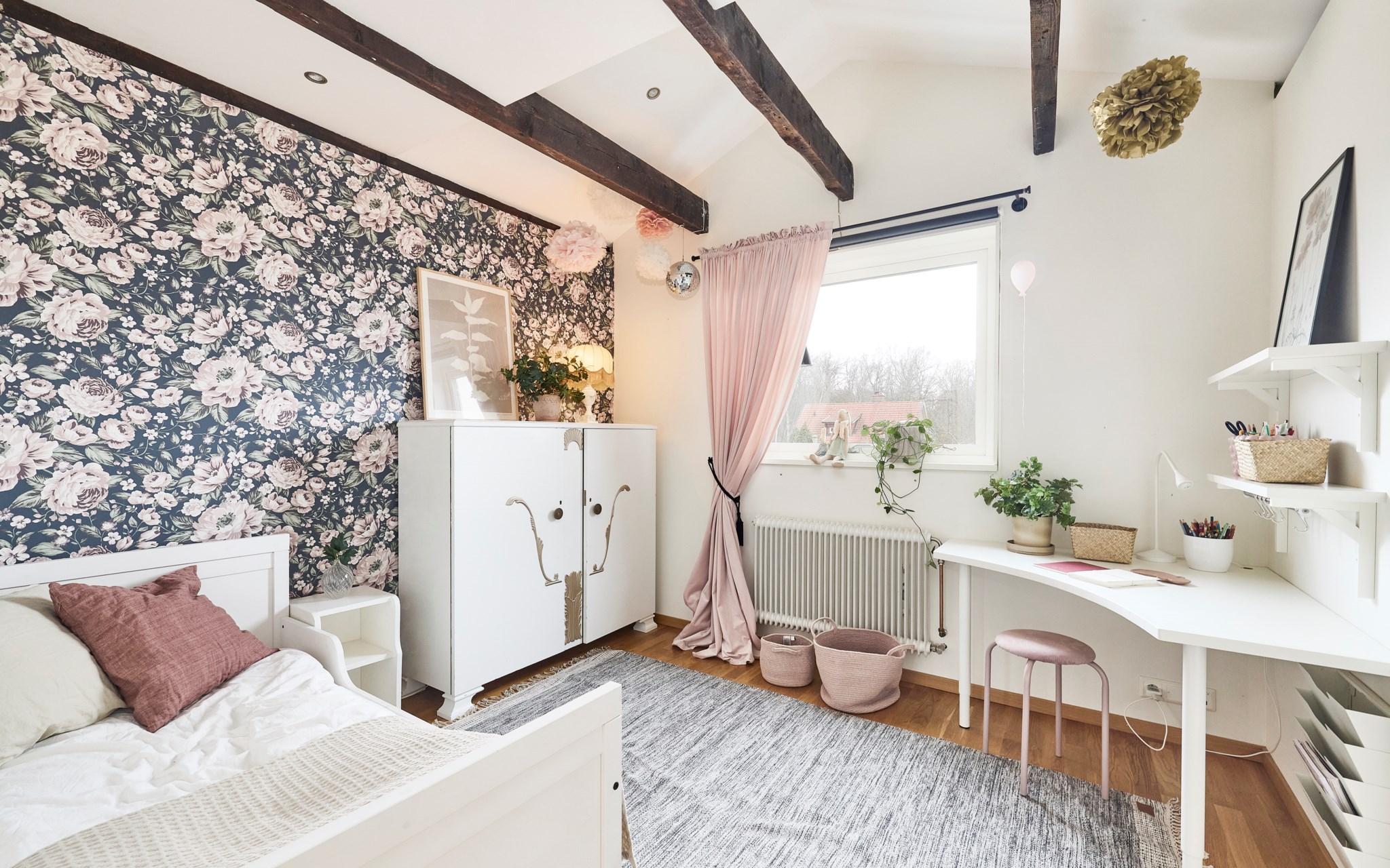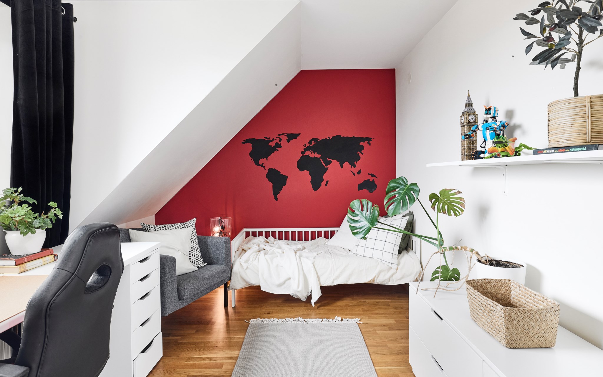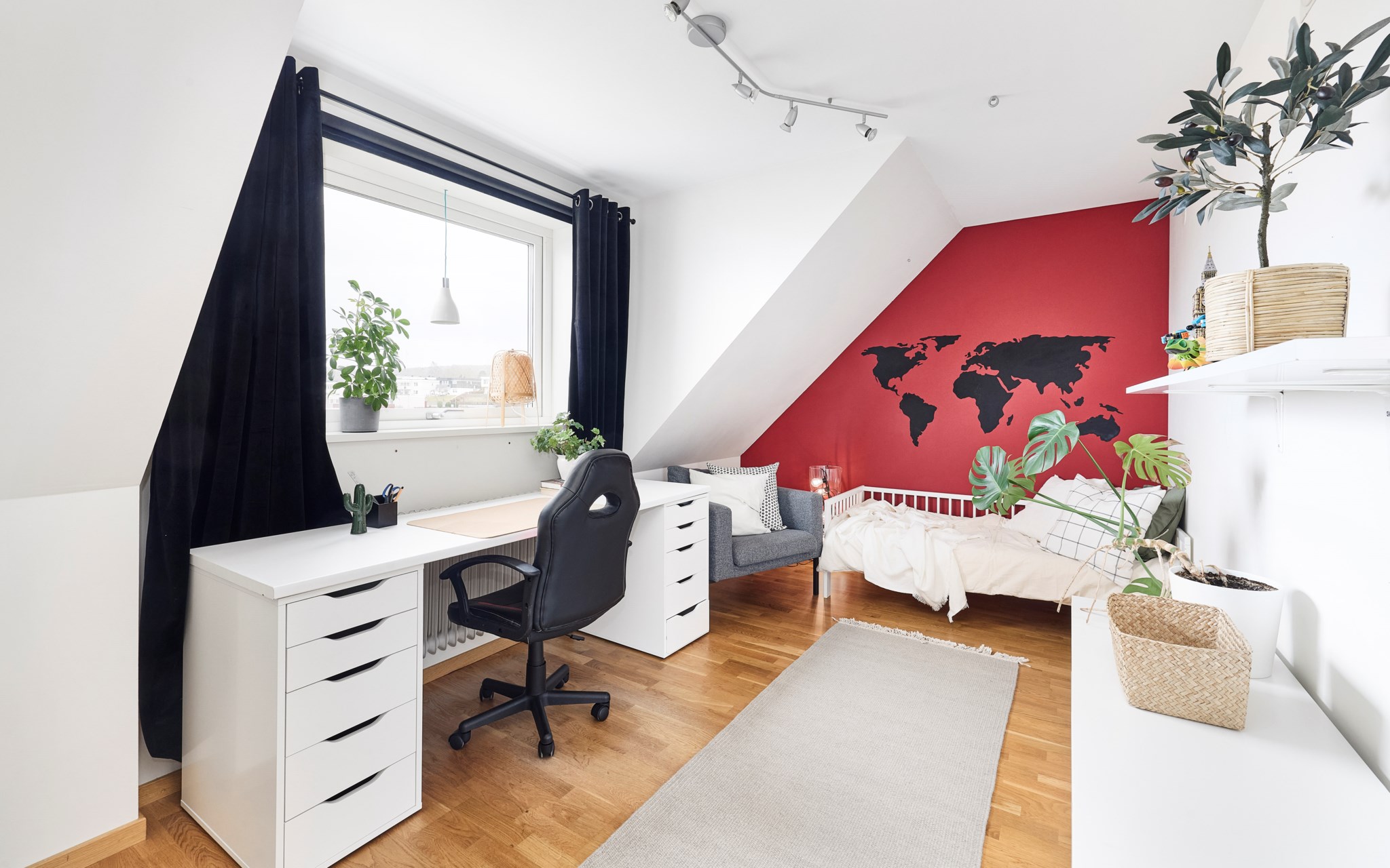 Här har familjen inrett ett riktigt bus- och stökrum där barnen kan leva ut, sprattla, veva och fäktas – med bollar, klubbor och racketar. Mjuk matta på golvet som lindrar fall och kullerbyttor. Putsade betongväggar borde klara alla tänkbara hyss och företag, det skulle vara om fönstren behöver skyddas ytterligare om det blir hockeymatch med riktig puck. Detta rum skulle ju också kunna fungera som gästrum eller tonårsrum om du inredde lite mer ombonat.