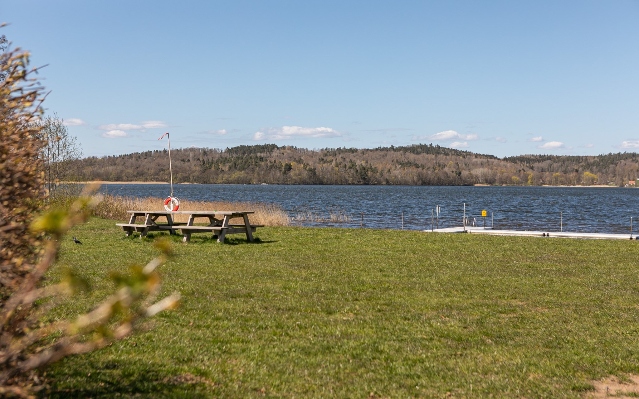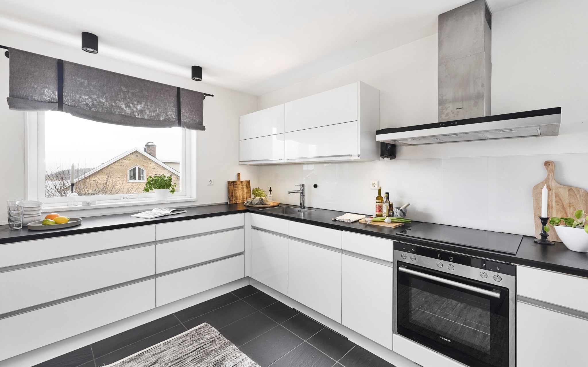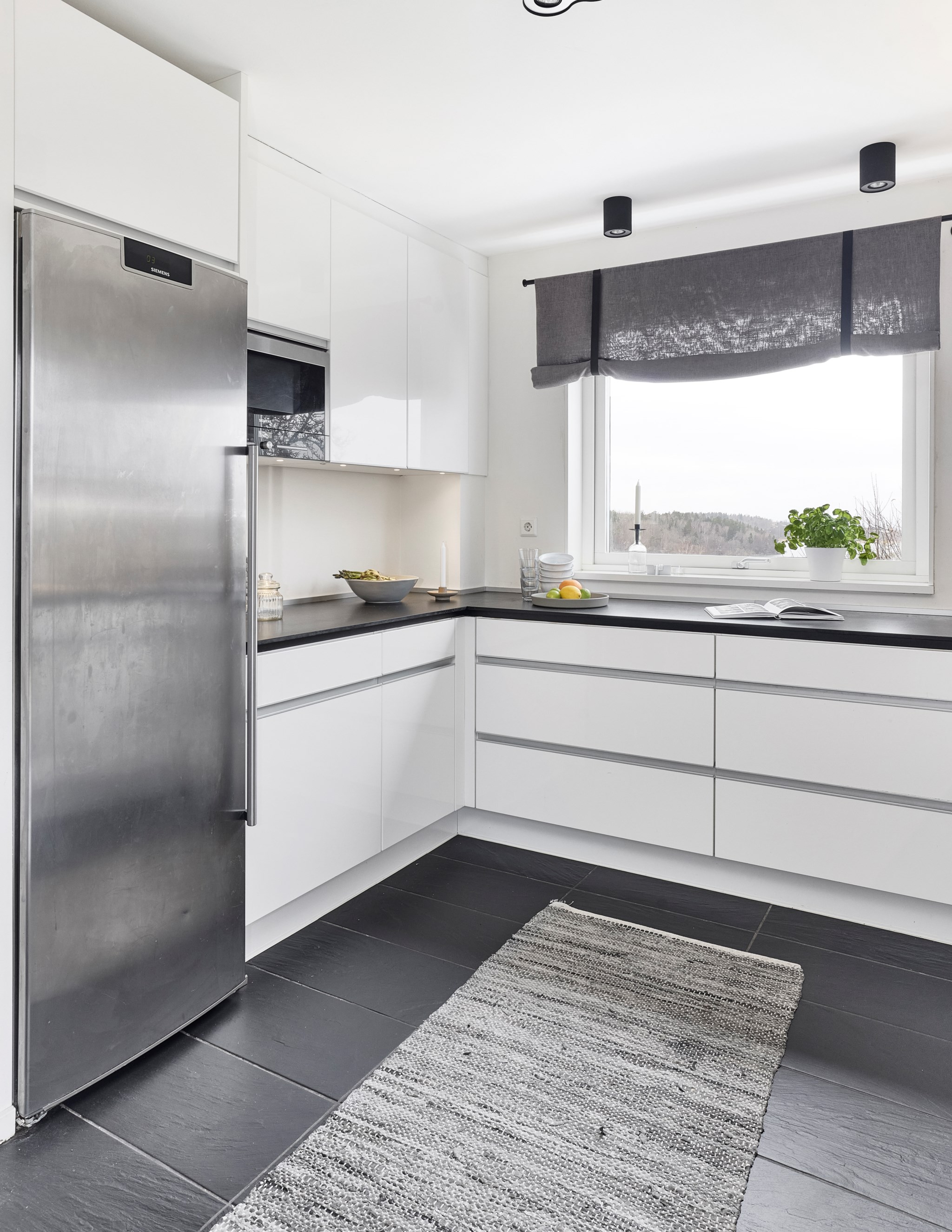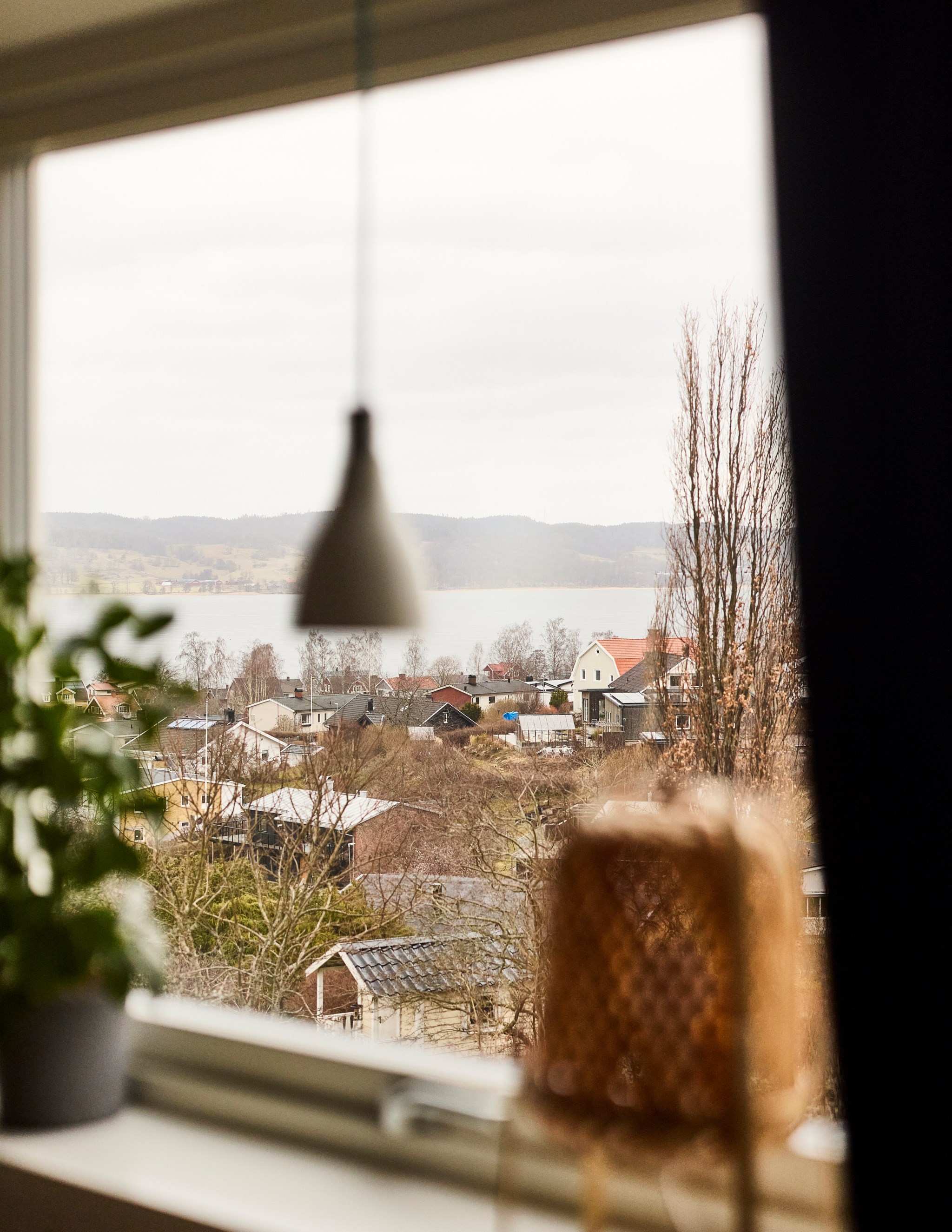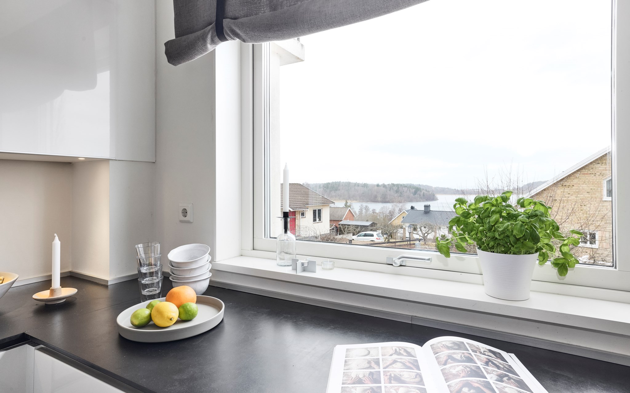 Följ bara klinkern och det ljumma golvet från hallen så hamnar du snart in i ett kök som bjussar stort på förvaring och arbetsytor i en vid U-form. Grafiskt knivskarpt i svart, vitt och rostfritt. Men det är utsikten som gör detta till ett kök långt över standard. Du får svårt att slita ögonen från den sagolika vyn över Landsjön, kullarna och Vättern. Du kommer inse att om några månader kommer kvällssolen pricksäkert skicka sina eldfängda strålar rätt in i köket. Lätt att missa att det även finns ett väl dolt frysskåp bakom den upphöjda modulen och att vardagsbordet har plats för fyra.