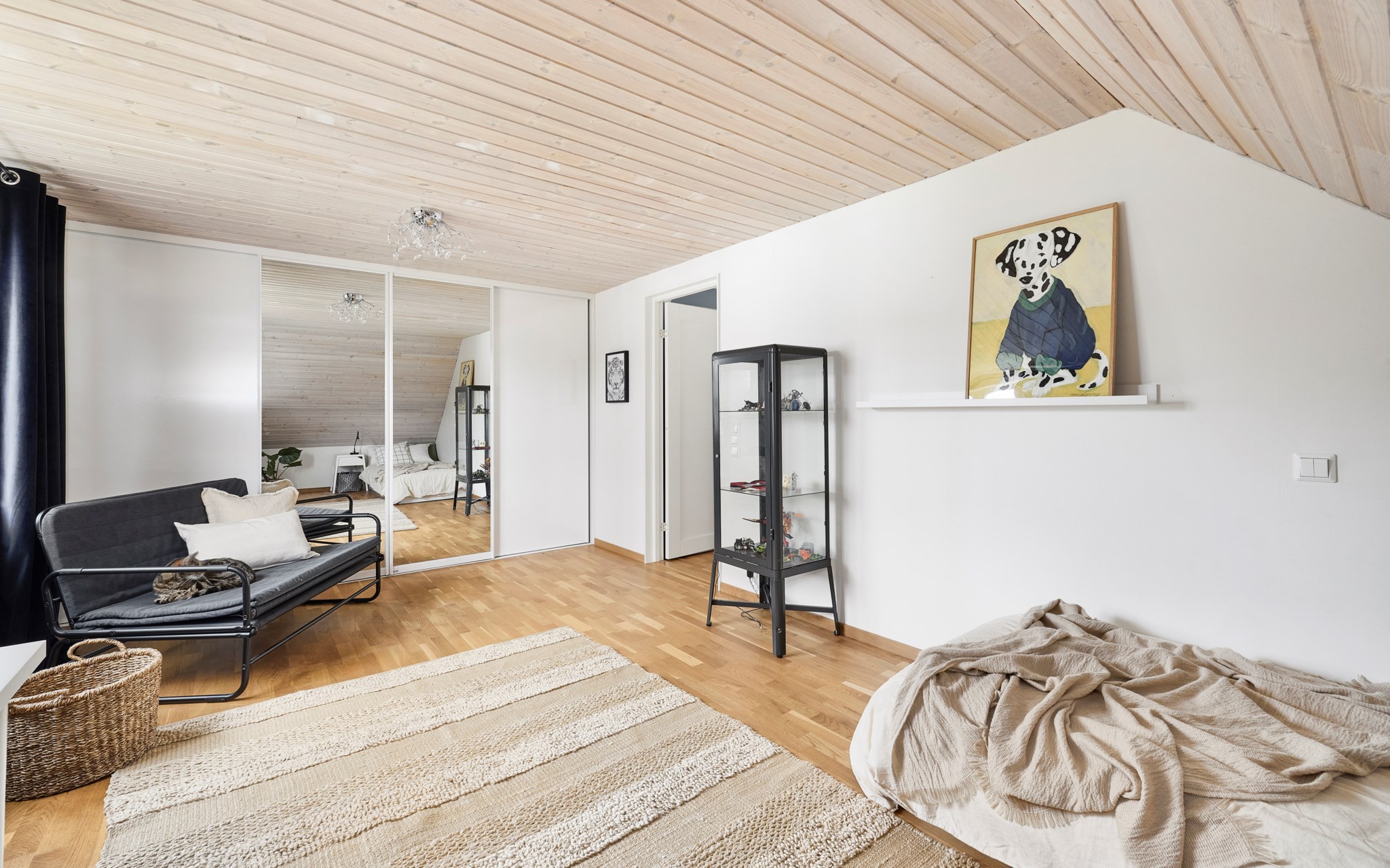 En trappa upp hittar du alltså tre sovrum, två som ligger i varsin takkupa med kattvindarna tillgängliga som förvaring och koja. Det ena något större än det andra så att en dubbelsäng även får plats. Det mindre rummet är helt öppet upp i takkupans nock, och har en walk-in-closet i miniformat dessutom. Master bedroom är mästerligt stort och fyller hela husets gavel mot sydost. Massor med förvaring i skjutdörrsgarderoben, och tar du ett steg in där så inser du att kattvinden öppnar sig bakom dessutom. Detta rum skulle utan problem kunna delas i två om det skulle behövas.