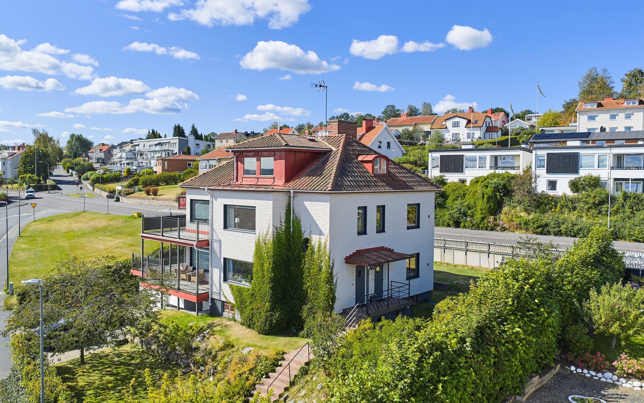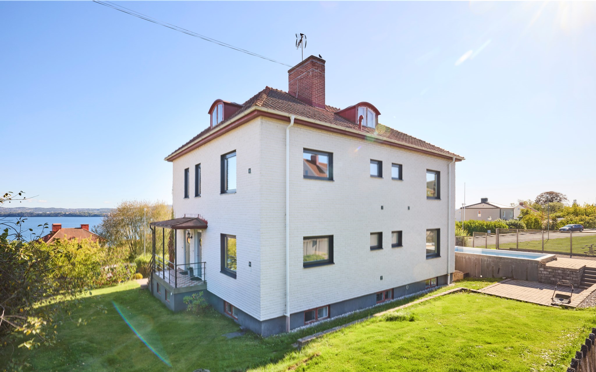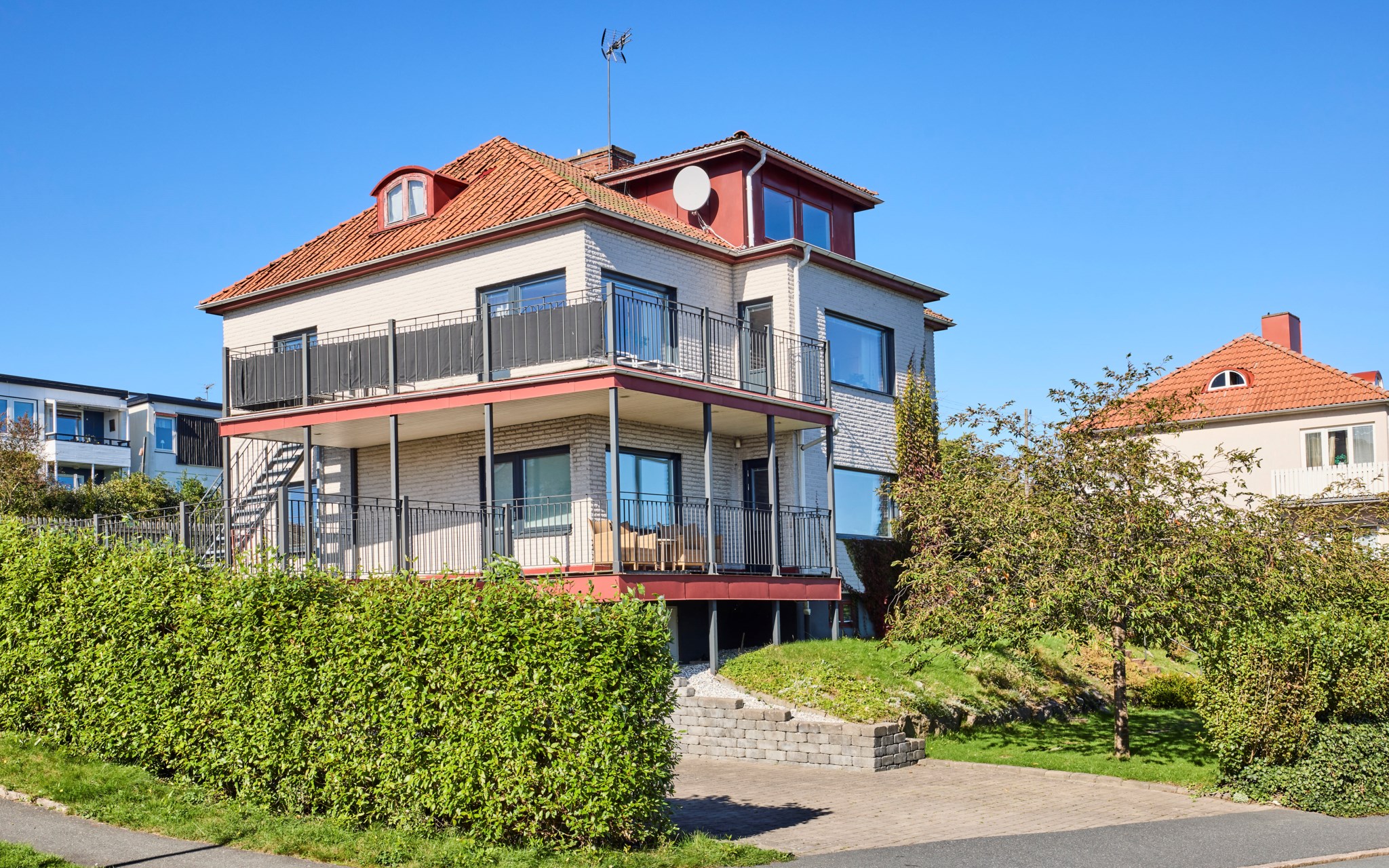 Stort tvåfamiljshus med cirka 110 kvadrat i varje våningsplan. Byggt i totalt fyra våningar, inklusive källare och inredd vind som adderar till boytan. Huset har stomme och bjälklag i trä och fasaden var från början puts, men har någon gång på 60- eller 70-talet fått en teglad fasad som gör det relativt opåverkat av väder och vind. Fönstren bytta till modernt isolerglas så sent som 2022. Dubbelgaraget är ett tacksamt tillbygge som innebär mycket extra biyta till huset, men det öppnade också för större balkonger och en stor altan som dessutom har en pool i förlängningen.
