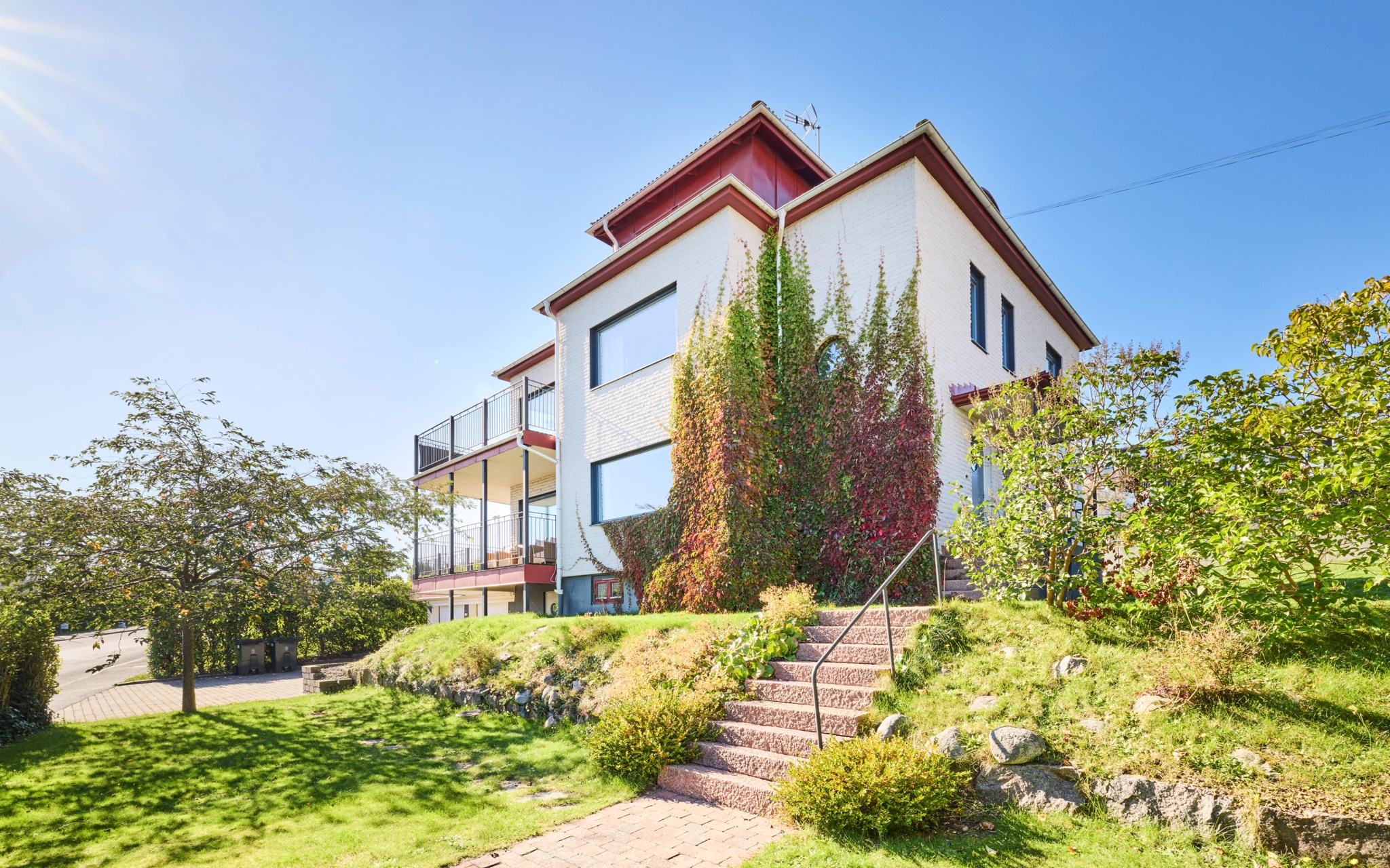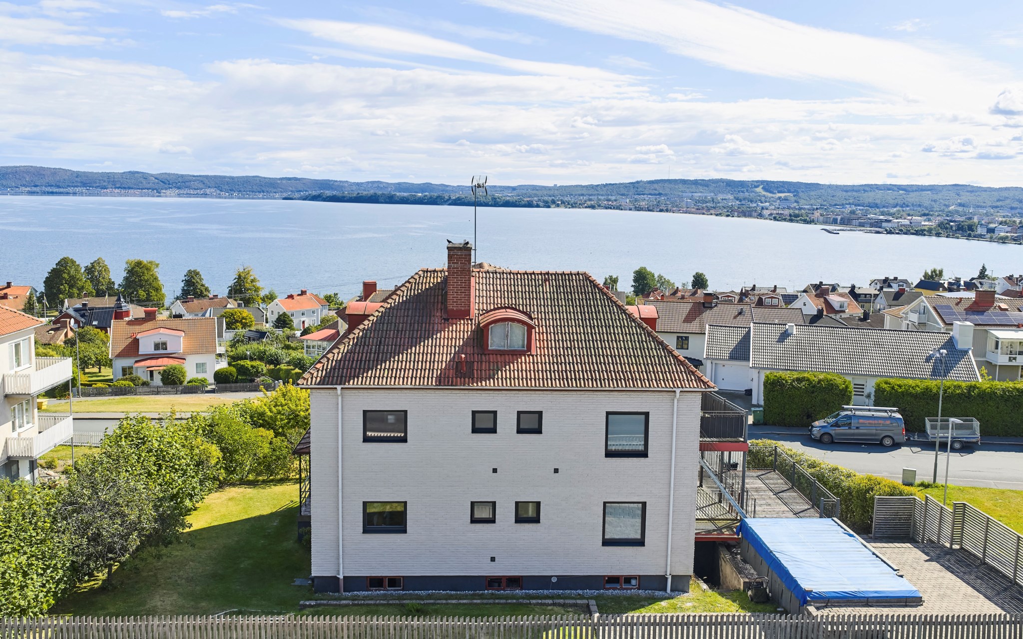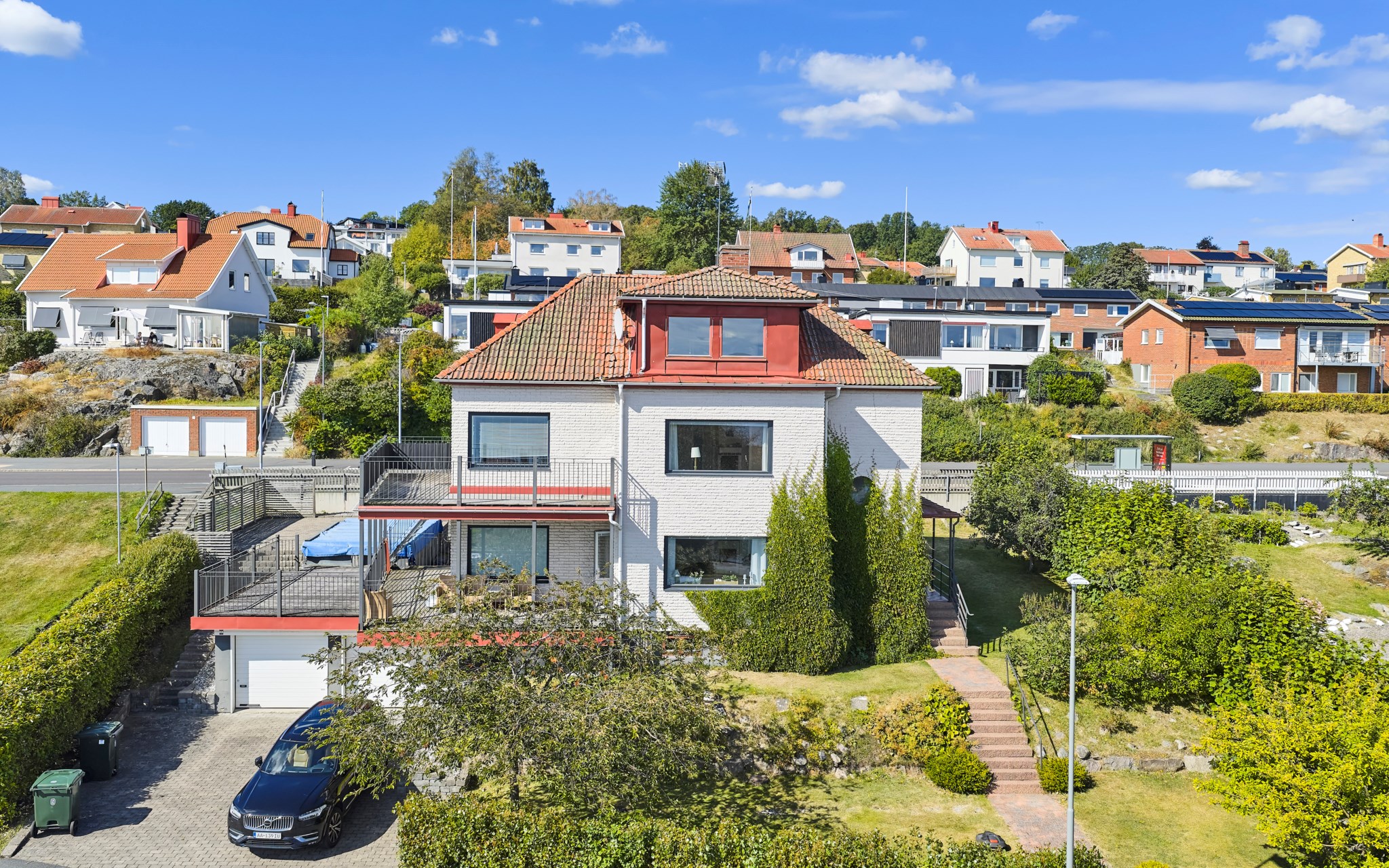 Stort tvåfamiljshus med cirka 110 kvadrat i varje våningsplan. Byggt i totalt fyra våningar, inklusive källare och inredd vind som adderar till boytan. Huset har stomme och bjälklag i trä och fasaden var från början puts, men har någon gång på 60- eller 70-talet fått en teglad fasad som gör det relativt opåverkat av väder och vind. Fönstren bytta till modernt isolerglas så sent som 2022. Dubbelgaraget är ett tacksamt tillbygge som innebär mycket extra biyta till huset, men det öppnade också för större balkonger och en stor altan som dessutom har en pool i förlängningen.