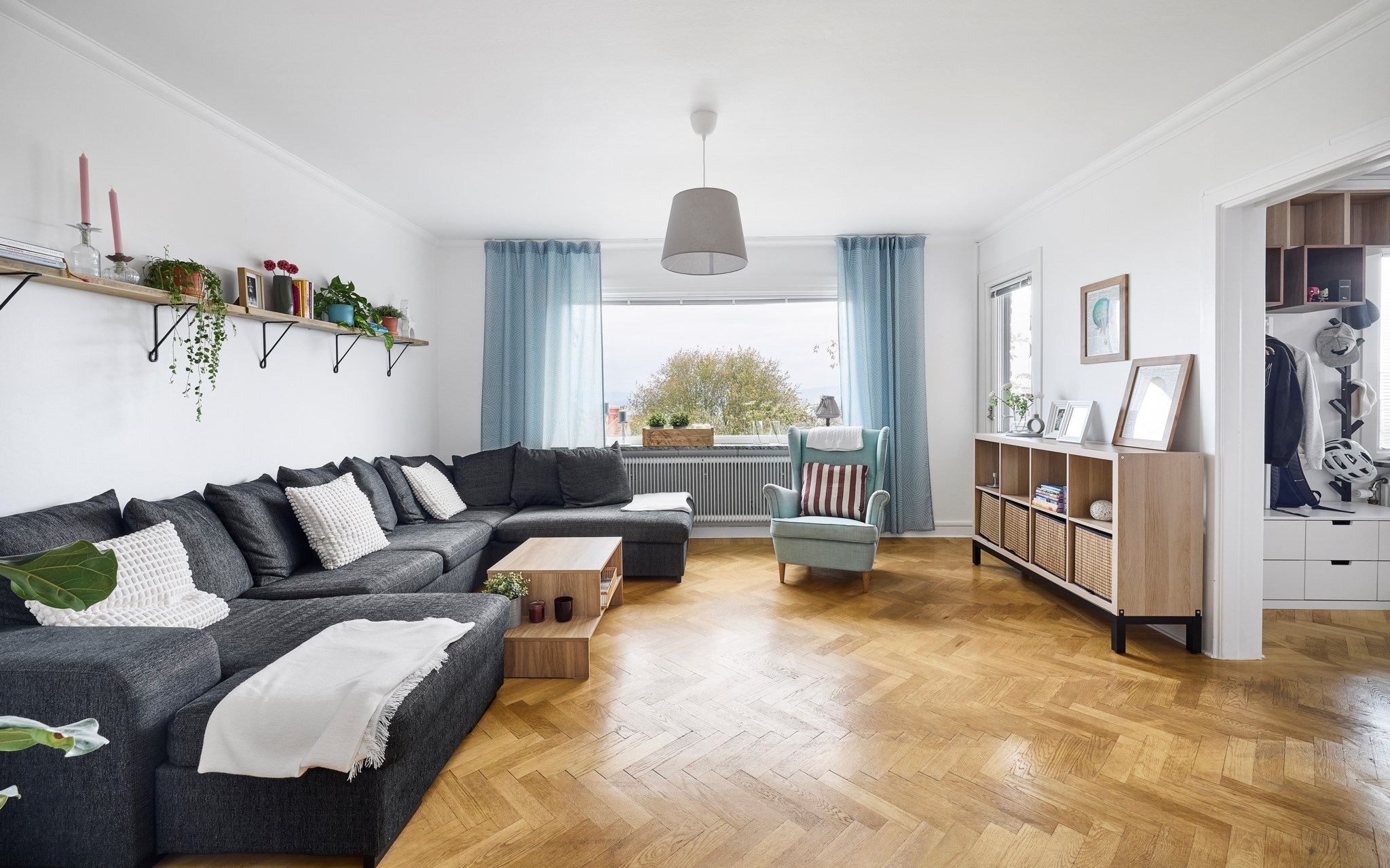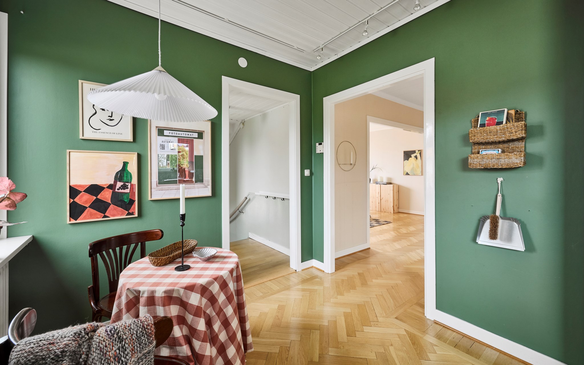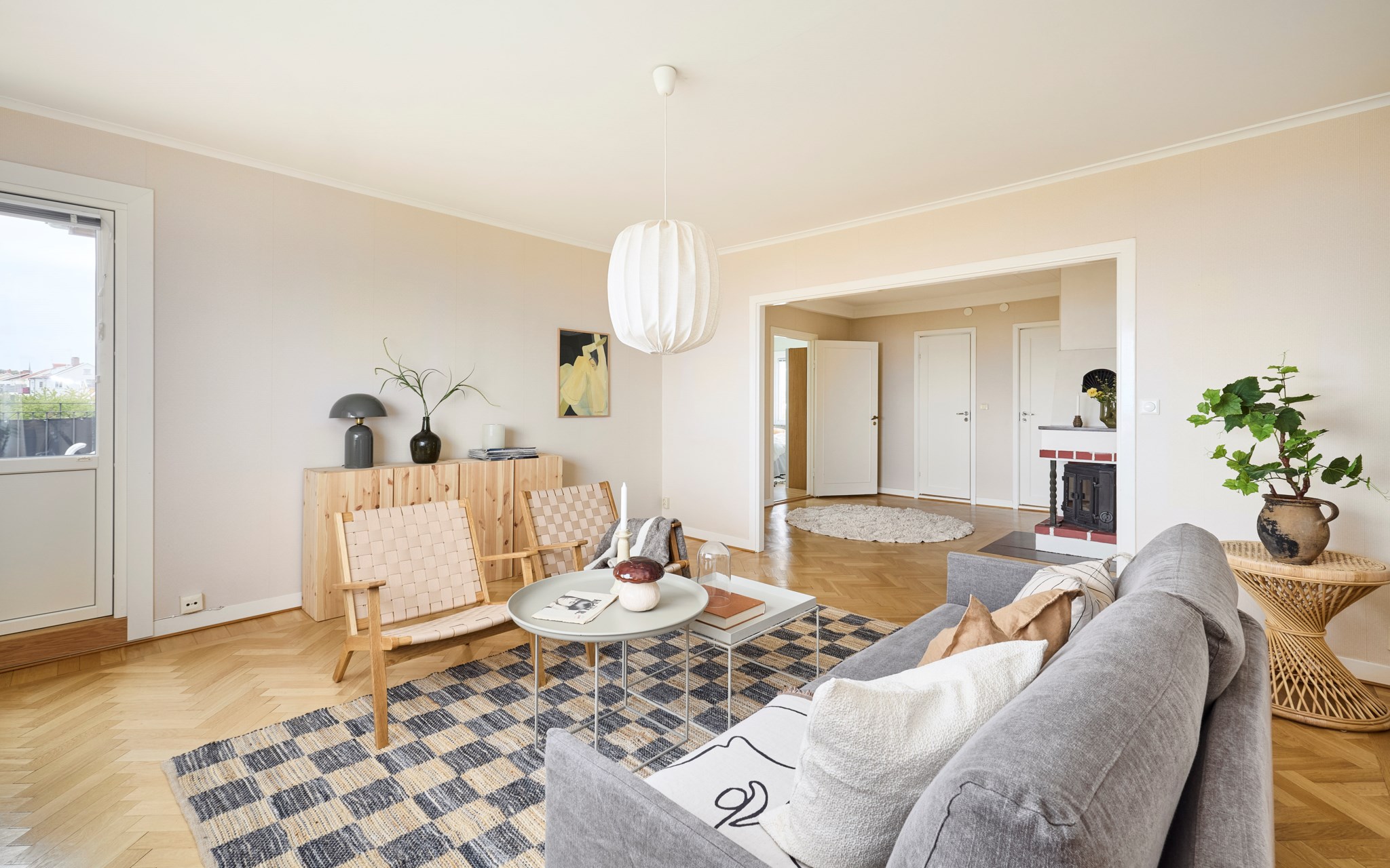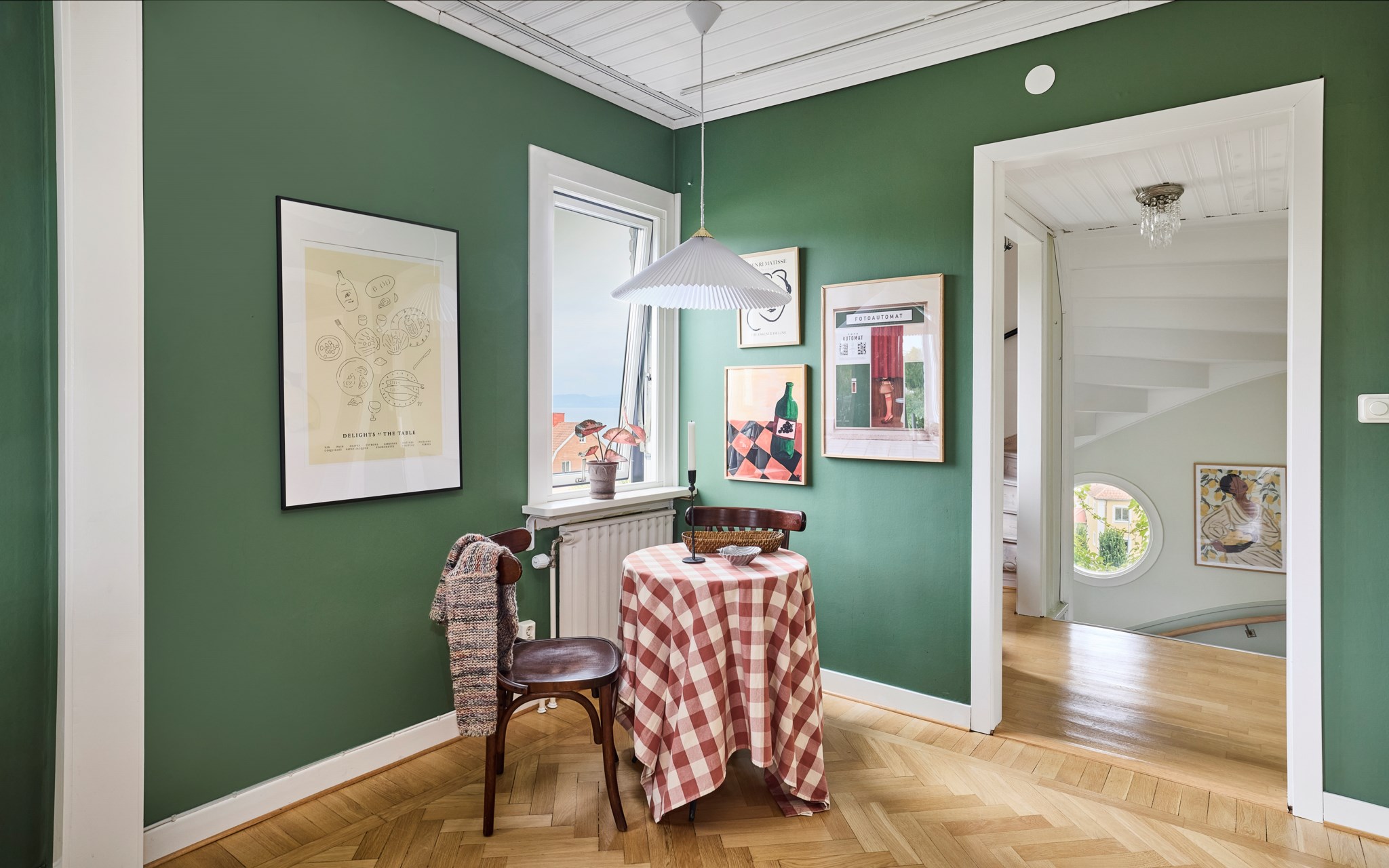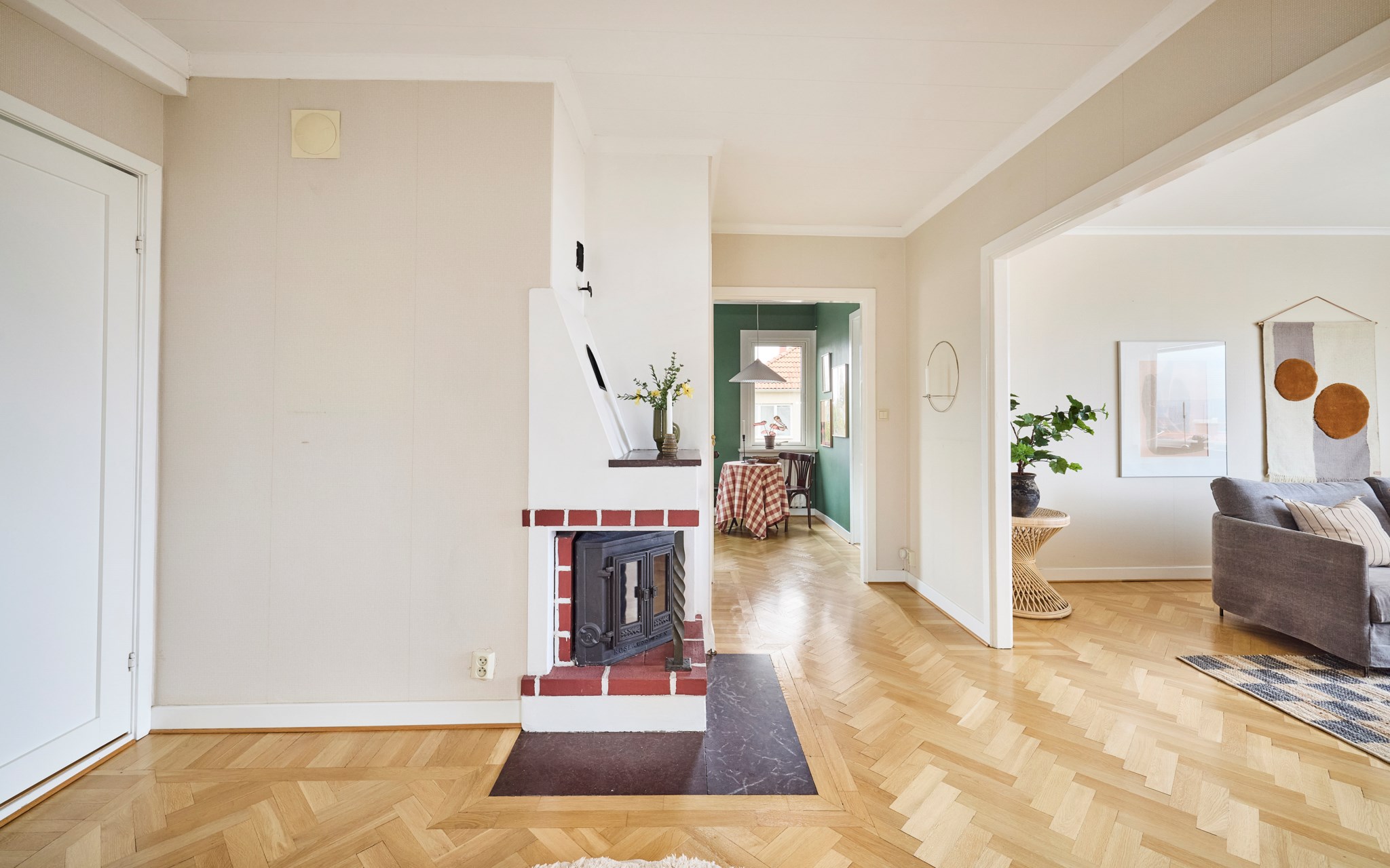 Huset är byggt med ett utskjutande parti mitt på – en fronton – det gör att vardagsrummet blir nästan som ett burspråk. Öppet mot hallen där eldstaden står på hörnet, men ändå ett eget definierat rum. Även från dagens matsal har du eldstaden i sikte, men du sitter ändå i ett eget rum. Fiskbensparketten i bra skick och brer ut sig på stora ytor i båda rummen och i hallen däremellan. Dubbla dörrar ut till balkongen om du vill få full effekt av utsikten. Skulle du vilja nyttja matsalen till sängkammare skulle det så klart gå bra.