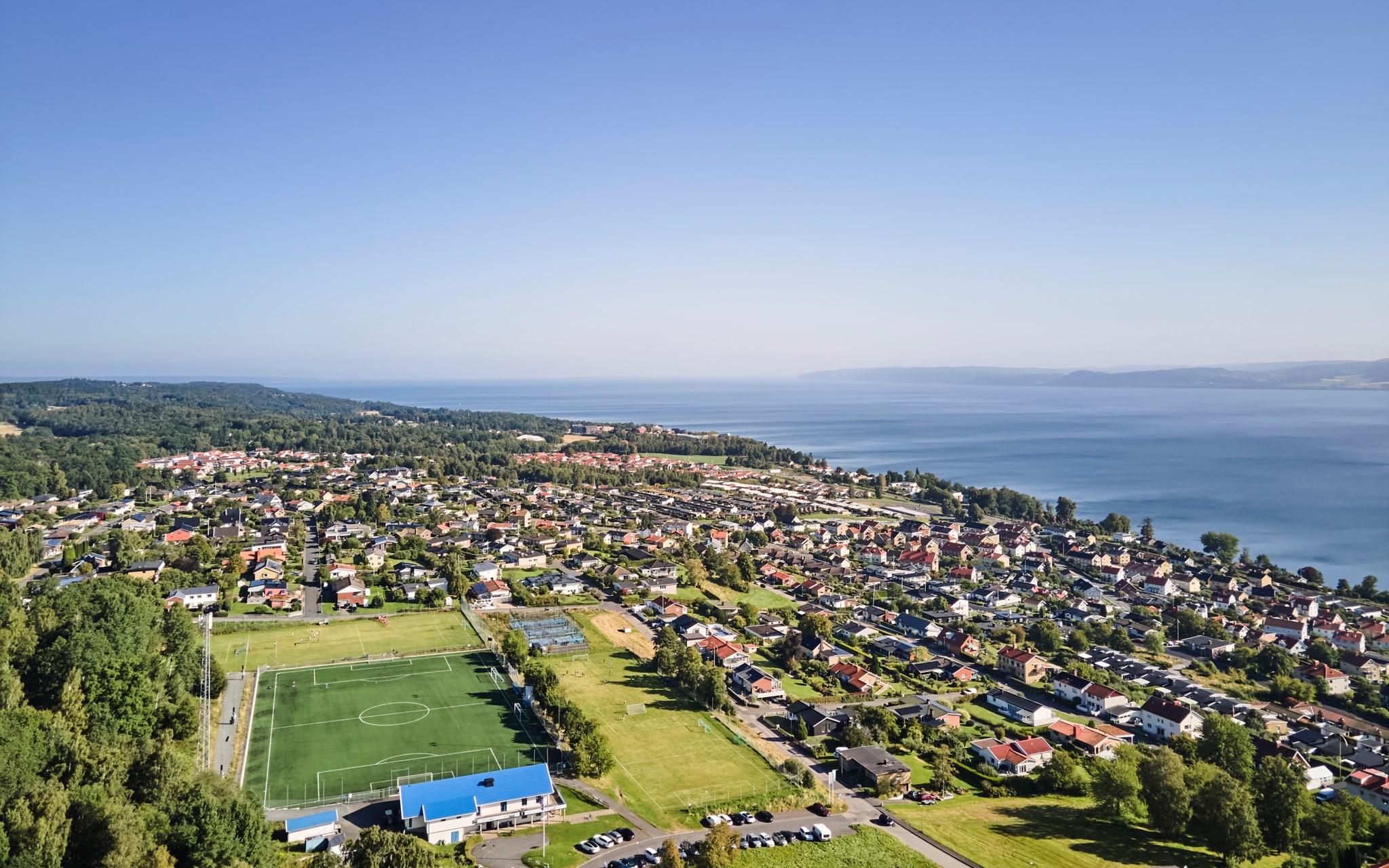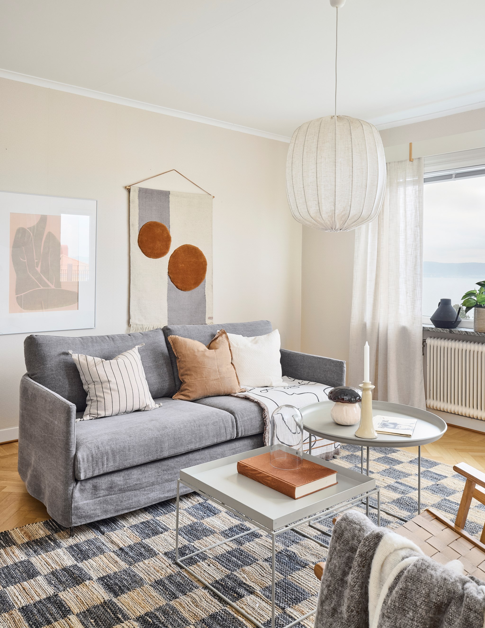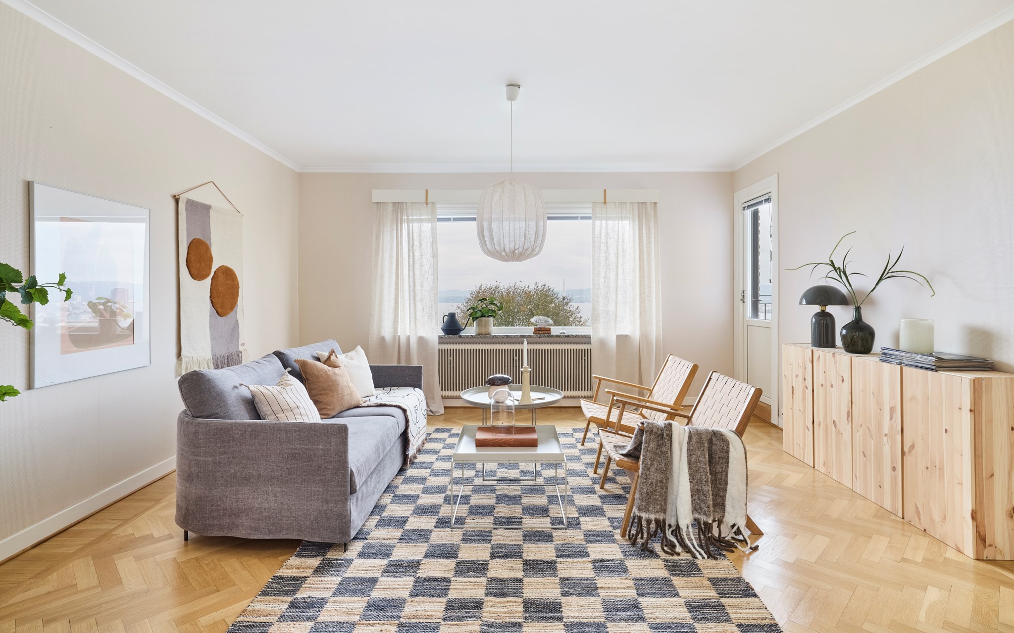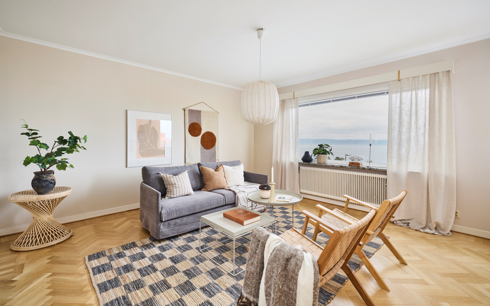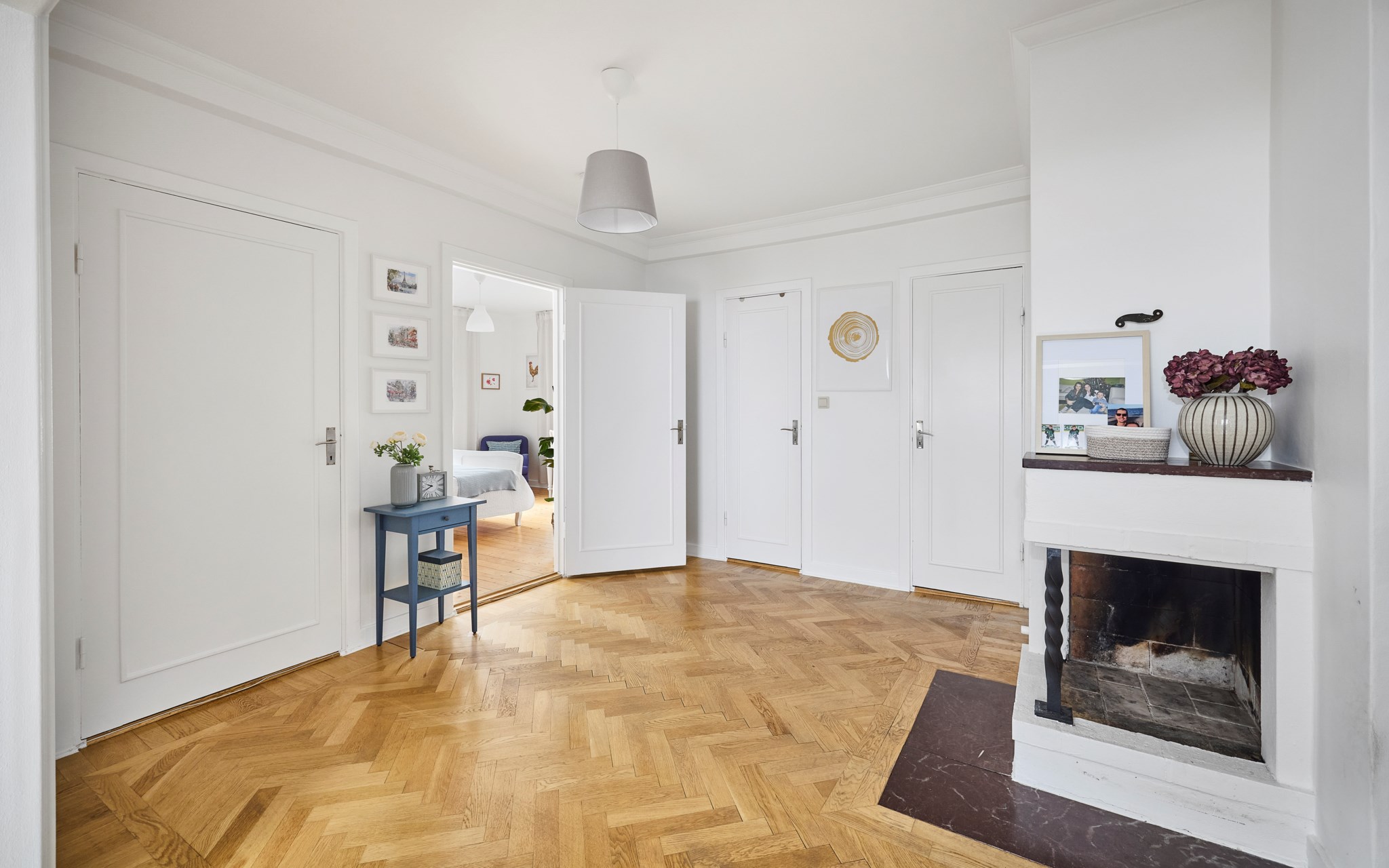 Huset är byggt med ett utskjutande parti mitt på – en fronton – det gör att vardagsrummet blir nästan som ett burspråk. Öppet mot hallen där eldstaden står på hörnet, men ändå ett eget definierat rum. Även från dagens matsal har du eldstaden i sikte, men du sitter ändå i ett eget rum. Fiskbensparketten i bra skick och brer ut sig på stora ytor i båda rummen och i hallen däremellan. Dubbla dörrar ut till balkongen om du vill få full effekt av utsikten. Skulle du vilja nyttja matsalen till sängkammare skulle det så klart gå bra.