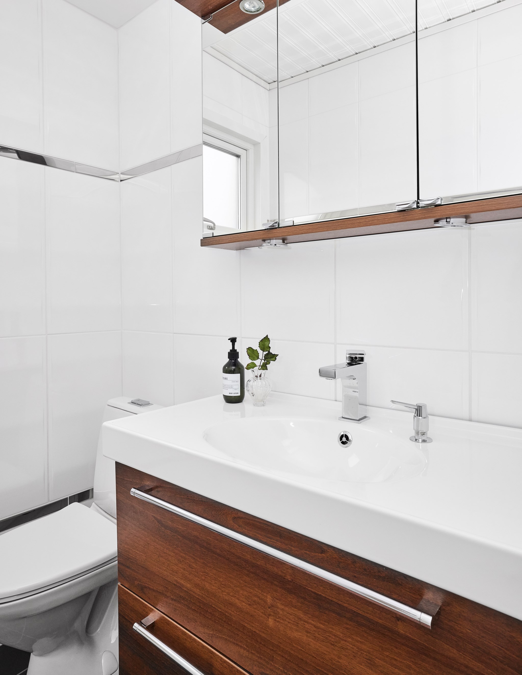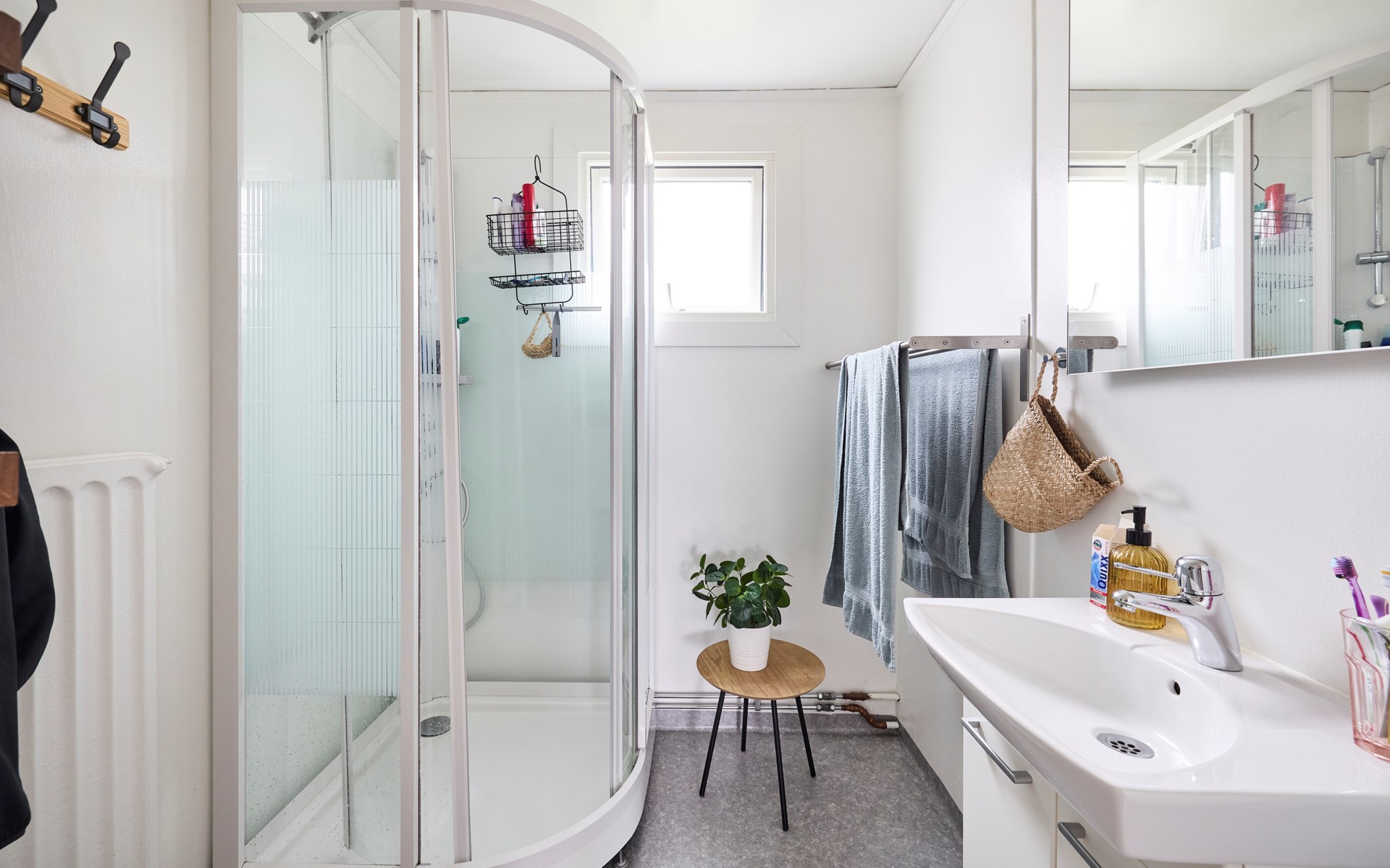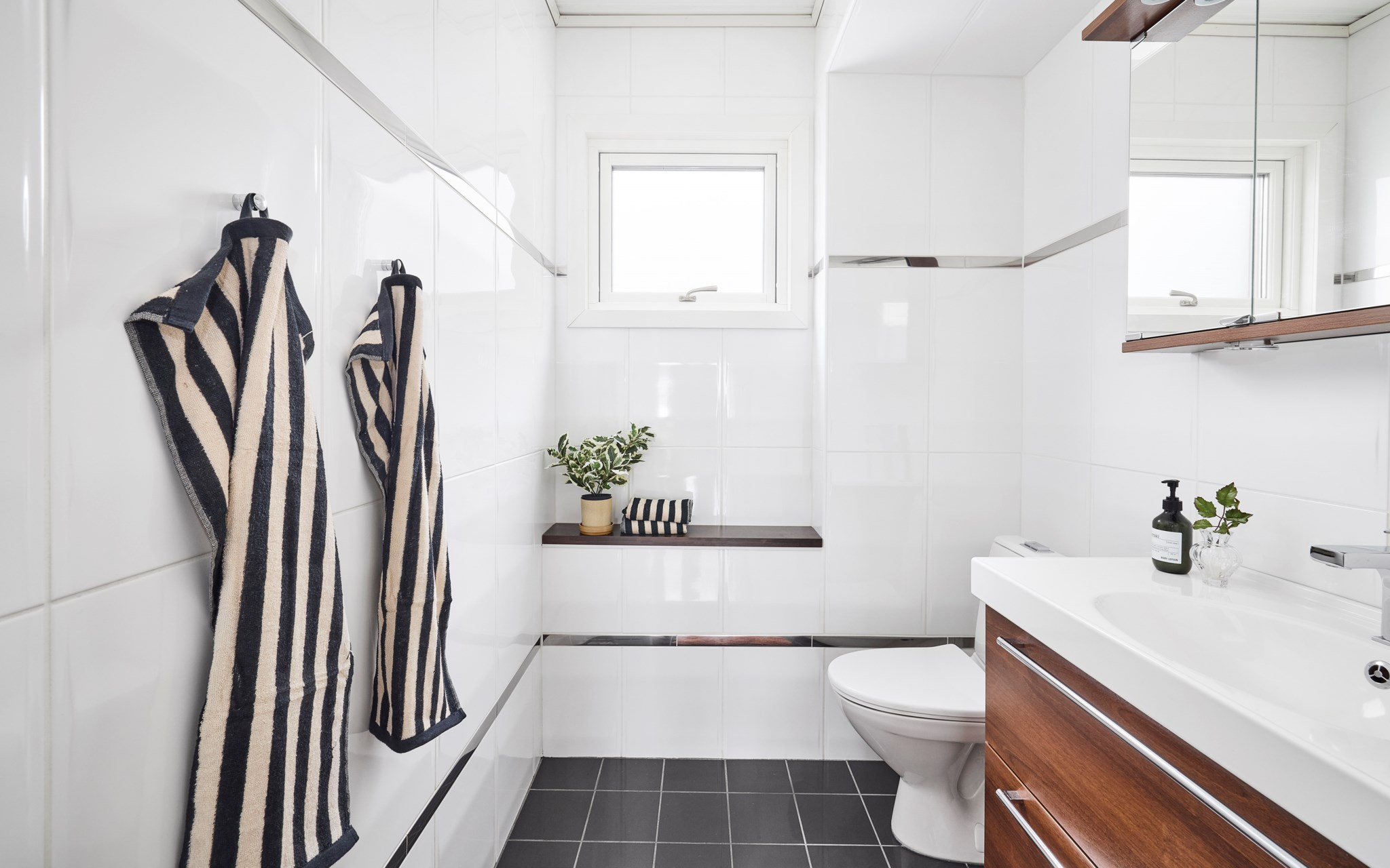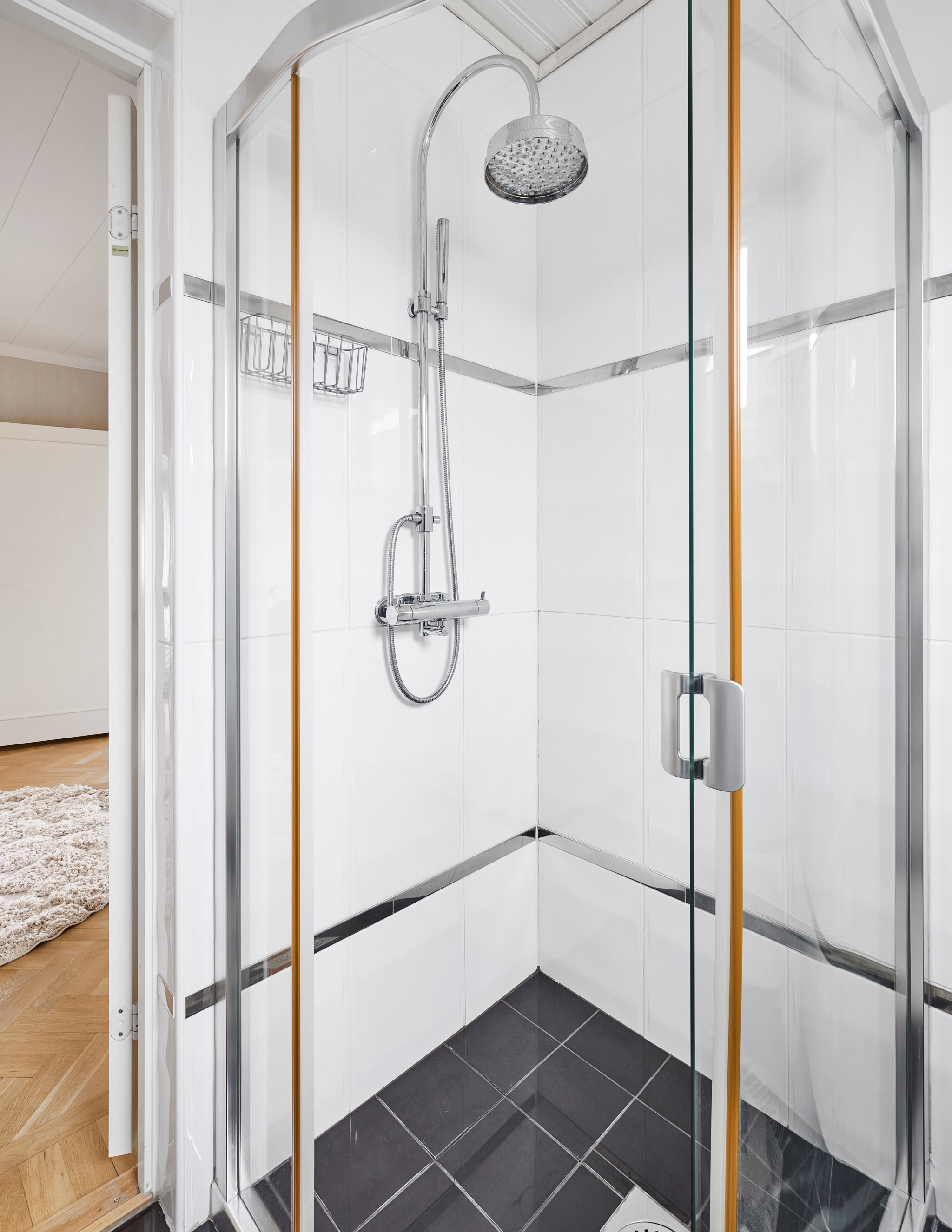 Praktiskt planerat med badrum och toalett i separata rum. Båda dess utrymmen fint och enhetligt renoverade med samma kakel och klinker – vitt och mörkgrått i tidlös kombo. Rummen ligger också vägg i vägg och har var sitt högt placerat fönster mot väster. Denna planlösning finns även i lägenheten i entréplanet, så det är en ursprunglig idé som byggmästaren eller arkitekten fullföljde snyggt.